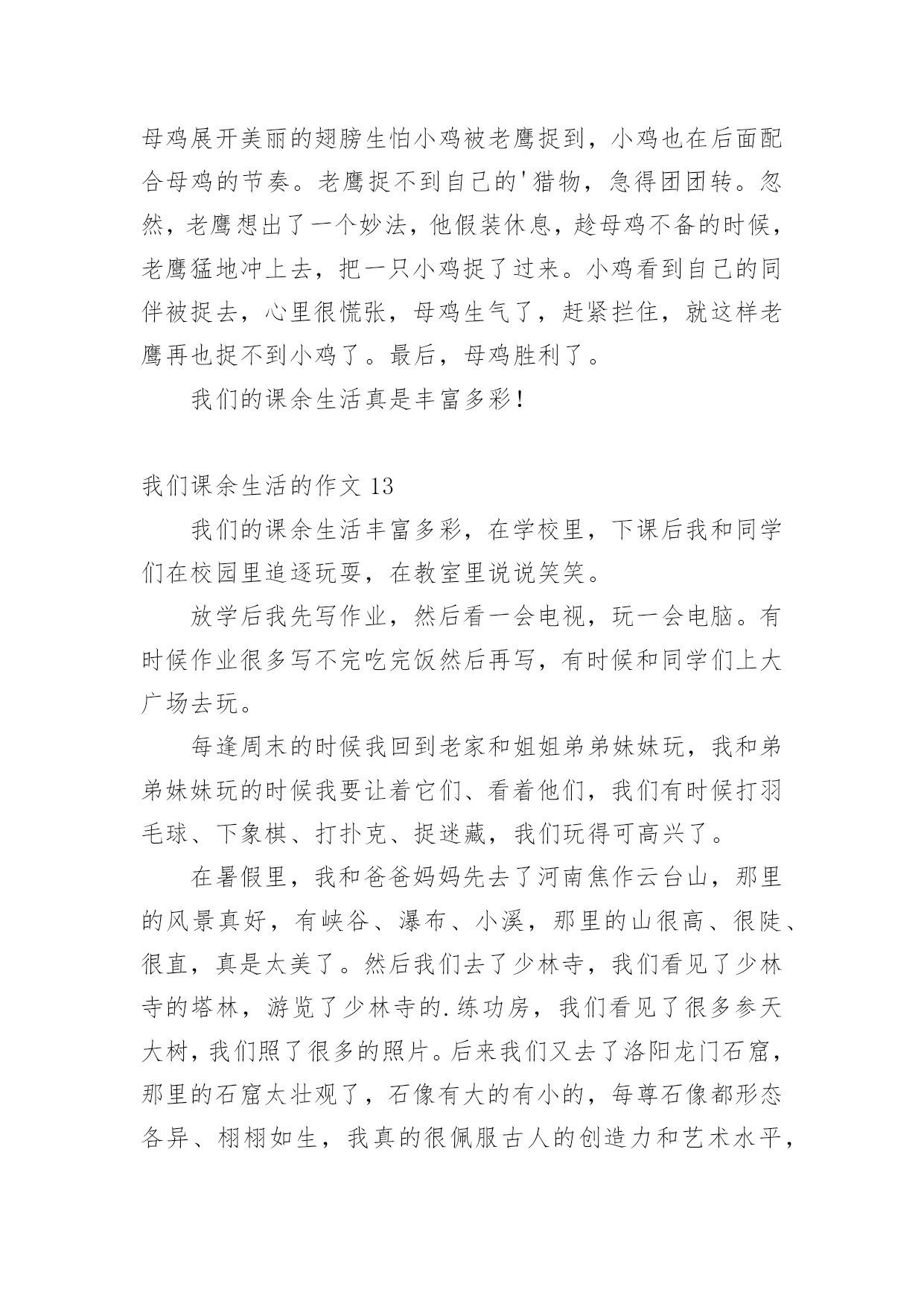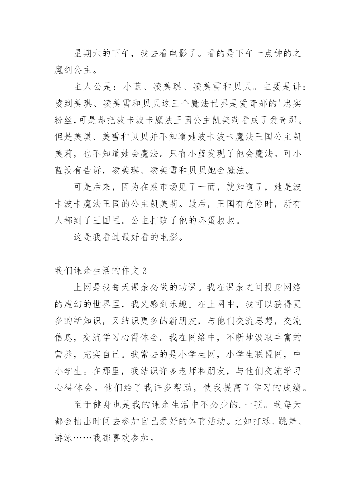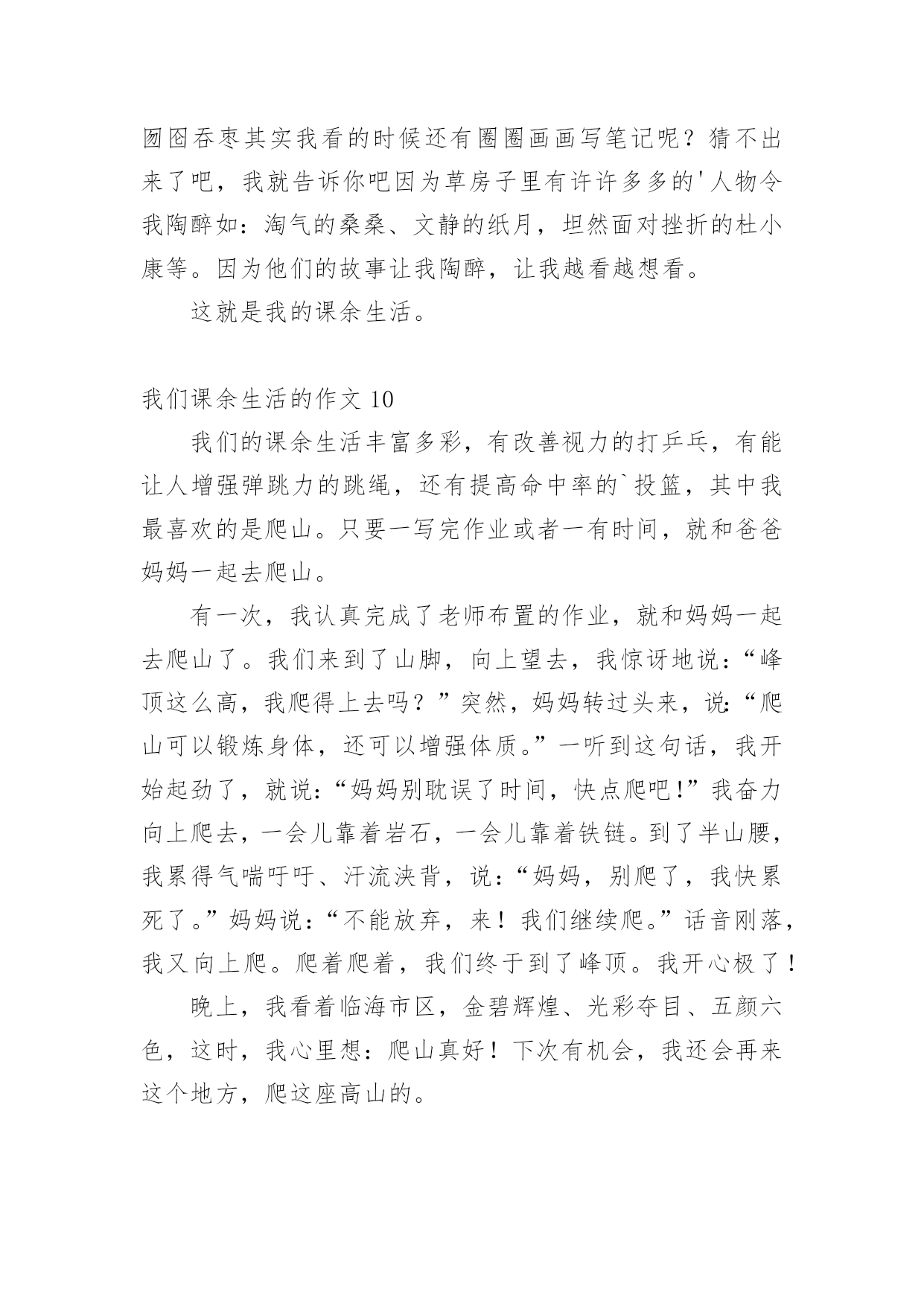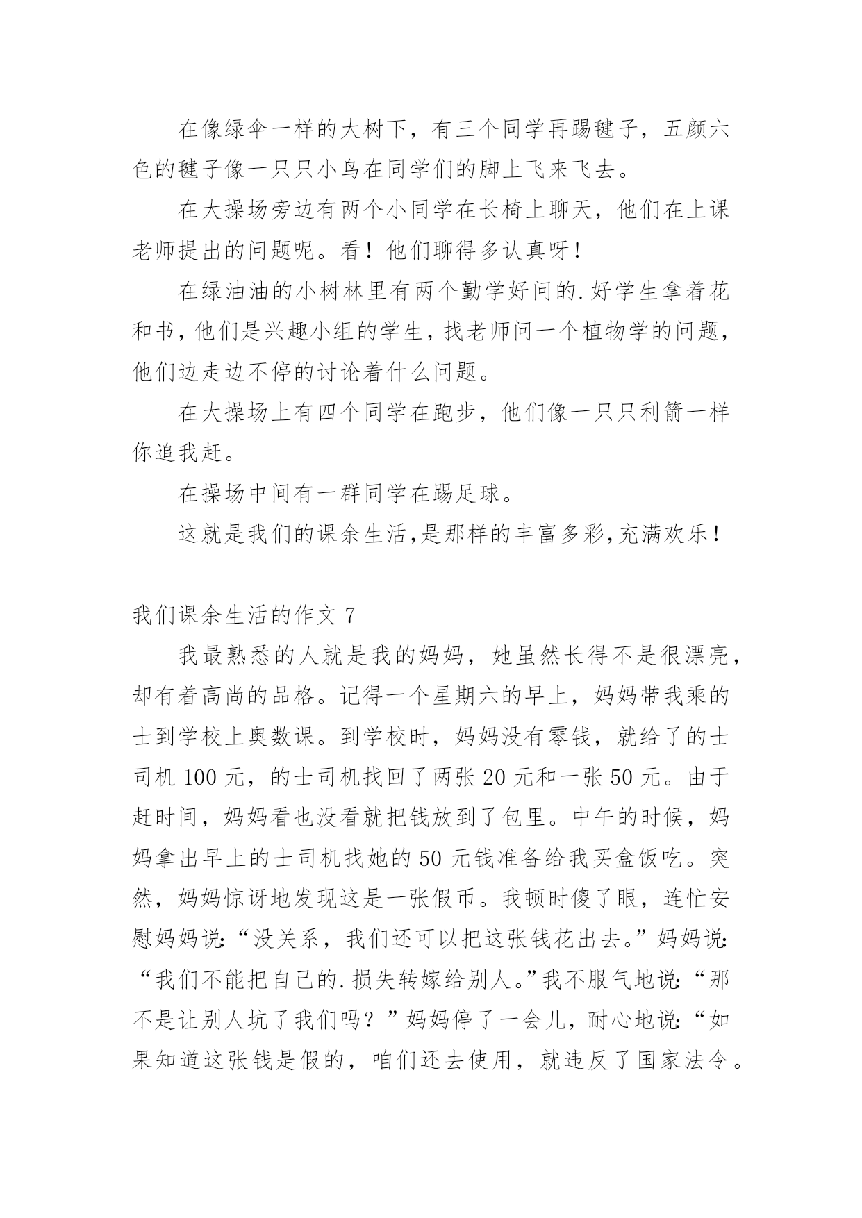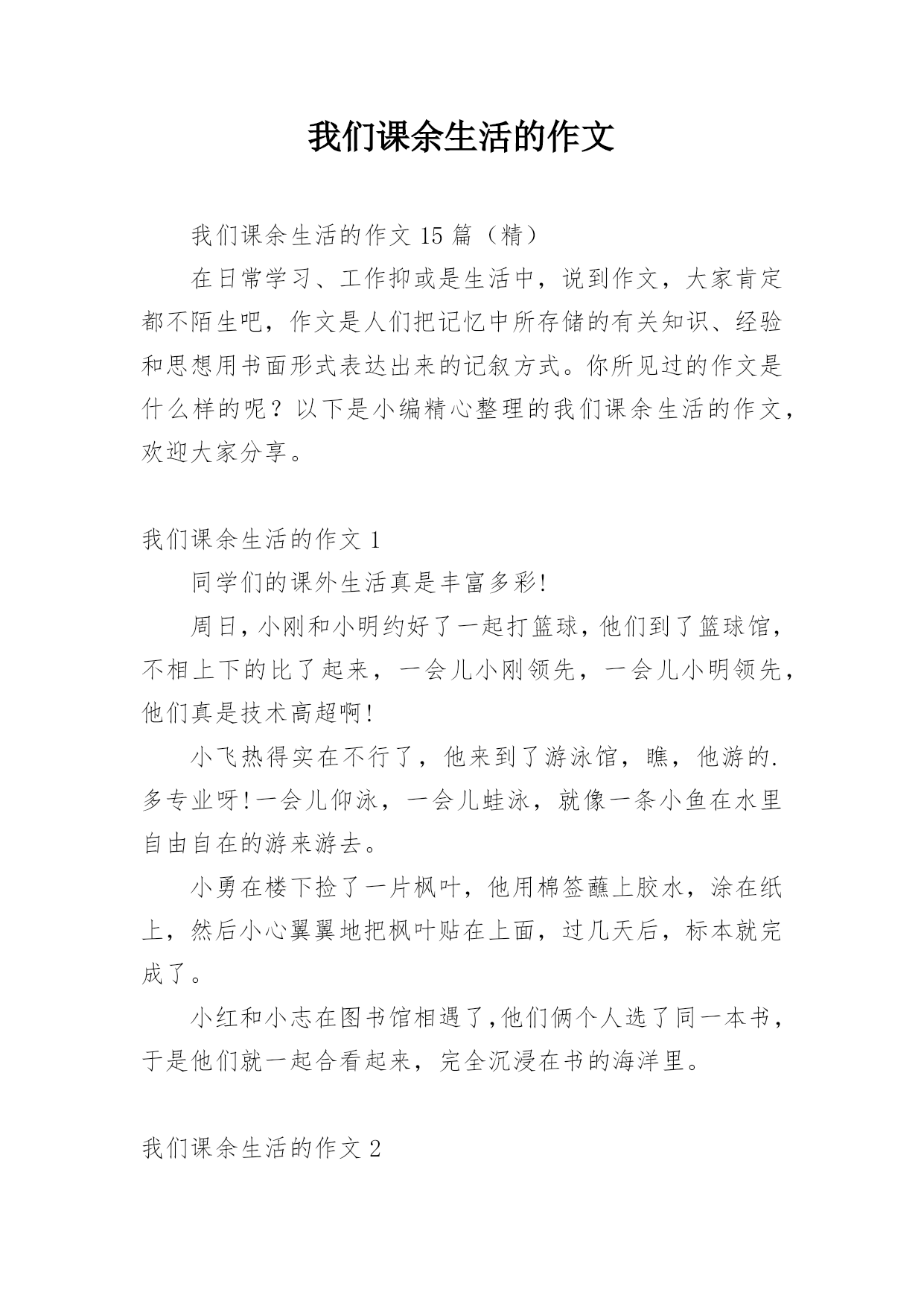 我们课余生活的作文我们课余生活的作文15篇(精)在日常学习、工作抑或是生活中,说到作文,大家肯定都不陌生吧,作文是人们把记忆中所存储的有关知识、经验和思想用书面形式表达出来的记叙方式。你所见过的作文是什么样的呢?以下是小编精心整理的我们课余生活的作文,欢迎大家分享。我们课余生活的作文1同学们的课外生活真是丰富多彩!周日,小刚和小明约好了一起打篮球,他们到了篮球馆,不相上下的比了起来,一会儿小刚领先,一会儿小明领先,他们真是技术高超啊!小飞热得实在不行了,他来到了游泳馆,瞧,他游的.多专业呀!一会儿仰泳,一会儿蛙泳,就像一条小鱼在水里自由自在的游来游去。小勇在楼下捡了一片枫叶,他用棉签蘸上胶水,涂在纸上,然后小心翼翼地把枫叶贴在上面,过几天后,标本就完成了。小红和小志在图书馆相遇了,他们俩个人选了同一本书,于是他们就一起合看起来,完全沉浸在书的海洋里。我们课余生活的作文2星期六的下午,我去看电影了。看的是下午一点钟的之魔剑公主。主人公是:小蓝、凌美琪、凌美雪和贝贝。主要是讲:凌到美琪、凌美雪和贝贝这三个魔法世界是爱奇那的'忠实粉丝,可是却把波卡波卡魔法王国公主凯美莉看成了爱奇那。但是美琪、美雪和贝贝并不知道她波卡波卡魔法王国公主凯美莉,也不知道她会魔法。只有小蓝发现了他会魔法。可小蓝没有告诉,凌美琪、凌美雪和贝贝她会魔法。可是后来,因为在菜市场见了一面,就知道了,她是波卡波卡魔法王国的公主凯美莉。最后,王国有危险时,所有人都到了王国里。公主打败了他的坏蛋叔叔。这是我看过最好看的电影。我们课余生活的作文3上网是我每天课余必做的功课。我在课余之间投身网络的虚幻的世界里,我又感到乐趣。在上网中,我可以获得更多的新知识,又结识更多的新朋友,与他们交流思想,交流信息,交流学习心得体会。我在网络中,不断地汲取丰富的营养,充实自己。我常去的是小学生网,小学生联盟网,中小学生。在那里,我结识许多老师和朋友,与他们交流学习心得体会。他们给了我许多帮助,使我提高了学习的成绩。至于健身也是我的课余生活中不必少的.一项。我每天都会抽出时间去参加自己爱好的体育活动。比如打球、跳舞、游泳……我都喜欢参加。我的课余生活丰富多彩,我觉得在课余生活中可以培养个性,培养爱好,真是得益甚多。课余生活是我享受生活,享受乐趣。我们课余生活的作文4一天对我来说最快乐的时光就是放学后。下课铃一响,我们就像一群被放飞的小鸟叽叽喳喳边说边笑的冲出校门,开始我丰富多彩的课余生活。每天,除了做作业我还有时间看动画片、弹钢琴、看书、和小朋友一起做游戏,这些都是我的最爱。我最最喜欢的就是和小朋友们一起玩了,我们捉迷藏、跳皮筋、踢毽子、玩轮滑、玩抓人游戏······有一次我们在跳皮筋,一位阿姨在旁边看得入了迷,竟然也和我们玩了起来,还教我们了新花样,阿姨说这游戏让她想起自己欢乐的童年。在大人眼里看似简单无聊的抓人游戏我们一样玩的不亦乐乎,银铃般的`笑声回荡在小区的上空。院里那些散步的爷爷奶奶笑眯眯的看着我们,不时的提醒:“慢点儿,慢点儿。”一位奶奶还说:“要是没有这些孩子我们该多寂寞啊!”总是到夜幕降临我们才恋恋不舍得分开,欢乐的时光总是那么短暂,我们相约明天见!我们课余生活的作文5我们的课余生活丰富多彩,有的小朋友喜欢看课外书、也有的小朋友喜欢爬山、溜冰、旅游……可我最喜欢的是踢毽子。别小瞧那毽子,玩起来学问可大哩!看,它有圆圆的白色的球,就像我们的小脑袋,上面还长满了五颜六色的羽一毛一,我可喜欢它了。每逢星期天休息,我做完作业后,就和姐姐一起到楼下的小小公园踢毽子。姐姐毽子踢得好一棒啊!那毽子在姐姐的身旁舞动着,就像小鸟一样飞来飞去。我在旁边看呆了,很快我也学着姐姐的样,把毽子抛起来,左脚一踢,右脚一踢。不一会儿,我的.毽子也像翩翩起舞的蝴蝶一样飞来飞去。我们正玩得起劲时,咦,不知谁一脚,毽子竞不由自主地飞到了树枝上,这可怎么办呢?望着树枝上的毽子,我们急得一团一团一转。突然,我灵机一动,拿来了一根树杆,把毽子给一捅一了下来,毽子乖乖地又回到了我们的身边,我兴奋极了!一只小小的毽子丰富了我的课余生活,给我带来了无比的快乐!我们课余生活的作文6下课了!同学们都去干自己喜欢的事。有一位女同学坐在教学楼旁边粗壮的大树下的长椅上认真的的看着课外书。在大操场旁边,有三位同学在跳大绳,其中两位男同学在用力的甩着大绳,中间的女同学像蜻蜓点水一样轻盈,连跳了好几十个,周围的同学正字为她鼓掌。在像绿伞一样的大树下,有三个同学再踢毽子,五颜六色的毽子像一只只小鸟在同学们的脚上飞来飞去。在大操场旁边有两个小同学在长椅上聊天,他们在上课老师提出的问题呢。看!他们聊得多认真呀!在绿油油的小树林里有两个勤学好问的.好学生拿着花和书,他们是兴趣小组的学生,找老师问一个植物学的问题,他们边走边不停的讨论着什么问