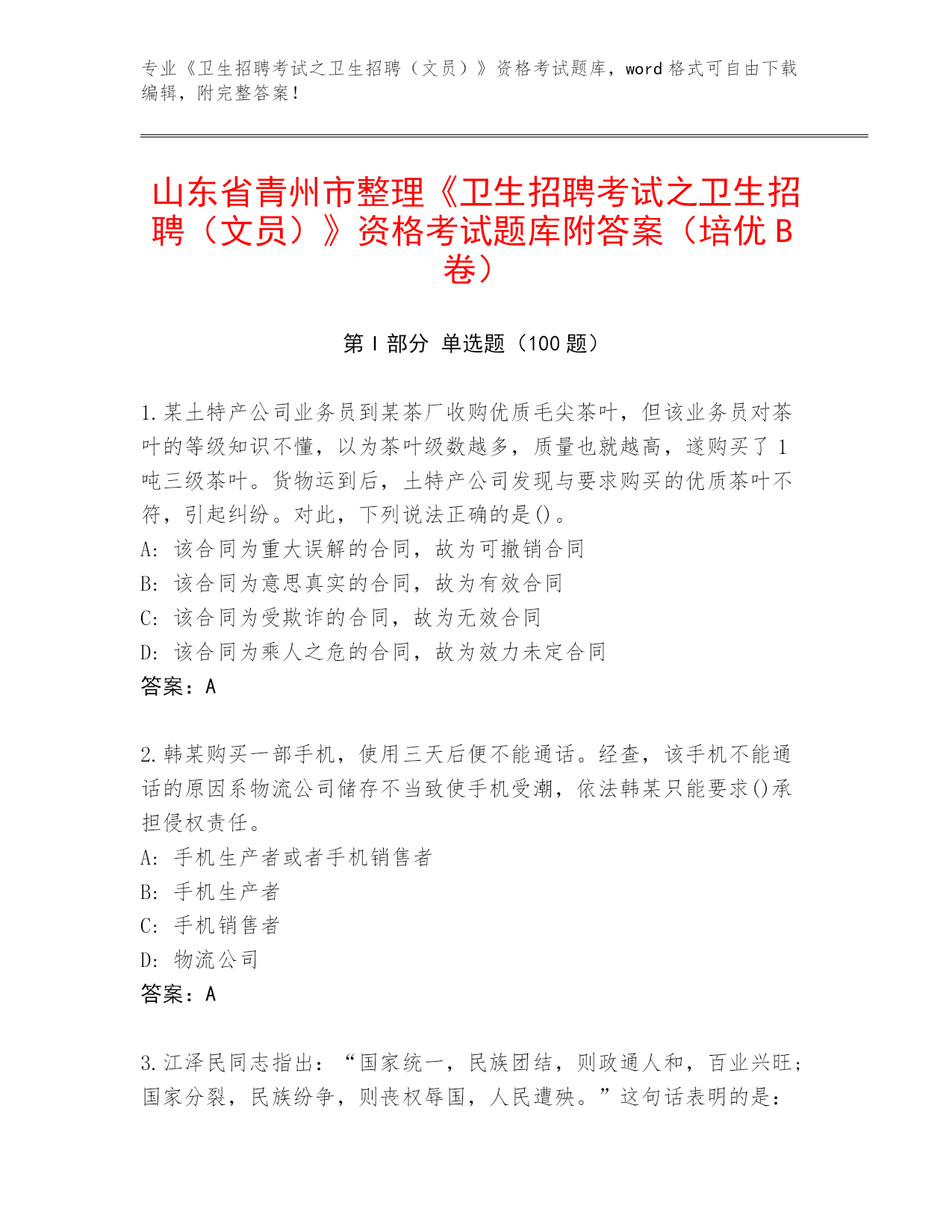 山东省青州市整理《卫生招聘考试之卫生招聘(文员)》资格考试题库附答案(培优B卷)
