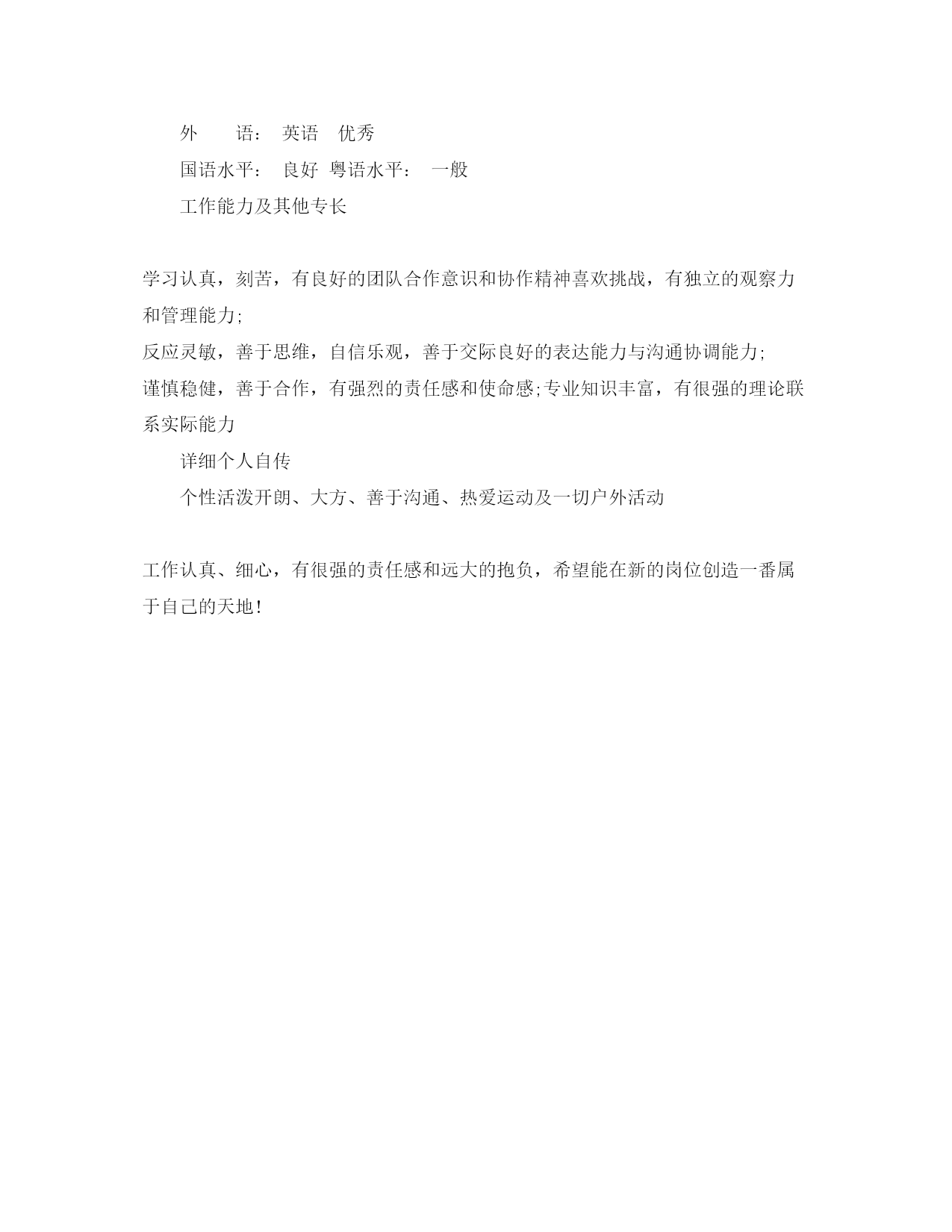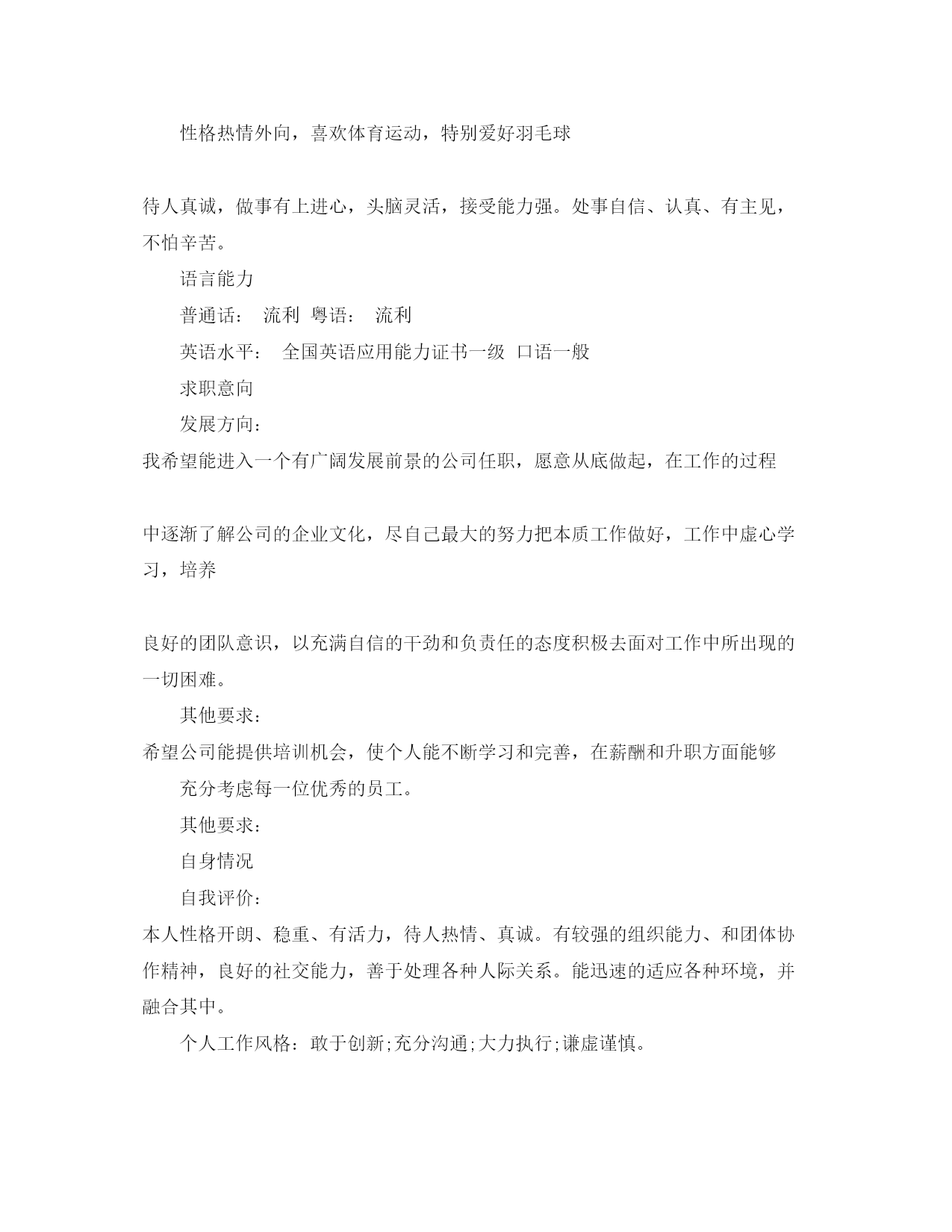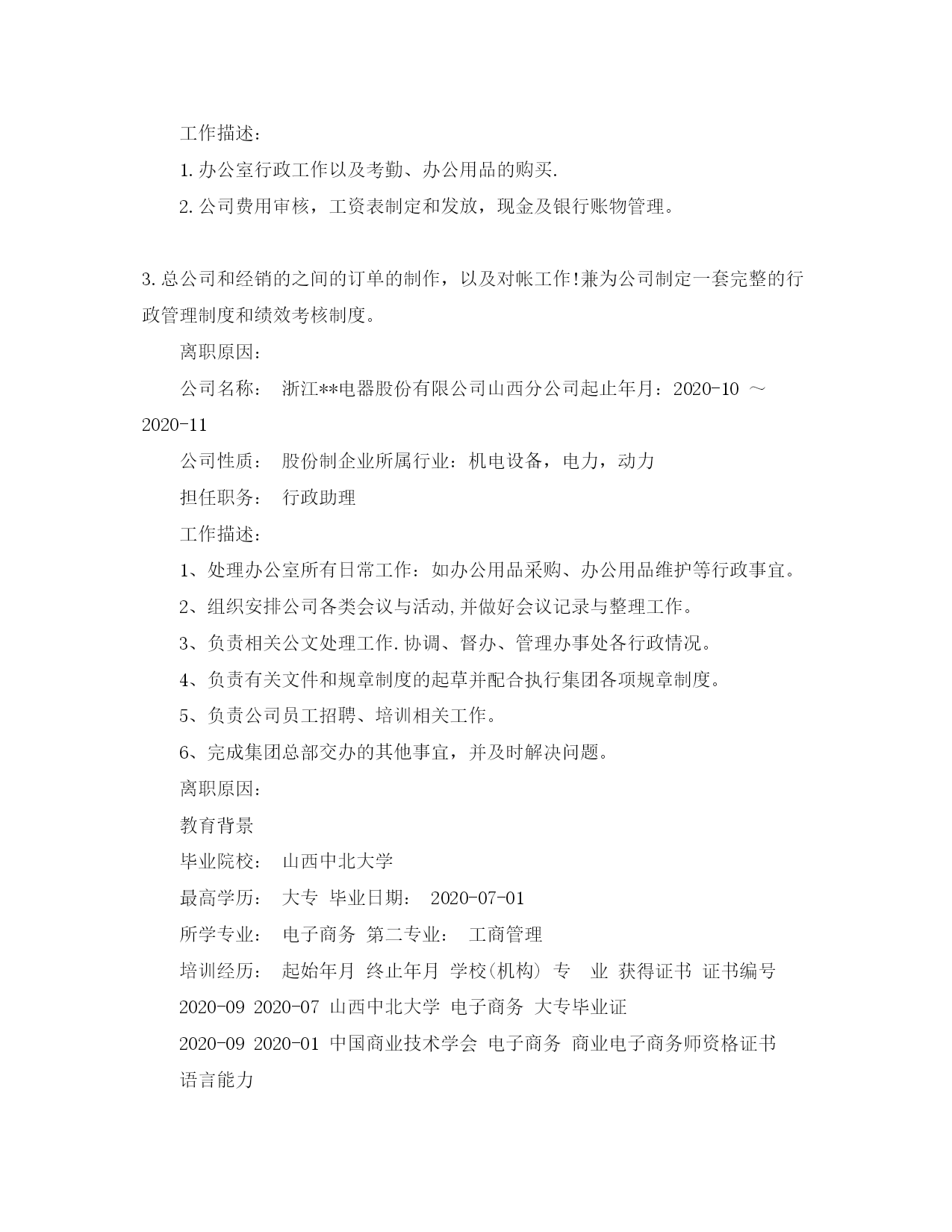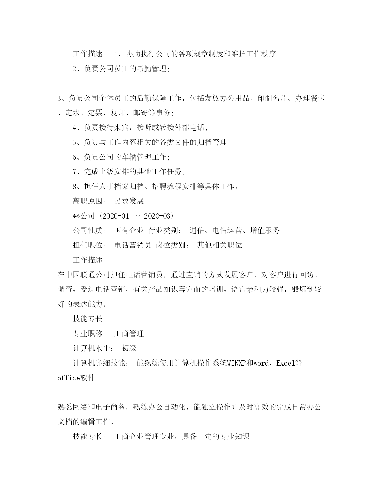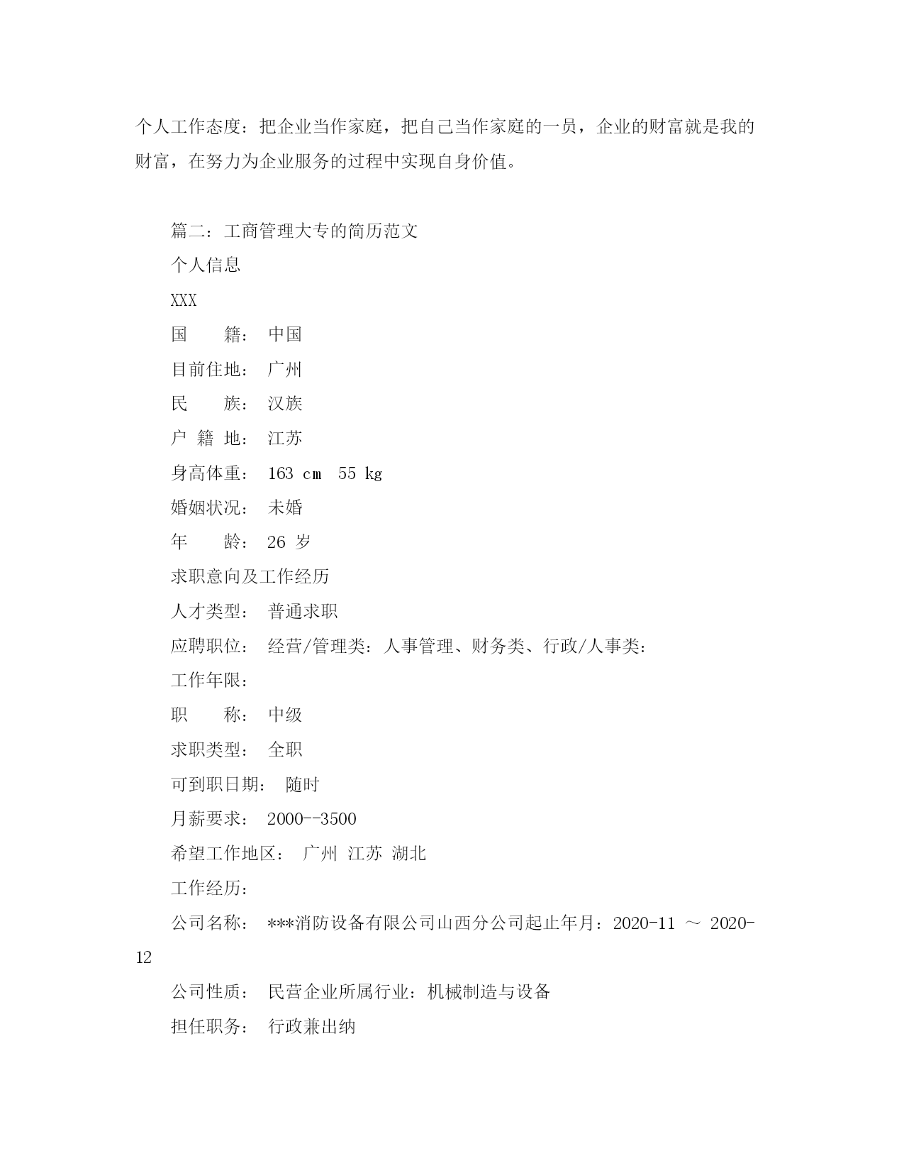此资料由网络收集而来,如有侵权请告知上传者立即删除。资料共分享,我们负责传递知识。工商管理大专的简历范文很多求职者试图借助工商管理简历的制作,将全部的个人信息全部填入简历之中。此类做法对于个人求职效果的影响非常大,由于语句过多导致很多招聘面试官没有足够的时间了解求职者,促使求职者与合适的工作岗位失之交臂。其实制作个人简历非常简单,利用较为简单的语言,适合的语句,以流畅的文笔展现个人竞争优势,从而获得招聘单位的高度认可。篇一:工商管理大专的简历范文个人信息XXX性别:女婚姻状况:未婚民族:汉族户籍:广东-东莞年龄:22现所在地:广东-东莞身高:158cm希望地区:广东-东莞希望岗位:销售类-人员-销售代表销售类-人员-业务员教育经历2020-09~2020-06广东科技学院工商管理大专2020-09~2020-06第四高级中学普通高中高中培训经历2020-05~2020-06东莞市北斗航盛通讯科技有限公司康耐斯汽车养护品2020-01~2020-03中国联通中国联通业务套餐**公司(2020-05~2020-11)公司性质:私营企业行业类别:汽车、摩托车及零配件担任职位:行政助理岗位类别:行政助理/文员工作描述:1、协助执行公司的各项规章制度和维护工作秩序;2、负责公司员工的考勤管理;3、负责公司全体员工的后勤保障工作,包括发放办公用品、印制名片、办理餐卡、定水、定票、复印、邮寄等事务;4、负责接待来宾,接听或转接外部电话;5、负责与工作内容相关的各类文件的归档管理;6、负责公司的车辆管理工作;7、完成上级安排的其他工作任务;8、担任人事档案归档、招聘流程安排等具体工作。离职原因:另求发展**公司(2020-01~2020-03)公司性质:国有企业行业类别:通信、电信运营、增值服务担任职位:电话营销员岗位类别:其他相关职位工作描述:在中国联通公司担任电话营销员,通过直销的方式发展客户,对客户进行回访、调查,受过电话营销,有关产品知识等方面的培训,语言亲和力较强,锻炼到较好的表达能力。技能专长专业职称:工商管理计算机水平:初级计算机详细技能:能熟练使用计算机操作系统WINXP和word、Excel等office软件熟悉网络和电子商务,熟练办公自动化,能独立操作并及时高效的完成日常办公文档的编辑工作。技能专长:工商企业管理专业,具备一定的专业知识性格热情外向,喜欢体育运动,特别爱好羽毛球待人真诚,做事有上进心,头脑灵活,接受能力强。处事自信、认真、有主见,不怕辛苦。语言能力普通话:流利粤语:流利英语水平:全国英语应用能力证书一级口语一般求职意向发展方向:我希望能进入一个有广阔发展前景的公司任职,愿意从底做起,在工作的过程中逐渐了解公司的企业文化,尽自己最大的努力把本质工作做好,工作中虚心学习,培养良好的团队意识,以充满自信的干劲和负责任的态度积极去面对工作中所出现的一切困难。其他要求:希望公司能提供培训机会,使个人能不断学习和完善,在薪酬和升职方面能够充分考虑每一位优秀的员工。其他要求:自身情况自我评价:本人性格开朗、稳重、有活力,待人热情、真诚。有较强的组织能力、和团体协作精神,良好的社交能力,善于处理各种人际关系。能迅速的适应各种环境,并融合其中。个人工作风格:敢于创新;充分沟通;大力执行;谦虚谨慎。个人工作态度:把企业当作家庭,把自己当作家庭的一员,企业的财富就是我的财富,在努力为企业服务的过程中实现自身价值。篇二:工商管理大专的简历范文个人信息XXX国籍:中国目前住地:广州民族:汉族户籍地:江苏身高体重:163cm55kg婚姻状况:未婚年龄:26岁求职意向及工作经历人才类型:普通求职应聘职位:经营/管理类:人事管理、财务类、行政/人事类:工作年限:职称:中级求职类型:全职可到职日期:随时月薪要求:2000--3500希望工作地区:广州江苏湖北工作经历:公司名称:***消防设备有限公司山西分公司起止年月:2020-11~2020-12公司性质:民营企业所属行业:机械制造与设备担任职务:行政兼出纳工作描述:1.办公室行政工作以及考勤、办公用品的购买.2.公司费用审核,工资表制定和发放,现金及银行账物管理。3.总公司和经销的之间的订单的制作,以及对帐工作!兼为公司制定一套完整的行政管理制度和绩效考核制度。离职原因:公司名称:浙江**电器股份有限公司山西分公司起止年月:2020-10~2020-11公司性质:股份制企业所属行业:机电设备,电力,动力担任职务:行政助理工作描述:1、处理办公室所有日常工作:如办公用品采购、办公用品维护等行政事宜。2、组织安排