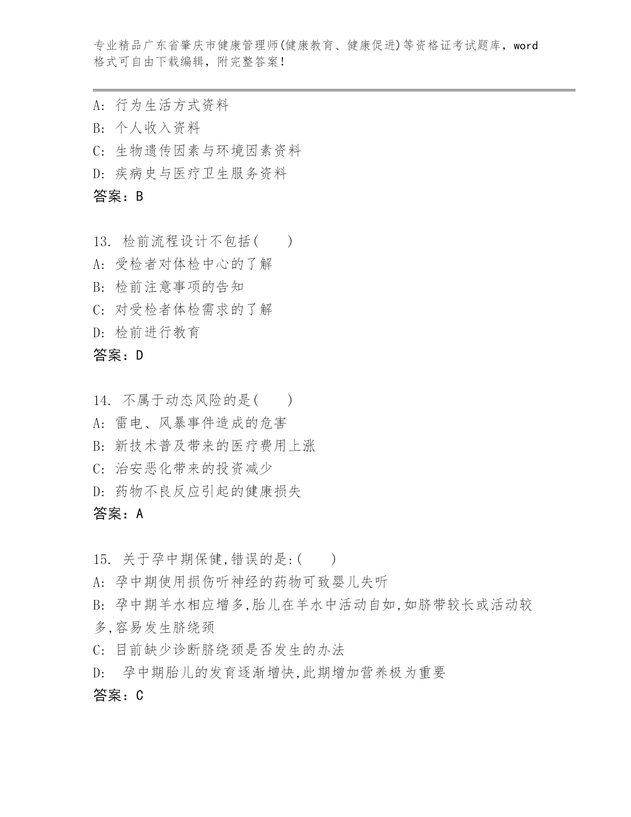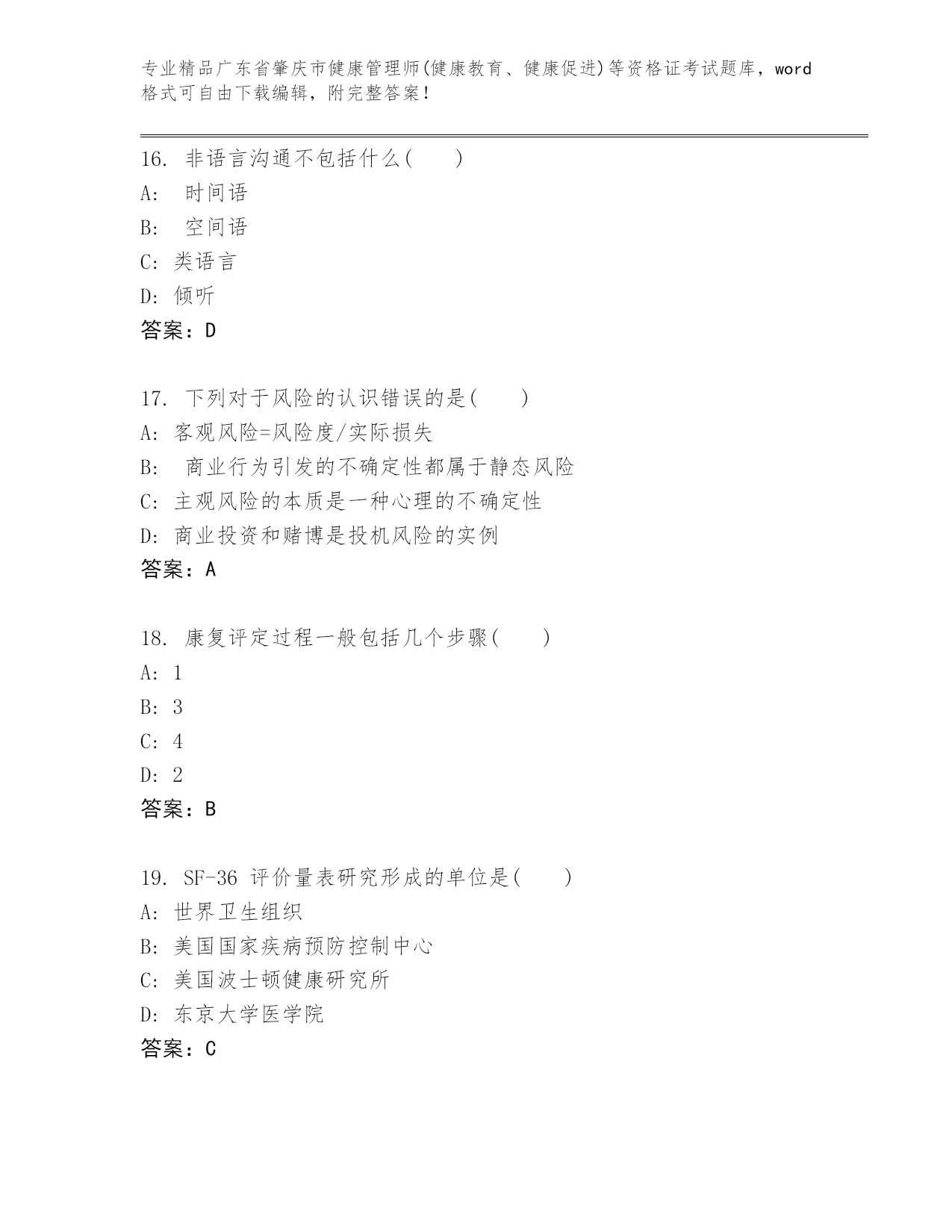 内部培训广东省肇庆市健康管理师(健康教育、健康促进)等资格证考试王牌题库推荐