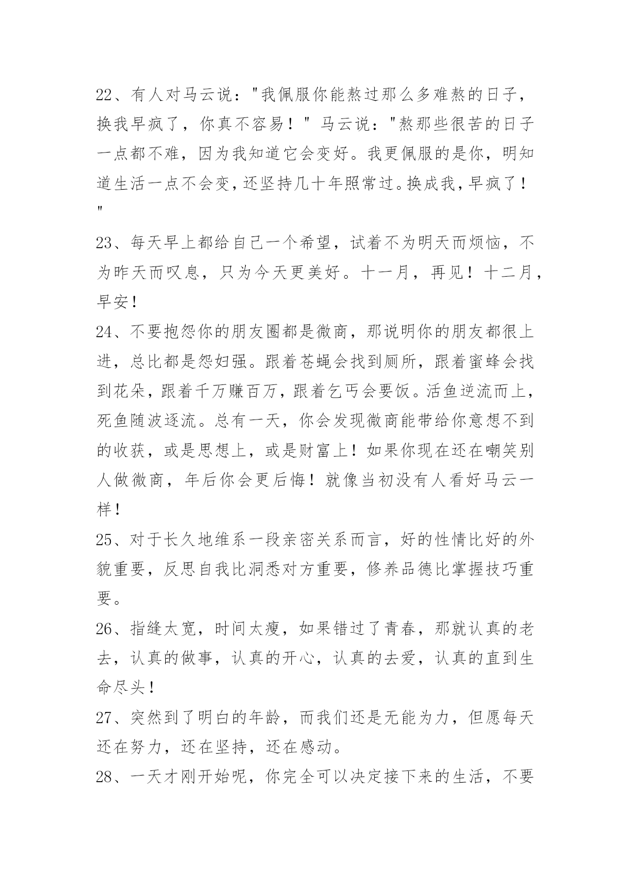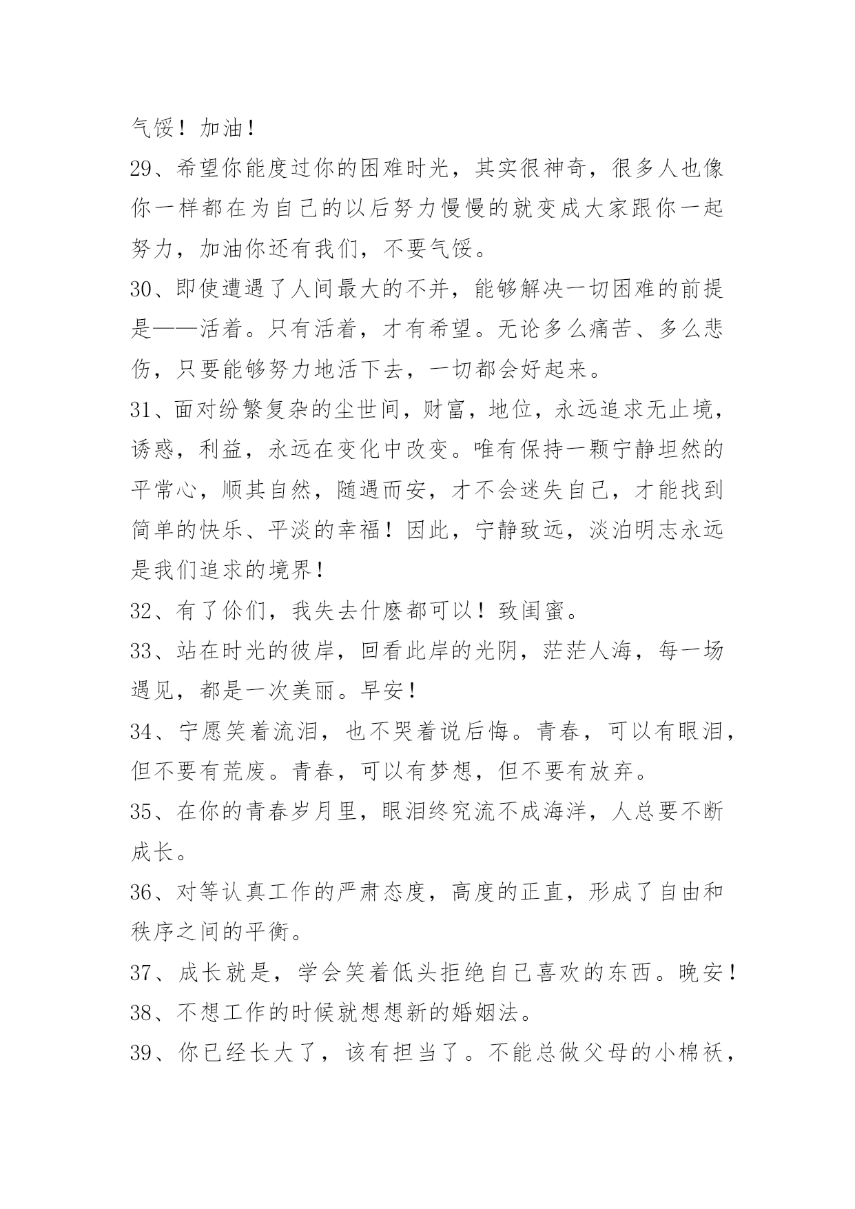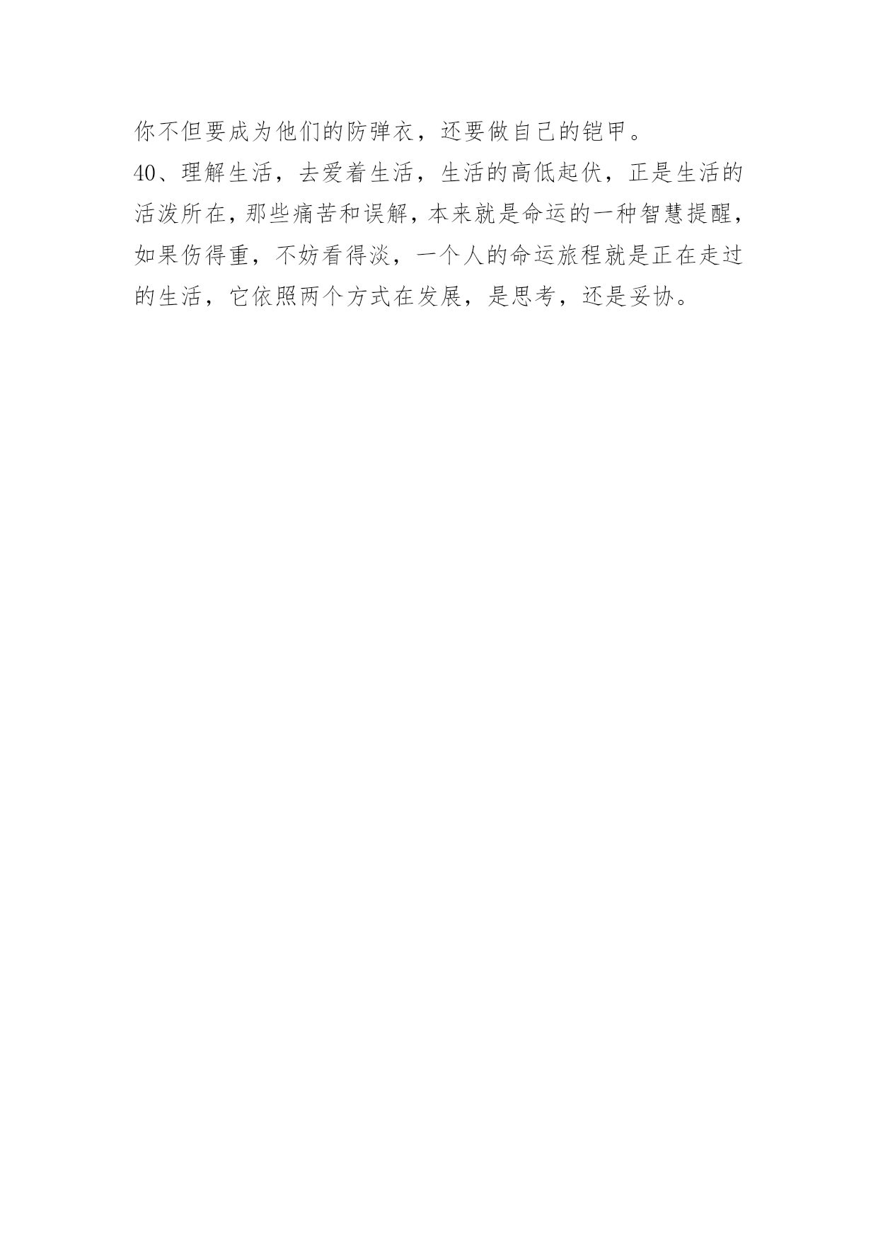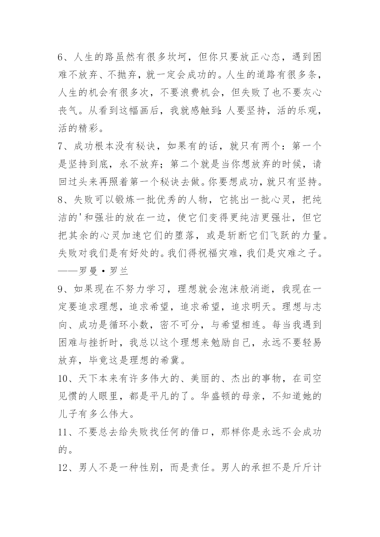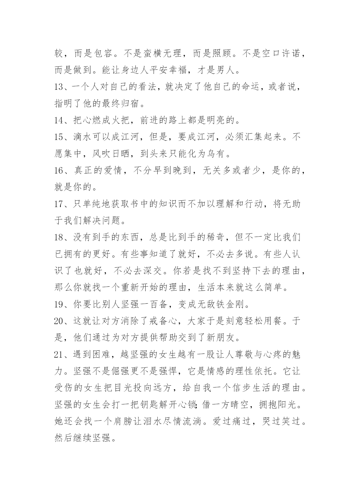 工作励志语录40条【热门】工作励志语录合集40条挫败,是上天赐给他的礼物和恩典,停下来检视自己的所有,沉静地思考自己接下来要过的生活,几十年来的努力,制造出今天的难题,必须为自己找到幸福的出路。以下是小编收集整理的工作励志语录40条,供各位参考。1、你必须十分努力,才能看起来毫不费力。2、很多人的奋发,是因为想成功后,示强给那些给他冷眼的人看看;其实,他们成功后,反而强硬不起来,因为他们已经懂得了,宽容最有力量。3、要想克服赢的渴望与输的恐惧,耐心地等待机会与遵守严酷的规则,才是最好的办法;争胜未必能胜,但至少可以多一些成功的机会,并且能在竞争的过程中提升自己的能力。4、成功在一开始仅仅是一个选择,但是你选择了什么样的目标,就会有什么样的成就,就会有什么样的人生。我相信,杰出人士与平庸之辈的根本差别并不是天赋、机遇,而在于有无目标与目标的高远与否。5、人的一生当中会遇到无数个挫折,当你的目标越大的时候就会遇到越大的挫折,面对挫折时选择以什么样的态度来面对将会决定结果的好坏,成功人士与一般人的差别在于面对挫折时所保持的态度,有时往往态度不同就会有完全不一样的结果。6、人生的路虽然有很多坎坷,但你只要放正心态,遇到困难不放弃、不抛弃,就一定会成功的。人生的道路有很多条,人生的机会有很多次,不要浪费机会,但失败了也不要灰心丧气。从看到这幅画后,我就感触到:人要坚持,活的乐观,活的精彩。7、成功根本没有秘诀,如果有的话,就只有两个:第一个是坚持到底,永不放弃;第二个就是当你想放弃的时候,请回过头来再照着第一个秘诀去做。你要想成功,就只有坚持。8、失败可以锻炼一批优秀的人物,它挑出一批心灵,把纯洁的'和强壮的放在一边,使它们变得更纯洁更强壮,但它把其余的心灵加速它们的堕落,或是斩断它们飞跃的力量。失败对我们是有好处的。我们得祝福灾难,我们是灾难之子。——罗曼·罗兰9、如果现在不努力学习,理想就会泡沫般消逝,我现在一定要追求理想,追求希望,追求希望,追求明天。理想与志向、成功是循环小数,密不可分,与希望相连。每当我遇到困难与挫折时,我总以这个理想来勉励自己,永远不要轻易放弃,毕竟这是理想的希冀。10、天下本来有许多伟大的、美丽的、杰出的事物,在司空见惯的人眼里,都是平凡的了。华盛顿的母亲,不知道她的儿子有多么伟大。11、不要总去给失败找任何的借口,那样你是永远不会成功的。12、男人不是一种性别,而是责任。男人的承担不是斤斤计较,而是包容。不是蛮横无理,而是照顾。不是空口许诺,而是做到。能让身边人平安幸福,才是男人。13、一个人对自己的看法,就决定了他自己的命运,或者说,指明了他的最终归宿。14、把心燃成火把,前进的路上都是明亮的。15、滴水可以成江河,但是,要成江河,必须汇集起来。不愿集中,风吹日晒,到头来只能化为乌有。16、真正的爱情,不分早到晚到,无关多或者少,是你的,就是你的。17、只单纯地获取书中的知识而不加以理解和行动,将无助于我们解决问题。18、没有到手的东西,总是比到手的稀奇,但不一定比我们已拥有的更好。有些事知道了就好,不必去多说。有些人认识了也就好,不必去深交。你若是找不到坚持下去的理由,那么你就找一个重新开始的理由,生活本来就这么简单。19、你要比别人坚强一百备,变成无敌铁金刚。20、这就让对方消除了戒备心,大家于是刻意轻松用餐。于是,他们通过为对方提供帮助交到了新朋友。21、遇到困难,越坚强的女生越有一股让人尊敬与心疼的魅力。坚强不是倔强更不是强悍,它是情感的理性依托。它让受伤的女生把目光投向远方,给自我一个信步生活的理由。坚强的女生会打一把钥匙解开心锁;借一方晴空,拥抱阳光。她还会找一个肩膀让泪水尽情流淌。爱过痛过,哭过笑过。然后继续坚强。22、有人对马云说:"我佩服你能熬过那么多难熬的日子,换我早疯了,你真不容易!"马云说:"熬那些很苦的日子一点都不难,因为我知道它会变好。我更佩服的是你,明知道生活一点不会变,还坚持几十年照常过。换成我,早疯了!"23、每天早上都给自己一个希望,试着不为明天而烦恼,不为昨天而叹息,只为今天更美好。十一月,再见!十二月,早安!24、不要抱怨你的朋友圈都是微商,那说明你的朋友都很上进,总比都是怨妇强。跟着苍蝇会找到厕所,跟着蜜蜂会找到花朵,跟着千万赚百万,跟着乞丐会要饭。活鱼逆流而上,死鱼随波逐流。总有一天,你会发现微商能带给你意想不到的收获,或是思想上,或是财富上!如果你现在还在嘲笑别人做微商,年后你会更后悔!就像当初没有人看好马云一样!25、对于长久地维系一段亲密关系而言,好的性情比好的外貌重要,反思自我比洞悉对方重要,修养品德比掌握技巧重要。26、指缝太宽,时间太瘦,如果错过了青春,那就认真的老去,认真的做事,认真的开心,认真的去爱,认真的直到生命尽头!27、突然到了明白的