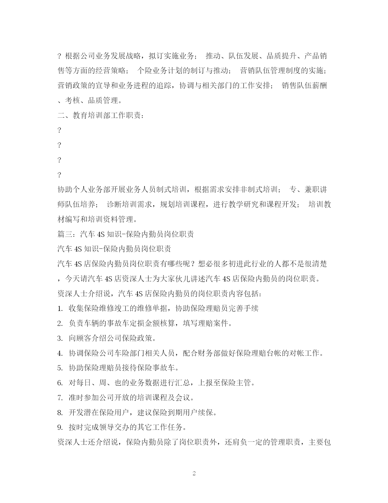 此资料由网络收集而来,如有侵权请告知上传者立即删除。资料共分享,我们负责传递知识。PAGEPAGE3保险内勤岗位职责篇一:5-保险内勤工作内容保险内勤工作内容内勤在企事业单位里是一个重要的组成部分,几乎涉及单位整体运作的方方面面。保险内勤主要配合相关内勤主管进行单证整理,出单及保单核对,业务相关资料录入存档等工作。总体来说工作比较琐碎,熟悉计算机操作及EXCEL表格的人员优势比较大。下面乔布简历小编就给大家讲一下保险内勤工作内容:主要的工作内容:出单及核对保单,提醒外勤续保;录入与存档业务相关的资料;配合内勤主管进行单证整理。从思想上坚定信心,明确方向,充分认识市场形势。利用各种机会,转变工作人员的观念,增强公司凝聚力。针对全年各阶段经营重点,积极配合公司各项安排,结合实际情况,适时推出竞赛方案,有针对性的进行业绩拉动。团队主管强化目标意识,增强主管的带动意识;团队精英强化荣誉感,加强训练和培养。针对各个层级人员,明确职责定位,强化岗位意识和工作责任心。促进各个部门传达咨询,研讨工作方法,商议各类问题。除此之外,还有理赔内勤:负责接报案,审核索赔材料是否齐全有效,缮制赔案,提交审批等;理赔外勤:负责案件的现场查勘和核定损失,相对于业务员,仍然属于内勤;财务内勤:与其它单位职责差不多,不同的是还包括应收保费的控制。以上就是乔布简历小编给大家整理的保险内勤工作内容,希望对大家能有所帮助。本文来源个人简历模板http://cv.qiaobutang.com/篇二:保险公司内勤组织架构与工作职责保险公司内勤组织架构与工作职责一、个人业务部工作职责:??????根据公司业务发展战略,拟订实施业务;推动、队伍发展、品质提升、产品销售等方面的经营策略;个险业务计划的制订与推动;营销队伍管理制度的实施;营销政策的宣导和业务进程的追踪,协调与相关部门的工作安排;销售队伍薪酬、考核、品质管理。二、教育培训部工作职责:????协助个人业务部开展业务人员制式培训,根据需求安排非制式培训;专、兼职讲师队伍培养;诊断培训需求,规划培训课程,进行教学研究和课程开发;培训教材编写和培训资料管理。篇三:汽车4S知识-保险内勤员岗位职责汽车4S知识-保险内勤员岗位职责汽车4S店保险内勤员岗位职责有哪些呢?想必很多初进此行业的人都不是很清楚,今天请汽车4S店资深人士为大家伙儿讲述汽车4S店保险内勤员的岗位职责。资深人士介绍说,汽车4S店保险内勤员的岗位职责内容包括:1.收集保险维修竣工的维修单据,协助保险理赔员完善手续2.负责车辆的事故车定损金额核算,填写理赔案件。3.向顾客介绍公司保险政策。4.协调保险公司车险部门相关人员,配合财务部做好保险理赔台帐的对帐工作。5.协助保险理赔员接待保险事故车。6.对每日、周、也的业务数据进行汇总,上报至保险主管。7.准时参加公司开放的培训课程及会议。8.开发潜在保险用户,建议保险到期用户续保。9.按时完成领导交办的其它工作任务。资深人士还介绍说,保险内勤员除了岗位职责外,还肩负一定的管理职责,主要包括:1.对自我的工作环境进行5S管理,对同事的工作环境进行监督和提醒。2.对工作中的客户信息和重要资料应妥善保存,不泄露,不丢失。3.为保证顾客满意度,达成营业目标,在部门会议中提出自己的建议式意见。4.对所制定的各种业务表格的准确性负责。希望以上的知识能为您提供帮助。