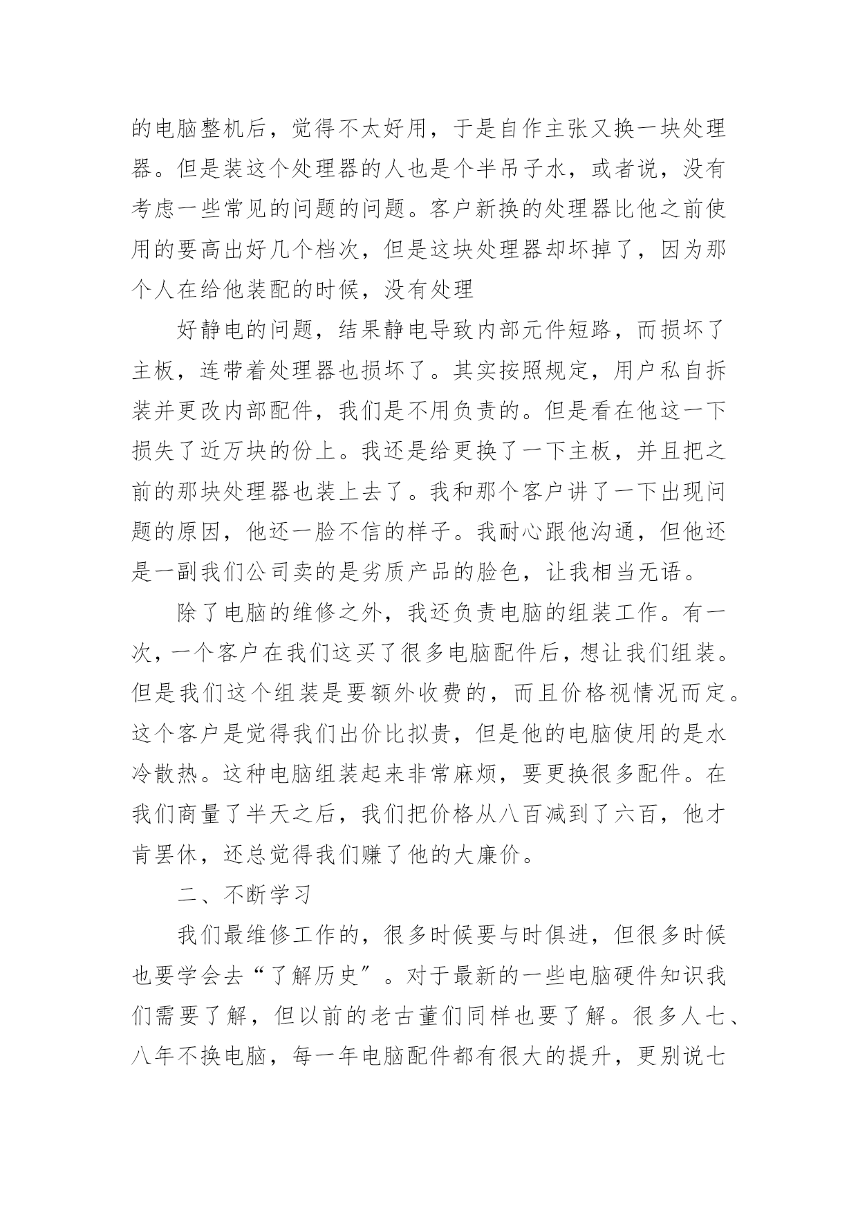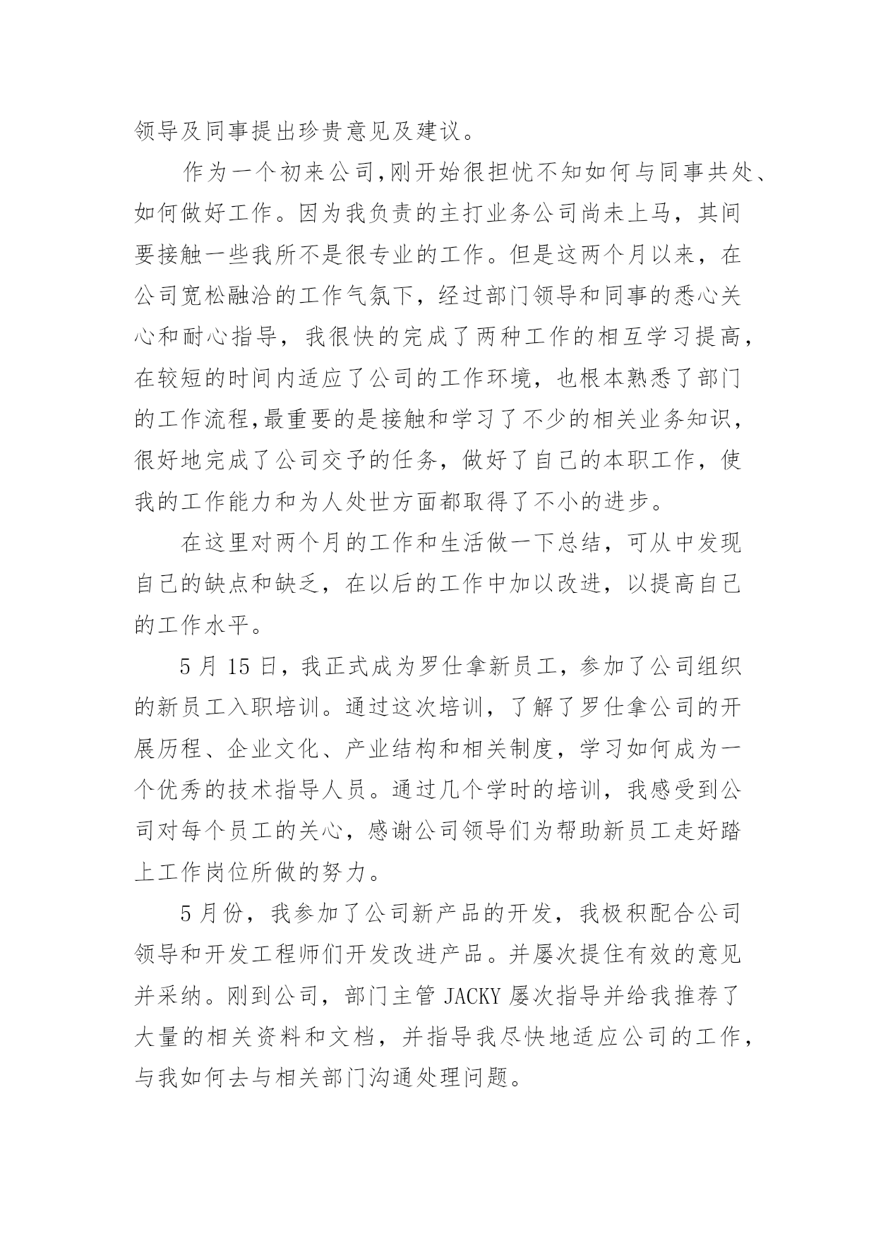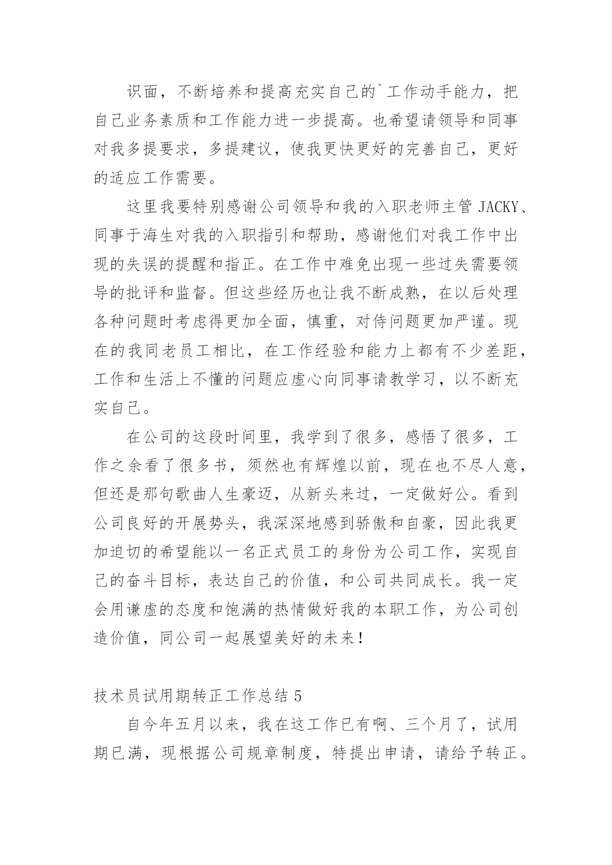 技术员试用期转正工作总结总结是指社会团体、企业单位和个人对某一阶段的学习、工作或其完成情况加以回顾和分析,得出教训和一些规律性认识的一种书面材料,它可以帮助我们总结以往思想,发扬成绩,因此我们需要回头归纳,写一份总结了。总结怎么写才能发挥它的作用呢?以下是小编为大家收集的技术员试用期转正工作总结,供大家参考借鉴,希望可以帮助到有需要的朋友。技术员试用期转正工作总结1我是xx电脑公司的一名技术人员,负责进行电脑的维修工作。前段时间,我才刚刚参加xx公司里工作,但因为我的技术很不错,且办事效率高,公司决定提前将我转正,下面我将谈谈我这段时间里的工作情况,并做一下总结。一、工作经历对于电脑的维修这份工作,我个人是非常喜欢的,我本人是一位电脑硬件发烧友,我喜欢去了解各种电脑里的硬件产品。闲暇之余,就是拼装各种电脑,虽然配件都一样,组装方法也差不多,但是不同的电脑之间所用到的硬件型号却不一样,因此很多时候都会有差异。有些装配起来很简单,而有些那么很麻烦。在我工作的`这段时间里,有一次让我印象很深刻的经历。那户人家购置了我们公司的整机,这户人家购置了我们的电脑整机后,觉得不太好用,于是自作主张又换一块处理器。但是装这个处理器的人也是个半吊子水,或者说,没有考虑一些常见的问题的问题。客户新换的处理器比他之前使用的要高出好几个档次,但是这块处理器却坏掉了,因为那个人在给他装配的时候,没有处理好静电的问题,结果静电导致内部元件短路,而损坏了主板,连带着处理器也损坏了。其实按照规定,用户私自拆装并更改内部配件,我们是不用负责的。但是看在他这一下损失了近万块的份上。我还是给更换了一下主板,并且把之前的那块处理器也装上去了。我和那个客户讲了一下出现问题的原因,他还一脸不信的样子。我耐心跟他沟通,但他还是一副我们公司卖的是劣质产品的脸色,让我相当无语。除了电脑的维修之外,我还负责电脑的组装工作。有一次,一个客户在我们这买了很多电脑配件后,想让我们组装。但是我们这个组装是要额外收费的,而且价格视情况而定。这个客户是觉得我们出价比拟贵,但是他的电脑使用的是水冷散热。这种电脑组装起来非常麻烦,要更换很多配件。在我们商量了半天之后,我们把价格从八百减到了六百,他才肯罢休,还总觉得我们赚了他的大廉价。二、不断学习我们最维修工作的,很多时候要与时俱进,但很多时候也要学会去“了解历史〞。对于最新的一些电脑硬件知识我们需要了解,但以前的老古董们同样也要了解。很多人七、八年不换电脑,每一年电脑配件都有很大的提升,更别说七八年甚至更久了,很多时候我们库存都找不到能使用的配件,更怕的是连硬件是什么型号都认不出来。技术员试用期转正工作总结2岗前培训中用心对待技术员的相关知识并将其与实践进行结合,实际上我所在的车间能够展开岗前培训也是让我感到有些难以置信与窃喜的,但是明白这个时机来之不易以后自然需要认真进行记录才不会浪费领导的好意,如果说我在试用期间的车间工作中有何亮点的话或许便是在岗前培训中格外认真,领导为了让我们这批新员工尽快熟悉车间内的工作安排了许多优秀员工进行讲课,而我也在这个过程中逐渐了解身为预备技术员的自己在正式工作中应该做些什么,可以说有了这次的铺垫以后便可以帮助自己在后续的`技术员工作中有所准备。审核产品时检验好质量并在师傅的讲解中记录好重要的地方,由于自己作为新晋技术员在工作中不够熟练的缘故需要配备老员工进行讲解,因此在这名师傅的讲解下我开始记录技术员在车间工作中的要点,而且自己在审核产品的时候师傅也会在一旁观察手法并指出缺乏,拥有着这样的人员配备仍出现错误的话只能说自己有些烂泥扶不上墙了,所幸的是在试用期间的磨砺中自己学到了很多技术员工作的实用经验,而且能够通过和师傅的相处在车间建立相应的人脉也是自己的意外收获。生产平安的学习中尊重车间的宣传成果并将其记在脑海中,由于自己试用期间刚好赶上车间展开生产平安的宣传工作自然要给予配合,我对技术员需要注意的局部做好了重点记录并在结束工作以后进行复习,而且在白天工作的时候为了将其进行检验还做好了设施维护方面的事务,毕竟作为试用期技术员却不重视车间统一安排的话未免有些太没眼力劲了,而且车间展开这方面的宣传工作也是为了让我们这些员工能够从中获得体会,这样的话今后车间的生产工作也能够因此而变得平安许多。试用期间的艰辛在转正的成果面前无疑是值得肯定的,正是因为前段时间的积累才能让我在车间工作中获得同事们的认可,只不过作为新晋技术员应当在今后的车间工作中注意尊敬老员工并团结同事,在团结一致的车间之中不断获得成长才是作为技术员应当去努力实现的事情。技术员试用期转正工作总结3在这个收获的季节里,我将自x月份入职公司到x月份工作分以下几个方面作总结:首先,对于我们刚出入社会的毕业生要面对的就是角色转型。在学校,面对的是单纯的学业课