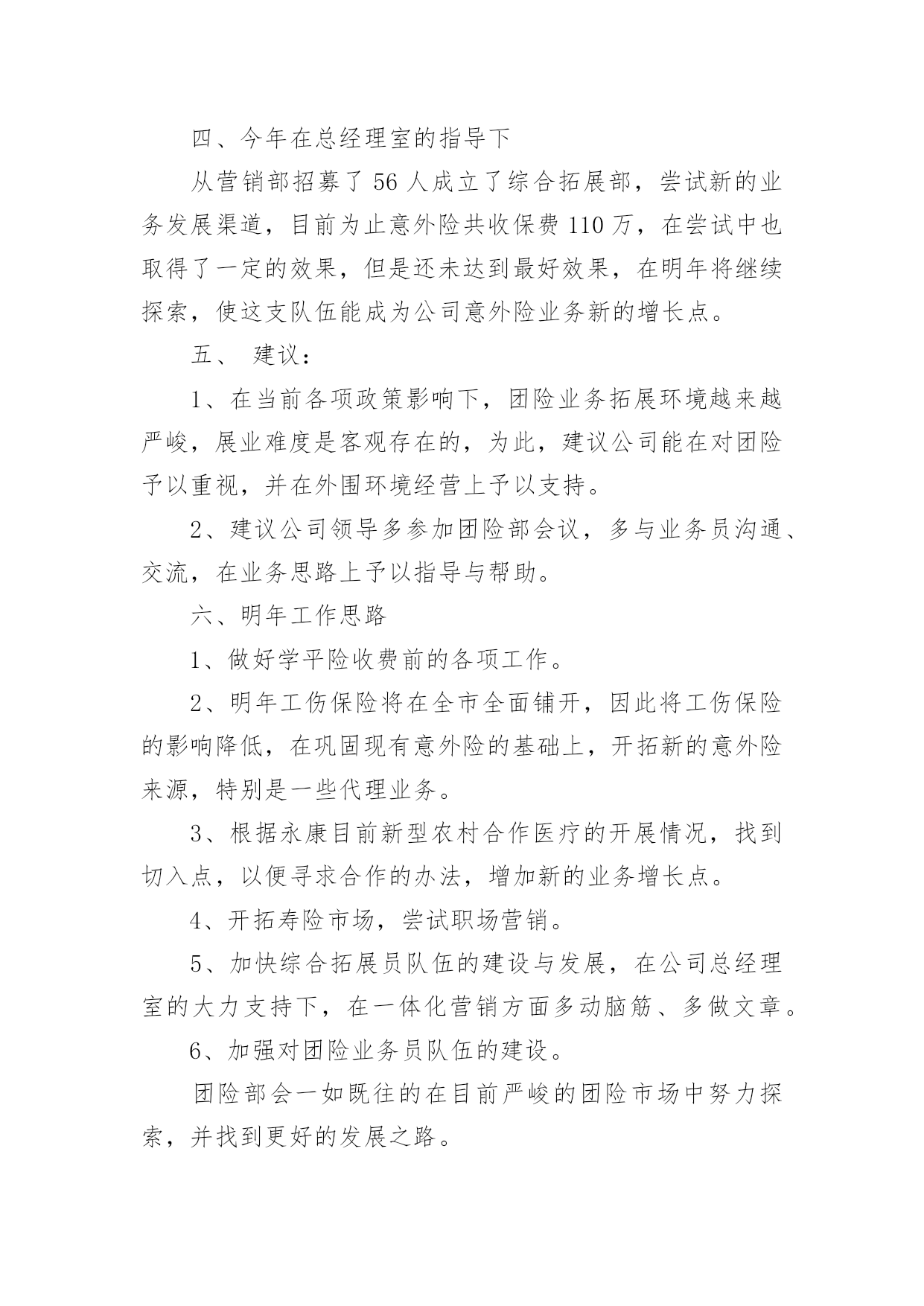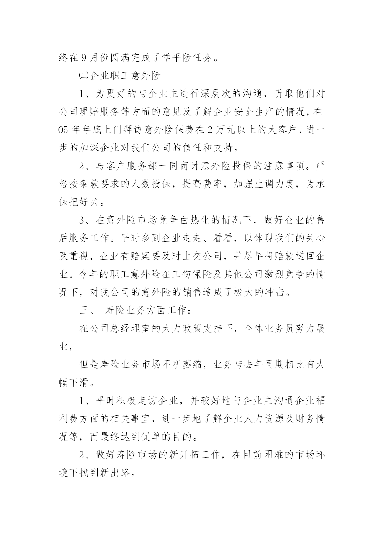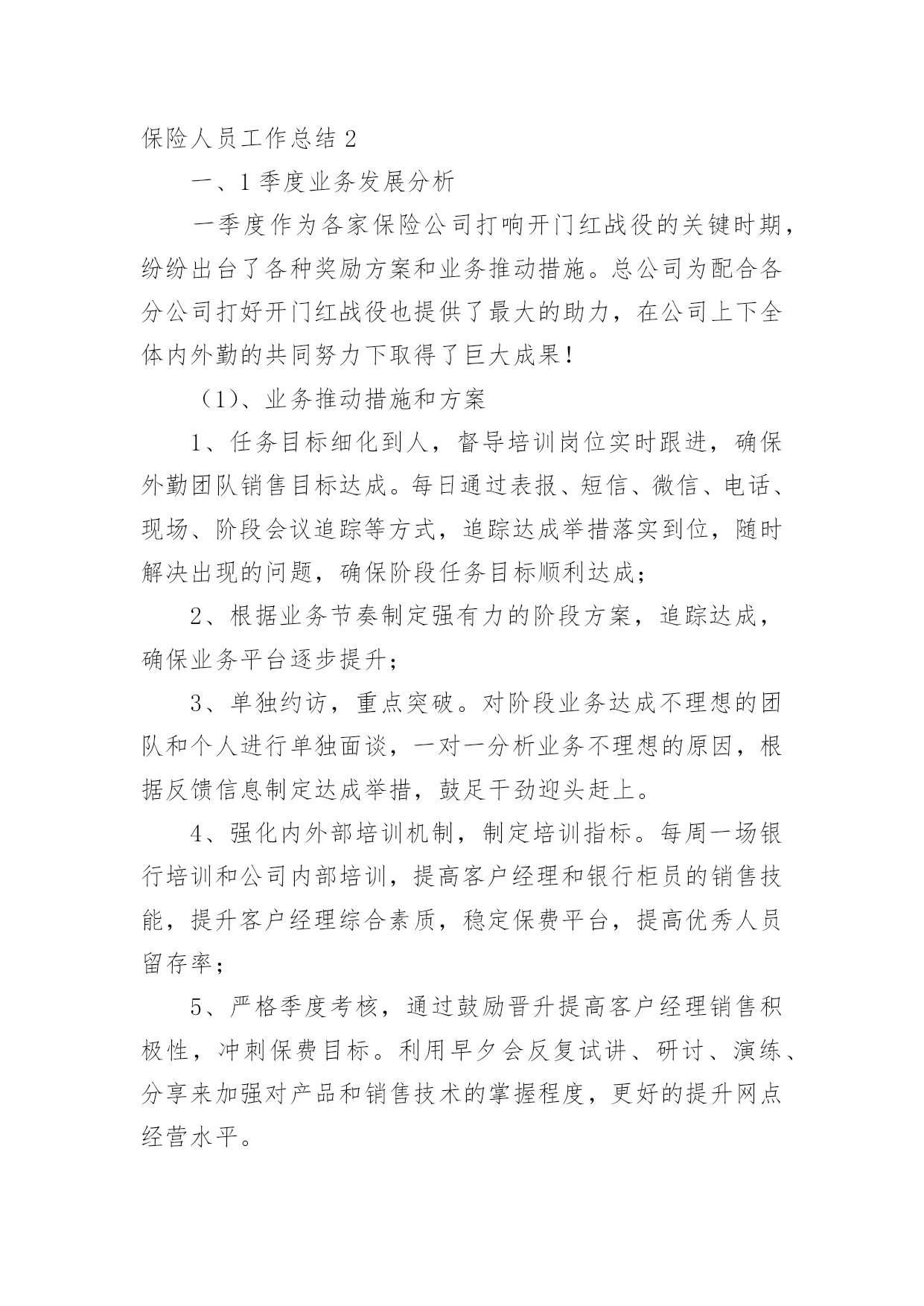 保险人员工作总结保险人员工作总结总结是事后对某一时期、某一项目或某些工作进行回顾和分析,从而做出带有规律性的结论,它可以促使我们思考,快快来写一份总结吧。那么总结要注意有什么内容呢?以下是小编帮大家整理的保险人员工作总结,欢迎大家借鉴与参考,希望对大家有所帮助。保险人员工作总结120xx年在充满挑战和激情工作中即将结束了,一年来,在公司总经理室的指挥下,团险部全体同仁积极领会总经理室工作意图和指示,在市场竞争日趋激烈的环境下努力拓展业务,为完成公司下达的任务指标而努力,现将20xx年全年团险工作作如下总结:一、员工管理、业务学习工作:1、年初按公司总经理室工作意图,在团险部内部人员重新进行配置,积极调动团险业务员和协保员的展业积极性。2、制定符合团险实际情况的管理制度,开好部门早会、及时传达上级指示精神,商讨工作中存在的问题,布置学习业务的相关新知识和新承保事项,使业务员能正确引导企业对职工意外险的认识,以减少业务的逆选择,降低赔付率。3、加强部门人员之间的沟通,统一了思想和工作方法,督促部门人员做好活动量管理,督促并较好地配合业务员多方位拓展业务。4、制订“开门红”、“国寿争霸”赛业务推动方案,经总经理室批复后,及时进行宣导、督促全体业务员做好各项业务管理工作。5、制订20xx年团险业务员的管理和考核办法,并对有些管理和考核办法方面作了相应的调整。二、意外险方面工作:㈠学平险:①一如既往地做好学平险的服务工作。要求业务员每月两次到学校回访,有问题及时与学校领导或经办人做好沟通,联络感情。做到学校有赔案及时上交公司,并将赔款及时送回学校或家长手里,充分履行我们的诚信服务工作。②为了确保学平险市场的.稳定与人保公司合作进行学平险的展业,全面贯彻省保险协会下发的文件精神,对学平险收费标准进行再次明确,全面安排业务员与各学校领导及经办人进行联络沟通,听取他们对公司服务及其他方面的意见,在公司总经理室的有力支持下,加强与市教育局领导的联系,取得了市教育局领导的大力支持,使今年的学平险续收工作顺利完成打下坚实基础。③在各学校即将放假前期,团险部对各大学校进行了走访,全体学平险服务人员在短短的几天内冒着酷暑将10万余份学平险《致学生家长的一封信和就医服务指南》及时送到学校,发至全体学生家长手中,做好前期学平险工作,最终在9月份圆满完成了学平险任务。㈡企业职工意外险1、为更好的与企业主进行深层次的沟通,听取他们对公司理赔服务等方面的意见及了解企业安全生产的情况,在05年年底上门拜访意外险保费在2万元以上的大客户,进一步的加深企业对我们公司的信任和支持。2、与客户服务部一同商讨意外险投保的注意事项。严格按条款要求的人数投保,提高费率,加强生调力度,为承保把好关。3、在意外险市场竞争白热化的情况下,做好企业的售后服务工作。平时多到企业走走、看看,以体现我们的关心及重视,企业有赔案要及时上交公司,并尽早将赔款送回企业。今年的职工意外险在工伤保险及其他公司激烈竞争的情况下,对我公司的意外险的销售造成了极大的冲击。三、寿险业务方面工作:在公司总经理室的大力政策支持下,全体业务员努力展业,但是寿险业务市场不断萎缩,业务与去年同期相比有大幅下滑。1、平时积极走访企业,并较好地与企业主沟通企业福利费方面的相关事宜,进一步地了解企业人力资源及财务情况等,而最终达到促单的目的。2、做好寿险市场的新开拓工作,在目前困难的市场环境下找到新出路。四、今年在总经理室的指导下从营销部招募了56人成立了综合拓展部,尝试新的业务发展渠道,目前为止意外险共收保费110万,在尝试中也取得了一定的效果,但是还未达到最好效果,在明年将继续探索,使这支队伍能成为公司意外险业务新的增长点。五、建议:1、在当前各项政策影响下,团险业务拓展环境越来越严峻,展业难度是客观存在的,为此,建议公司能在对团险予以重视,并在外围环境经营上予以支持。2、建议公司领导多参加团险部会议,多与业务员沟通、交流,在业务思路上予以指导与帮助。六、明年工作思路1、做好学平险收费前的各项工作。2、明年工伤保险将在全市全面铺开,因此将工伤保险的影响降低,在巩固现有意外险的基础上,开拓新的意外险来源,特别是一些代理业务。3、根据永康目前新型农村合作医疗的开展情况,找到切入点,以便寻求合作的办法,增加新的业务增长点。4、开拓寿险市场,尝试职场营销。5、加快综合拓展员队伍的建设与发展,在公司总经理室的大力支持下,在一体化营销方面多动脑筋、多做文章。6、加强对团险业务员队伍的建设。团险部会一如既往的在目前严峻的团险市场中努力探索,并找到更好的发展之路。保险人员工作总结2一、1季度业务发展分析一季度作为各家保险公司打响开门红战役的关键时期,纷纷出台了各种奖励方案和业务推动措施。总公司为配合各分公司打好开门红战役也提供了最大