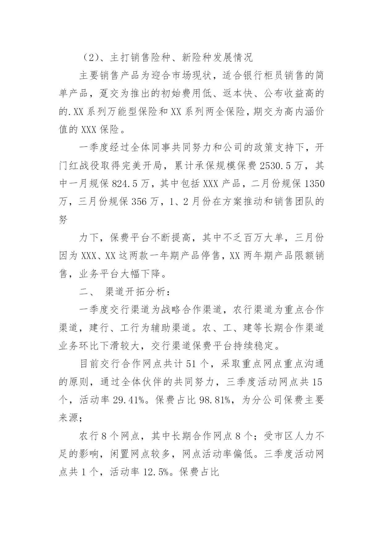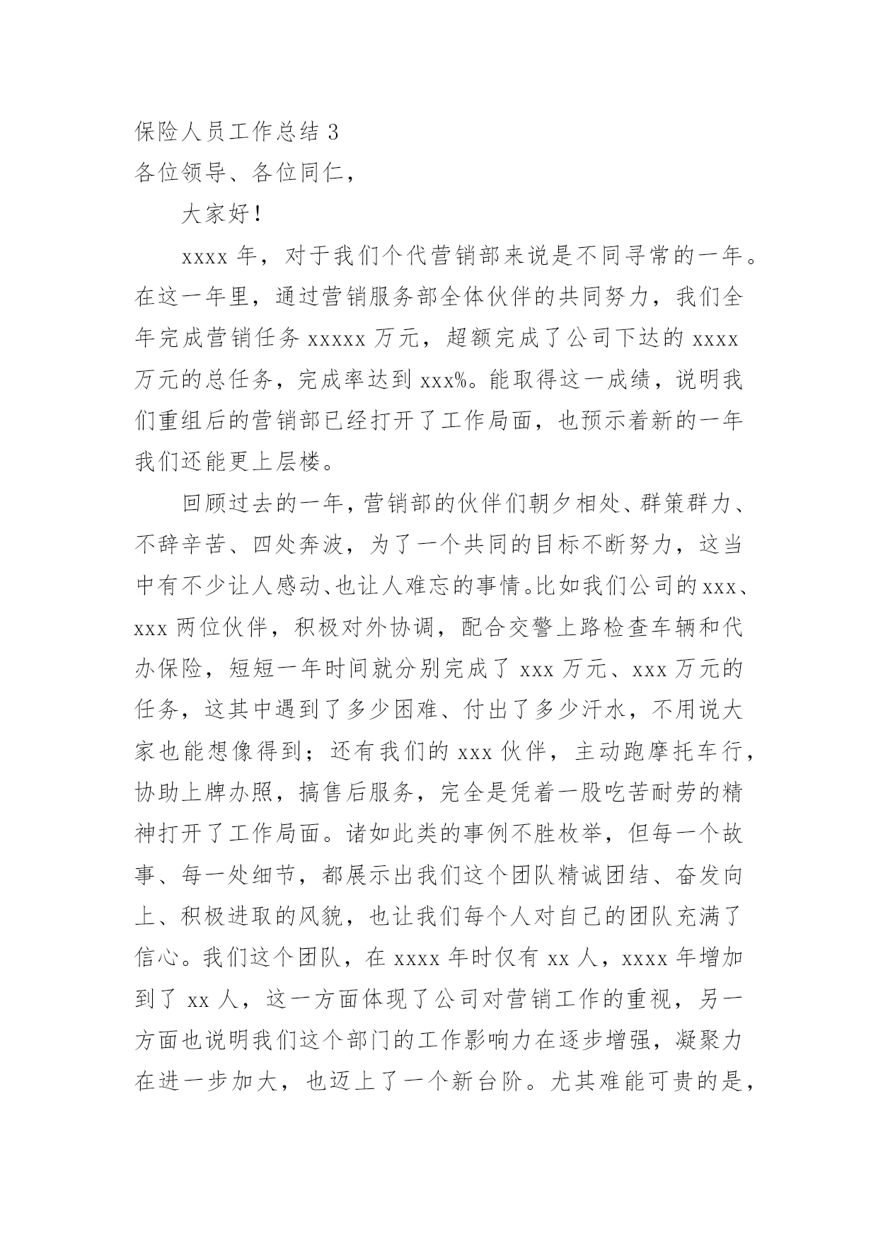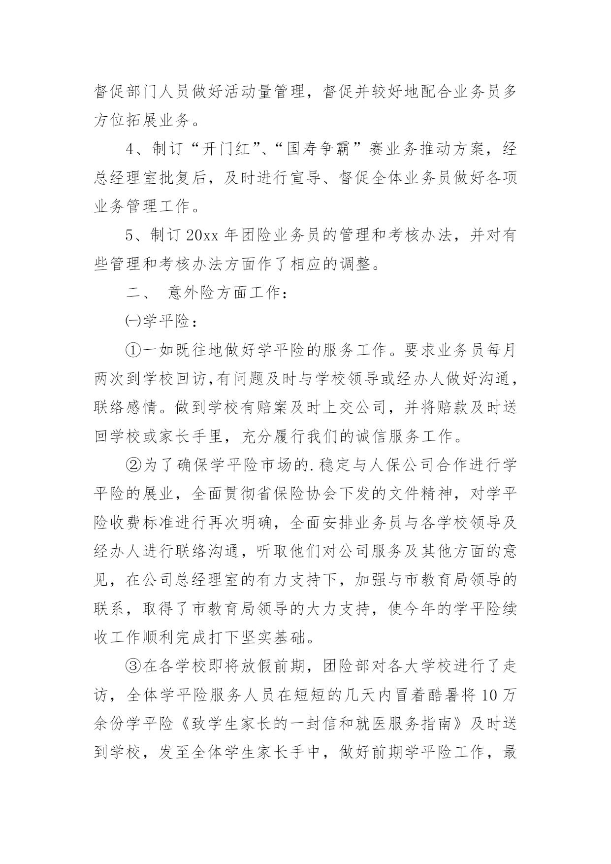 保险人员工作总结保险人员工作总结总结是事后对某一时期、某一项目或某些工作进行回顾和分析,从而做出带有规律性的结论,它可以促使我们思考,快快来写一份总结吧。那么总结要注意有什么内容呢?以下是小编帮大家整理的保险人员工作总结,欢迎大家借鉴与参考,希望对大家有所帮助。保险人员工作总结120xx年在充满挑战和激情工作中即将结束了,一年来,在公司总经理室的指挥下,团险部全体同仁积极领会总经理室工作意图和指示,在市场竞争日趋激烈的环境下努力拓展业务,为完成公司下达的任务指标而努力,现将20xx年全年团险工作作如下总结:一、员工管理、业务学习工作:1、年初按公司总经理室工作意图,在团险部内部人员重新进行配置,积极调动团险业务员和协保员的展业积极性。2、制定符合团险实际情况的管理制度,开好部门早会、及时传达上级指示精神,商讨工作中存在的问题,布置学习业务的相关新知识和新承保事项,使业务员能正确引导企业对职工意外险的认识,以减少业务的逆选择,降低赔付率。3、加强部门人员之间的沟通,统一了思想和工作方法,督促部门人员做好活动量管理,督促并较好地配合业务员多方位拓展业务。4、制订“开门红”、“国寿争霸”赛业务推动方案,经总经理室批复后,及时进行宣导、督促全体业务员做好各项业务管理工作。5、制订20xx年团险业务员的管理和考核办法,并对有些管理和考核办法方面作了相应的调整。二、意外险方面工作:㈠学平险:①一如既往地做好学平险的服务工作。要求业务员每月两次到学校回访,有问题及时与学校领导或经办人做好沟通,联络感情。做到学校有赔案及时上交公司,并将赔款及时送回学校或家长手里,充分履行我们的诚信服务工作。②为了确保学平险市场的.稳定与人保公司合作进行学平险的展业,全面贯彻省保险协会下发的文件精神,对学平险收费标准进行再次明确,全面安排业务员与各学校领导及经办人进行联络沟通,听取他们对公司服务及其他方面的意见,在公司总经理室的有力支持下,加强与市教育局领导的联系,取得了市教育局领导的大力支持,使今年的学平险续收工作顺利完成打下坚实基础。③在各学校即将放假前期,团险部对各大学校进行了走访,全体学平险服务人员在短短的几天内冒着酷暑将10万余份学平险《致学生家长的一封信和就医服务指南》及时送到学校,发至全体学生家长手中,做好前期学平险工作,最终在9月份圆满完成了学平险任务。㈡企业职工意外险1、为更好的与企业主进行深层次的沟通,听取他们对公司理赔服务等方面的意见及了解企业安全生产的情况,在05年年底上门拜访意外险保费在2万元以上的大客户,进一步的加深企业对我们公司的信任和支持。2、与客户服务部一同商讨意外险投保的注意事项。严格按条款要求的人数投保,提高费率,加强生调力度,为承保把好关。3、在意外险市场竞争白热化的情况下,做好企业的售后服务工作。平时多到企业走走、看看,以体现我们的关心及重视,企业有赔案要及时上交公司,并尽早将赔款送回企业。今年的职工意外险在工伤保险及其他公司激烈竞争的情况下,对我公司的意外险的销售造成了极大的冲击。三、寿险业务方面工作:在公司总经理室的大力政策支持下,全体业务员努力展业,但是寿险业务市场不断萎缩,业务与去年同期相比有大幅下滑。1、平时积极走访企业,并较好地与企业主沟通企业福利费方面的相关事宜,进一步地了解企业人力资源及财务情况等,而最终达到促单的目的。2、做好寿险市场的新开拓工作,在目前困难的市场环境下找到新出路。四、今年在总经理室的指导下从营销部招募了56人成立了综合拓展部,尝试新的业务发展渠道,目前为止意外险共收保费110万,在尝试中也取得了一定的效果,但是还未达到最好效果,在明年将继续探索,使这支队伍能成为公司意外险业务新的增长点。五、建议:1、在当前各项政策影响下,团险业务拓展环境越来越严峻,展业难度是客观存在的,为此,建议公司能在对团险予以重视,并在外围环境经营上予以支持。2、建议公司领导多参加团险部会议,多与业务员沟通、交流,在业务思路上予以指导与帮助。六、明年工作思路1、做好学平险收费前的各项工作。2、明年工伤保险将在全市全面铺开,因此将工伤保险的影响降低,在巩固现有意外险的基础上,开拓新的意外险来源,特别是一些代理业务。3、根据永康目前新型农村合作医疗的开展情况,找到切入点,以便寻求合作的办法,增加新的业务增长点。4、开拓寿险市场,尝试职场营销。5、加快综合拓展员队伍的建设与发展,在公司总经理室的大力支持下,在一体化营销方面多动脑筋、多做文章。6、加强对团险业务员队伍的建设。团险部会一如既往的在目前严峻的团险市场中努力探索,并找到更好的发展之路。保险人员工作总结2一、1季度业务发展分析一季度作为各家保险公司打响开门红战役的关键时期,纷纷出台了各种奖励方案和业务推动措施。总公司为配合各分公司打好开门红战役也提供了最大