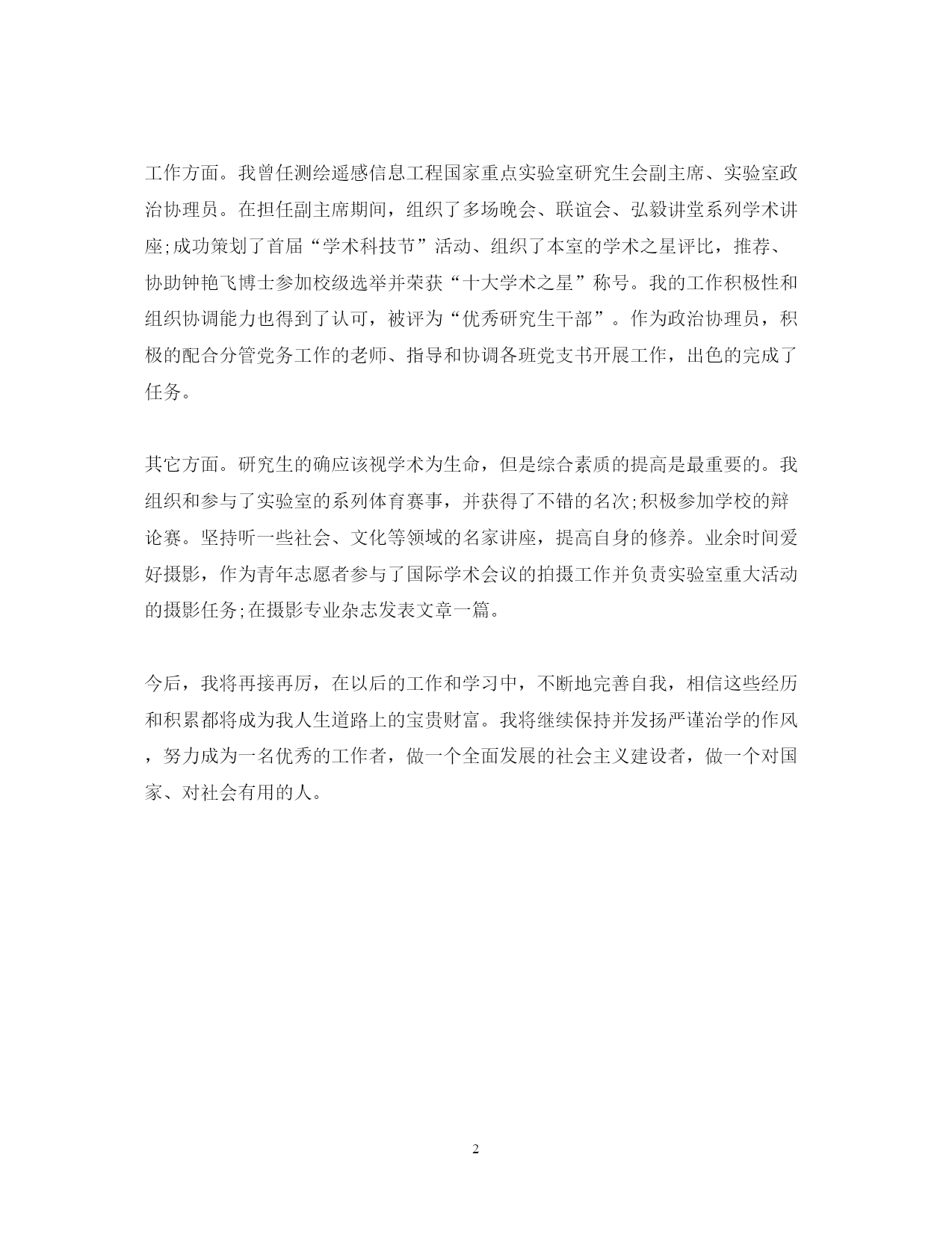 此资料由网络收集而来,如有侵权请告知上传者立即删除。资料共分享,我们负责传递知识。PAGEPAGE2研究生自我鉴定范文毕业之际,回顾三年来的学习、工作以及生活,做研究生自我鉴定如下:在思想觉悟上始终对自己有较高的要求,主动和党组织靠拢,尽管自己还没有计入党组织,但是自己始终以共产党员的高标准要求自己,能用科学发展观来认识世界认识社会,能清醒的意识到自己所担负的社会责任,对个人的人生理想和发展目标,有了相对成熟的认识和定位。在学习上,根据自身研究方向的要求,有针对性的认真研读了有关核心课程,为自己的科研工作打下扎实基础;并涉猎了一部分其他课程,开阔视野,对本人研究方向的应用背景以及整个学科的结构有了宏观的认识。在英语学习方面,通过了大学英语六级考试,具备了较强的英语听说能力,在撰写论文期间,查阅了大量的英文资料。在导师的指导下,积极参与各项教学科研活动,在教学实践的过程中,认真阅读教材、查阅学术资料和参考书籍,在课堂上在快乐中吸收各个知识点。同时自己具有较强的实践动手能力,参与了导师多项课题的研究,使自己的理论知识与实践水平得到了进一步的增强和提高,同时顺利完成了硕士毕业论文。生活中,为人处世和善热情,和同学关系融洽,并积极参与各项集体活动,在担任支委期间,热情为同学们服务。在研究生阶段所获颇丰,从学业、科研工作,到个人素质,都得到了充分的培养和锻炼,是充实且有意义的三年。相信这些经历和积累都将成为本人人生道路上的宝贵财富。在以后的工作和学习中,本人将继续保持并发扬严谨治学的作风,兢兢业业,争取取得更大的成绩。工作方面。我曾任测绘遥感信息工程国家重点实验室研究生会副主席、实验室政治协理员。在担任副主席期间,组织了多场晚会、联谊会、弘毅讲堂系列学术讲座;成功策划了首届“学术科技节”活动、组织了本室的学术之星评比,推荐、协助钟艳飞博士参加校级选举并荣获“十大学术之星”称号。我的工作积极性和组织协调能力也得到了认可,被评为“优秀研究生干部”。作为政治协理员,积极的配合分管党务工作的老师、指导和协调各班党支书开展工作,出色的完成了任务。其它方面。研究生的确应该视学术为生命,但是综合素质的提高是最重要的。我组织和参与了实验室的系列体育赛事,并获得了不错的名次;积极参加学校的辩论赛。坚持听一些社会、文化等领域的名家讲座,提高自身的修养。业余时间爱好摄影,作为青年志愿者参与了国际学术会议的拍摄工作并负责实验室重大活动的摄影任务;在摄影专业杂志发表文章一篇。今后,我将再接再厉,在以后的工作和学习中,不断地完善自我,相信这些经历和积累都将成为我人生道路上的宝贵财富。我将继续保持并发扬严谨治学的作风,努力成为一名优秀的工作者,做一个全面发展的社会主义建设者,做一个对国家、对社会有用的人。