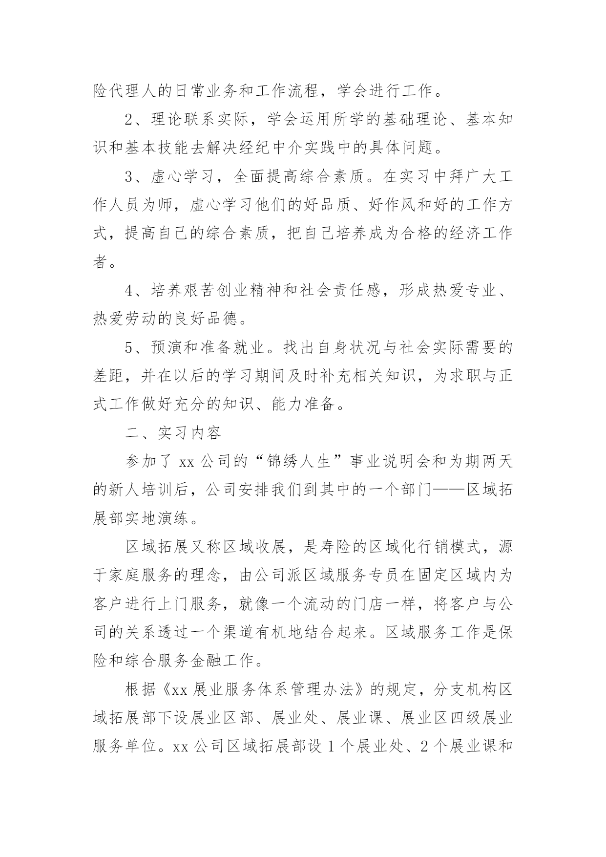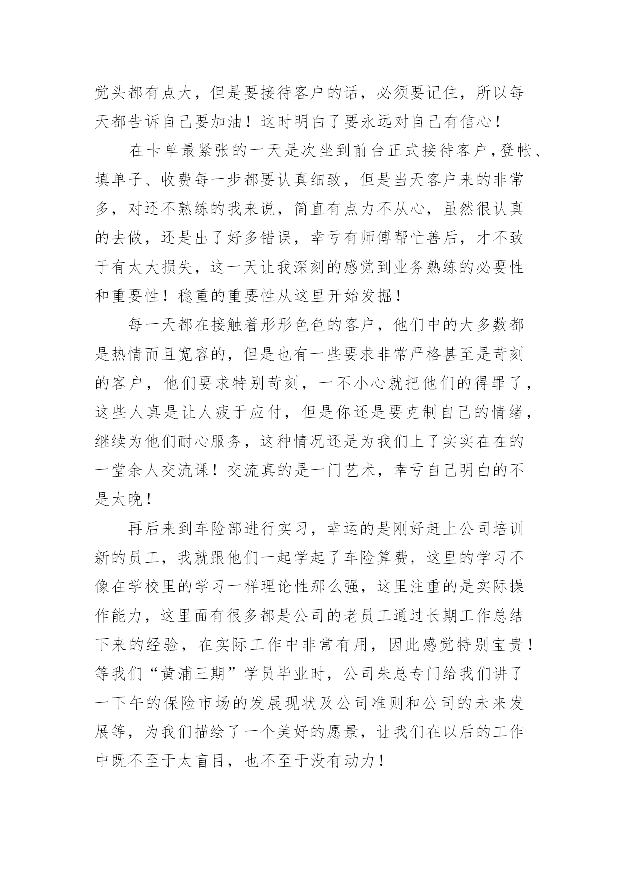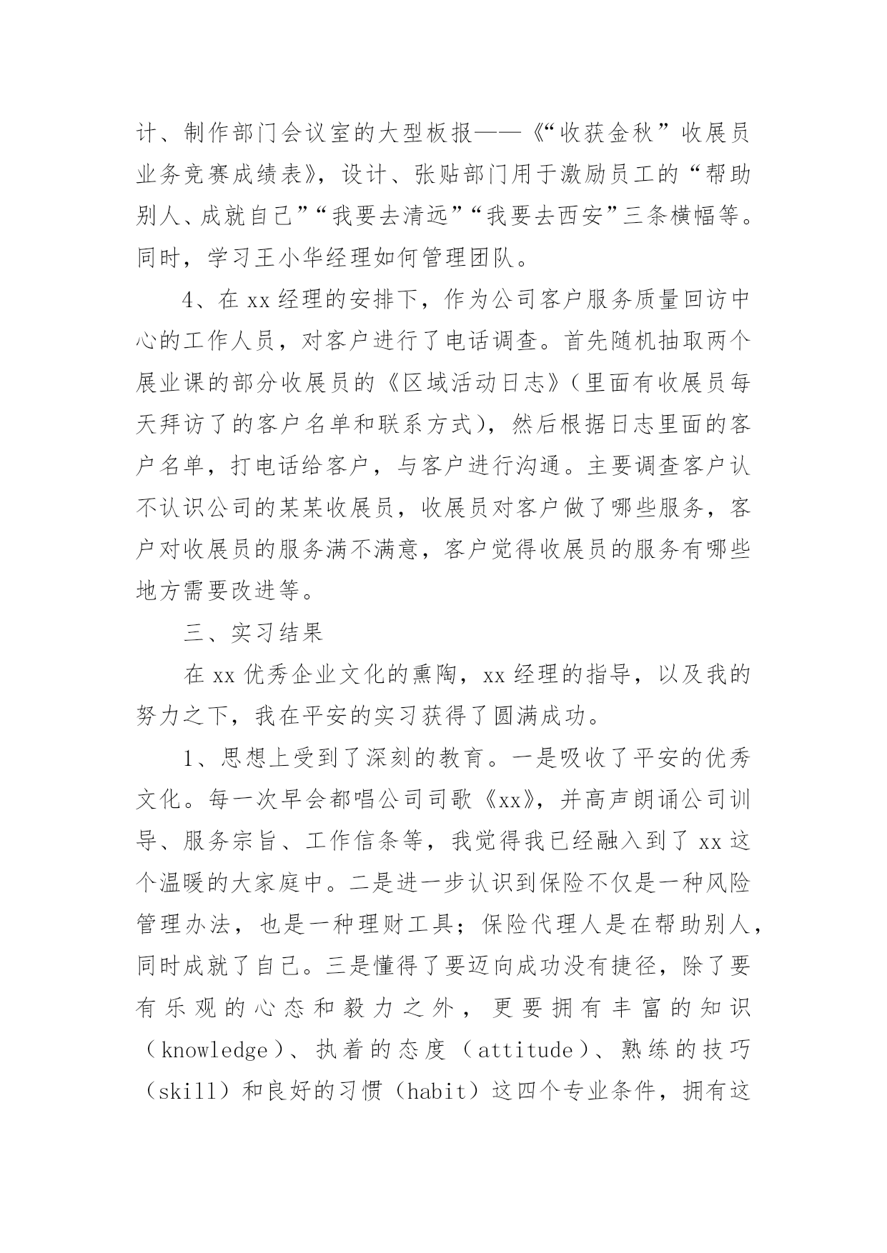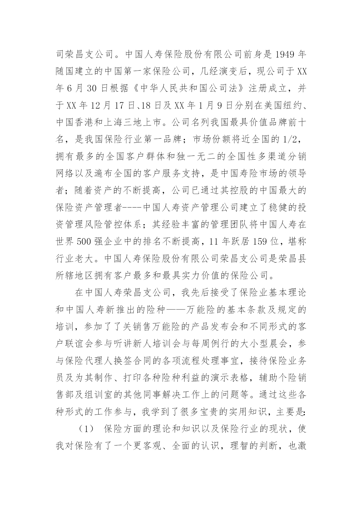 保险公司大学生实习报告我们眼下的社会,报告不再是罕见的东西,其在写作上有一定的技巧。我们应当如何写报告呢?下面是小编帮大家整理的保险公司大学生实习报告,欢迎大家借鉴与参考,希望对大家有所帮助。保险公司大学生实习报告篇1暑假次留在**进行实习,有幸能够来到**保险代理公司接受了一个月的锻炼,直接深入到社会职场中,与客户面对面的接触与交流,一方面把自己所学知识与实习直接相结合,另一方面又学到了许多学校里所学不到的经验与教训,从而使自己对自己有了更加全面的了解,因为自己学的是金融进入保险有些不情愿,但是一个暑假的实习结束,自己觉得其实这样的经历才是自己最想要的!7月13号正式来到**,老总热情的接待我们,然后我就被安排到了卡单部实习,”卡单”这个概念是次接触,其实就是短期意外险的另一种说法,这是最先让我觉得新鲜的东西。然后开始学习如何填写保单,天就填错了几张保单,发现自己原来是这么粗心,好在公司对我们都非常宽容,让我非常感动。这时明白了什么是宽容!接下来的几天我就一直在卡单部实习,每天每天要背卡单产品的信息,哪家保险公司有哪些产品,保障额度多少,适合哪些职业种类,适合那些人群,有哪些是拒保的职业。。。一下子记这么多东西,感觉头都有点大,但是要接待客户的话,必须要记住,所以每天都告诉自己要加油!这时明白了要永远对自己有信心!在卡单最紧张的一天是次坐到前台正式接待客户,登帐、填单子、收费每一步都要认真细致,但是当天客户来的非常多,对还不熟练的我来说,简直有点力不从心,虽然很认真的去做,还是出了好多错误,幸亏有师傅帮忙善后,才不致于有太大损失,这一天让我深刻的感觉到业务熟练的必要性和重要性!稳重的重要性从这里开始发掘!每一天都在接触着形形色色的客户,他们中的大多数都是热情而且宽容的,但是也有一些要求非常严格甚至是苛刻的客户,他们要求特别苛刻,一不小心就把他们的得罪了,这些人真是让人疲于应付,但是你还是要克制自己的情绪,继续为他们耐心服务,这种情况还是为我们上了实实在在的一堂余人交流课!交流真的是一门艺术,幸亏自己明白的不是太晚!再后来到车险部进行实习,幸运的是刚好赶上公司培训新的员工,我就跟他们一起学起了车险算费,这里的学习不像在学校里的学习一样理论性那么强,这里注重的是实际操作能力,这里面有很多都是公司的老员工通过长期工作总结下来的经验,在实际工作中非常有用,因此感觉特别宝贵!等我们“黄浦三期”学员毕业时,公司朱总专门给我们讲了一下午的保险市场的发展现状及公司准则和公司的未来发展等,为我们描绘了一个美好的愿景,让我们在以后的工作中既不至于太盲目,也不至于没有动力!公司现在与中国石化合作在很多加油站点开了一些车险的`直销网点,这在全国乃至全世界都是一个创新,而且在公司良好的管理方式的运作下,正在有条不紊的开展,让人感觉到创新的力量!真的非常佩服老总的头脑!这在我们以前接触保险的时候根本就没有想过的事情,想不到竟然在市场上悄然萌发,并展现出强大的生命力,真是震撼在以后的学习中告诉自己一定要懂得活学活用,读死书,死读书竟会变得没有未来!自己在**的每一天更多的是在发现自己,加速自己的成长,但是这种锻炼也是要付出代价的,自己每天早上挤公交从武昌到汉口,下午在从武昌到汉口,每天这么轮回!搞到自己现在看到汽车都有点晕,好在还知道坚持!坚持去发现美好的东西,学习有用的知识,虽然有点苦,但是痛并快乐着!保险公司大学生实习报告篇2在xx学院的统一安排下,我们一组共9位同学在xx保险股份有限公司xx支公司进行了毕业实习。一、实习的目的和要求毕业实习的目的是:接触实际,了解社会,增强劳动观点和社会主义事业心、责任感;学习业务知识和管理知识,巩固所学理论,获取本专业的实际知识,培养初步的实际工作能力和专业技能。具体要求如下:1、培养从事经纪中介工作的业务能力。了解并熟悉保险代理人的日常业务和工作流程,学会进行工作。2、理论联系实际,学会运用所学的基础理论、基本知识和基本技能去解决经纪中介实践中的具体问题。3、虚心学习,全面提高综合素质。在实习中拜广大工作人员为师,虚心学习他们的好品质、好作风和好的工作方式,提高自己的综合素质,把自己培养成为合格的经济工作者。4、培养艰苦创业精神和社会责任感,形成热爱专业、热爱劳动的良好品德。5、预演和准备就业。找出自身状况与社会实际需要的差距,并在以后的学习期间及时补充相关知识,为求职与正式工作做好充分的知识、能力准备。二、实习内容参加了xx公司的“锦绣人生”事业说明会和为期两天的新人培训后,公司安排我们到其中的一个部门——区域拓展部实地演练。区域拓展又称区域收展,是寿险的区域化行销模式,源于家庭服务的理念,由公司派区域服务专员在固定区域内为客户进行上门服务,就像一个流动的门店一样,将客户与公司的关系透过一个渠道有机地结合