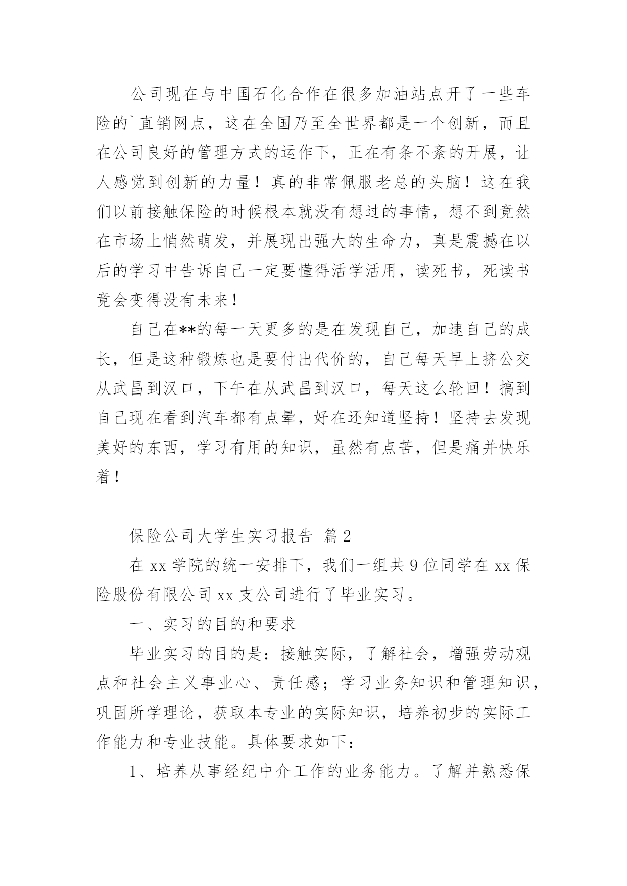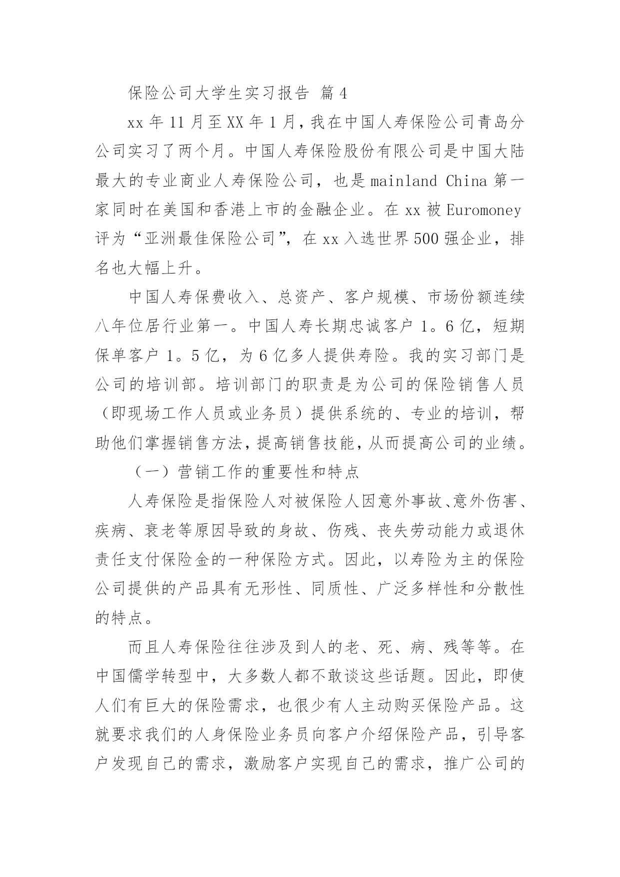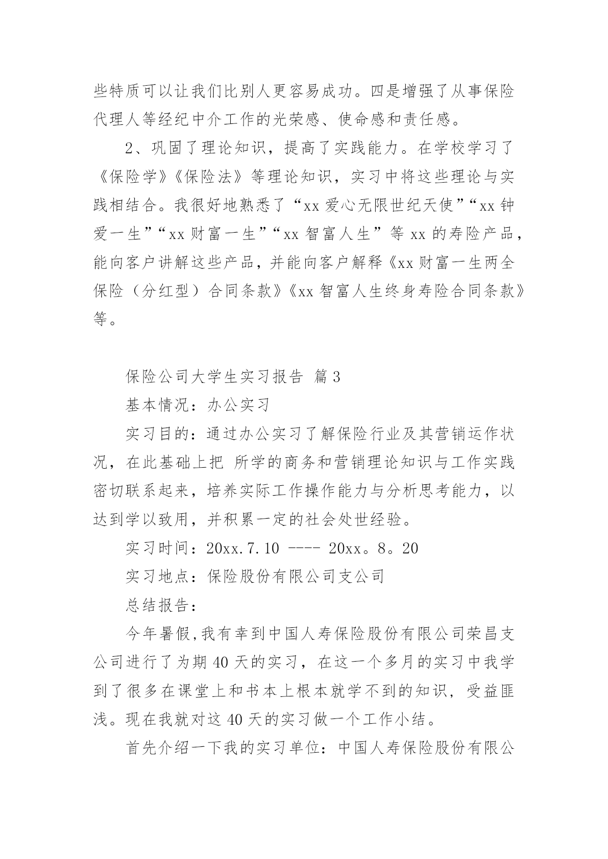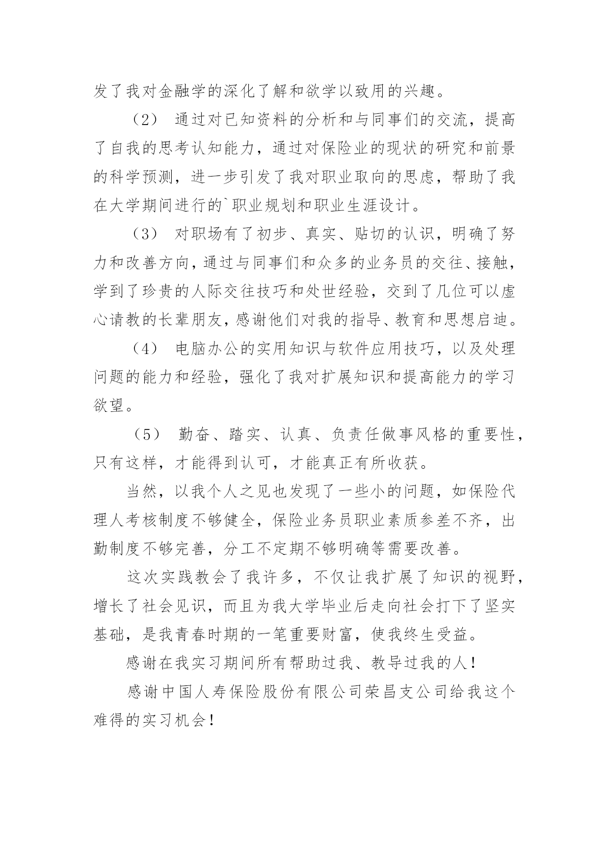 保险公司大学生实习报告我们眼下的社会,报告不再是罕见的东西,其在写作上有一定的技巧。我们应当如何写报告呢?下面是小编帮大家整理的保险公司大学生实习报告,欢迎大家借鉴与参考,希望对大家有所帮助。保险公司大学生实习报告篇1暑假次留在**进行实习,有幸能够来到**保险代理公司接受了一个月的锻炼,直接深入到社会职场中,与客户面对面的接触与交流,一方面把自己所学知识与实习直接相结合,另一方面又学到了许多学校里所学不到的经验与教训,从而使自己对自己有了更加全面的了解,因为自己学的是金融进入保险有些不情愿,但是一个暑假的实习结束,自己觉得其实这样的经历才是自己最想要的!7月13号正式来到**,老总热情的接待我们,然后我就被安排到了卡单部实习,”卡单”这个概念是次接触,其实就是短期意外险的另一种说法,这是最先让我觉得新鲜的东西。然后开始学习如何填写保单,天就填错了几张保单,发现自己原来是这么粗心,好在公司对我们都非常宽容,让我非常感动。这时明白了什么是宽容!接下来的几天我就一直在卡单部实习,每天每天要背卡单产品的信息,哪家保险公司有哪些产品,保障额度多少,适合哪些职业种类,适合那些人群,有哪些是拒保的职业。。。一下子记这么多东西,感觉头都有点大,但是要接待客户的话,必须要记住,所以每天都告诉自己要加油!这时明白了要永远对自己有信心!在卡单最紧张的一天是次坐到前台正式接待客户,登帐、填单子、收费每一步都要认真细致,但是当天客户来的非常多,对还不熟练的我来说,简直有点力不从心,虽然很认真的去做,还是出了好多错误,幸亏有师傅帮忙善后,才不致于有太大损失,这一天让我深刻的感觉到业务熟练的必要性和重要性!稳重的重要性从这里开始发掘!每一天都在接触着形形色色的客户,他们中的大多数都是热情而且宽容的,但是也有一些要求非常严格甚至是苛刻的客户,他们要求特别苛刻,一不小心就把他们的得罪了,这些人真是让人疲于应付,但是你还是要克制自己的情绪,继续为他们耐心服务,这种情况还是为我们上了实实在在的一堂余人交流课!交流真的是一门艺术,幸亏自己明白的不是太晚!再后来到车险部进行实习,幸运的是刚好赶上公司培训新的员工,我就跟他们一起学起了车险算费,这里的学习不像在学校里的学习一样理论性那么强,这里注重的是实际操作能力,这里面有很多都是公司的老员工通过长期工作总结下来的经验,在实际工作中非常有用,因此感觉特别宝贵!等我们“黄浦三期”学员毕业时,公司朱总专门给我们讲了一下午的保险市场的发展现状及公司准则和公司的未来发展等,为我们描绘了一个美好的愿景,让我们在以后的工作中既不至于太盲目,也不至于没有动力!公司现在与中国石化合作在很多加油站点开了一些车险的`直销网点,这在全国乃至全世界都是一个创新,而且在公司良好的管理方式的运作下,正在有条不紊的开展,让人感觉到创新的力量!真的非常佩服老总的头脑!这在我们以前接触保险的时候根本就没有想过的事情,想不到竟然在市场上悄然萌发,并展现出强大的生命力,真是震撼在以后的学习中告诉自己一定要懂得活学活用,读死书,死读书竟会变得没有未来!自己在**的每一天更多的是在发现自己,加速自己的成长,但是这种锻炼也是要付出代价的,自己每天早上挤公交从武昌到汉口,下午在从武昌到汉口,每天这么轮回!搞到自己现在看到汽车都有点晕,好在还知道坚持!坚持去发现美好的东西,学习有用的知识,虽然有点苦,但是痛并快乐着!保险公司大学生实习报告篇2在xx学院的统一安排下,我们一组共9位同学在xx保险股份有限公司xx支公司进行了毕业实习。一、实习的目的和要求毕业实习的目的是:接触实际,了解社会,增强劳动观点和社会主义事业心、责任感;学习业务知识和管理知识,巩固所学理论,获取本专业的实际知识,培养初步的实际工作能力和专业技能。具体要求如下:1、培养从事经纪中介工作的业务能力。了解并熟悉保险代理人的日常业务和工作流程,学会进行工作。2、理论联系实际,学会运用所学的基础理论、基本知识和基本技能去解决经纪中介实践中的具体问题。3、虚心学习,全面提高综合素质。在实习中拜广大工作人员为师,虚心学习他们的好品质、好作风和好的工作方式,提高自己的综合素质,把自己培养成为合格的经济工作者。4、培养艰苦创业精神和社会责任感,形成热爱专业、热爱劳动的良好品德。5、预演和准备就业。找出自身状况与社会实际需要的差距,并在以后的学习期间及时补充相关知识,为求职与正式工作做好充分的知识、能力准备。二、实习内容参加了xx公司的“锦绣人生”事业说明会和为期两天的新人培训后,公司安排我们到其中的一个部门——区域拓展部实地演练。区域拓展又称区域收展,是寿险的区域化行销模式,源于家庭服务的理念,由公司派区域服务专员在固定区域内为客户进行上门服务,就像一个流动的门店一样,将客户与公司的关系透过一个渠道有机地结合