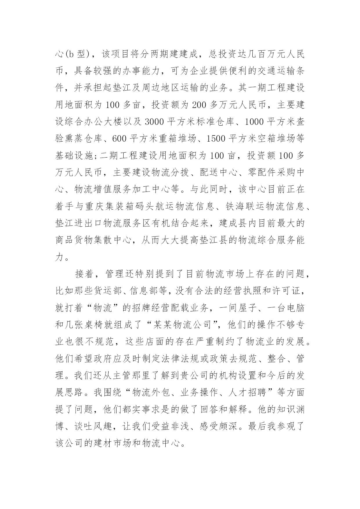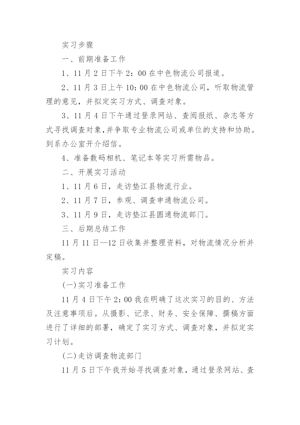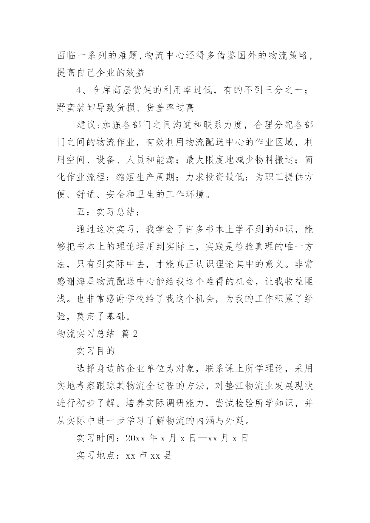 物流实习总结物流实习总结汇总10篇总结是在某一时期、某一项目或某些工作告一段落或者全部完成后进行回顾检查、分析评价,从而得出教训和一些规律性认识的一种书面材料,它在我们的学习、工作中起到呈上启下的作用,让我们抽出时间写写总结吧。那么总结要注意有什么内容呢?以下是小编为大家收集的物流实习总结10篇,欢迎阅读,希望大家能够喜欢。物流实习总结篇1实习时间:200*年5月23日---6月1日一:实习目的:为了以后能更好的适应工作和学习,学校组织到**流配送中心进行为期30天的实习。主要是熟悉物流的作业流程,掌握物流的工作流程,以便对我国的物流业能有更深的了解。二:实习要求:了解物流特点,物流工作流程,工作设备,并针对这些实践依靠自己所学的理论提出自己的观点和看法。三:实习感想:随着世界经济一体化步伐的加快,国际经济贸易发展日益活跃,我国的物流行业得到迅速发展.虽然这次实习时间很短,却给我上了人生历程中不可或缺的一课.对于物流,我只是知道它是集:运输、储存、搬运、包装、流通加工、配送、信息处理等基本功能实施的有机结合。但没有想到它的实际操作却没有这么的简单。通过十一点作为国人的物流人士有着切肤的体会。货物运转速度慢,货差货损率高难以避免,高层货架利用率严天的简单了解,使我对于物流配送有了更加深刻的认识。中国的物流业虽然没有国外发达,但这并代表中国物流业的落后,一些原则性[譬如中国劳动力廉价的国情]严重的制约了中国物流业信息技术化的发展速度。野蛮的装卸态度更是制约中国物流业发展的瓶颈之一。这次实习让我从实践中了解到了物流,使实践与理论更好的结合.在这里我深刻的领悟到了一个观点:推动你的事业,不要让你的事业来推动你.四:实习结论及建议:1、进货堆放货物时不能只顾着一时的方便,应该考虑到出货时的方便,不能耽误客户的时间,因此要按照标准把货物堆起,堆放要整齐合理,以免倒塌.2、要严格按照仓储管理的要求,对于过期的货物要及时与厂家联系,并得到应允后及时销毁,不要堆积在仓库中,浪费仓库容积,更不要和正常的商品同放一起,带给人一种杂乱无章的感觉.应该另外准备一间仓库,使那些一时无法销毁的商品有地方储存.3、目前物流中心正面临许多问题,批次越来越多而批量却越来越小,造成物流管理上的一个难点.产前物流,企业内部物流,销售物流,在供应链的管理上如何把握住这三块之间的关系.国内的物流利润太低,仅占5%,如何把利润搞上去.面临一系列的难题,物流中心还得多借鉴国外的物流策略,提高自己企业的效益4、仓库高层货架的利用率过低,有的不到三分之一;野蛮装卸导致货损、货差率过高建议:加强各部门之间沟通和联系力度,合理分配各部门之间的物流作业,有效利用物流配送中心的作业区域,利用空间、设备、人员和能源;最大限度地减少物料搬运;简化作业流程;缩短生产周期;力求投资最低;为职工提供方便、舒适、安全和卫生的工作环境。五:实习总结:通过这次实习,我学会了许多书本上学不到的知识,能够把书本上的理论运用到实际上,实践是检验真理的唯一方法,只有到实际中去,才能真正认识理论其中的意义。非常感谢海星物流配送中心能给我这个难得的机会,让我收益匪浅。也非常感谢学校给了我这个机会,为我的工作积累了经验,奠定了基础。物流实习总结篇2实习目的选择身边的企业单位为对象,联系课上所学理论,采用实地考察跟踪其物流全过程的方法,对垫江物流业发展现状进行初步了解。培养实际调研能力,尝试检验所学知识,并从实际中进一步学习了解物流的内涵与外延。实习时间:20xx年x月x日—xx月x日实习地点:xx市xx县实习步骤一、前期准备工作1、11月2日下午2:00在中色物流公司报道。2、11月3日上午10:00在中色物流公司,听取物流管理的意见,并拟定实习方式、调查对象。3、11月4日下午通过登录网站、查阅报纸、杂志等方式寻找调查对象,并争取专业物流公司或单位的支持和协助。到系办公室开介绍信。4、准备数码相机、笔记本等实习所需物品。二、开展实习活动1、11月6日,走访垫江县物流行业。2、11月7日,参观、调查申通物流公司。3、11月9日,走访垫江县圆通物流部门。三、后期总结工作11月11日—12日收集并整理资料,对物流情况分析并定稿。实习内容(一)实习准备工作11月4日下午2:00我在明确了这次实习的目的、方法及注意事项后。从摄影、记录、财务、安全保障、撰稿方面进行了详细的部署,确定了实习方式、调查对象,并拟定实习计划。(二)走访调查物流部门11月5日下午我开始寻找调查对象,通过登录网站、查阅报纸、杂志等方式寻找专业物流公司,在垫江物流网上我们搜到几家物流公司,但当我们致电争取公司支持和协助时,却一次次遭到拒绝和打击。其中有的公司很干脆:没时间接待;有的单位老总出差,没人可以做主接待我们;有的要申请总经理的同意,可是就没