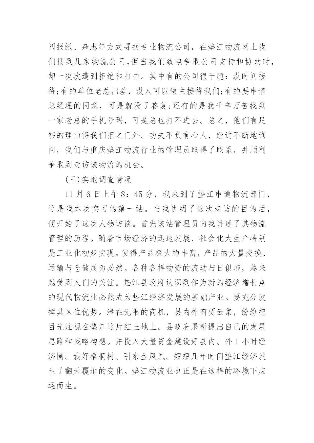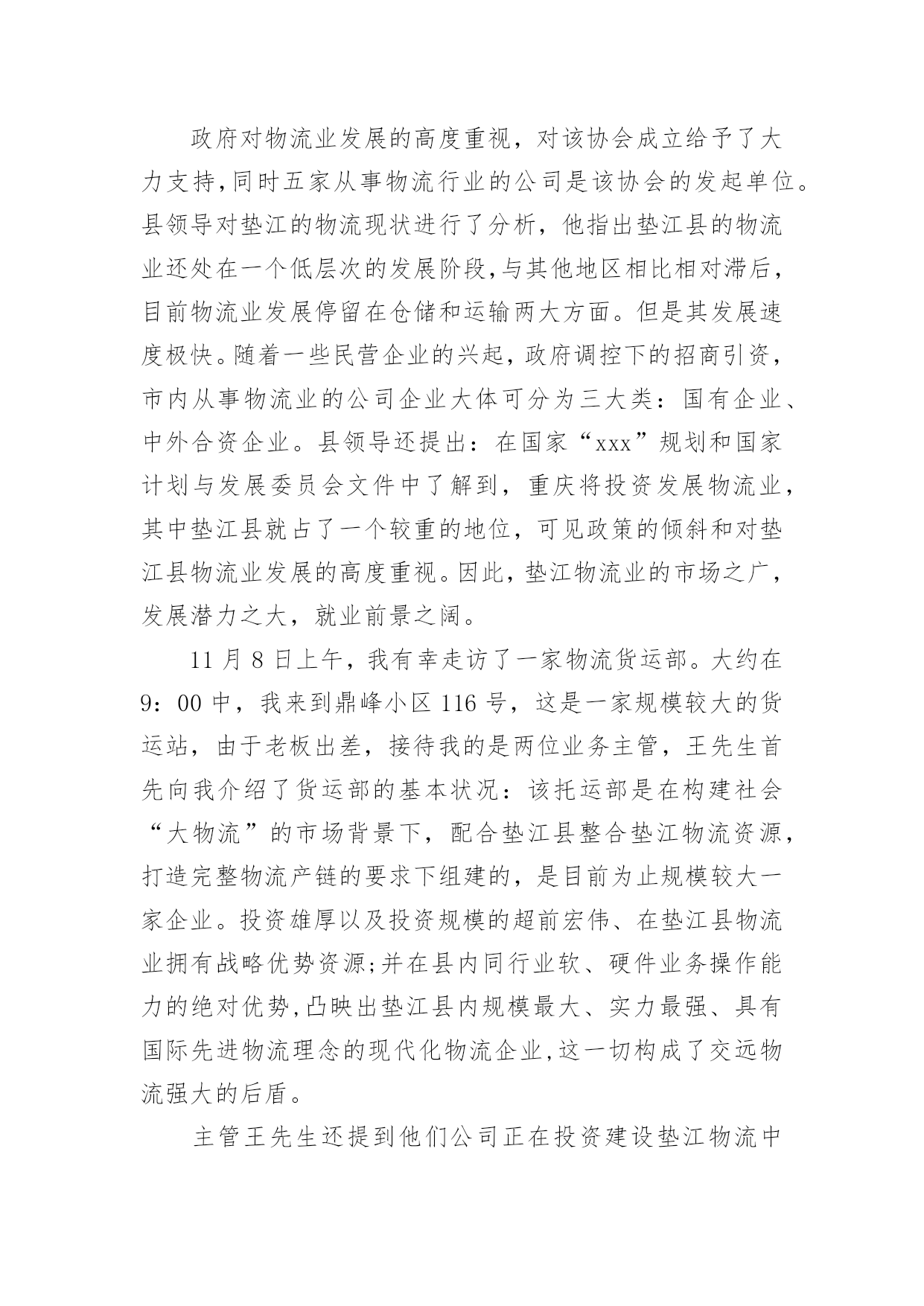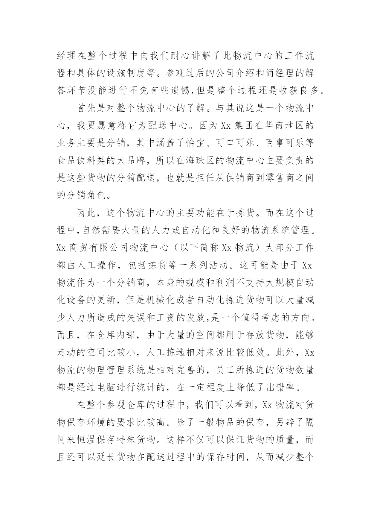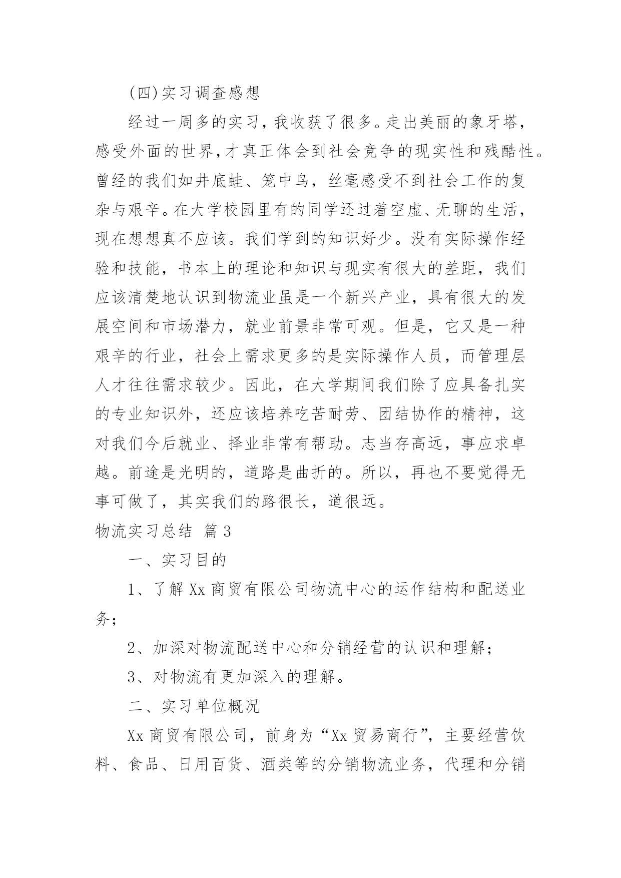 物流实习总结物流实习总结汇总10篇总结是在某一时期、某一项目或某些工作告一段落或者全部完成后进行回顾检查、分析评价,从而得出教训和一些规律性认识的一种书面材料,它在我们的学习、工作中起到呈上启下的作用,让我们抽出时间写写总结吧。那么总结要注意有什么内容呢?以下是小编为大家收集的物流实习总结10篇,欢迎阅读,希望大家能够喜欢。物流实习总结篇1实习时间:200*年5月23日---6月1日一:实习目的:为了以后能更好的适应工作和学习,学校组织到**流配送中心进行为期30天的实习。主要是熟悉物流的作业流程,掌握物流的工作流程,以便对我国的物流业能有更深的了解。二:实习要求:了解物流特点,物流工作流程,工作设备,并针对这些实践依靠自己所学的理论提出自己的观点和看法。三:实习感想:随着世界经济一体化步伐的加快,国际经济贸易发展日益活跃,我国的物流行业得到迅速发展.虽然这次实习时间很短,却给我上了人生历程中不可或缺的一课.对于物流,我只是知道它是集:运输、储存、搬运、包装、流通加工、配送、信息处理等基本功能实施的有机结合。但没有想到它的实际操作却没有这么的简单。通过十一点作为国人的物流人士有着切肤的体会。货物运转速度慢,货差货损率高难以避免,高层货架利用率严天的简单了解,使我对于物流配送有了更加深刻的认识。中国的物流业虽然没有国外发达,但这并代表中国物流业的落后,一些原则性[譬如中国劳动力廉价的国情]严重的制约了中国物流业信息技术化的发展速度。野蛮的装卸态度更是制约中国物流业发展的瓶颈之一。这次实习让我从实践中了解到了物流,使实践与理论更好的结合.在这里我深刻的领悟到了一个观点:推动你的事业,不要让你的事业来推动你.四:实习结论及建议:1、进货堆放货物时不能只顾着一时的方便,应该考虑到出货时的方便,不能耽误客户的时间,因此要按照标准把货物堆起,堆放要整齐合理,以免倒塌.2、要严格按照仓储管理的要求,对于过期的货物要及时与厂家联系,并得到应允后及时销毁,不要堆积在仓库中,浪费仓库容积,更不要和正常的商品同放一起,带给人一种杂乱无章的感觉.应该另外准备一间仓库,使那些一时无法销毁的商品有地方储存.3、目前物流中心正面临许多问题,批次越来越多而批量却越来越小,造成物流管理上的一个难点.产前物流,企业内部物流,销售物流,在供应链的管理上如何把握住这三块之间的关系.国内的物流利润太低,仅占5%,如何把利润搞上去.面临一系列的难题,物流中心还得多借鉴国外的物流策略,提高自己企业的效益4、仓库高层货架的利用率过低,有的不到三分之一;野蛮装卸导致货损、货差率过高建议:加强各部门之间沟通和联系力度,合理分配各部门之间的物流作业,有效利用物流配送中心的作业区域,利用空间、设备、人员和能源;最大限度地减少物料搬运;简化作业流程;缩短生产周期;力求投资最低;为职工提供方便、舒适、安全和卫生的工作环境。五:实习总结:通过这次实习,我学会了许多书本上学不到的知识,能够把书本上的理论运用到实际上,实践是检验真理的唯一方法,只有到实际中去,才能真正认识理论其中的意义。非常感谢海星物流配送中心能给我这个难得的机会,让我收益匪浅。也非常感谢学校给了我这个机会,为我的工作积累了经验,奠定了基础。物流实习总结篇2实习目的选择身边的企业单位为对象,联系课上所学理论,采用实地考察跟踪其物流全过程的方法,对垫江物流业发展现状进行初步了解。培养实际调研能力,尝试检验所学知识,并从实际中进一步学习了解物流的内涵与外延。实习时间:20xx年x月x日—xx月x日实习地点:xx市xx县实习步骤一、前期准备工作1、11月2日下午2:00在中色物流公司报道。2、11月3日上午10:00在中色物流公司,听取物流管理的意见,并拟定实习方式、调查对象。3、11月4日下午通过登录网站、查阅报纸、杂志等方式寻找调查对象,并争取专业物流公司或单位的支持和协助。到系办公室开介绍信。4、准备数码相机、笔记本等实习所需物品。二、开展实习活动1、11月6日,走访垫江县物流行业。2、11月7日,参观、调查申通物流公司。3、11月9日,走访垫江县圆通物流部门。三、后期总结工作11月11日—12日收集并整理资料,对物流情况分析并定稿。实习内容(一)实习准备工作11月4日下午2:00我在明确了这次实习的目的、方法及注意事项后。从摄影、记录、财务、安全保障、撰稿方面进行了详细的部署,确定了实习方式、调查对象,并拟定实习计划。(二)走访调查物流部门11月5日下午我开始寻找调查对象,通过登录网站、查阅报纸、杂志等方式寻找专业物流公司,在垫江物流网上我们搜到几家物流公司,但当我们致电争取公司支持和协助时,却一次次遭到拒绝和打击。其中有的公司很干脆:没时间接待;有的单位老总出差,没人可以做主接待我们;有的要申请总经理的同意,可是就没