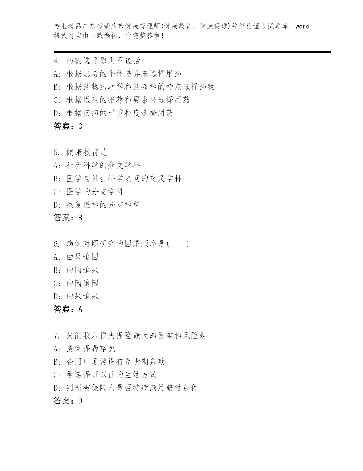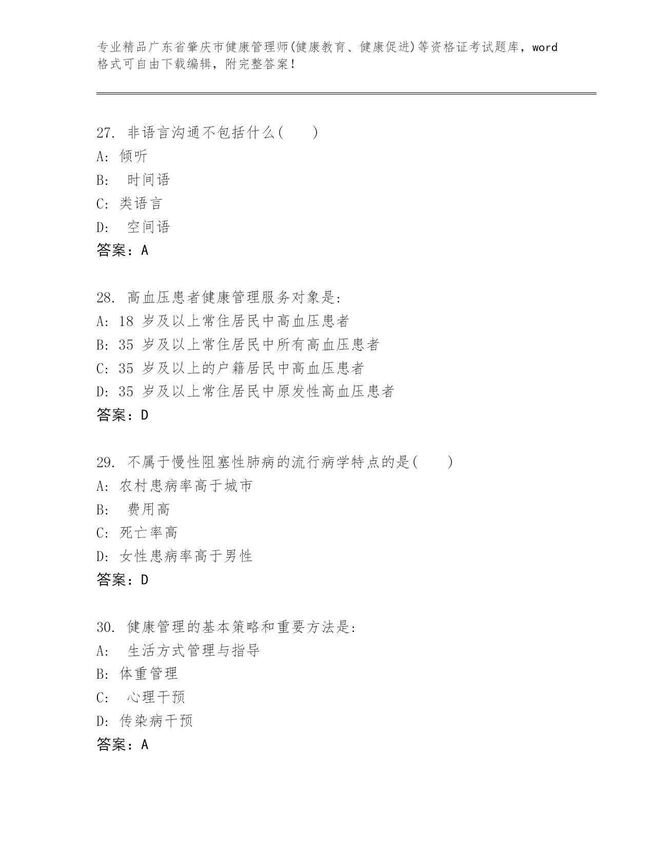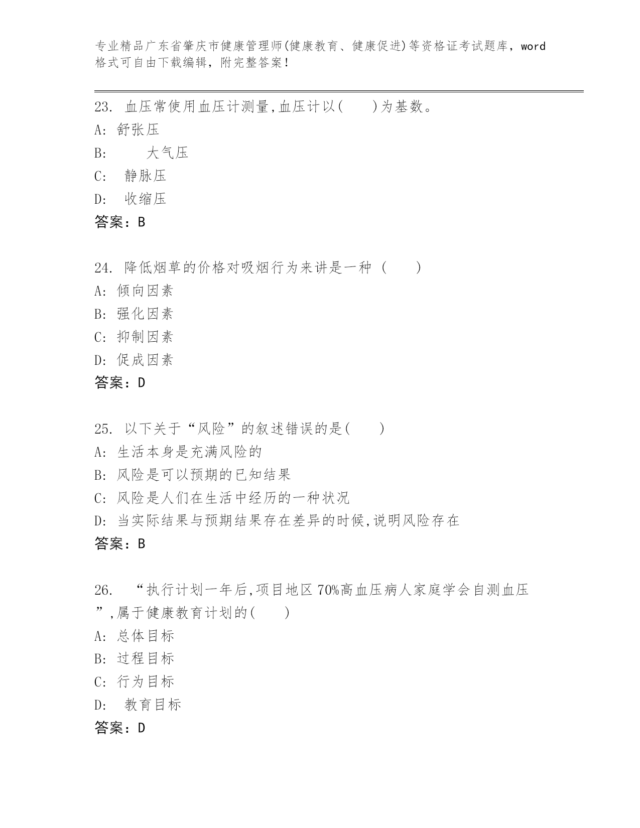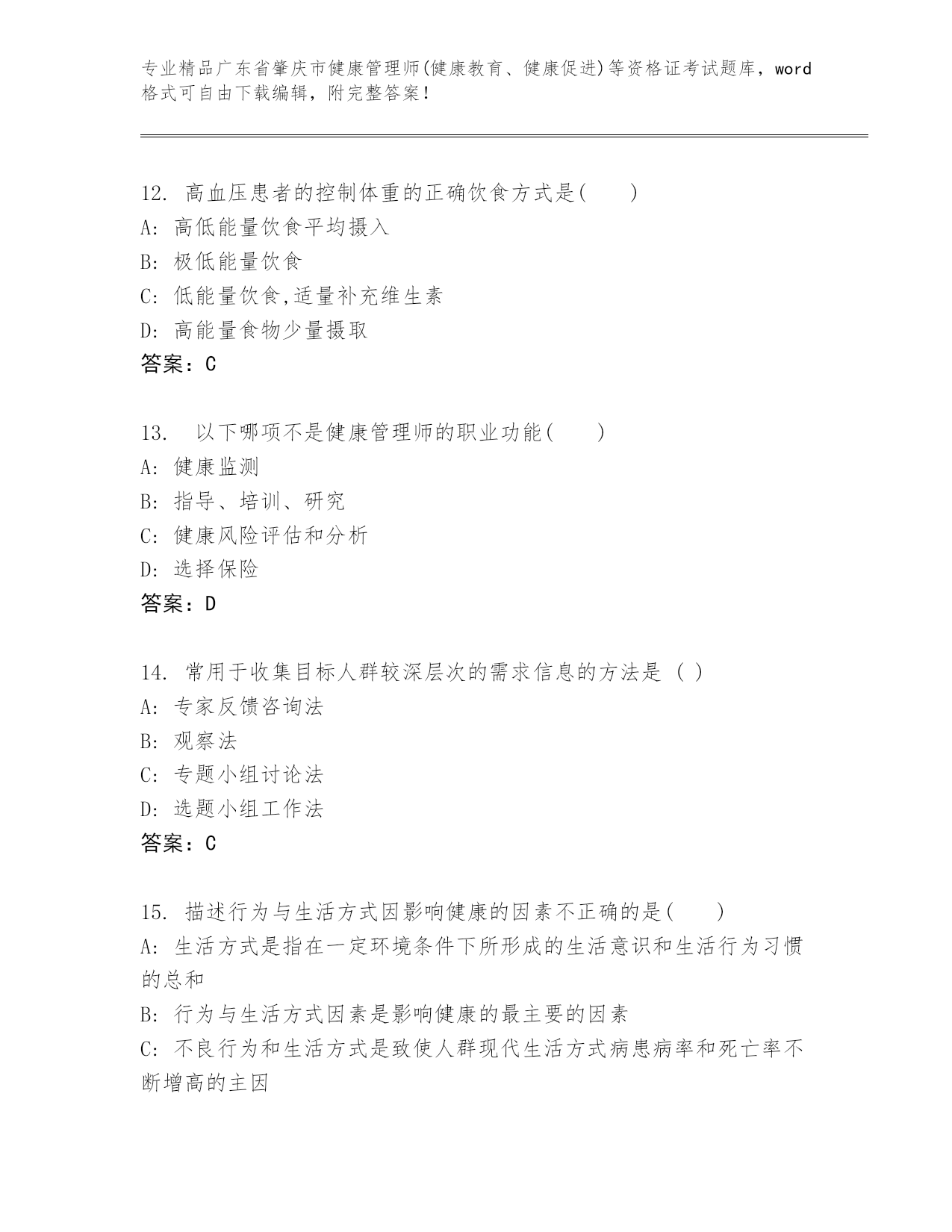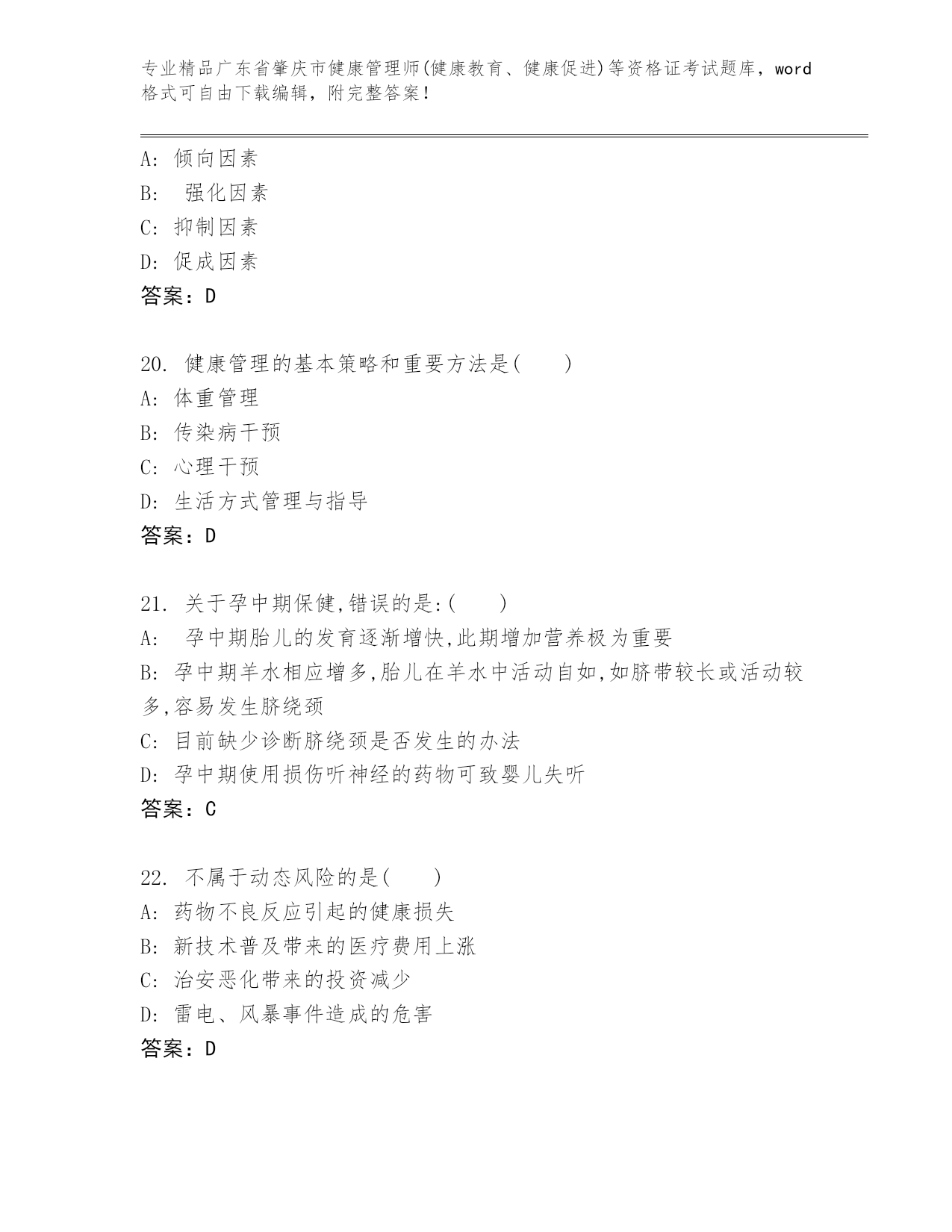 内部培训广东省肇庆市健康管理师(健康教育、健康促进)等资格证考试大全及答案(夺冠)