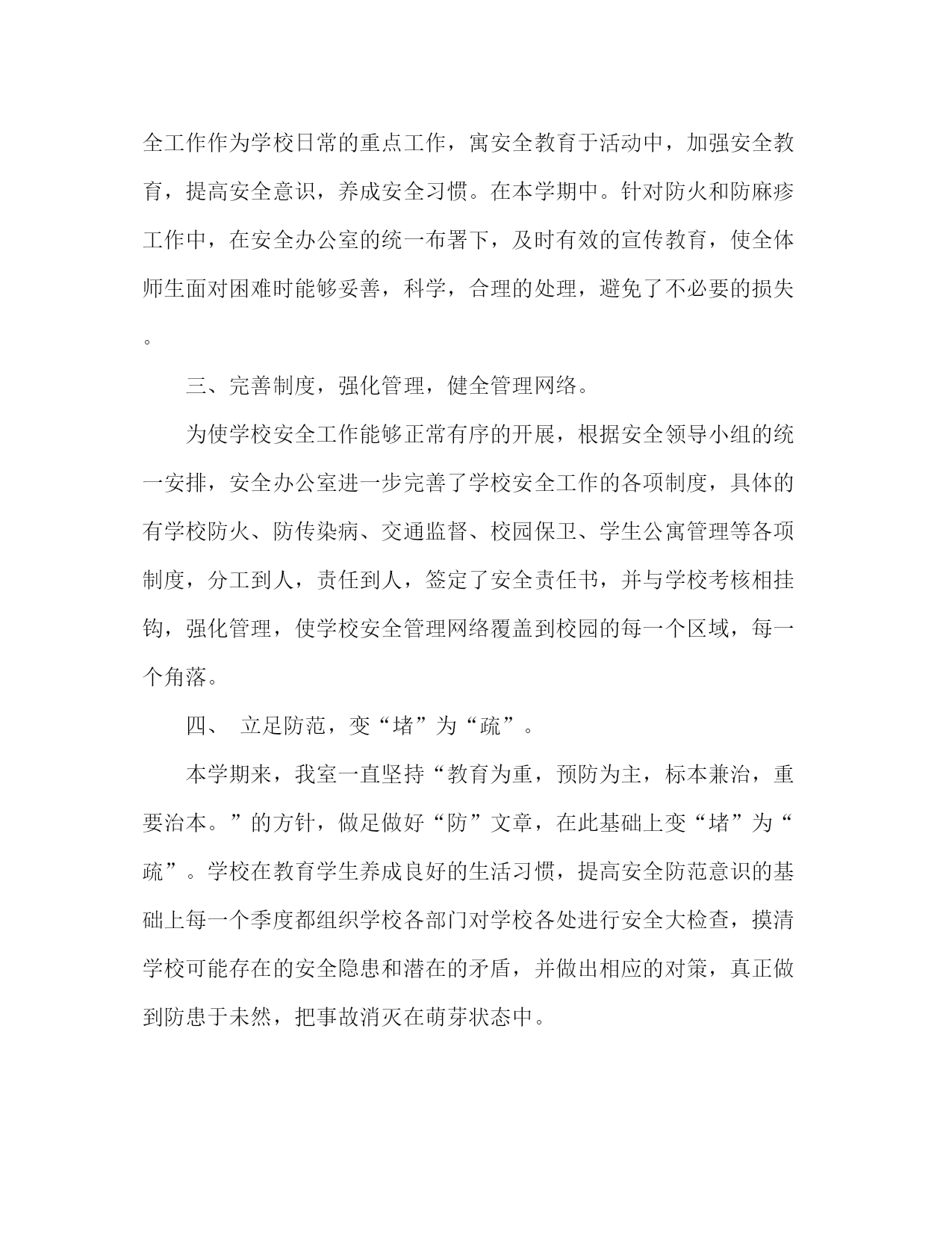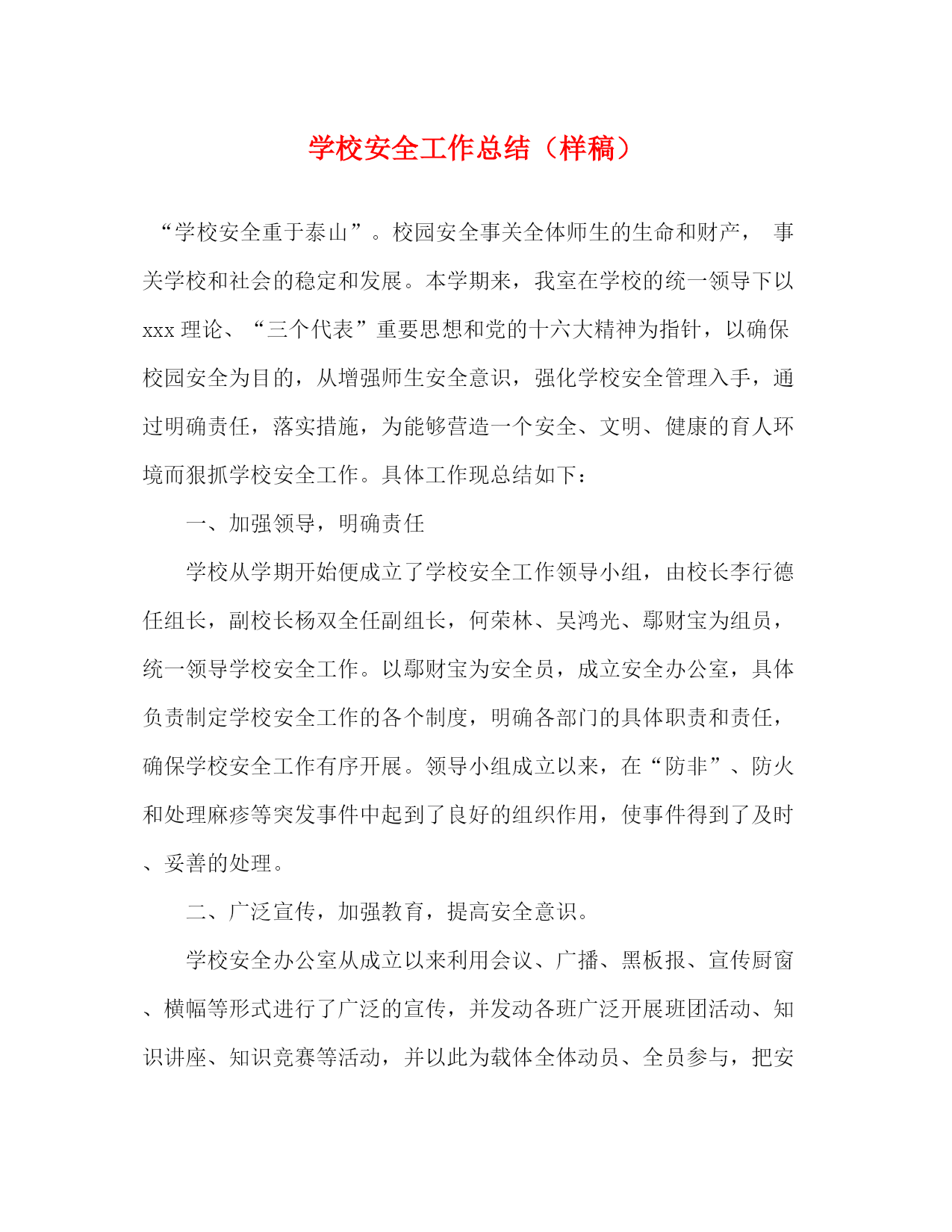 PAGE此资料由网络收集而来,如有侵权请告知上传者立即删除。资料共分享,我们负责传递知识。学校安全工作总结(样稿)“学校安全重于泰山”。校园安全事关全体师生的生命和财产,事关学校和社会的稳定和发展。本学期来,我室在学校的统一领导下以xxx理论、“三个代表”重要思想和党的十六大精神为指针,以确保校园安全为目的,从增强师生安全意识,强化学校安全管理入手,通过明确责任,落实措施,为能够营造一个安全、文明、健康的育人环境而狠抓学校安全工作。具体工作现总结如下:一、加强领导,明确责任学校从学期开始便成立了学校安全工作领导小组,由校长李行德任组长,副校长杨双全任副组长,何荣林、吴鸿光、鄢财宝为组员,统一领导学校安全工作。以鄢财宝为安全员,成立安全办公室,具体负责制定学校安全工作的各个制度,明确各部门的具体职责和责任,确保学校安全工作有序开展。领导小组成立以来,在“防非”、防火和处理麻疹等突发事件中起到了良好的组织作用,使事件得到了及时、妥善的处理。二、广泛宣传,加强教育,提高安全意识。学校安全办公室从成立以来利用会议、广播、黑板报、宣传厨窗、横幅等形式进行了广泛的宣传,并发动各班广泛开展班团活动、知识讲座、知识竞赛等活动,并以此为载体全体动员、全员参与,把安全工作作为学校日常的重点工作,寓安全教育于活动中,加强安全教育,提高安全意识,养成安全习惯。在本学期中。针对防火和防麻疹工作中,在安全办公室的统一布署下,及时有效的宣传教育,使全体师生面对困难时能够妥善,科学,合理的处理,避免了不必要的损失。三、完善制度,强化管理,健全管理网络。为使学校安全工作能够正常有序的开展,根据安全领导小组的统一安排,安全办公室进一步完善了学校安全工作的各项制度,具体的有学校防火、防传染病、交通监督、校园保卫、学生公寓管理等各项制度,分工到人,责任到人,签定了安全责任书,并与学校考核相挂钩,强化管理,使学校安全管理网络覆盖到校园的每一个区域,每一个角落。四、立足防范,变“堵”为“疏”。本学期来,我室一直坚持“教育为重,预防为主,标本兼治,重要治本。”的方针,做足做好“防”文章,在此基础上变“堵”为“疏”。学校在教育学生养成良好的生活习惯,提高安全防范意识的基础上每一个季度都组织学校各部门对学校各处进行安全大检查,摸清学校可能存在的安全隐患和潜在的矛盾,并做出相应的对策,真正做到防患于未然,把事故消灭在萌芽状态中。