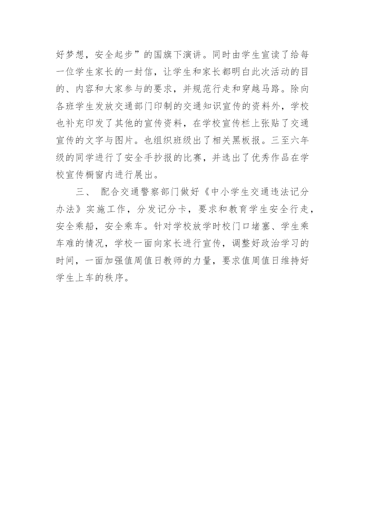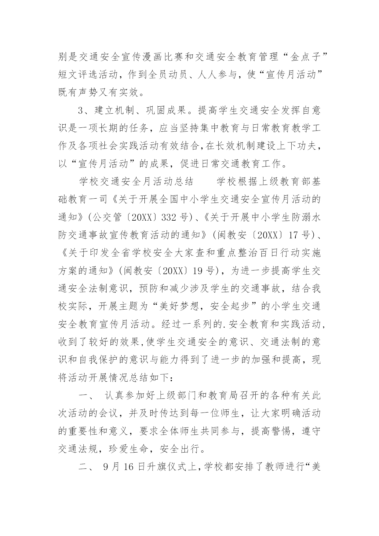 学校交通安全月活动总结学校交通安全月活动总结学校交通安全月活动总结我校坚持“以人为本、安全第一”的原则,以“安全乘车、安全乘船、安全骑车、安全走路”养成教育为主线,以交通安全教育进校园为抓手,根据市六部门《关于印发〈舟山市中小学生交通安全教育宣传月活动方案〉的通知》和《普陀区交通安全宣传月活动方案》,制订了我校交通安全教育宣传月活动方案,集中开展多种形式的学生交通安全教育活动,营造全社会关注学交通安全的良好氛围,切实加强和落实学生了交通安全教育工作,进一步提高学生交通法制意识和自我防护能力。一、学校成立了以校长为组长、副校长为组长、中层干部、班主任为组员的学校安全教育活动领导小组,副校长负责全面实施工作。二、活动要求1、提高认识、统一思想。各校要充分认识加强中小学生交通安全教育工作的极端重要性,把保障中小学生交通安全作为实践“三个代表”重要思想,构建和谐社会,打造“平安校园”的实际行动,切实抓好“宣传月活动”。、2、加强领导、精心组织。学校要把“宣传月活动”作为当前一件大事,摆上重要议事日程,切实加强领导,精心组织实施。要结合本地、本校实际,认真制定活动方案和具体措施,集中时间、集中精力,认真组织开展各项活动,特别是交通安全宣传漫画比赛和交通安全教育管理“金点子”短文评选活动,作到全员动员、人人参与,使“宣传月活动”既有声势又有实效。3、建立机制、巩固成果。提高学生交通安全发挥自意识是一项长期的任务,应当坚持集中教育与日常教育教学工作及各项社会实践活动有效结合,在长效机制建设上下功夫,以“宣传月活动”的成果,促进日常交通教育工作。学校交通安全月活动总结学校根据上级教育部基础教育一司《关于开展全国中小学生交通安全宣传月活动的通知》(公交管〔20XX〕332号)、《关于开展中小学生防溺水防交通事故宣传教育活动的通知》(闽教安〔20XX〕17号)、《关于印发全省学校安全大家查和重点整治百日行动实施方案的通知》(闽教安〔20XX〕19号),为进一步提高学生交通安全法制意识,预防和减少涉及学生的交通事故,结合我校实际,开展主题为“美好梦想,安全起步”的小学生交通安全教育宣传月活动。经过一系列的.安全教育和实践活动,收到了较好的效果,使学生交通安全的意识、交通法制的意识和自我保护的意识与能力得到了进一步的加强和提高,现将活动开展情况总结如下:一、认真参加好上级部门和教育局召开的各种有关此次活动的会议,并及时传达到每一位师生,让大家明确活动的重要性和意义,要求全体师生共同参与,提高警惕,遵守交通法规,珍爱生命,安全出行。二、9月16日升旗仪式上,学校都安排了教师进行“美好梦想,安全起步”的国旗下演讲。同时由学生宣读了给每一位学生家长的一封信,让学生和家长都明白此次活动的目的、内容和大家参与的要求,并规范行走和穿越马路。除向各班学生发放交通部门印制的交通知识宣传的资料外,学校也补充印发了其他的宣传资料,在学校宣传栏上张贴了交通宣传的文字与图片。也组织班级出了相关黑板报。三至六年级的同学进行了安全手抄报的比赛,并选出了优秀作品在学校宣传橱窗内进行展出。三、配合交通警察部门做好《中小学生交通违法记分办法》实施工作,分发记分卡,要求和教育学生安全行走,安全乘船,安全乘车。针对学校放学时校门口堵塞、学生乘车难的情况,学校一面向家长进行宣传,调整好政治学习的时间,一面加强值周值日教师的力量,要求值周值日维持好学生上车的秩序。