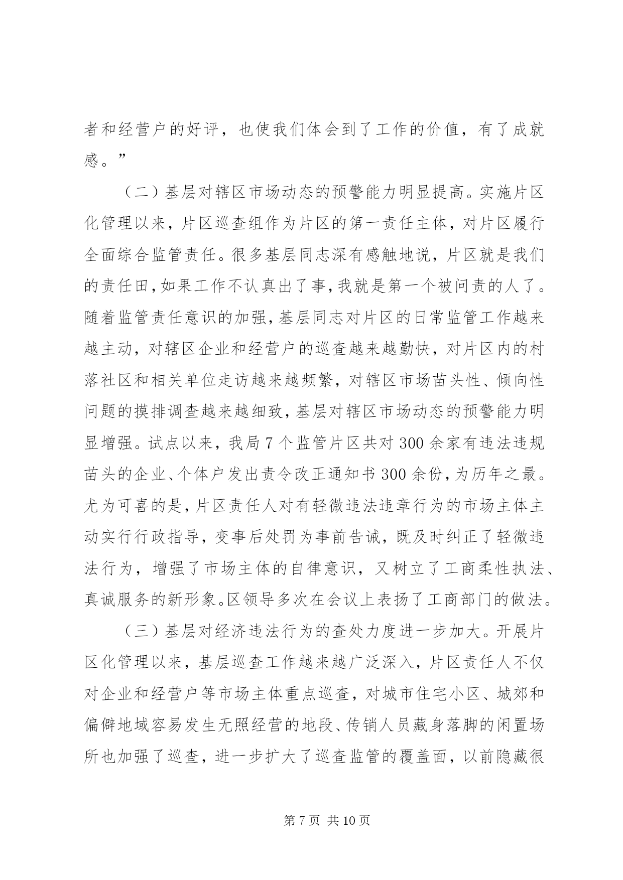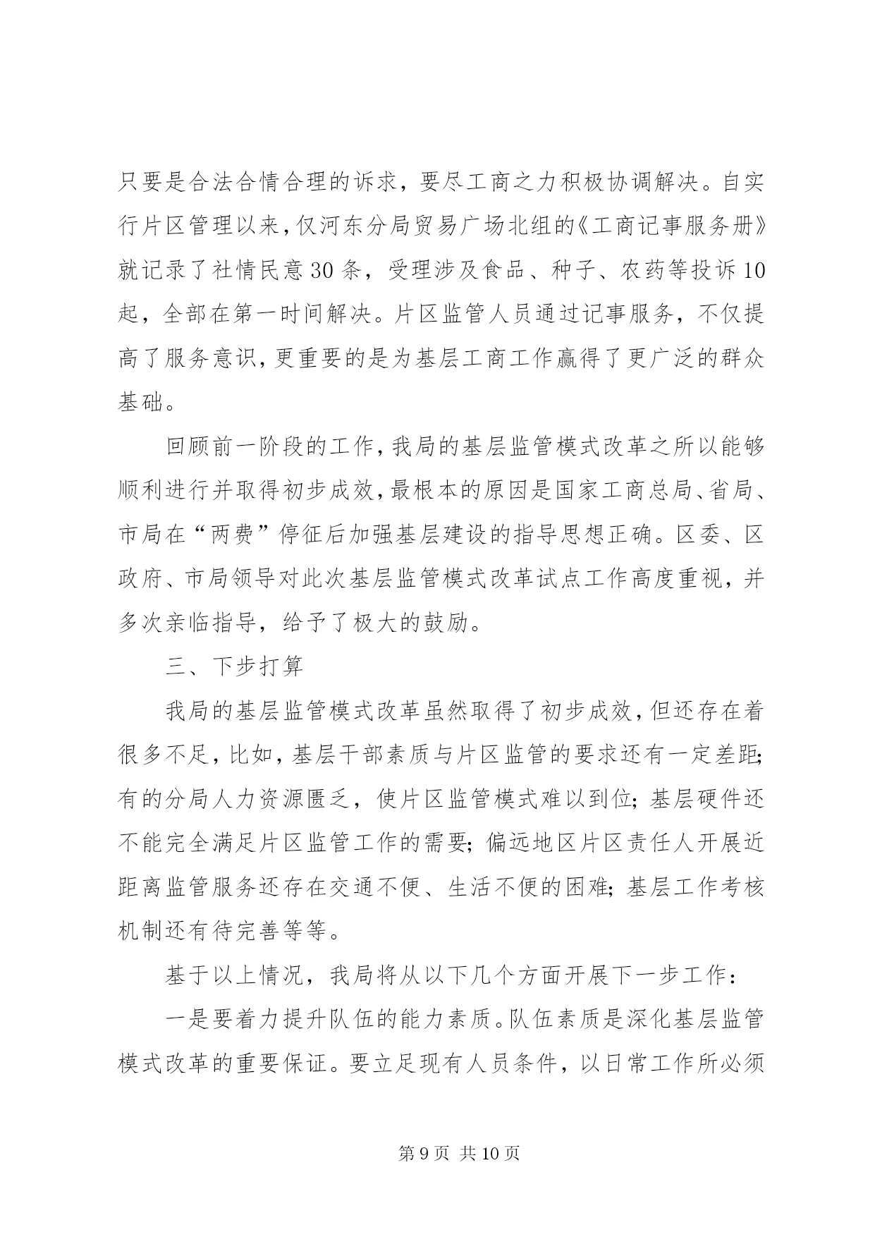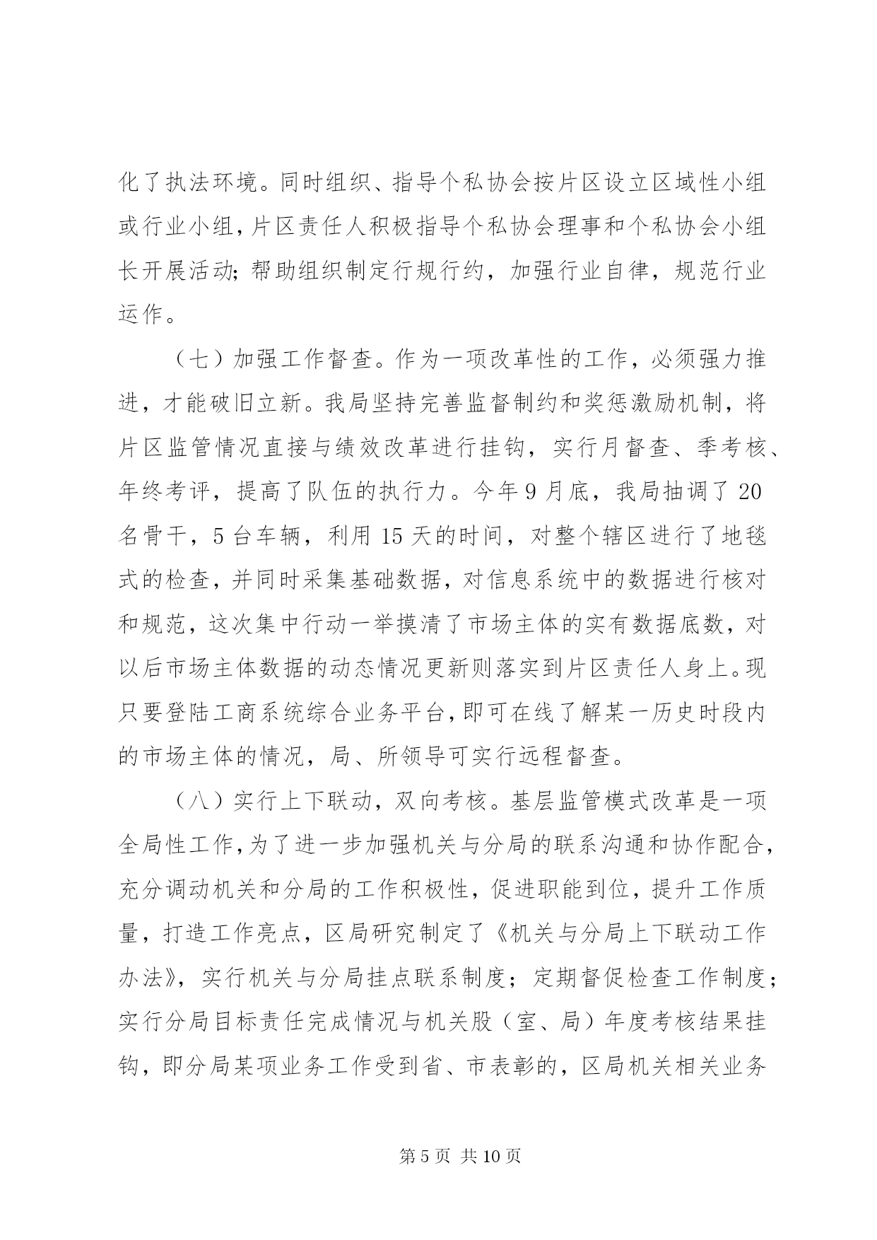 第PAGE\*Arabic\*MERGEFORMAT10页共NUMPAGES\*MERGEFORMAT10页工商局监管模式改革汇报一、基本做法自参观学习后,市局根据我市实际,以“五三四四”思路为指导,确定了以片区为单位的监管模式,化大方块为小格子,变单一监管为综合监管,并决定在区工商局进行试点。我局按照上级要求,围绕基层工作如何转型,发动干部职工进行了深入探讨。局党组结合深入学习实践科学发展观活动,认真分析了队伍年龄老化、思想认识模糊、监管思维落后、监管方式粗放、监管职能不到位、人员素质不高等情况,查找了基层工作在制度、机制、体制等方面存在的突出问题,一致认为,要实现工商履职重心回归,就必须进行基层监管模式改革,这是大势所趋。基层监管模式早转变早主动,晚转变更被动,与其被动改革,不如主动改革。经过反复酝酿,区局在今年八月制定了《市区工商局推行基层分局辖区监管责任制工作方案》,并于九月三十日经区政府批转执行。成立了领导机构和办事机构,市局也专门委派了以刘江波同志为组长的工作组亲临指导,力求精心组织、求真务实、强力推进。(一)规范了基层分局内设机构,建立片区监管责任。我局按照“综合组+监管组”模式对基层分局内部机构进行了统一规范设置,即:将基层分局内设机构分为综合业务和巡查办案二大块,分别设置综合组和监管组。并根据“定人员、定岗位、定目标、定责任、定奖惩”的“五定”要求,将所有基层分局管辖区域合理划分为若干个片区,这些片区无论大小,每一片区都设置一个巡查组,配有2名专职或兼职监管人员。巡查组对监管片区履行全面综合监管服务职责,是最小、也是最前沿的工商监管责任主体。为防止片区责任人可能出现的行政慢作为、不作为、乱作为带来的监管风险,我局还专门下发了《区工商局工作落实不到位责任追究办法》,以增强片区责任人的责任意识、服务意识、廉政意识。(二)基本建立了基层工作所需的管理制度,制定下发了基层监管四大业务流程和制度。为切实规范基层监管各项业务程序和工作行为,首先,制定了市场巡查、消保维权、登记发照、执法办案、食品安全监管五大业务流程和规章制度,形成了《区工商局基层监管模式改革各项业务流程和规章制度范本》,下发基层参照试行,并要求基层将“五大规范”列入学习实践科学发展观全员培训内容和各单位长期培训计划。其次,分局从实际出发,制定了相应岗位职责、考核评估、队伍管理等相关制度,使各项工作向“制度化、规范化”的方向发展。(三)扎实推进了片区监管进乡村、进社区。为使基层全面履行工商职能,我局结合强化“一会两站”建设,构建纵向到底、横向到边的监管网络,大力推进片区监管进乡村、进社区,让工商人员走出机关,深入社区、深入乡村,在第一线为市场主体服务,为群众服务。目前,区工商局现有的两个基层分局河东分局、新圩分局所有片区都按统一的形式,依托“一会两站”,设立了片区工商服务点。这些片区工商服务点不仅是片区监管人员在辖区开展巡查执法的驻点,也是方便群众投诉和约谈办事的服务站,客观上形成了一个近距离监管、零距离服务的工作层级,发挥了很好的作用。(四)实行分类监管。充分利用好工商系统综合业务平台,按属地监管的原则,各工商分局按照“谁登记、谁录入,谁检查、谁录入,谁处理、谁录入”的原则,及时、准确地录入市场主体信息,认真开展企业和个体信用分类工作,发挥经济户口数据作用,使巡查成了有源之水,认真实施分类监管,使我局基层工作人员从无序管理中解脱出来,变突击式监管为长效监管,变被动式监管为主动式监管,变盲目监管为重点监管,变事后监管为事前、事中监管,做到了“管少了”、“管精了”、“管好了”,促进了监管服务的规范,提升了工商形象。(五)加强队伍建设。我局坚定不移地实行素质教育工程。一是始终坚持了党组中心组理论学习制度和早读学习制度;二是开展“防三松提三气强三爱”队伍作风建设活动,切实深化工商事业的主人翁意识;三是开展业务培训和岗位练兵,强化基层基础工作规范。重点提高干部的巡查、办案、电脑操作等水平,要求片区责任人逐步做到“三知”、“十会”,努力成为“三员”式干部。全年共开展10余次培训活动,明确了5项业务工作规程,进一步培养了职工的学习精神,营造了学习氛围,拓宽了知识面,锻炼了心理素质,提高了业务水平与技能。同时,我们综合每个人的年龄、体质、文化程度、业务水平、工作经验、日常表现等因素,进行科学组合,确定人员搭配,做到用人所长,优势互补,取长补短,倡导互帮互学,缓解了人员素质参差不齐,各有所长等困难。(六)借势借力监管,不断推进行业自律。“片区化”不只是纯粹以完成本职工作为最终目的,而是以履职为纲,致力于与行业、社会力量等共同构筑一个区域立体监管机制,将工商工作融入到社会大监管之中,促进工商工作社会化。我局以主要的超市、市场、学校、居委会、村委会等
