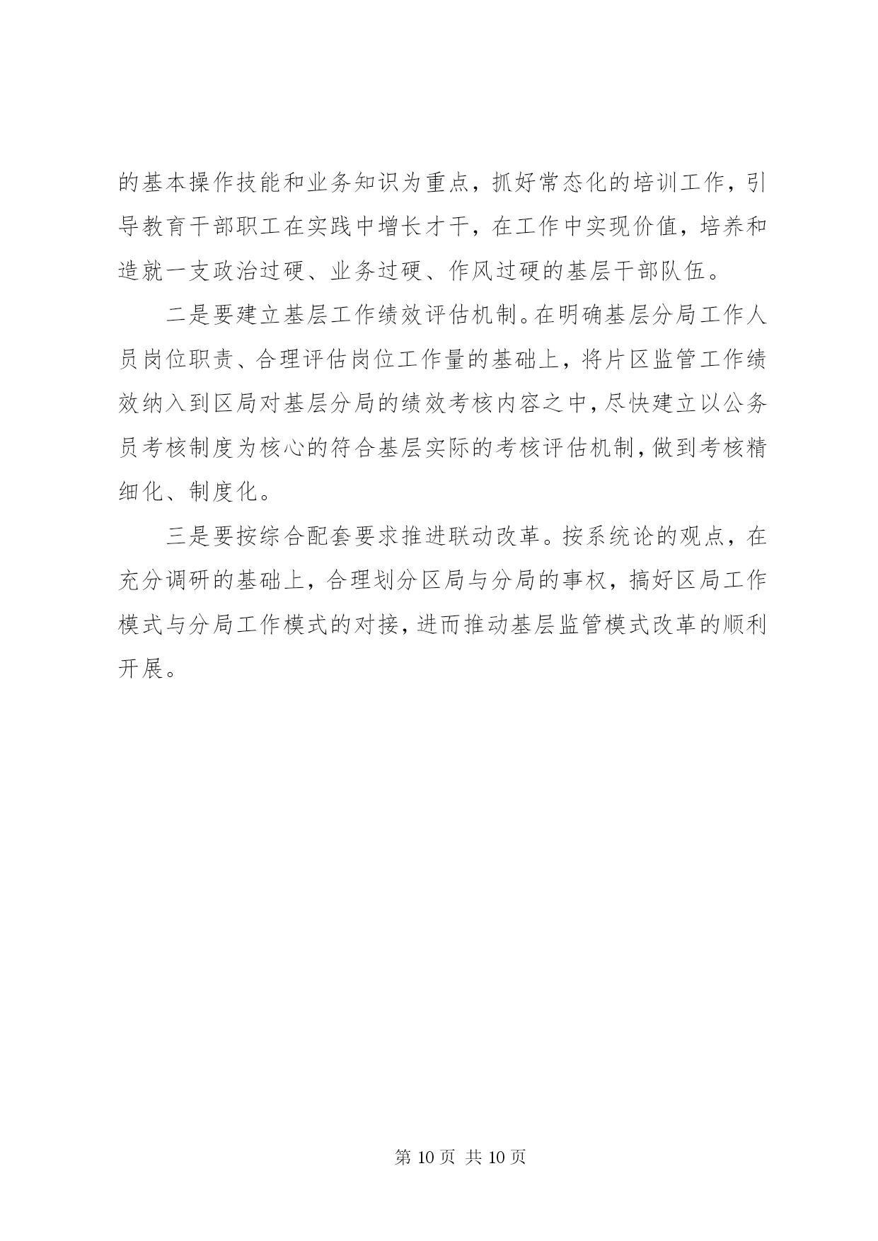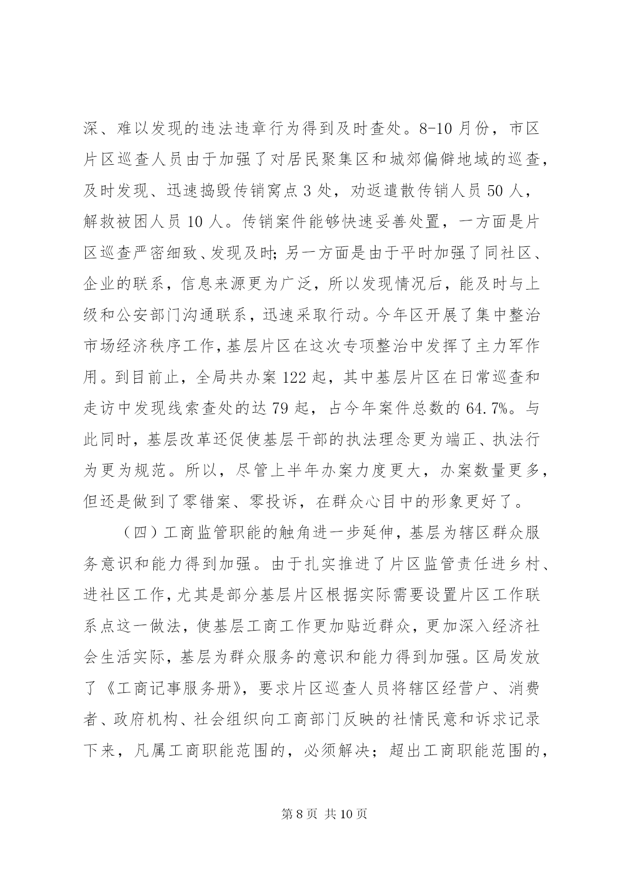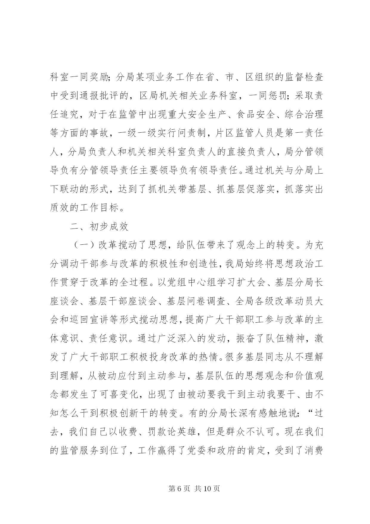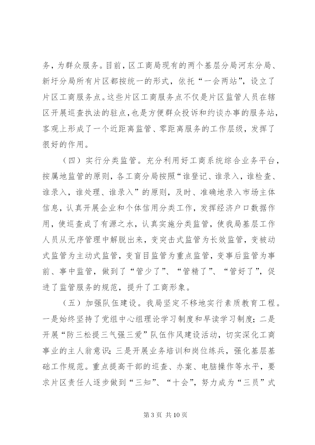 第PAGE\*Arabic\*MERGEFORMAT10页共NUMPAGES\*MERGEFORMAT10页工商局监管模式改革汇报一、基本做法自参观学习后,市局根据我市实际,以“五三四四”思路为指导,确定了以片区为单位的监管模式,化大方块为小格子,变单一监管为综合监管,并决定在区工商局进行试点。我局按照上级要求,围绕基层工作如何转型,发动干部职工进行了深入探讨。局党组结合深入学习实践科学发展观活动,认真分析了队伍年龄老化、思想认识模糊、监管思维落后、监管方式粗放、监管职能不到位、人员素质不高等情况,查找了基层工作在制度、机制、体制等方面存在的突出问题,一致认为,要实现工商履职重心回归,就必须进行基层监管模式改革,这是大势所趋。基层监管模式早转变早主动,晚转变更被动,与其被动改革,不如主动改革。经过反复酝酿,区局在今年八月制定了《市区工商局推行基层分局辖区监管责任制工作方案》,并于九月三十日经区政府批转执行。成立了领导机构和办事机构,市局也专门委派了以刘江波同志为组长的工作组亲临指导,力求精心组织、求真务实、强力推进。(一)规范了基层分局内设机构,建立片区监管责任。我局按照“综合组+监管组”模式对基层分局内部机构进行了统一规范设置,即:将基层分局内设机构分为综合业务和巡查办案二大块,分别设置综合组和监管组。并根据“定人员、定岗位、定目标、定责任、定奖惩”的“五定”要求,将所有基层分局管辖区域合理划分为若干个片区,这些片区无论大小,每一片区都设置一个巡查组,配有2名专职或兼职监管人员。巡查组对监管片区履行全面综合监管服务职责,是最小、也是最前沿的工商监管责任主体。为防止片区责任人可能出现的行政慢作为、不作为、乱作为带来的监管风险,我局还专门下发了《区工商局工作落实不到位责任追究办法》,以增强片区责任人的责任意识、服务意识、廉政意识。(二)基本建立了基层工作所需的管理制度,制定下发了基层监管四大业务流程和制度。为切实规范基层监管各项业务程序和工作行为,首先,制定了市场巡查、消保维权、登记发照、执法办案、食品安全监管五大业务流程和规章制度,形成了《区工商局基层监管模式改革各项业务流程和规章制度范本》,下发基层参照试行,并要求基层将“五大规范”列入学习实践科学发展观全员培训内容和各单位长期培训计划。其次,分局从实际出发,制定了相应岗位职责、考核评估、队伍管理等相关制度,使各项工作向“制度化、规范化”的方向发展。(三)扎实推进了片区监管进乡村、进社区。为使基层全面履行工商职能,我局结合强化“一会两站”建设,构建纵向到底、横向到边的监管网络,大力推进片区监管进乡村、进社区,让工商人员走出机关,深入社区、深入乡村,在第一线为市场主体服务,为群众服务。目前,区工商局现有的两个基层分局河东分局、新圩分局所有片区都按统一的形式,依托“一会两站”,设立了片区工商服务点。这些片区工商服务点不仅是片区监管人员在辖区开展巡查执法的驻点,也是方便群众投诉和约谈办事的服务站,客观上形成了一个近距离监管、零距离服务的工作层级,发挥了很好的作用。(四)实行分类监管。充分利用好工商系统综合业务平台,按属地监管的原则,各工商分局按照“谁登记、谁录入,谁检查、谁录入,谁处理、谁录入”的原则,及时、准确地录入市场主体信息,认真开展企业和个体信用分类工作,发挥经济户口数据作用,使巡查成了有源之水,认真实施分类监管,使我局基层工作人员从无序管理中解脱出来,变突击式监管为长效监管,变被动式监管为主动式监管,变盲目监管为重点监管,变事后监管为事前、事中监管,做到了“管少了”、“管精了”、“管好了”,促进了监管服务的规范,提升了工商形象。(五)加强队伍建设。我局坚定不移地实行素质教育工程。一是始终坚持了党组中心组理论学习制度和早读学习制度;二是开展“防三松提三气强三爱”队伍作风建设活动,切实深化工商事业的主人翁意识;三是开展业务培训和岗位练兵,强化基层基础工作规范。重点提高干部的巡查、办案、电脑操作等水平,要求片区责任人逐步做到“三知”、“十会”,努力成为“三员”式干部。全年共开展10余次培训活动,明确了5项业务工作规程,进一步培养了职工的学习精神,营造了学习氛围,拓宽了知识面,锻炼了心理素质,提高了业务水平与技能。同时,我们综合每个人的年龄、体质、文化程度、业务水平、工作经验、日常表现等因素,进行科学组合,确定人员搭配,做到用人所长,优势互补,取长补短,倡导互帮互学,缓解了人员素质参差不齐,各有所长等困难。(六)借势借力监管,不断推进行业自律。“片区化”不只是纯粹以完成本职工作为最终目的,而是以履职为纲,致力于与行业、社会力量等共同构筑一个区域立体监管机制,将工商工作融入到社会大监管之中,促进工商工作社会化。我局以主要的超市、市场、学校、居委会、村委会等