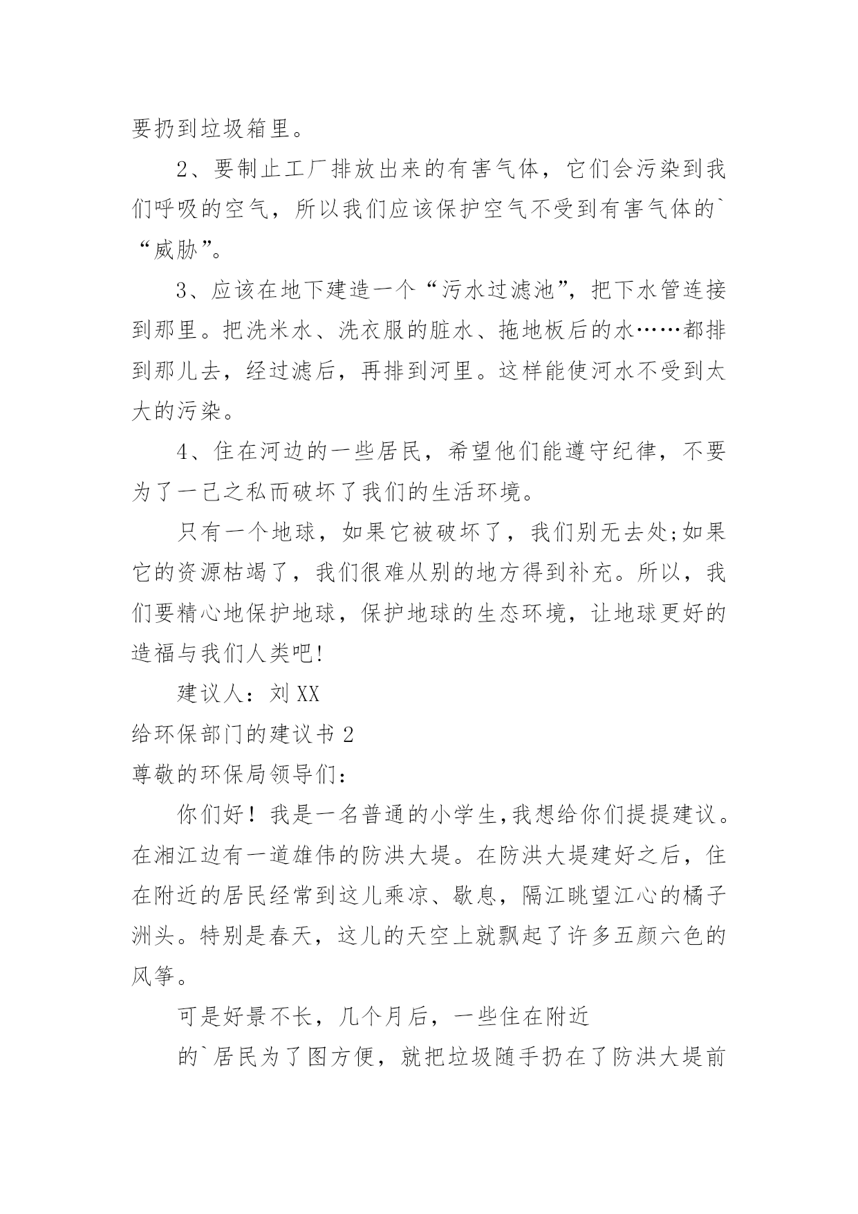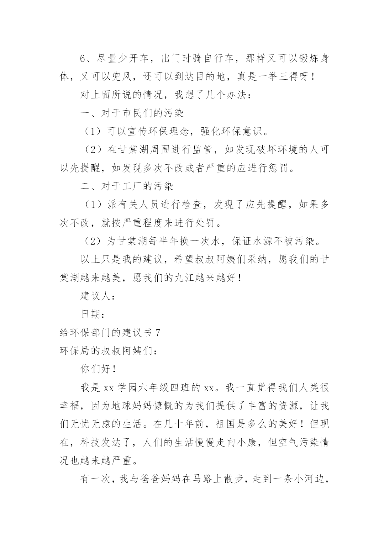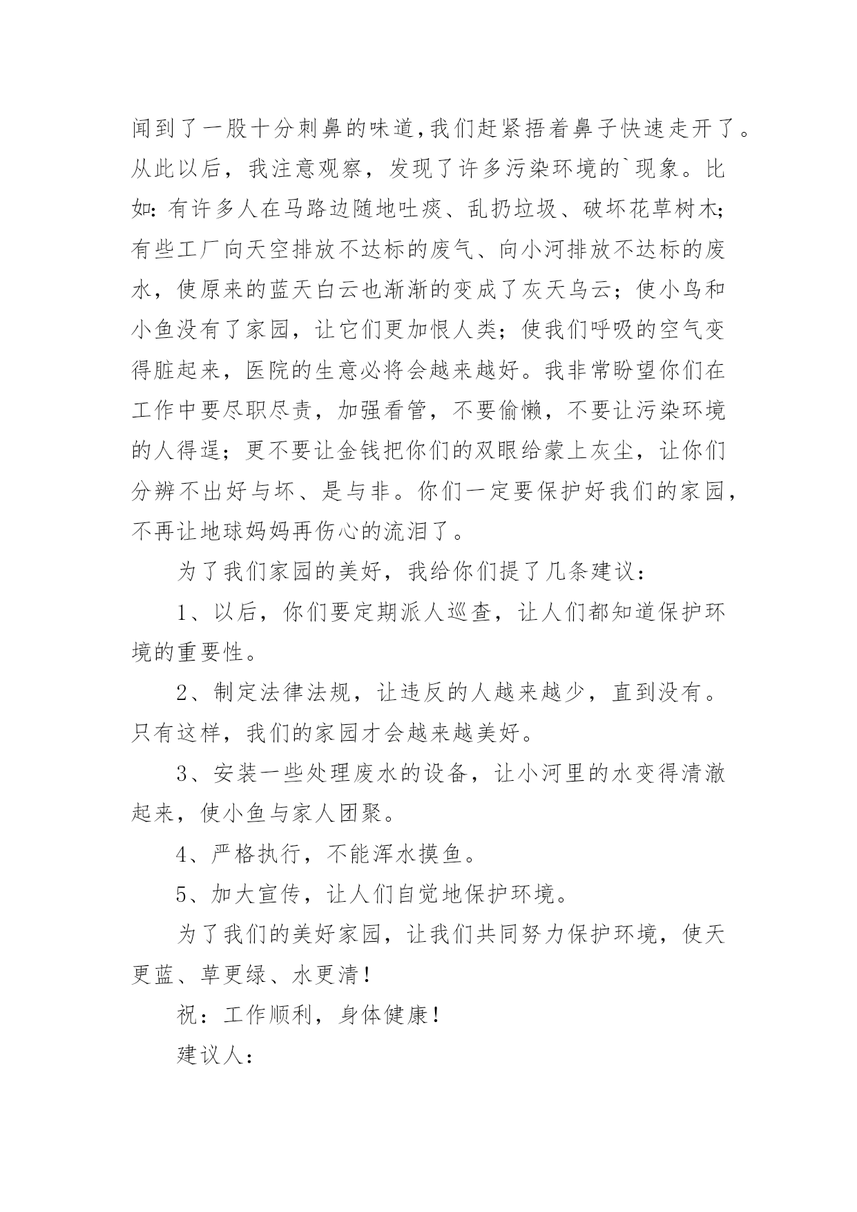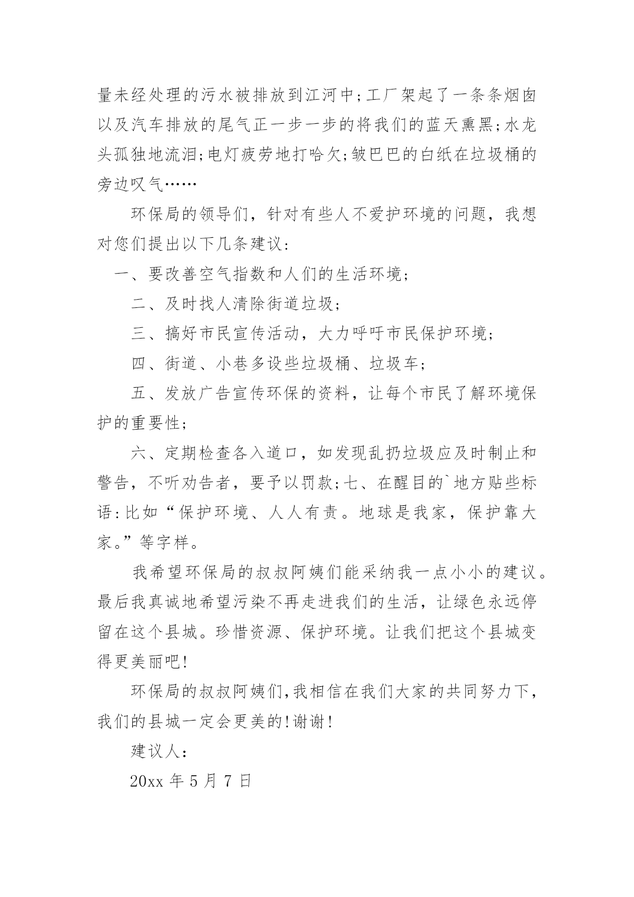 给环保部门的建议书给环保部门的建议书在充满活力,日益开放的今天,建议书的使用频率越来越高,在写作上,建议书有一定的书写规范。建议书的注意事项有许多,你确定会写吗?下面是小编整理的给环保部门的建议书,仅供参考,欢迎大家阅读。给环保部门的建议书1尊敬的环保局局长:您好!我是顺昌县实验小学六年(二)班的学生。对于我县目前的环境,我有一些意见。富屯溪,曾经是一条清澈的小河。原来,有许多人去那儿的下游游泳。可是,因为工厂排放出许多污水;住在河边的居民为了方便,把垃圾都扔进了河里,在河边,经常会看到一些鸡、鸭的内脏;现在,上游都已经被污染了,还有谁敢去下游游泳呢?记得有一次,我和爸爸、妈妈一起去家乡过节。在路上,我们看到有人在山上乱砍滥伐树木,差点还砸到我们!这样做,会导致水土流失,造成一些泥石流、洪灾等灾害。这样一来,最后受到危害的不还是我们人类吗?所以,我觉得应该遵守以下几点:1、不要乱吐口痰,不要随地乱丢垃圾,看见路上垃圾要扔到垃圾箱里。2、要制止工厂排放出来的有害气体,它们会污染到我们呼吸的空气,所以我们应该保护空气不受到有害气体的`“威胁”。3、应该在地下建造一个“污水过滤池”,把下水管连接到那里。把洗米水、洗衣服的脏水、拖地板后的水……都排到那儿去,经过滤后,再排到河里。这样能使河水不受到太大的污染。4、住在河边的一些居民,希望他们能遵守纪律,不要为了一己之私而破坏了我们的生活环境。只有一个地球,如果它被破坏了,我们别无去处;如果它的资源枯竭了,我们很难从别的地方得到补充。所以,我们要精心地保护地球,保护地球的生态环境,让地球更好的造福与我们人类吧!建议人:刘XX给环保部门的建议书2尊敬的环保局领导们:你们好!我是一名普通的小学生,我想给你们提提建议。在湘江边有一道雄伟的防洪大堤。在防洪大堤建好之后,住在附近的居民经常到这儿乘凉、歇息,隔江眺望江心的橘子洲头。特别是春天,这儿的天空上就飘起了许多五颜六色的风筝。可是好景不长,几个月后,一些住在附近的`居民为了图方便,就把垃圾随手扔在了防洪大堤前边的空坪上。垃圾积少成多,最后连成一片了。除了生活垃圾,还有许多瓦砾、砖块等建筑垃圾。上那儿乘凉的人也越来越少,因为这些垃圾都会发出一股股难闻的恶臭。有一次,我到沿江大道去放风筝,可是竟然找不到一条干净的路走!最后只好踩着垃圾、瓦砾过去了。最重要的是垃圾会滋生苍蝇、蚊子,而苍蝇、蚊子都是传播疾病的昆虫。还有一些人把垃圾扔在江里,这样还会污染我们的水资源。所以,我想给环保局提几个建议:1。及时清理防洪大堤以及江中的垃圾。2。向市民们宣传环保的重要性,提高市民们对环保的认识。3。定期检查各个街道,如发现有人乱扔垃圾应及时制止和警告。屡劝不听者,要予以罚款。我期盼环保局的领导们能够采纳我这个小小的建议。谢谢给环保部门的建议书3敬爱的环保局叔叔阿姨们:您们好!我是XX县第一小学六年级的学生,我叫做郭。今天我向你们写一份建议书,希望你们能采纳我的意见。让我们把这个县城变得更美丽!地球是我们的的母亲,是生命的摇篮。千百年来,她哺育了世间万物,向她的儿女们慷慨地提供各种资源,可是,她的儿女们却伤害它,让她饱受痛苦:到处都是白色垃圾;大量未经处理的污水被排放到江河中;工厂架起了一条条烟囱以及汽车排放的尾气正一步一步的将我们的蓝天熏黑;水龙头孤独地流泪;电灯疲劳地打哈欠;皱巴巴的白纸在垃圾桶的旁边叹气……环保局的领导们,针对有些人不爱护环境的问题,我想对您们提出以下几条建议:一、要改善空气指数和人们的生活环境;二、及时找人清除街道垃圾;三、搞好市民宣传活动,大力呼吁市民保护环境;四、街道、小巷多设些垃圾桶、垃圾车;五、发放广告宣传环保的资料,让每个市民了解环境保护的重要性;六、定期检查各入道口,如发现乱扔垃圾应及时制止和警告,不听劝告者,要予以罚款;七、在醒目的`地方贴些标语:比如“保护环境、人人有责。地球是我家,保护靠大家。”等字样。我希望环保局的叔叔阿姨们能采纳我一点小小的建议。最后我真诚地希望污染不再走进我们的生活,让绿色永远停留在这个县城。珍惜资源、保护环境。让我们把这个县城变得更美丽吧!环保局的叔叔阿姨们,我相信在我们大家的共同努力下,我们的县城一定会更美的!谢谢!建议人:20xx年5月7日给环保部门的建议书4尊敬的环保局的叔叔阿姨们:你们好!我是一名小学六年级的学生。我们小区附近的环境非常好,清新的空气扑鼻而来,花儿竞相开放,时不时能听见鸟儿的歌声,清洁工阿姨也很勤劳,人们的环保意识也不错。我要感谢你们,这都是你们的工作做得好。可是,这只是一小部分。一次,我和爸爸骑单车去爸爸的公司,一路上风沙很大,一辆辆汽车飞驰而过,排放出难闻的尾气。我们被呛得连连咳嗽,眼睛也总是进沙。空气质量实在是太差了。另外,爸爸的`公司附近有一个垃圾处理厂。它采用焚