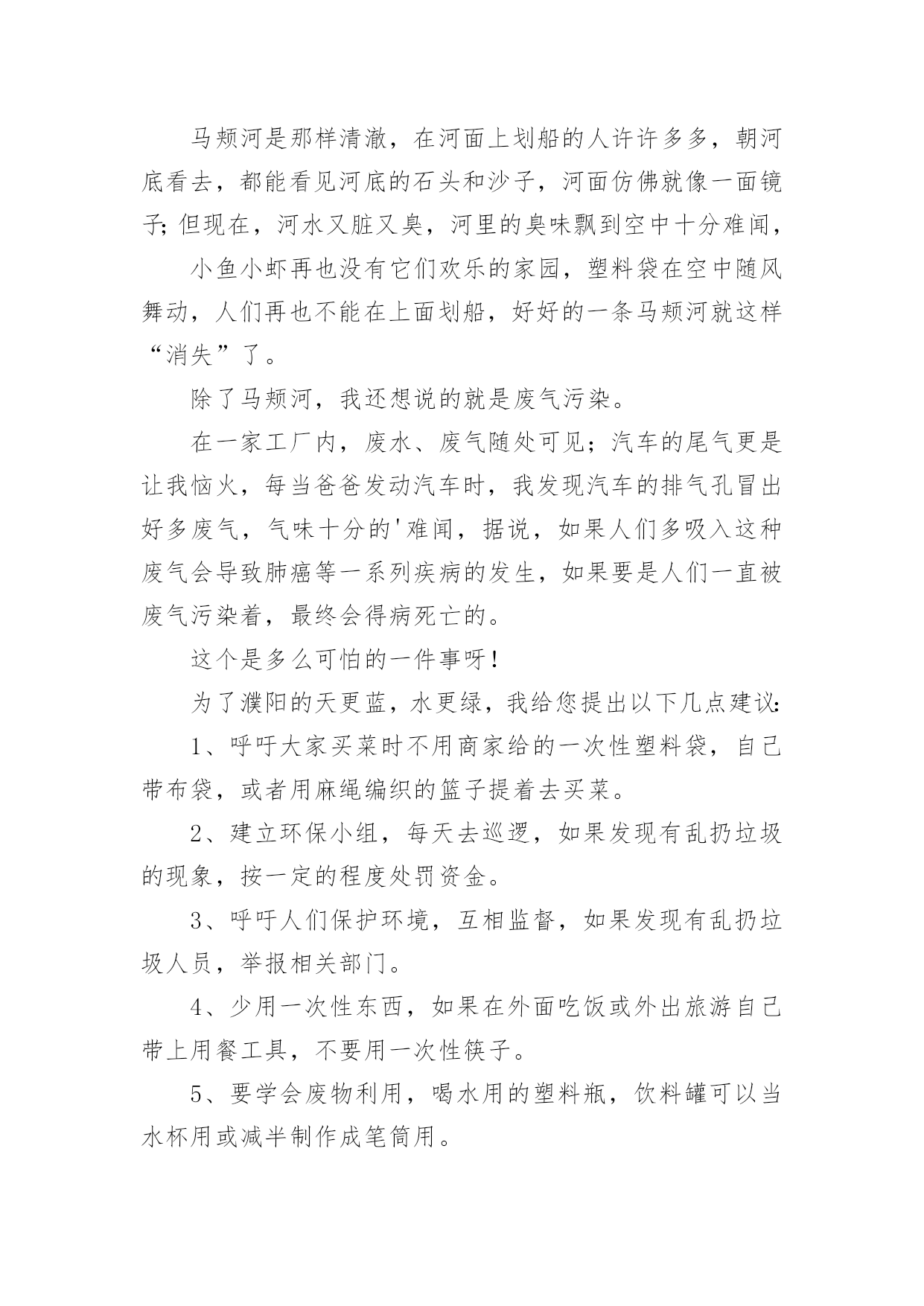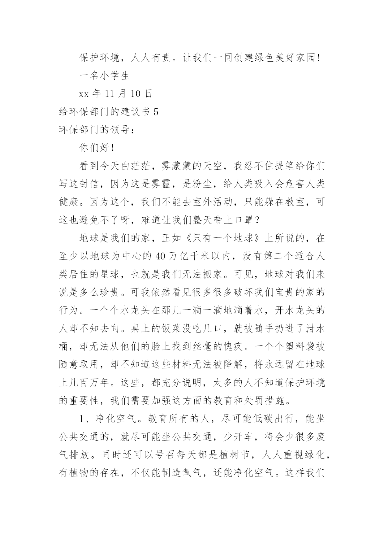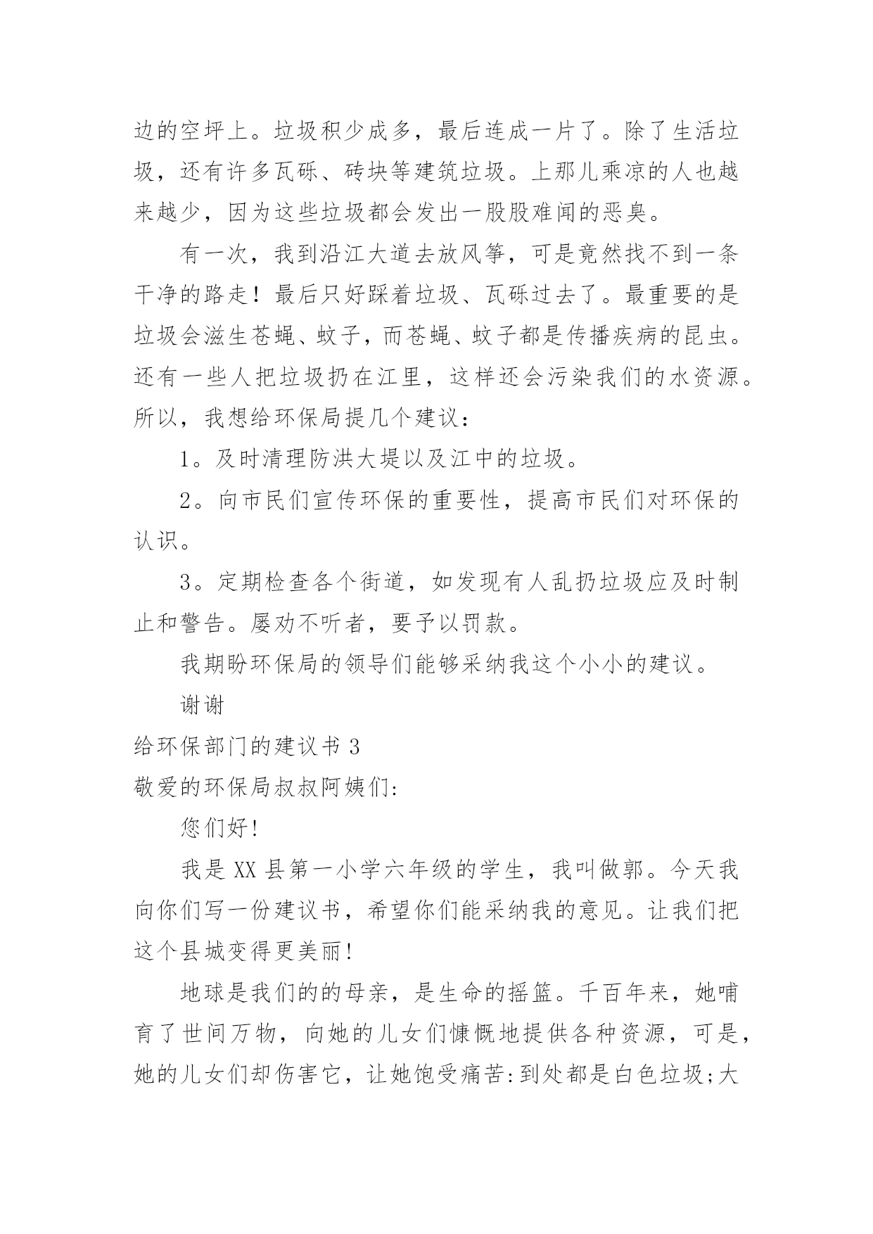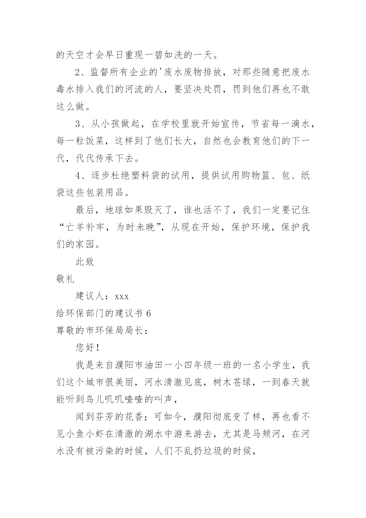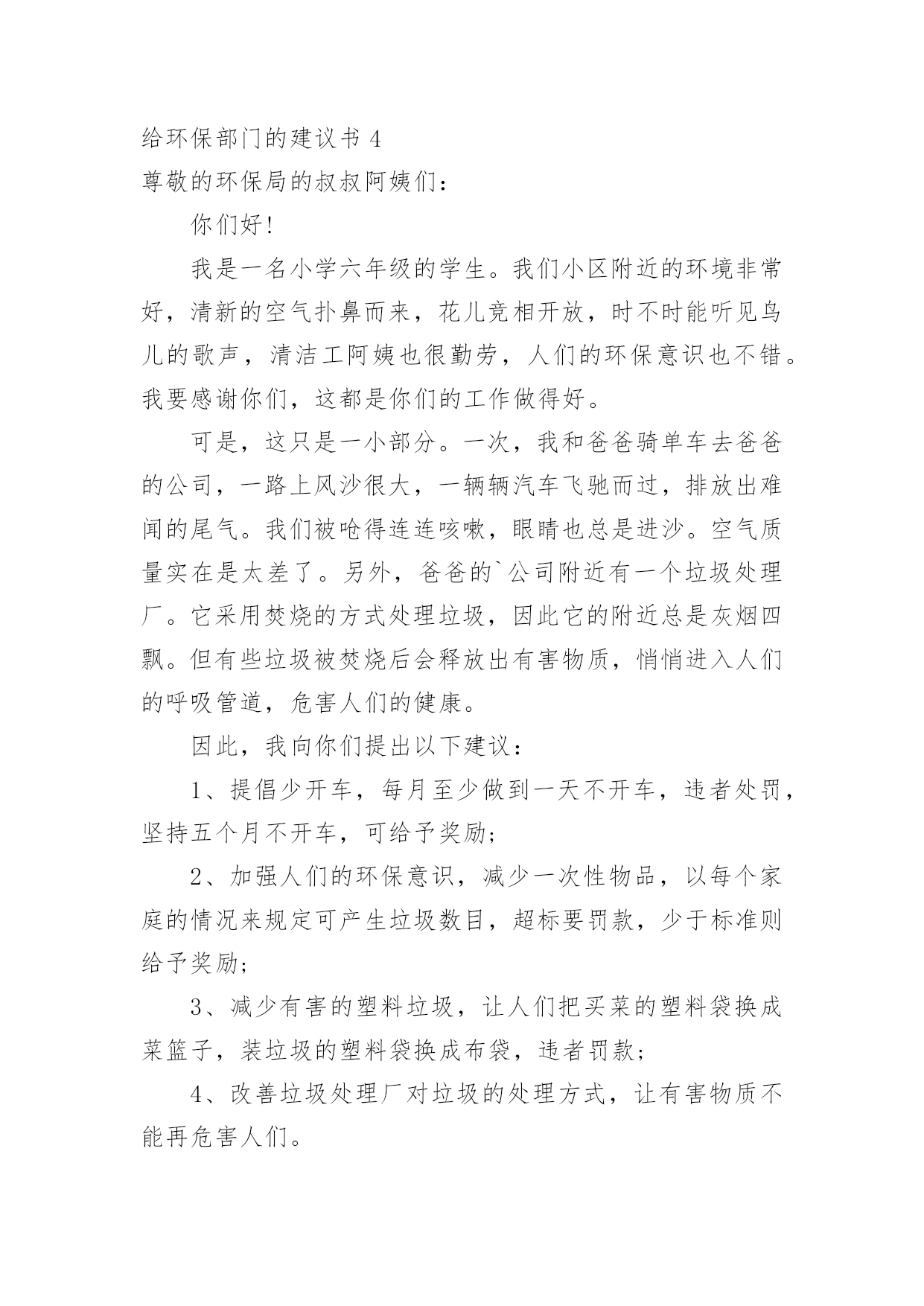 给环保部门的建议书给环保部门的建议书在充满活力,日益开放的今天,建议书的使用频率越来越高,在写作上,建议书有一定的书写规范。建议书的注意事项有许多,你确定会写吗?下面是小编整理的给环保部门的建议书,仅供参考,欢迎大家阅读。给环保部门的建议书1尊敬的环保局局长:您好!我是顺昌县实验小学六年(二)班的学生。对于我县目前的环境,我有一些意见。富屯溪,曾经是一条清澈的小河。原来,有许多人去那儿的下游游泳。可是,因为工厂排放出许多污水;住在河边的居民为了方便,把垃圾都扔进了河里,在河边,经常会看到一些鸡、鸭的内脏;现在,上游都已经被污染了,还有谁敢去下游游泳呢?记得有一次,我和爸爸、妈妈一起去家乡过节。在路上,我们看到有人在山上乱砍滥伐树木,差点还砸到我们!这样做,会导致水土流失,造成一些泥石流、洪灾等灾害。这样一来,最后受到危害的不还是我们人类吗?所以,我觉得应该遵守以下几点:1、不要乱吐口痰,不要随地乱丢垃圾,看见路上垃圾要扔到垃圾箱里。2、要制止工厂排放出来的有害气体,它们会污染到我们呼吸的空气,所以我们应该保护空气不受到有害气体的`“威胁”。3、应该在地下建造一个“污水过滤池”,把下水管连接到那里。把洗米水、洗衣服的脏水、拖地板后的水……都排到那儿去,经过滤后,再排到河里。这样能使河水不受到太大的污染。4、住在河边的一些居民,希望他们能遵守纪律,不要为了一己之私而破坏了我们的生活环境。只有一个地球,如果它被破坏了,我们别无去处;如果它的资源枯竭了,我们很难从别的地方得到补充。所以,我们要精心地保护地球,保护地球的生态环境,让地球更好的造福与我们人类吧!建议人:刘XX给环保部门的建议书2尊敬的环保局领导们:你们好!我是一名普通的小学生,我想给你们提提建议。在湘江边有一道雄伟的防洪大堤。在防洪大堤建好之后,住在附近的居民经常到这儿乘凉、歇息,隔江眺望江心的橘子洲头。特别是春天,这儿的天空上就飘起了许多五颜六色的风筝。可是好景不长,几个月后,一些住在附近的`居民为了图方便,就把垃圾随手扔在了防洪大堤前边的空坪上。垃圾积少成多,最后连成一片了。除了生活垃圾,还有许多瓦砾、砖块等建筑垃圾。上那儿乘凉的人也越来越少,因为这些垃圾都会发出一股股难闻的恶臭。有一次,我到沿江大道去放风筝,可是竟然找不到一条干净的路走!最后只好踩着垃圾、瓦砾过去了。最重要的是垃圾会滋生苍蝇、蚊子,而苍蝇、蚊子都是传播疾病的昆虫。还有一些人把垃圾扔在江里,这样还会污染我们的水资源。所以,我想给环保局提几个建议:1。及时清理防洪大堤以及江中的垃圾。2。向市民们宣传环保的重要性,提高市民们对环保的认识。3。定期检查各个街道,如发现有人乱扔垃圾应及时制止和警告。屡劝不听者,要予以罚款。我期盼环保局的领导们能够采纳我这个小小的建议。谢谢给环保部门的建议书3敬爱的环保局叔叔阿姨们:您们好!我是XX县第一小学六年级的学生,我叫做郭。今天我向你们写一份建议书,希望你们能采纳我的意见。让我们把这个县城变得更美丽!地球是我们的的母亲,是生命的摇篮。千百年来,她哺育了世间万物,向她的儿女们慷慨地提供各种资源,可是,她的儿女们却伤害它,让她饱受痛苦:到处都是白色垃圾;大量未经处理的污水被排放到江河中;工厂架起了一条条烟囱以及汽车排放的尾气正一步一步的将我们的蓝天熏黑;水龙头孤独地流泪;电灯疲劳地打哈欠;皱巴巴的白纸在垃圾桶的旁边叹气……环保局的领导们,针对有些人不爱护环境的问题,我想对您们提出以下几条建议:一、要改善空气指数和人们的生活环境;二、及时找人清除街道垃圾;三、搞好市民宣传活动,大力呼吁市民保护环境;四、街道、小巷多设些垃圾桶、垃圾车;五、发放广告宣传环保的资料,让每个市民了解环境保护的重要性;六、定期检查各入道口,如发现乱扔垃圾应及时制止和警告,不听劝告者,要予以罚款;七、在醒目的`地方贴些标语:比如“保护环境、人人有责。地球是我家,保护靠大家。”等字样。我希望环保局的叔叔阿姨们能采纳我一点小小的建议。最后我真诚地希望污染不再走进我们的生活,让绿色永远停留在这个县城。珍惜资源、保护环境。让我们把这个县城变得更美丽吧!环保局的叔叔阿姨们,我相信在我们大家的共同努力下,我们的县城一定会更美的!谢谢!建议人:20xx年5月7日给环保部门的建议书4尊敬的环保局的叔叔阿姨们:你们好!我是一名小学六年级的学生。我们小区附近的环境非常好,清新的空气扑鼻而来,花儿竞相开放,时不时能听见鸟儿的歌声,清洁工阿姨也很勤劳,人们的环保意识也不错。我要感谢你们,这都是你们的工作做得好。可是,这只是一小部分。一次,我和爸爸骑单车去爸爸的公司,一路上风沙很大,一辆辆汽车飞驰而过,排放出难闻的尾气。我们被呛得连连咳嗽,眼睛也总是进沙。空气质量实在是太差了。另外,爸爸的`公司附近有一个垃圾处理厂。它采用焚
