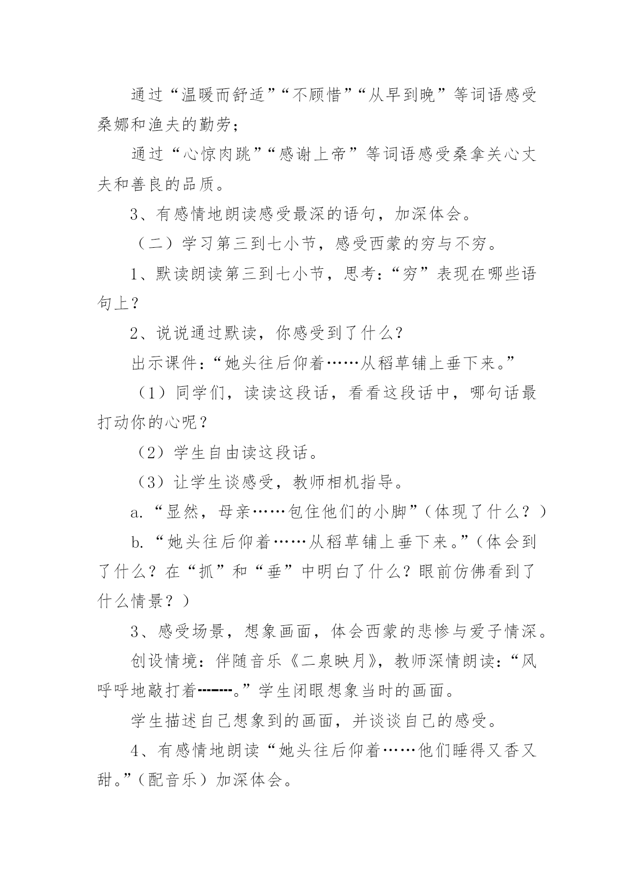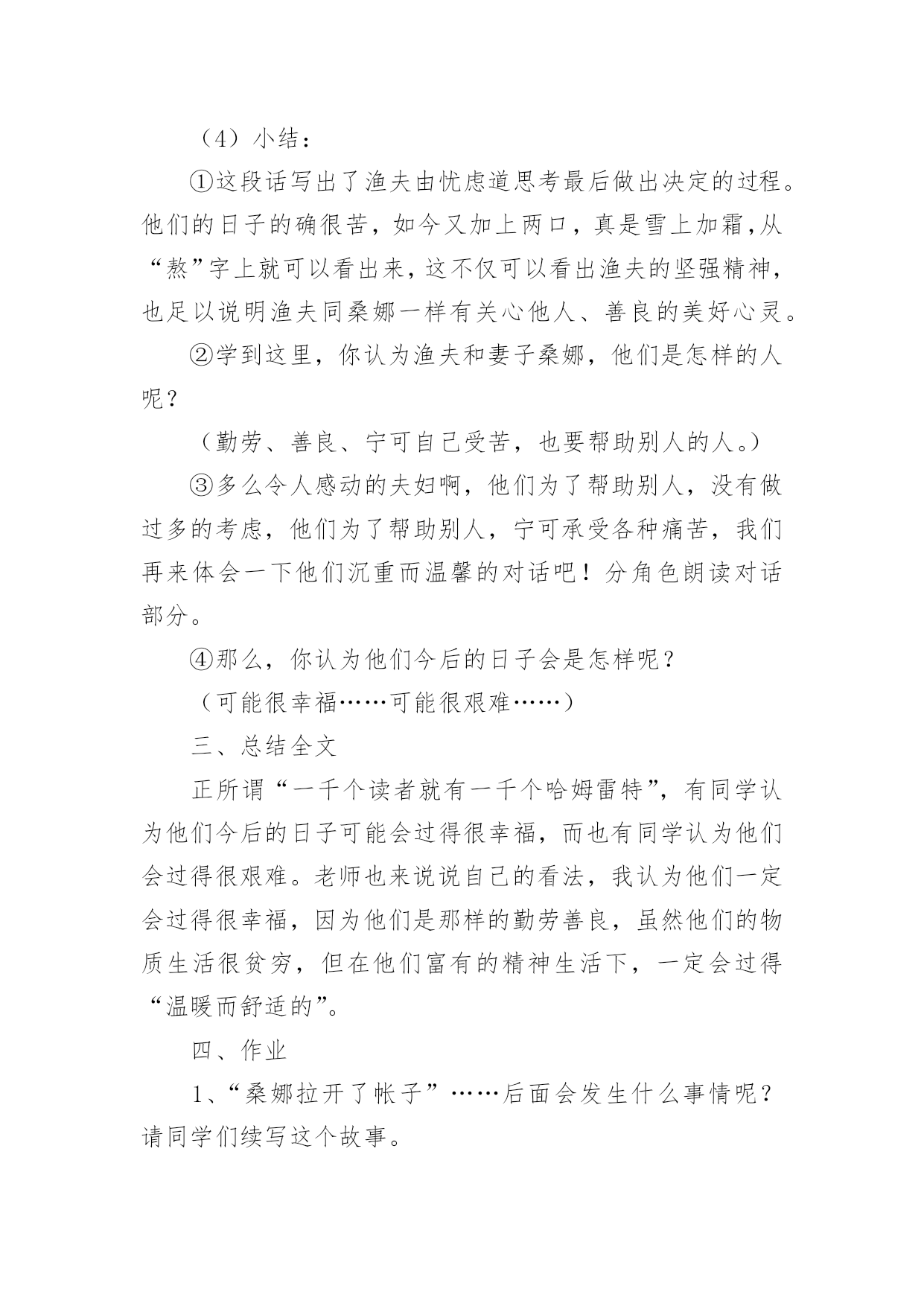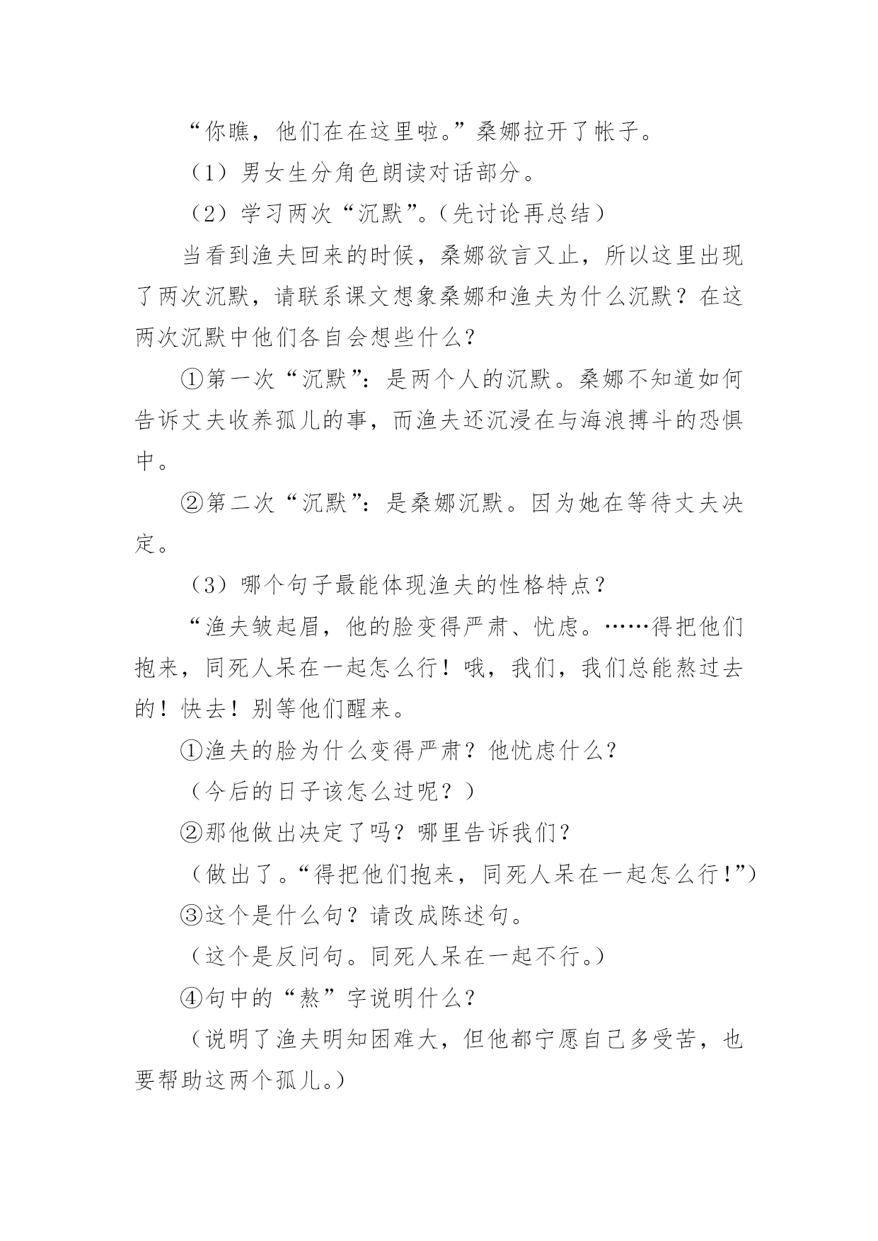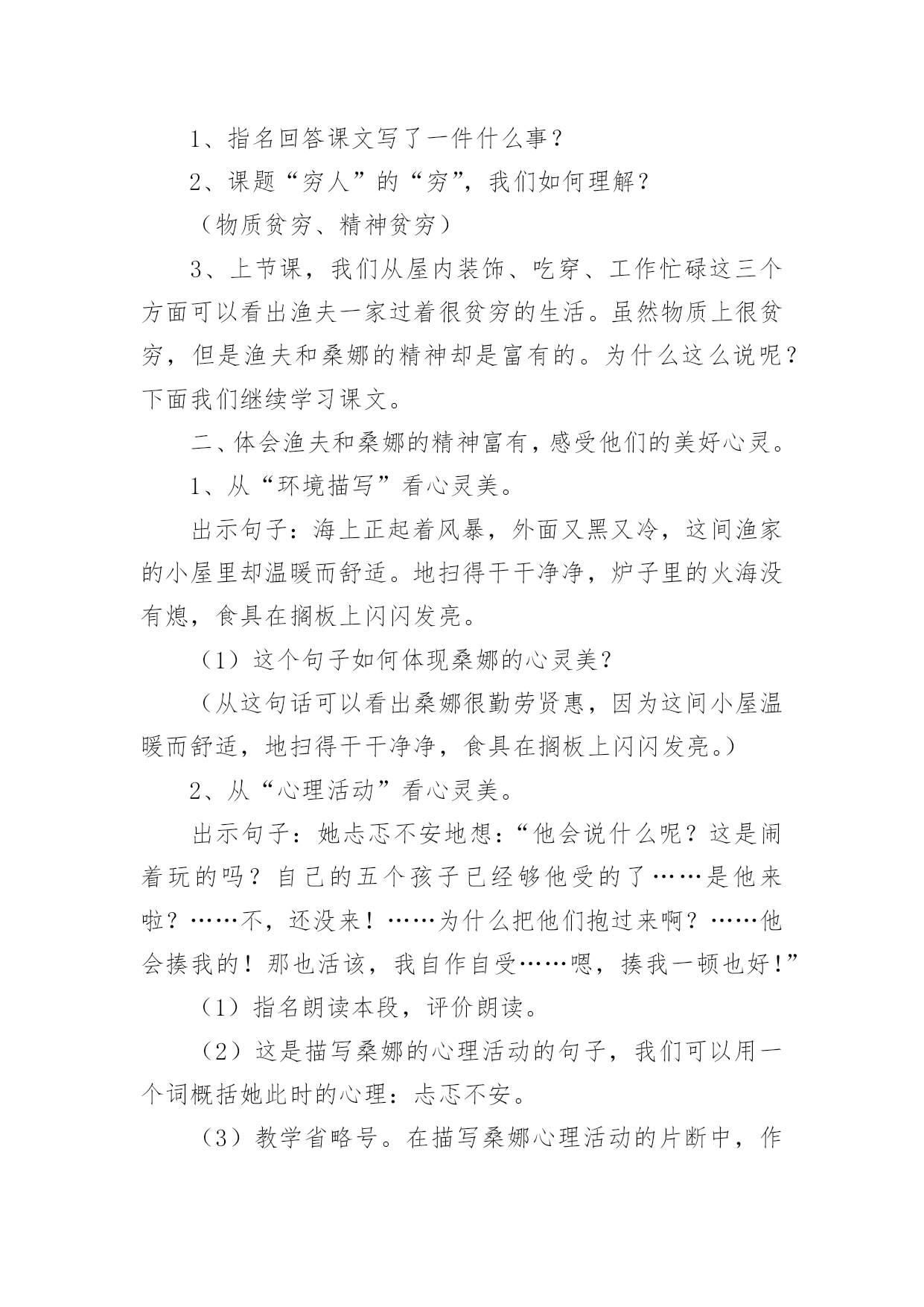《穷人》教学设计《穷人》教学设计集合15篇作为一无名无私奉献的教育工作者,很有必要精心设计一份教学设计,教学设计把教学各要素看成一个系统,分析教学问题和需求,确立解决的程序纲要,使教学效果最优化。那么写教学设计需要注意哪些问题呢?下面是小编帮大家整理的《穷人》教学设计,仅供参考,希望能够帮助到大家。《穷人》教学设计1【教学目的】1、继续学习课文内容。2、学习课文,抓住重点词语,体会文中重点句子的含义。3、继续体会“穷”的两层含义。4、感受沙俄时代穷人的悲惨生活和他们的美好心灵。【教学重点】抓住重点词语,体会文中重点句子的含义。【教学难点】感受沙俄时代穷人的悲惨生活和他们的美好心灵。【教学准备】课件【教学过程】一、复习,导入新课1、指名回答课文写了一件什么事?2、课题“穷人”的“穷”,我们如何理解?(物质贫穷、精神贫穷)3、上节课,我们从屋内装饰、吃穿、工作忙碌这三个方面可以看出渔夫一家过着很贫穷的生活。虽然物质上很贫穷,但是渔夫和桑娜的精神却是富有的。为什么这么说呢?下面我们继续学习课文。二、体会渔夫和桑娜的精神富有,感受他们的美好心灵。1、从“环境描写”看心灵美。出示句子:海上正起着风暴,外面又黑又冷,这间渔家的小屋里却温暖而舒适。地扫得干干净净,炉子里的火海没有熄,食具在搁板上闪闪发亮。(1)这个句子如何体现桑娜的心灵美?(从这句话可以看出桑娜很勤劳贤惠,因为这间小屋温暖而舒适,地扫得干干净净,食具在搁板上闪闪发亮。)2、从“心理活动”看心灵美。出示句子:她忐忑不安地想:“他会说什么呢?这是闹着玩的吗?自己的五个孩子已经够他受的了……是他来啦?……不,还没来!……为什么把他们抱过来啊?……他会揍我的!那也活该,我自作自受……嗯,揍我一顿也好!”(1)指名朗读本段,评价朗读。(2)这是描写桑娜的心理活动的句子,我们可以用一个词概括她此时的心理:忐忑不安。(3)教学省略号。在描写桑娜心理活动的片断中,作者运用了大量的省略号,反映了了她复杂、矛盾、忐忑不安的心理,你能说说这些省略号的作用吗?(生讨论,师指导)(4)谁能读出桑娜此时内心的慌乱呢?指名朗读??全班朗读(5)此时桑娜的内心是矛盾的,是忐忑不安的,那么她做出选择了吗?(最后一句)①联系课文,解释“自作自受”。(6)从这个心理活动的描写中,你是如何体现桑娜的心灵美的?(桑娜忐忑不安的`心理活动体现了她是一个善良、宁可自己受苦也要帮助别人的人。)(7)指名朗读本段。(8)总结与过渡:多么善良、多么富有同情心的桑娜啊!为了帮助别人,她宁可自己受苦受累,也要帮助别人的人。此时的她正挂念着出海打鱼的丈夫,那么渔夫是不是和桑娜一样的善良、富有同情心呢?正当桑娜沉思的时候,门突然开了,渔夫回来了??3、从“人物对话”看心灵美。(21段??27段)“你知道吗?”桑娜说,“咱们的邻居西蒙死了。”…………渔夫皱起眉,他的脸变得严肃、忧虑。……得把他们抱来,同死人呆在一起怎么行!哦,我们,我们总能熬过去的!快去!别等他们醒来。……“你瞧,他们在在这里啦。”桑娜拉开了帐子。(1)男女生分角色朗读对话部分。(2)学习两次“沉默”。(先讨论再总结)当看到渔夫回来的时候,桑娜欲言又止,所以这里出现了两次沉默,请联系课文想象桑娜和渔夫为什么沉默?在这两次沉默中他们各自会想些什么?①第一次“沉默”:是两个人的沉默。桑娜不知道如何告诉丈夫收养孤儿的事,而渔夫还沉浸在与海浪搏斗的恐惧中。②第二次“沉默”:是桑娜沉默。因为她在等待丈夫决定。(3)哪个句子最能体现渔夫的性格特点?“渔夫皱起眉,他的脸变得严肃、忧虑。……得把他们抱来,同死人呆在一起怎么行!哦,我们,我们总能熬过去的!快去!别等他们醒来。①渔夫的脸为什么变得严肃?他忧虑什么?(今后的日子该怎么过呢?)②那他做出决定了吗?哪里告诉我们?(做出了。“得把他们抱来,同死人呆在一起怎么行!”)③这个是什么句?请改成陈述句。(这个是反问句。同死人呆在一起不行。)④句中的“熬”字说明什么?(说明了渔夫明知困难大,但他都宁愿自己多受苦,也要帮助这两个孤儿。)(4)小结:①这段话写出了渔夫由忧虑道思考最后做出决定的过程。他们的日子的确很苦,如今又加上两口,真是雪上加霜,从“熬”字上就可以看出来,这不仅可以看出渔夫的坚强精神,也足以说明渔夫同桑娜一样有关心他人、善良的美好心灵。②学到这里,你认为渔夫和妻子桑娜,他们是怎样的人呢?(勤劳、善良、宁可自己受苦,也要帮助别人的人。)③多么令人感动的夫妇啊,他们为了帮助别人,没有做过多的考虑,他们为了帮助别人,宁可承受各种痛苦,我们再来体会一下他们沉重而温馨的对话吧!分角色朗读对话部分。④那么,你认为他们今后的日子会是怎样呢?(可能很幸福……可能很艰难……)三、总结全文正所谓“一千个读者就有一千个哈姆雷特”,有同学认为他