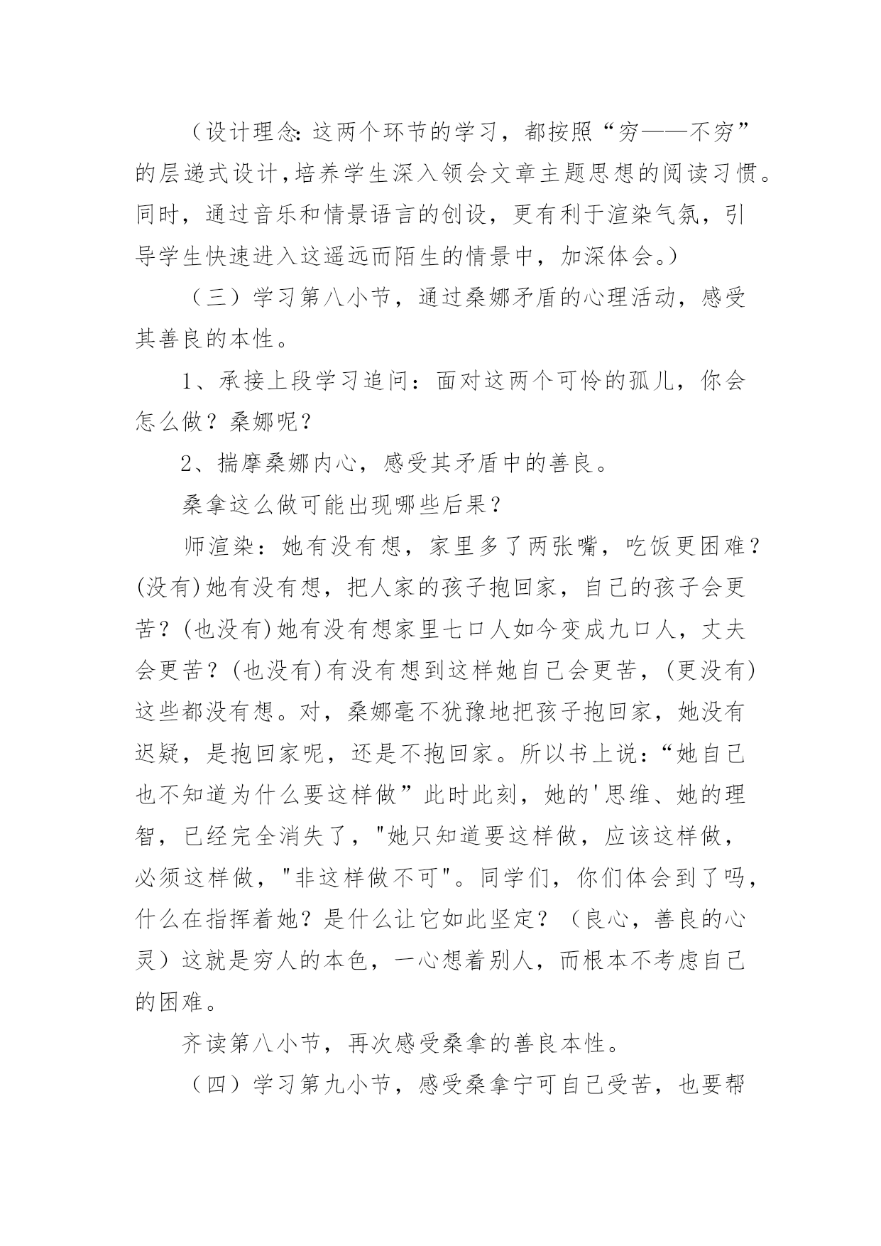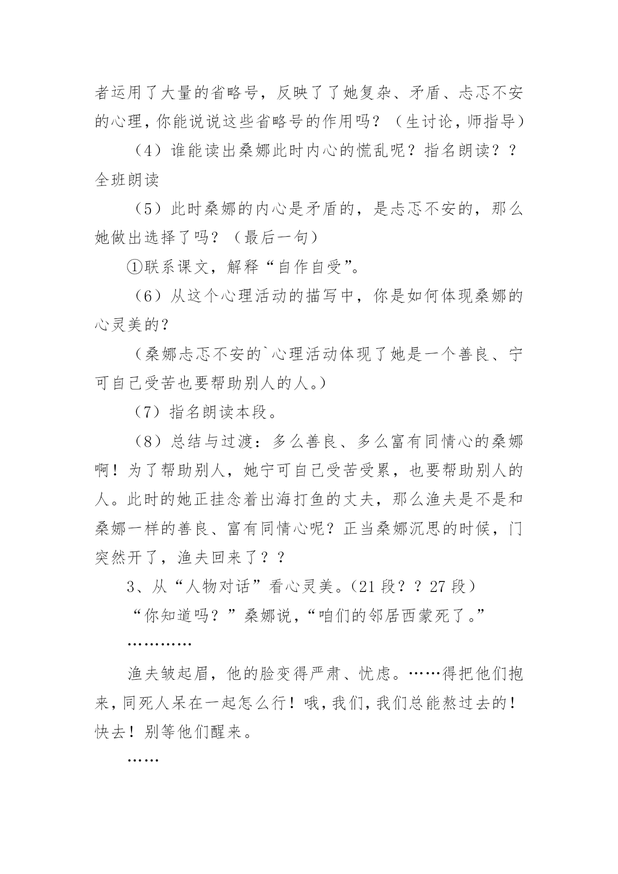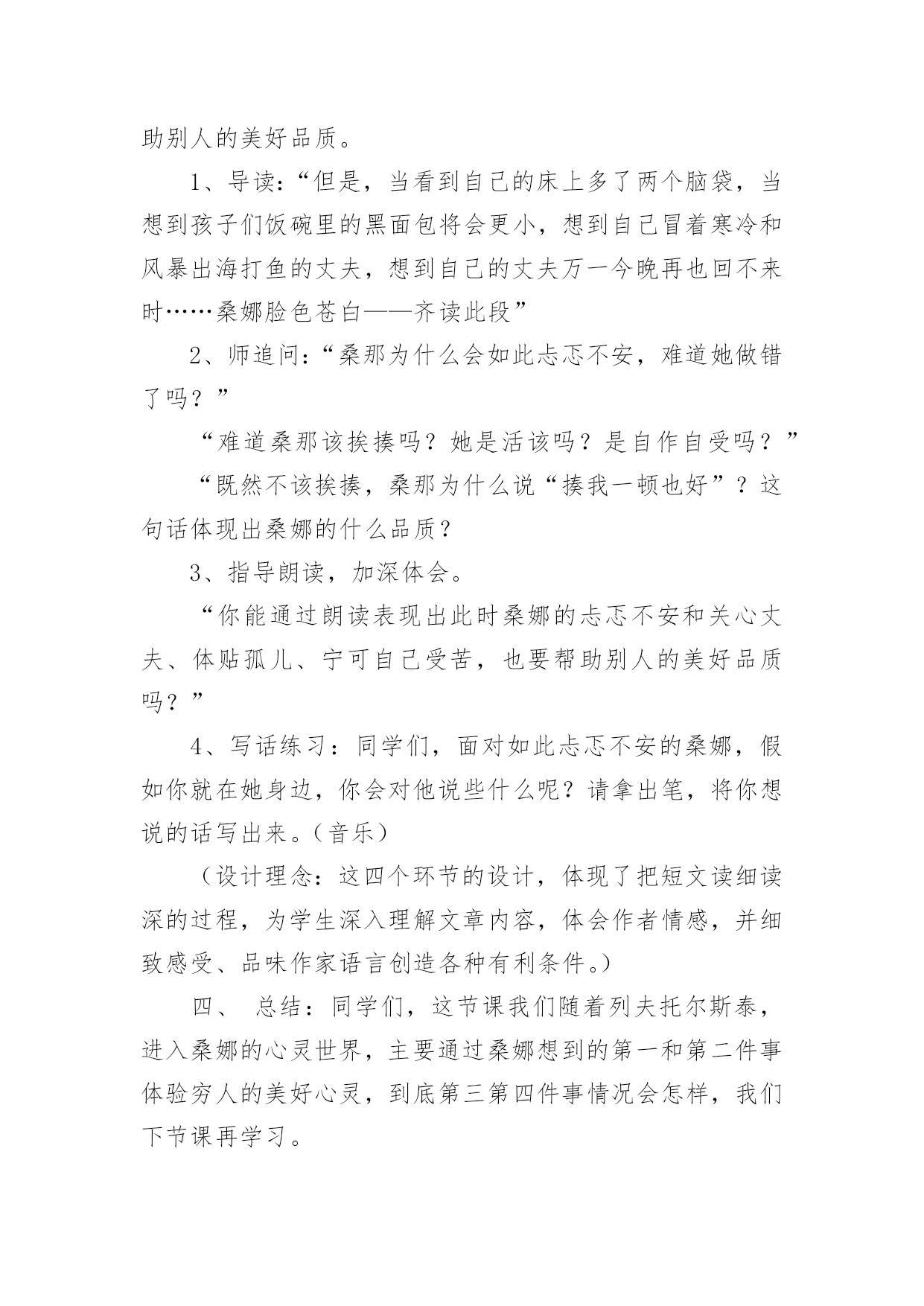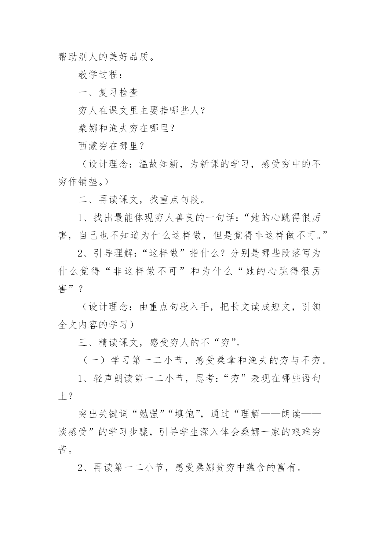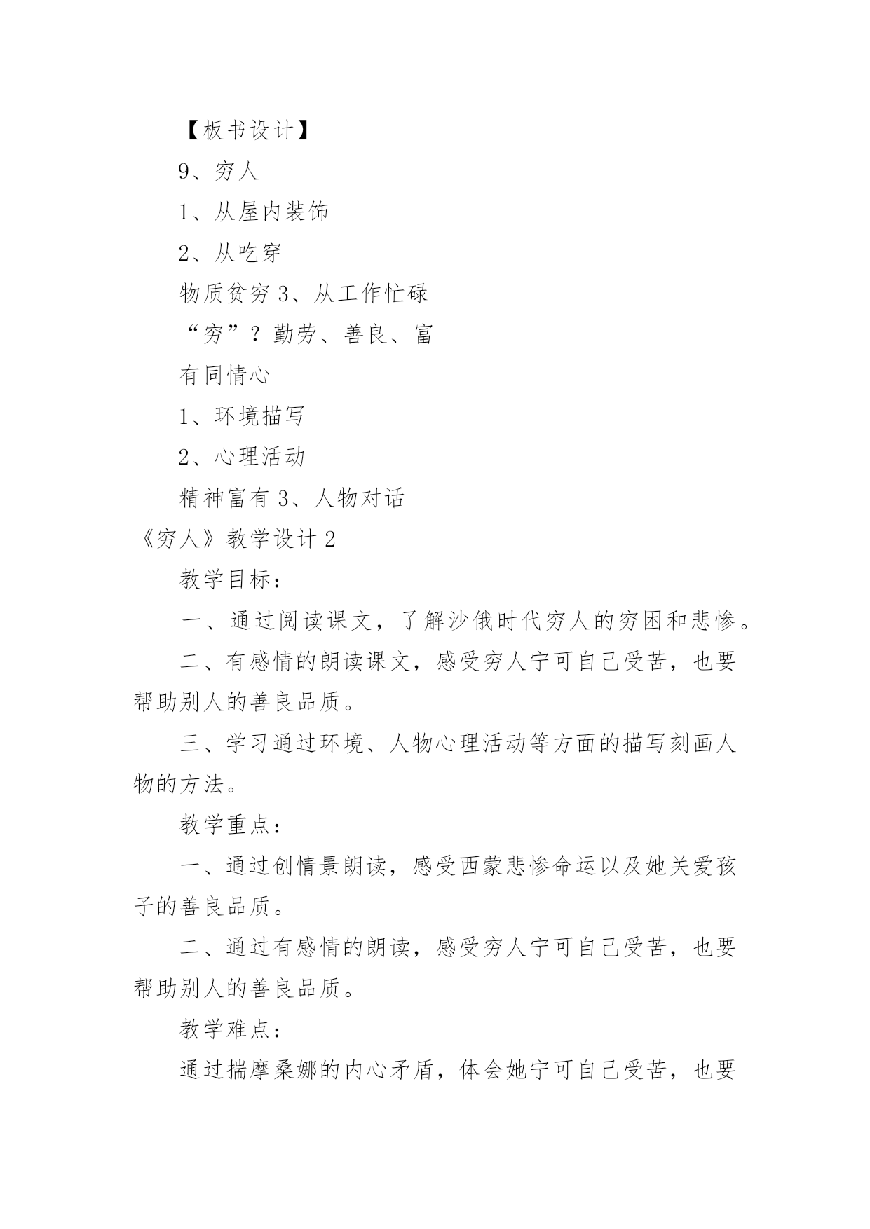 《穷人》教学设计《穷人》教学设计集合15篇作为一无名无私奉献的教育工作者,很有必要精心设计一份教学设计,教学设计把教学各要素看成一个系统,分析教学问题和需求,确立解决的程序纲要,使教学效果最优化。那么写教学设计需要注意哪些问题呢?下面是小编帮大家整理的《穷人》教学设计,仅供参考,希望能够帮助到大家。《穷人》教学设计1【教学目的】1、继续学习课文内容。2、学习课文,抓住重点词语,体会文中重点句子的含义。3、继续体会“穷”的两层含义。4、感受沙俄时代穷人的悲惨生活和他们的美好心灵。【教学重点】抓住重点词语,体会文中重点句子的含义。【教学难点】感受沙俄时代穷人的悲惨生活和他们的美好心灵。【教学准备】课件【教学过程】一、复习,导入新课1、指名回答课文写了一件什么事?2、课题“穷人”的“穷”,我们如何理解?(物质贫穷、精神贫穷)3、上节课,我们从屋内装饰、吃穿、工作忙碌这三个方面可以看出渔夫一家过着很贫穷的生活。虽然物质上很贫穷,但是渔夫和桑娜的精神却是富有的。为什么这么说呢?下面我们继续学习课文。二、体会渔夫和桑娜的精神富有,感受他们的美好心灵。1、从“环境描写”看心灵美。出示句子:海上正起着风暴,外面又黑又冷,这间渔家的小屋里却温暖而舒适。地扫得干干净净,炉子里的火海没有熄,食具在搁板上闪闪发亮。(1)这个句子如何体现桑娜的心灵美?(从这句话可以看出桑娜很勤劳贤惠,因为这间小屋温暖而舒适,地扫得干干净净,食具在搁板上闪闪发亮。)2、从“心理活动”看心灵美。出示句子:她忐忑不安地想:“他会说什么呢?这是闹着玩的吗?自己的五个孩子已经够他受的了……是他来啦?……不,还没来!……为什么把他们抱过来啊?……他会揍我的!那也活该,我自作自受……嗯,揍我一顿也好!”(1)指名朗读本段,评价朗读。(2)这是描写桑娜的心理活动的句子,我们可以用一个词概括她此时的心理:忐忑不安。(3)教学省略号。在描写桑娜心理活动的片断中,作者运用了大量的省略号,反映了了她复杂、矛盾、忐忑不安的心理,你能说说这些省略号的作用吗?(生讨论,师指导)(4)谁能读出桑娜此时内心的慌乱呢?指名朗读??全班朗读(5)此时桑娜的内心是矛盾的,是忐忑不安的,那么她做出选择了吗?(最后一句)①联系课文,解释“自作自受”。(6)从这个心理活动的描写中,你是如何体现桑娜的心灵美的?(桑娜忐忑不安的`心理活动体现了她是一个善良、宁可自己受苦也要帮助别人的人。)(7)指名朗读本段。(8)总结与过渡:多么善良、多么富有同情心的桑娜啊!为了帮助别人,她宁可自己受苦受累,也要帮助别人的人。此时的她正挂念着出海打鱼的丈夫,那么渔夫是不是和桑娜一样的善良、富有同情心呢?正当桑娜沉思的时候,门突然开了,渔夫回来了??3、从“人物对话”看心灵美。(21段??27段)“你知道吗?”桑娜说,“咱们的邻居西蒙死了。”…………渔夫皱起眉,他的脸变得严肃、忧虑。……得把他们抱来,同死人呆在一起怎么行!哦,我们,我们总能熬过去的!快去!别等他们醒来。……“你瞧,他们在在这里啦。”桑娜拉开了帐子。(1)男女生分角色朗读对话部分。(2)学习两次“沉默”。(先讨论再总结)当看到渔夫回来的时候,桑娜欲言又止,所以这里出现了两次沉默,请联系课文想象桑娜和渔夫为什么沉默?在这两次沉默中他们各自会想些什么?①第一次“沉默”:是两个人的沉默。桑娜不知道如何告诉丈夫收养孤儿的事,而渔夫还沉浸在与海浪搏斗的恐惧中。②第二次“沉默”:是桑娜沉默。因为她在等待丈夫决定。(3)哪个句子最能体现渔夫的性格特点?“渔夫皱起眉,他的脸变得严肃、忧虑。……得把他们抱来,同死人呆在一起怎么行!哦,我们,我们总能熬过去的!快去!别等他们醒来。①渔夫的脸为什么变得严肃?他忧虑什么?(今后的日子该怎么过呢?)②那他做出决定了吗?哪里告诉我们?(做出了。“得把他们抱来,同死人呆在一起怎么行!”)③这个是什么句?请改成陈述句。(这个是反问句。同死人呆在一起不行。)④句中的“熬”字说明什么?(说明了渔夫明知困难大,但他都宁愿自己多受苦,也要帮助这两个孤儿。)(4)小结:①这段话写出了渔夫由忧虑道思考最后做出决定的过程。他们的日子的确很苦,如今又加上两口,真是雪上加霜,从“熬”字上就可以看出来,这不仅可以看出渔夫的坚强精神,也足以说明渔夫同桑娜一样有关心他人、善良的美好心灵。②学到这里,你认为渔夫和妻子桑娜,他们是怎样的人呢?(勤劳、善良、宁可自己受苦,也要帮助别人的人。)③多么令人感动的夫妇啊,他们为了帮助别人,没有做过多的考虑,他们为了帮助别人,宁可承受各种痛苦,我们再来体会一下他们沉重而温馨的对话吧!分角色朗读对话部分。④那么,你认为他们今后的日子会是怎样呢?(可能很幸福……可能很艰难……)三、总结全文正所谓“一千个读者就有一千个哈姆雷特”,有同学认为他