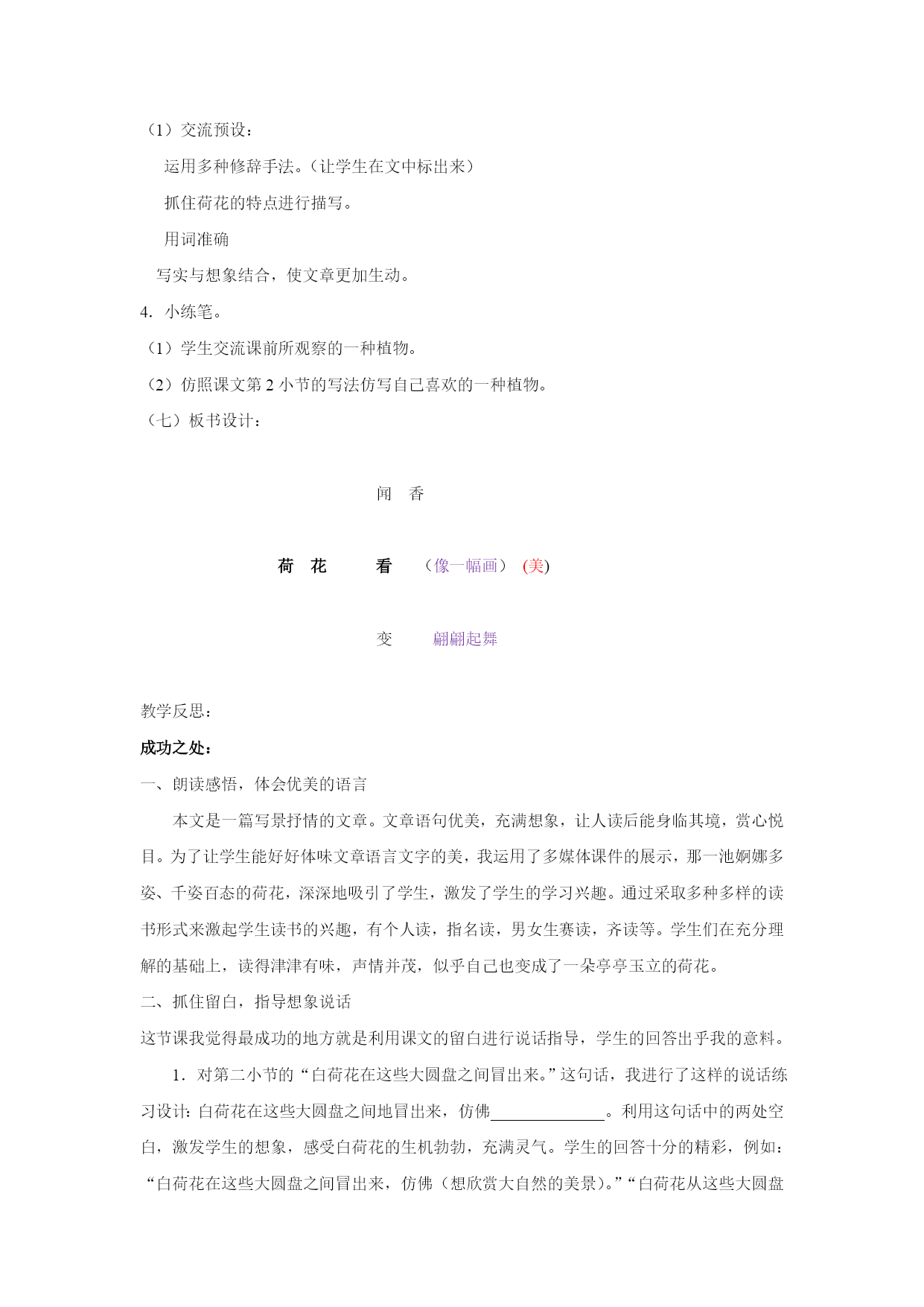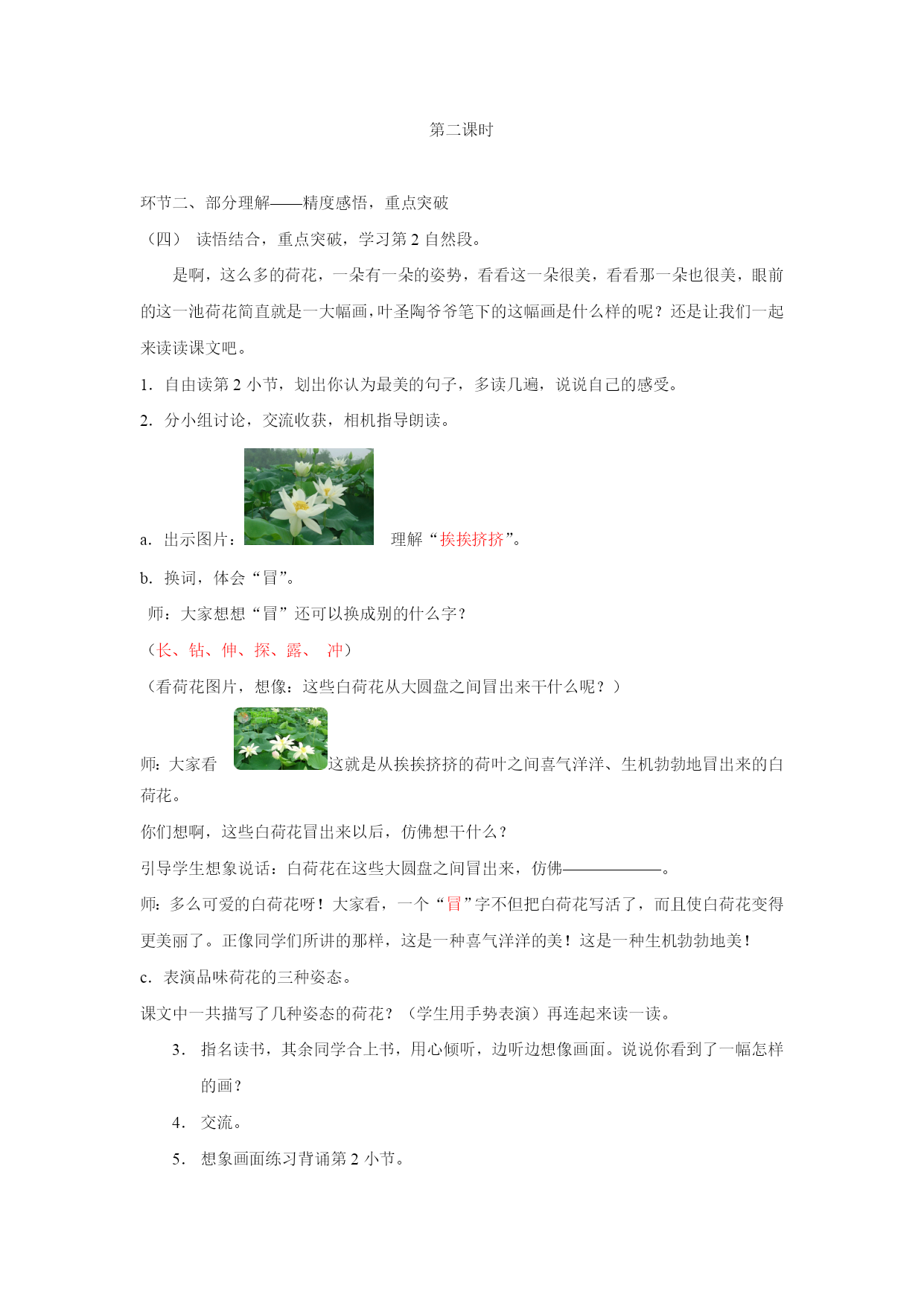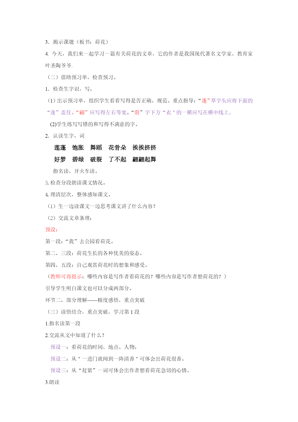 苏教版三年级语文下册12.荷花一、教学目标:学会本课10个生字,能正确、规范的书写。借助图画或联系上下文理解“挨挨挤挤、饱胀、翩翩起舞”等词语。正确、流利的朗读课文、背诵课文。能按照观察的顺序,了解作者是如何写荷花的。细读并摘抄描写荷花优美的语句,品悟荷花的美丽。激发学生热爱大自然的情感。学习作者第2小节的写作方法仿写一种植物。二、教学重难点:感受荷花美丽的姿势,体会作者丰富的想象,培养对大自然美的感情。仿照课文第2小节写一种喜欢的植物。三、教学评价:1.在检查预习环节,通过查看预习单、指名读、开火车读等多种方式了解学生识、写生字及正确、流利朗读课文情况。2.在精读环节中,借助多媒体课件,采取自由读、齐读、男女赛读、小组讨论、交流等方式推进学生对课文的理解从而更深刻的感受荷花的美丽。3.借助小练笔,训练学生如何将一种植物写具体生动。四、教与学的准备:教师:准备有关荷花的多媒体教学课件。学生:1.观察喜欢的一种植物。2.预习课文,完成预习单。五、教学课时2课时六、教学设计第一课时环节一、整体感知——初读感知,整体把握谜语导入1.课件出示:一个小姑娘,长在水中央,身穿白衣裳,坐在绿船上。(学生猜谜语)2.让学生说说是根据什么猜出来的。3.揭示课题(板书:荷花)4.今天,我们来一起学习一篇有关荷花的文章,它的作者是我国现代著名文学家、教育家叶圣陶爷爷.(二)借助预习单,检查预习。1.检查生字识,写。(1)出示预习单,组织学生看看写得是否正确、规范。重点指导:“蓬”草字头应将下面的“逢”盖住。“翩”应写得左右等宽。“裂”字下方“衣"的一横应写在横中线上.(2)学生练写写错的和写得不满意的字。2.认读生字、词莲蓬饱胀舞蹈花骨朵挨挨挤挤好梦碧绿破裂了不起翩翩起舞指名读、开火车读。3.检查分段朗读课文情况。4.理清层次,整体感知课文。(1)生一边读课文一边思考课文讲了什么内容?(2)交流文章条理:预设:第一段:“我”去公园看荷花。第二、三段:荷花生长的各种优美的姿态。第四、五段:自己观赏荷花时的想象和感受。(教师可再提示:哪些内容是写作者看荷花的?哪些内容是写作者想荷花的?)引导学生明白课文也可以分成两部分。环节二、部分理解——精度感悟,重点突破(三)读悟结合,重点突破,学习第1段1.指名读第一段2.交流从文中知道了什么?预设一:看荷花的时间、地点、人物。预设二:从"一进门就闻到一阵清香"可体会出荷花很香。预设三:从“赶紧”一词可体会出作者想看荷花急切的心情。3.朗读第二课时环节二、部分理解——精度感悟,重点突破读悟结合,重点突破,学习第2自然段。是啊,这么多的荷花,一朵有一朵的姿势,看看这一朵很美,看看那一朵也很美,眼前的这一池荷花简直就是一大幅画,叶圣陶爷爷笔下的这幅画是什么样的呢?还是让我们一起来读读课文吧。1.自由读第2小节,划出你认为最美的句子,多读几遍,说说自己的感受。2.分小组讨论,交流收获,相机指导朗读。a.出示图片:理解“挨挨挤挤”。b.换词,体会“冒”。师:大家想想“冒”还可以换成别的什么字?(长、钻、伸、探、露、冲)(看荷花图片,想像:这些白荷花从大圆盘之间冒出来干什么呢?)师:大家看这就是从挨挨挤挤的荷叶之间喜气洋洋、生机勃勃地冒出来的白荷花。你们想啊,这些白荷花冒出来以后,仿佛想干什么?引导学生想象说话:白荷花在这些大圆盘之间冒出来,仿佛——————。师:多么可爱的白荷花呀!大家看,一个“冒”字不但把白荷花写活了,而且使白荷花变得更美丽了。正像同学们所讲的那样,这是一种喜气洋洋的美!这是一种生机勃勃地美!c.表演品味荷花的三种姿态。课文中一共描写了几种姿态的荷花?(学生用手势表演)再连起来读一读。指名读书,其余同学合上书,用心倾听,边听边想像画面。说说你看到了一幅怎样的画?交流。想象画面练习背诵第2小节。(五)以演促读,读中想像,学习第4小节。过渡:听着听着,想着想着,我忽然觉得自己仿佛就是一朵荷花……配乐范背第四自然段,美吗?想读吗?那就美美地读吧,可爱的荷花仙子们。1.指名个别读。2.数人齐读,边听边配以动作。3.男女生赛读。4.语言训练:蜻蜓蜻蜓,你刚才跟荷花仙子说什么啦?小鱼小鱼,你刚才跟荷花仙子说什么啦?还有谁会告诉我什么?(引导学生练习说话。)(六)学习第三段,挖掘文旨,实践中求发展。过渡:过了好一会儿,我才记起我不是荷花,我是在看荷花哩。看,这么多的白荷花一朵有一朵的姿势,看看这一朵很美,看看那一朵也很美,如果把眼前的一池荷花,看作一大幅活的画,那画家的本领可真了不起,你知道这位了不起的画家是谁吗?1.说说画家是谁?(大自然)