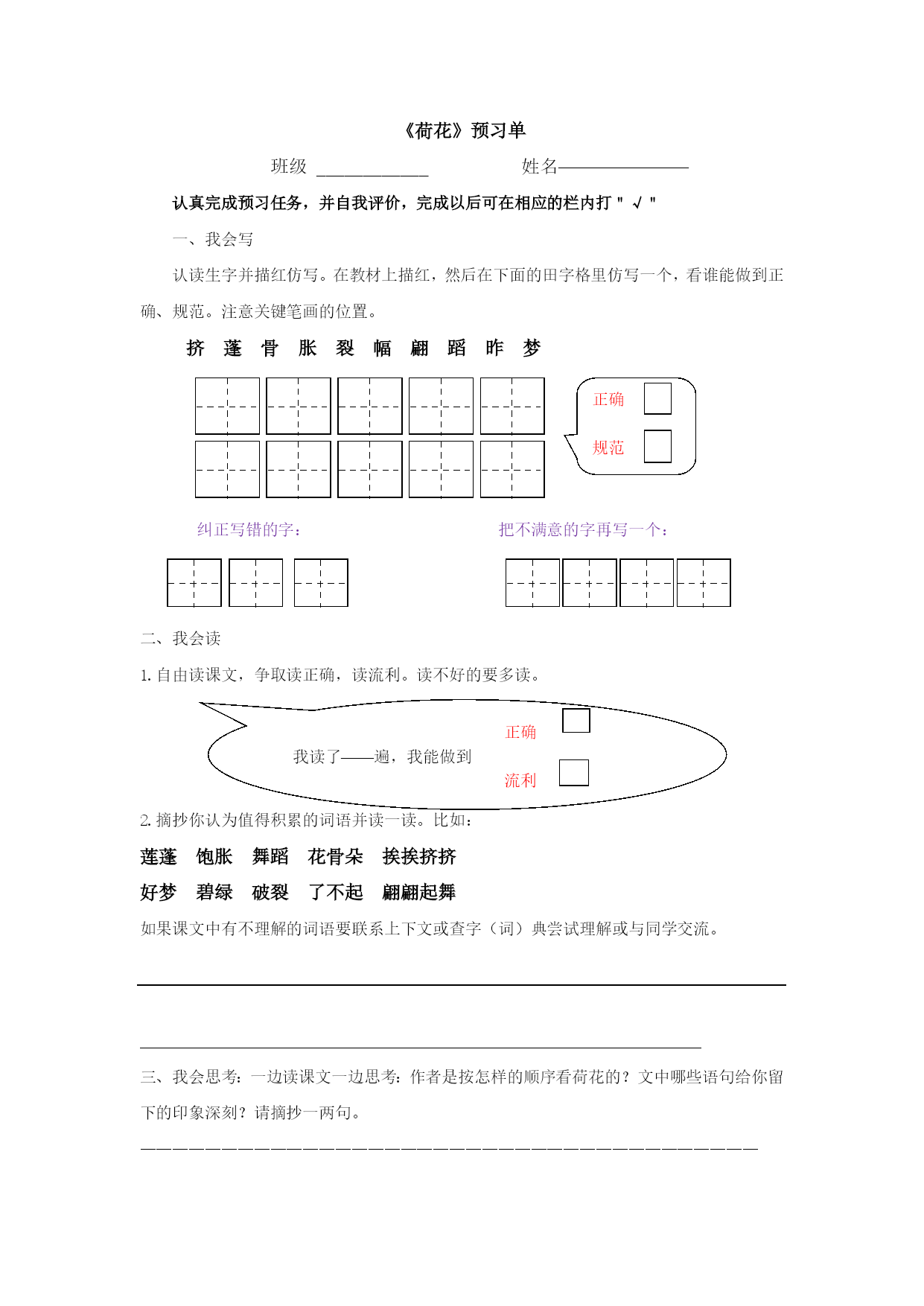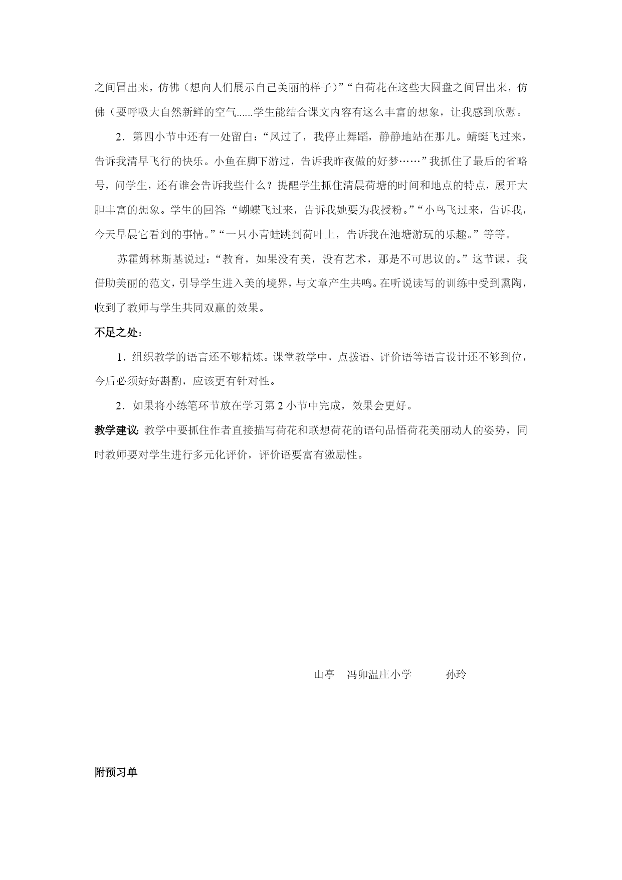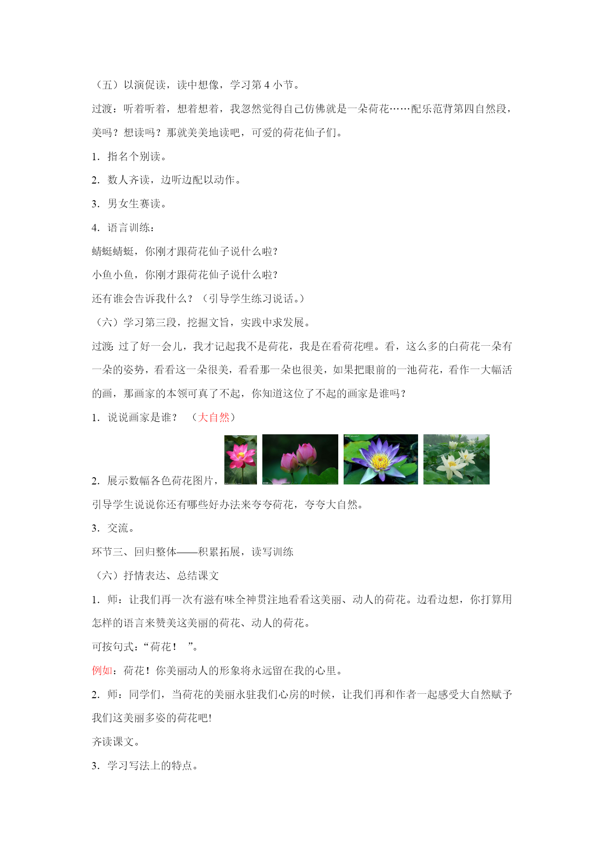 苏教版三年级语文下册12.荷花一、教学目标:学会本课10个生字,能正确、规范的书写。借助图画或联系上下文理解“挨挨挤挤、饱胀、翩翩起舞”等词语。正确、流利的朗读课文、背诵课文。能按照观察的顺序,了解作者是如何写荷花的。细读并摘抄描写荷花优美的语句,品悟荷花的美丽。激发学生热爱大自然的情感。学习作者第2小节的写作方法仿写一种植物。二、教学重难点:感受荷花美丽的姿势,体会作者丰富的想象,培养对大自然美的感情。仿照课文第2小节写一种喜欢的植物。三、教学评价:1.在检查预习环节,通过查看预习单、指名读、开火车读等多种方式了解学生识、写生字及正确、流利朗读课文情况。2.在精读环节中,借助多媒体课件,采取自由读、齐读、男女赛读、小组讨论、交流等方式推进学生对课文的理解从而更深刻的感受荷花的美丽。3.借助小练笔,训练学生如何将一种植物写具体生动。四、教与学的准备:教师:准备有关荷花的多媒体教学课件。学生:1.观察喜欢的一种植物。2.预习课文,完成预习单。五、教学课时2课时六、教学设计第一课时环节一、整体感知——初读感知,整体把握谜语导入1.课件出示:一个小姑娘,长在水中央,身穿白衣裳,坐在绿船上。(学生猜谜语)2.让学生说说是根据什么猜出来的。3.揭示课题(板书:荷花)4.今天,我们来一起学习一篇有关荷花的文章,它的作者是我国现代著名文学家、教育家叶圣陶爷爷.(二)借助预习单,检查预习。1.检查生字识,写。(1)出示预习单,组织学生看看写得是否正确、规范。重点指导:“蓬”草字头应将下面的“逢”盖住。“翩”应写得左右等宽。“裂”字下方“衣"的一横应写在横中线上.(2)学生练写写错的和写得不满意的字。2.认读生字、词莲蓬饱胀舞蹈花骨朵挨挨挤挤好梦碧绿破裂了不起翩翩起舞指名读、开火车读。3.检查分段朗读课文情况。4.理清层次,整体感知课文。(1)生一边读课文一边思考课文讲了什么内容?(2)交流文章条理:预设:第一段:“我”去公园看荷花。第二、三段:荷花生长的各种优美的姿态。第四、五段:自己观赏荷花时的想象和感受。(教师可再提示:哪些内容是写作者看荷花的?哪些内容是写作者想荷花的?)引导学生明白课文也可以分成两部分。环节二、部分理解——精度感悟,重点突破(三)读悟结合,重点突破,学习第1段1.指名读第一段2.交流从文中知道了什么?预设一:看荷花的时间、地点、人物。预设二:从"一进门就闻到一阵清香"可体会出荷花很香。预设三:从“赶紧”一词可体会出作者想看荷花急切的心情。3.朗读第二课时环节二、部分理解——精度感悟,重点突破读悟结合,重点突破,学习第2自然段。是啊,这么多的荷花,一朵有一朵的姿势,看看这一朵很美,看看那一朵也很美,眼前的这一池荷花简直就是一大幅画,叶圣陶爷爷笔下的这幅画是什么样的呢?还是让我们一起来读读课文吧。1.自由读第2小节,划出你认为最美的句子,多读几遍,说说自己的感受。2.分小组讨论,交流收获,相机指导朗读。a.出示图片:理解“挨挨挤挤”。b.换词,体会“冒”。师:大家想想“冒”还可以换成别的什么字?(长、钻、伸、探、露、冲)(看荷花图片,想像:这些白荷花从大圆盘之间冒出来干什么呢?)师:大家看这就是从挨挨挤挤的荷叶之间喜气洋洋、生机勃勃地冒出来的白荷花。你们想啊,这些白荷花冒出来以后,仿佛想干什么?引导学生想象说话:白荷花在这些大圆盘之间冒出来,仿佛——————。师:多么可爱的白荷花呀!大家看,一个“冒”字不但把白荷花写活了,而且使白荷花变得更美丽了。正像同学们所讲的那样,这是一种喜气洋洋的美!这是一种生机勃勃地美!c.表演品味荷花的三种姿态。课文中一共描写了几种姿态的荷花?(学生用手势表演)再连起来读一读。指名读书,其余同学合上书,用心倾听,边听边想像画面。说说你看到了一幅怎样的画?交流。想象画面练习背诵第2小节。(五)以演促读,读中想像,学习第4小节。过渡:听着听着,想着想着,我忽然觉得自己仿佛就是一朵荷花……配乐范背第四自然段,美吗?想读吗?那就美美地读吧,可爱的荷花仙子们。1.指名个别读。2.数人齐读,边听边配以动作。3.男女生赛读。4.语言训练:蜻蜓蜻蜓,你刚才跟荷花仙子说什么啦?小鱼小鱼,你刚才跟荷花仙子说什么啦?还有谁会告诉我什么?(引导学生练习说话。)(六)学习第三段,挖掘文旨,实践中求发展。过渡:过了好一会儿,我才记起我不是荷花,我是在看荷花哩。看,这么多的白荷花一朵有一朵的姿势,看看这一朵很美,看看那一朵也很美,如果把眼前的一池荷花,看作一大幅活的画,那画家的本领可真了不起,你知道这位了不起的画家是谁吗?1.说说画家是谁?(大自然)