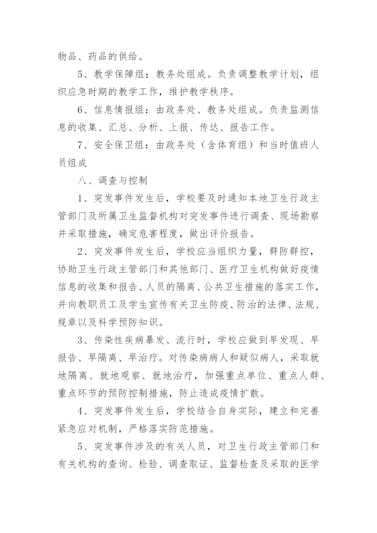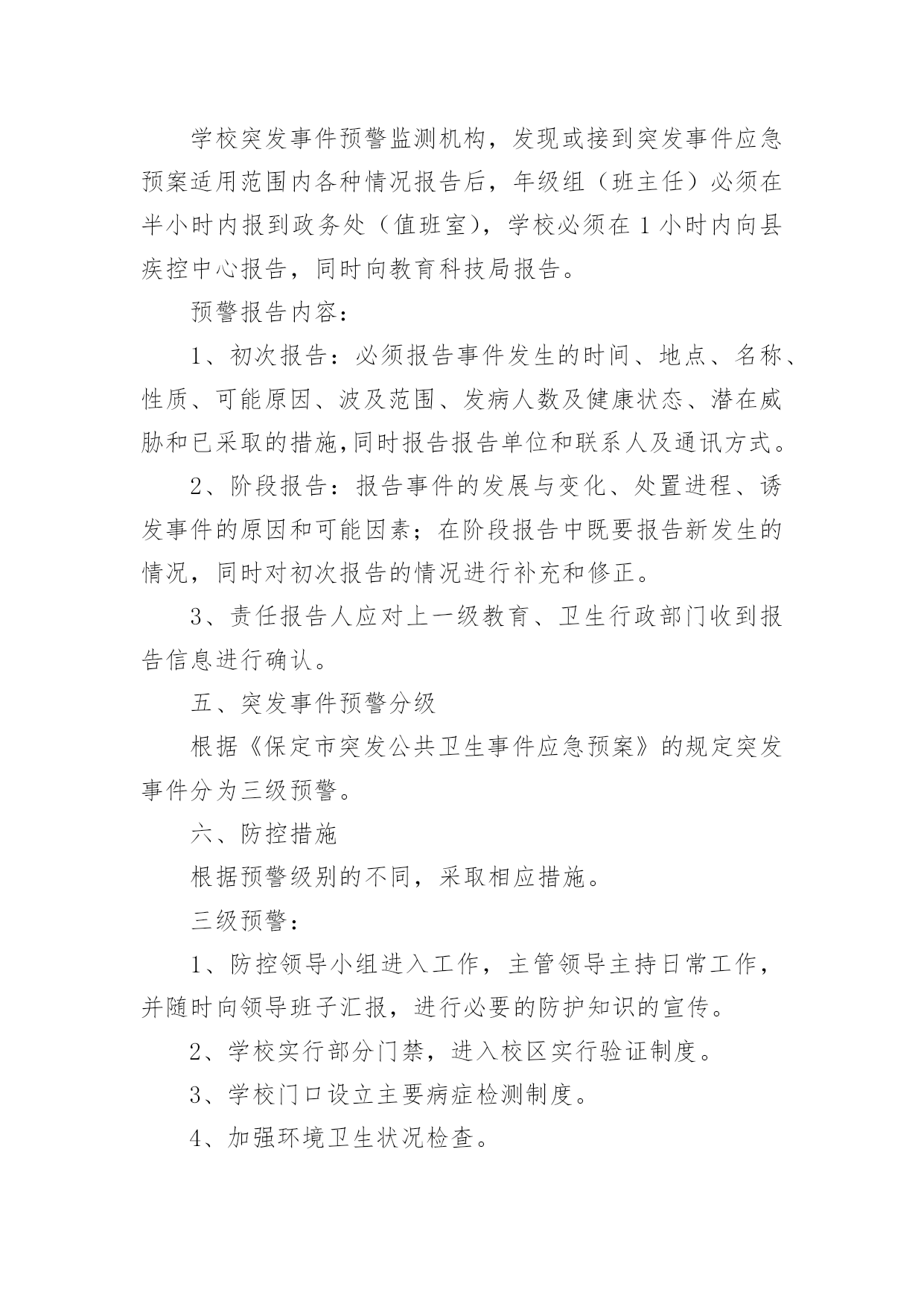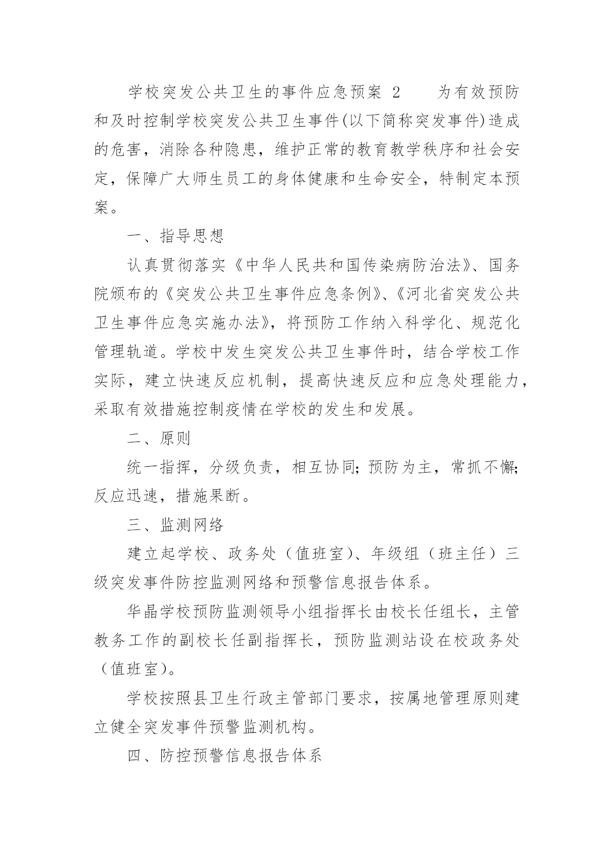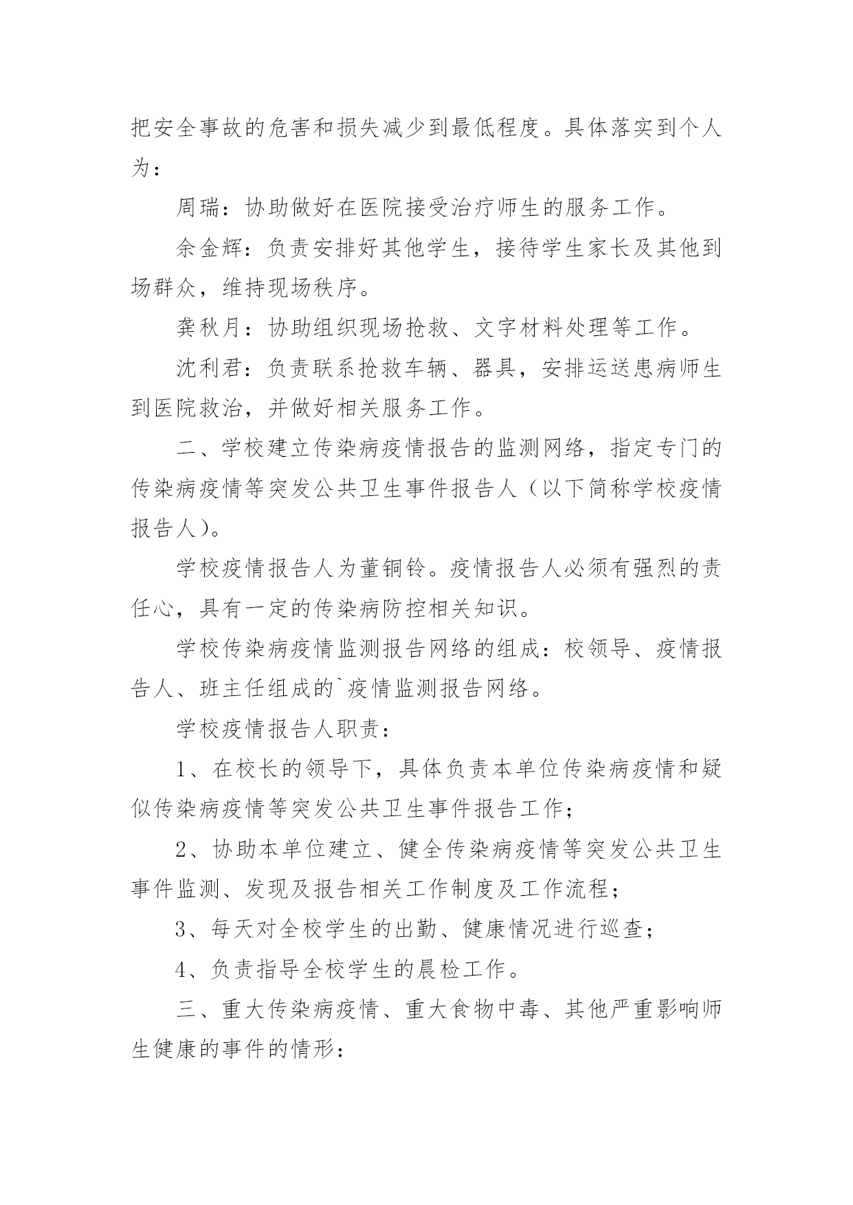 学校突发公共卫生的事件应急预案学校突发公共卫生的事件应急预案(通用12篇)在日常生活或是工作学习中,有时会突发一些难以预料的事件,为了降低事故造成的危害,可能需要提前进行应急预案编制工作。写应急预案需要注意哪些格式呢?下面是小编为大家收集的学校突发公共卫生的事件应急预案,希望对大家有所帮助。学校突发公共卫生的事件应急预案1为了预防和减少学生宿舍安全事故的发生,切实保障住宿学生的健康和安全,根据《中华人民共和国未成年人保护法》、教育部《学生伤害事故处理办法》,特制定学生宿舍安全事故应急处理预案。一、可能引发学生宿舍事故的原因学生宿舍的房屋、设备等维护、管理不当;生活设施、设备不符合国家和本市的安全标准;地面不防滑;电线电器设备老化和乱拉乱接电线电源插座,违章使用电炉等电器设备;未按规定配齐有效灭火器材,通道堆物,应急照明灯、紧急疏散指示牌缺少或不能正常使用;学生追逐、打闹玩耍;校外人员私自进入寝室、生活老师管理失职或不当以及学生自身疾病等情况是可能引发学生宿舍和住宿期间事故的主要原因。二、预防办法加强对生活老师责任制的落实和师生安全意识的'教育。1;对住宿学生进行行为规范和安全教育,做好逃生自救的演练,增强自我保护意识。2;健全宿舍管理制度,落实安全措施,责任到人。3;夜间要有专人值班巡视,并做好值班巡视记录。4;加强对宿舍房屋、设备以及生活设施设备的维护、管理、检查,发现隐患及时整改。5;配齐有效灭火器材,保持通道畅通,应急照明灯、紧急疏散指示牌要良好。6;电线拉接、电源插座位置、电器设备使用要规范。三、处理程序:一旦发生学生宿舍安全事故,应按下列程序处理1、以最快速度及时将受伤学生就近送往医院救治,并通知家长。2、报告。(1)学生应及时报告值班教师。(2)值班教师应及时向校领导报告。(3)校方马上报告教育局。可先口头后书面。(4)根据安全事故的性质及时向有关部门报告。3、火灾事故,按学校火灾事故应急处理预案开展相关工作。4、重大事故,按学校重大事故应急处理预案开展相关工作。5、发生人质事件,按学校防范暴力事件应急预案开展相关工作。学校突发公共卫生的事件应急预案2为有效预防和及时控制学校突发公共卫生事件(以下简称突发事件)造成的危害,消除各种隐患,维护正常的教育教学秩序和社会安定,保障广大师生员工的身体健康和生命安全,特制定本预案。一、指导思想认真贯彻落实《中华人民共和国传染病防治法》、国务院颁布的《突发公共卫生事件应急条例》、《河北省突发公共卫生事件应急实施办法》,将预防工作纳入科学化、规范化管理轨道。学校中发生突发公共卫生事件时,结合学校工作实际,建立快速反应机制,提高快速反应和应急处理能力,采取有效措施控制疫情在学校的发生和发展。二、原则统一指挥,分级负责,相互协同;预防为主,常抓不懈;反应迅速,措施果断。三、监测网络建立起学校、政务处(值班室)、年级组(班主任)三级突发事件防控监测网络和预警信息报告体系。华晶学校预防监测领导小组指挥长由校长任组长,主管教务工作的副校长任副指挥长,预防监测站设在校政务处(值班室)。学校按照县卫生行政主管部门要求,按属地管理原则建立健全突发事件预警监测机构。四、防控预警信息报告体系学校突发事件预警监测机构,发现或接到突发事件应急预案适用范围内各种情况报告后,年级组(班主任)必须在半小时内报到政务处(值班室),学校必须在1小时内向县疾控中心报告,同时向教育科技局报告。预警报告内容:1、初次报告:必须报告事件发生的时间、地点、名称、性质、可能原因、波及范围、发病人数及健康状态、潜在威胁和已采取的措施,同时报告报告单位和联系人及通讯方式。2、阶段报告:报告事件的发展与变化、处置进程、诱发事件的原因和可能因素;在阶段报告中既要报告新发生的情况,同时对初次报告的情况进行补充和修正。3、责任报告人应对上一级教育、卫生行政部门收到报告信息进行确认。五、突发事件预警分级根据《保定市突发公共卫生事件应急预案》的规定突发事件分为三级预警。六、防控措施根据预警级别的不同,采取相应措施。三级预警:1、防控领导小组进入工作,主管领导主持日常工作,并随时向领导班子汇报,进行必要的防护知识的宣传。2、学校实行部分门禁,进入校区实行验证制度。3、学校门口设立主要病症检测制度。4、加强环境卫生状况检查。5、进行防护水平升级的人力、物力准备。二级预警:1、学校开始实行门禁制度。2、住校学生一律不许出校门,走读学生进校门要进行主要病症检测。3、建立学生疫情监控制度,实行学生每日健康登记制度。4、教职工限制出入,严格控制与疫区之间的`人员流动。5、学校开始设置医学观察区,对外来人员进行一定时间的必要观察。6、每天定时在规定部位消毒。7、校领导带班,安排人员值班。8、应急机构工作人员进入准备状态,相关物资、设施到位。一级预警: