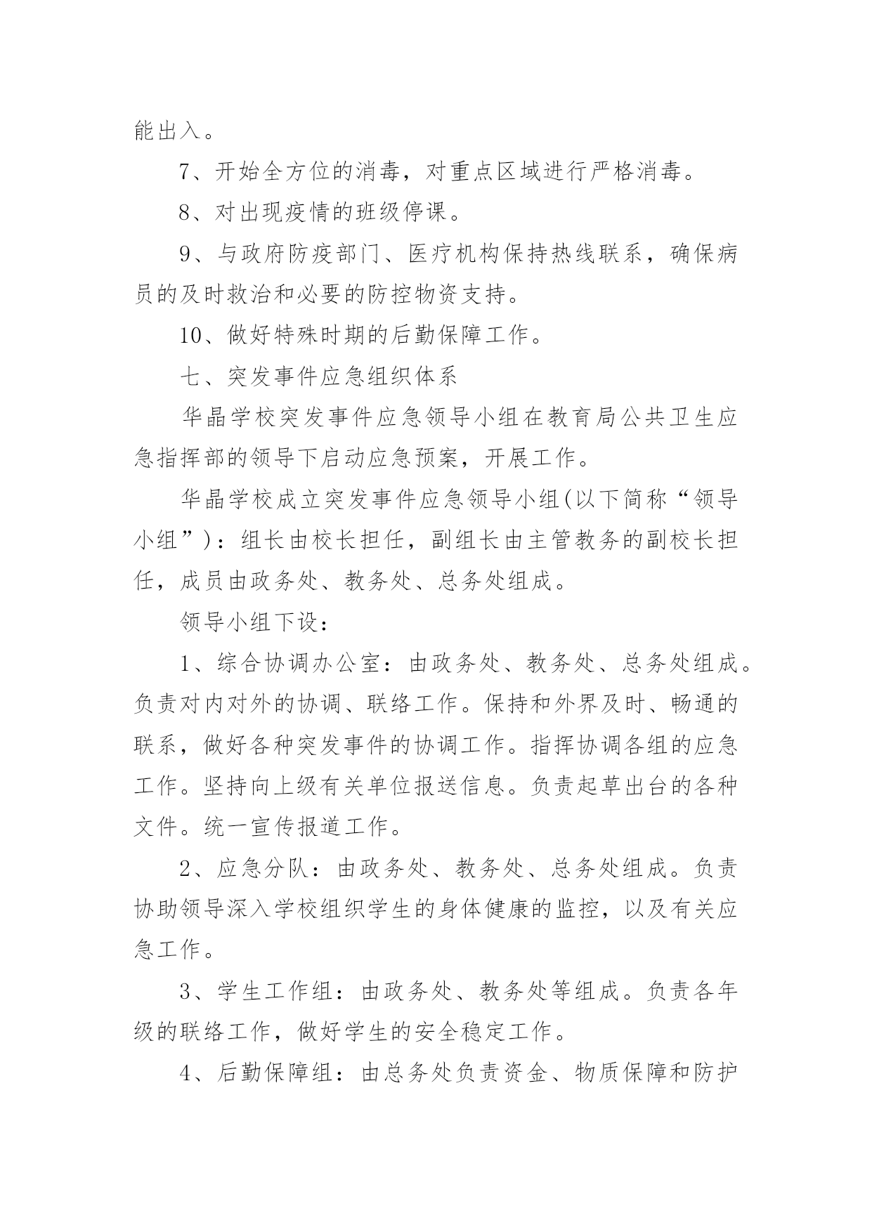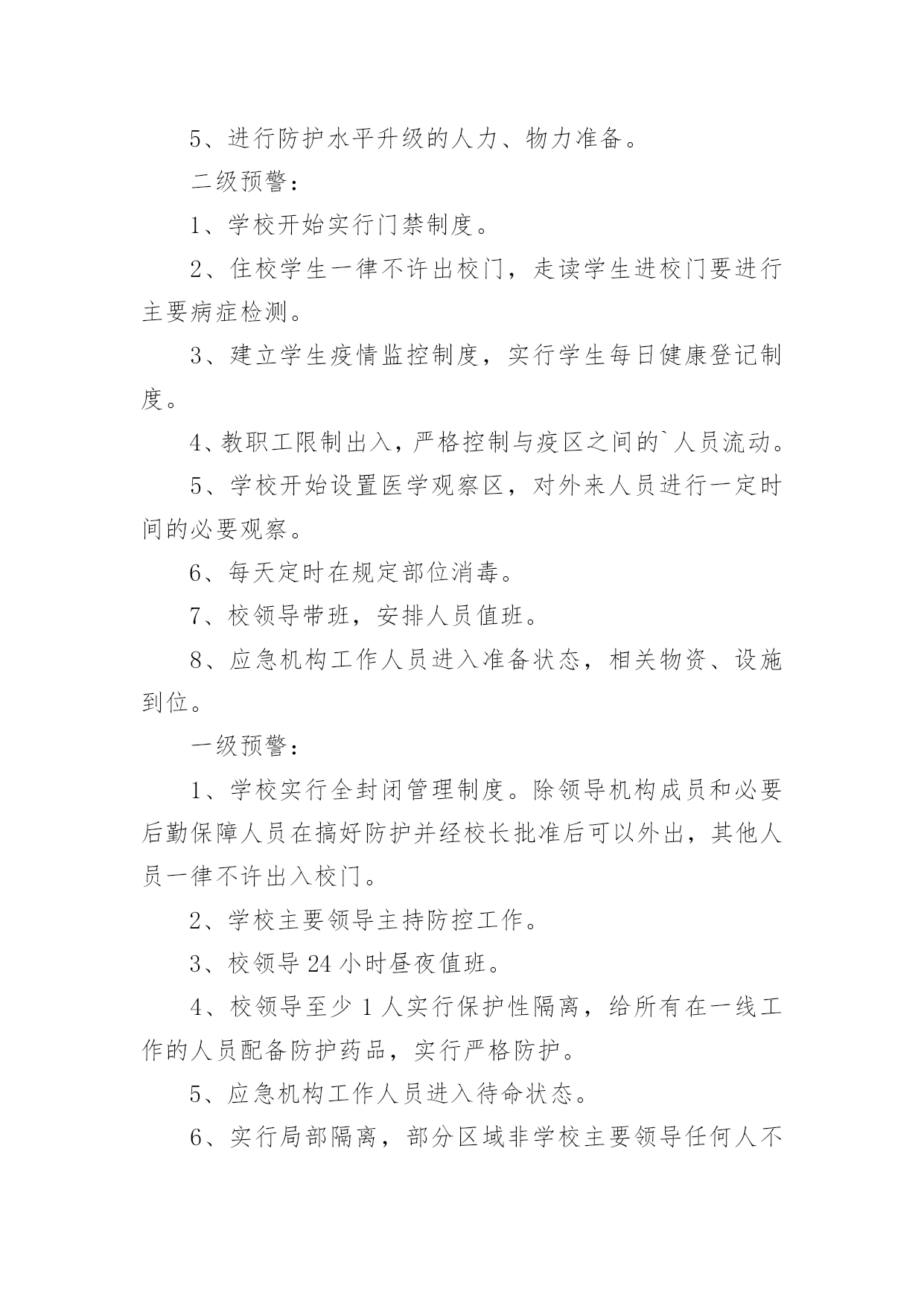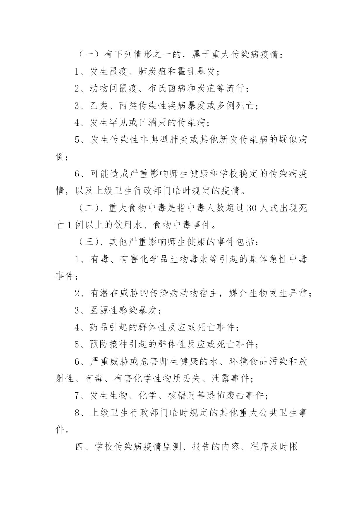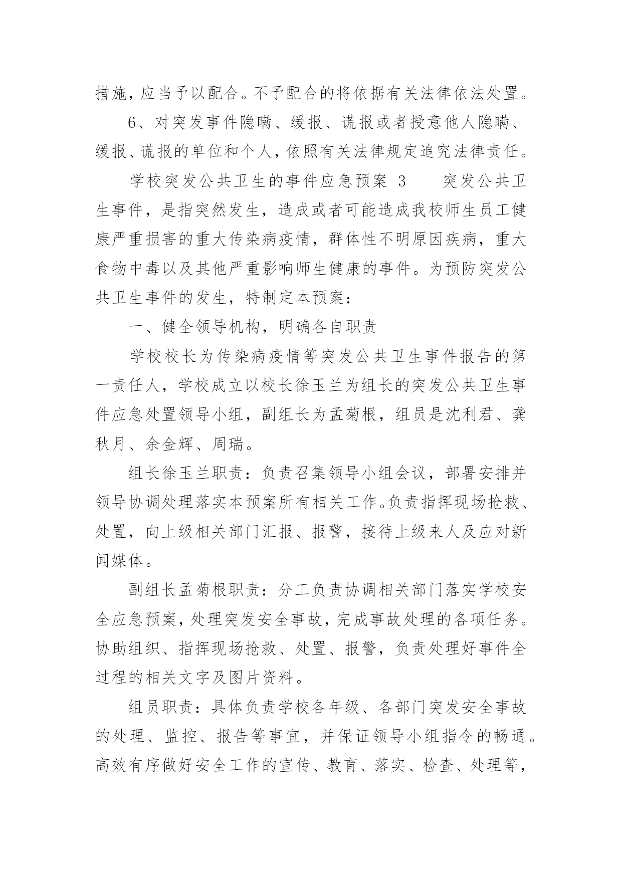 学校突发公共卫生的事件应急预案学校突发公共卫生的事件应急预案(通用12篇)在日常生活或是工作学习中,有时会突发一些难以预料的事件,为了降低事故造成的危害,可能需要提前进行应急预案编制工作。写应急预案需要注意哪些格式呢?下面是小编为大家收集的学校突发公共卫生的事件应急预案,希望对大家有所帮助。学校突发公共卫生的事件应急预案1为了预防和减少学生宿舍安全事故的发生,切实保障住宿学生的健康和安全,根据《中华人民共和国未成年人保护法》、教育部《学生伤害事故处理办法》,特制定学生宿舍安全事故应急处理预案。一、可能引发学生宿舍事故的原因学生宿舍的房屋、设备等维护、管理不当;生活设施、设备不符合国家和本市的安全标准;地面不防滑;电线电器设备老化和乱拉乱接电线电源插座,违章使用电炉等电器设备;未按规定配齐有效灭火器材,通道堆物,应急照明灯、紧急疏散指示牌缺少或不能正常使用;学生追逐、打闹玩耍;校外人员私自进入寝室、生活老师管理失职或不当以及学生自身疾病等情况是可能引发学生宿舍和住宿期间事故的主要原因。二、预防办法加强对生活老师责任制的落实和师生安全意识的'教育。1;对住宿学生进行行为规范和安全教育,做好逃生自救的演练,增强自我保护意识。2;健全宿舍管理制度,落实安全措施,责任到人。3;夜间要有专人值班巡视,并做好值班巡视记录。4;加强对宿舍房屋、设备以及生活设施设备的维护、管理、检查,发现隐患及时整改。5;配齐有效灭火器材,保持通道畅通,应急照明灯、紧急疏散指示牌要良好。6;电线拉接、电源插座位置、电器设备使用要规范。三、处理程序:一旦发生学生宿舍安全事故,应按下列程序处理1、以最快速度及时将受伤学生就近送往医院救治,并通知家长。2、报告。(1)学生应及时报告值班教师。(2)值班教师应及时向校领导报告。(3)校方马上报告教育局。可先口头后书面。(4)根据安全事故的性质及时向有关部门报告。3、火灾事故,按学校火灾事故应急处理预案开展相关工作。4、重大事故,按学校重大事故应急处理预案开展相关工作。5、发生人质事件,按学校防范暴力事件应急预案开展相关工作。学校突发公共卫生的事件应急预案2为有效预防和及时控制学校突发公共卫生事件(以下简称突发事件)造成的危害,消除各种隐患,维护正常的教育教学秩序和社会安定,保障广大师生员工的身体健康和生命安全,特制定本预案。一、指导思想认真贯彻落实《中华人民共和国传染病防治法》、国务院颁布的《突发公共卫生事件应急条例》、《河北省突发公共卫生事件应急实施办法》,将预防工作纳入科学化、规范化管理轨道。学校中发生突发公共卫生事件时,结合学校工作实际,建立快速反应机制,提高快速反应和应急处理能力,采取有效措施控制疫情在学校的发生和发展。二、原则统一指挥,分级负责,相互协同;预防为主,常抓不懈;反应迅速,措施果断。三、监测网络建立起学校、政务处(值班室)、年级组(班主任)三级突发事件防控监测网络和预警信息报告体系。华晶学校预防监测领导小组指挥长由校长任组长,主管教务工作的副校长任副指挥长,预防监测站设在校政务处(值班室)。学校按照县卫生行政主管部门要求,按属地管理原则建立健全突发事件预警监测机构。四、防控预警信息报告体系学校突发事件预警监测机构,发现或接到突发事件应急预案适用范围内各种情况报告后,年级组(班主任)必须在半小时内报到政务处(值班室),学校必须在1小时内向县疾控中心报告,同时向教育科技局报告。预警报告内容:1、初次报告:必须报告事件发生的时间、地点、名称、性质、可能原因、波及范围、发病人数及健康状态、潜在威胁和已采取的措施,同时报告报告单位和联系人及通讯方式。2、阶段报告:报告事件的发展与变化、处置进程、诱发事件的原因和可能因素;在阶段报告中既要报告新发生的情况,同时对初次报告的情况进行补充和修正。3、责任报告人应对上一级教育、卫生行政部门收到报告信息进行确认。五、突发事件预警分级根据《保定市突发公共卫生事件应急预案》的规定突发事件分为三级预警。六、防控措施根据预警级别的不同,采取相应措施。三级预警:1、防控领导小组进入工作,主管领导主持日常工作,并随时向领导班子汇报,进行必要的防护知识的宣传。2、学校实行部分门禁,进入校区实行验证制度。3、学校门口设立主要病症检测制度。4、加强环境卫生状况检查。5、进行防护水平升级的人力、物力准备。二级预警:1、学校开始实行门禁制度。2、住校学生一律不许出校门,走读学生进校门要进行主要病症检测。3、建立学生疫情监控制度,实行学生每日健康登记制度。4、教职工限制出入,严格控制与疫区之间的`人员流动。5、学校开始设置医学观察区,对外来人员进行一定时间的必要观察。6、每天定时在规定部位消毒。7、校领导带班,安排人员值班。8、应急机构工作人员进入准备状态,相关物资、设施到位。一级预警: