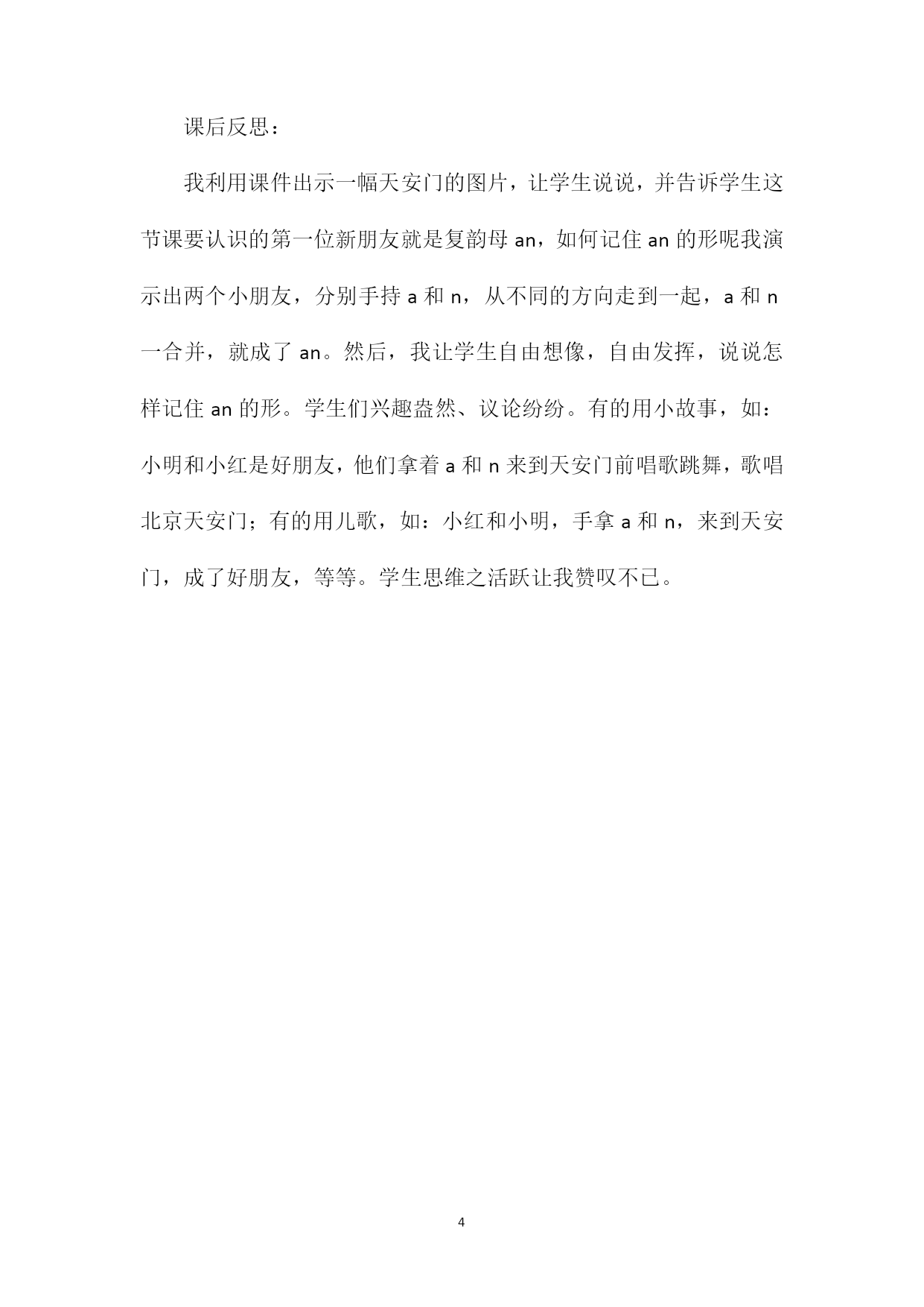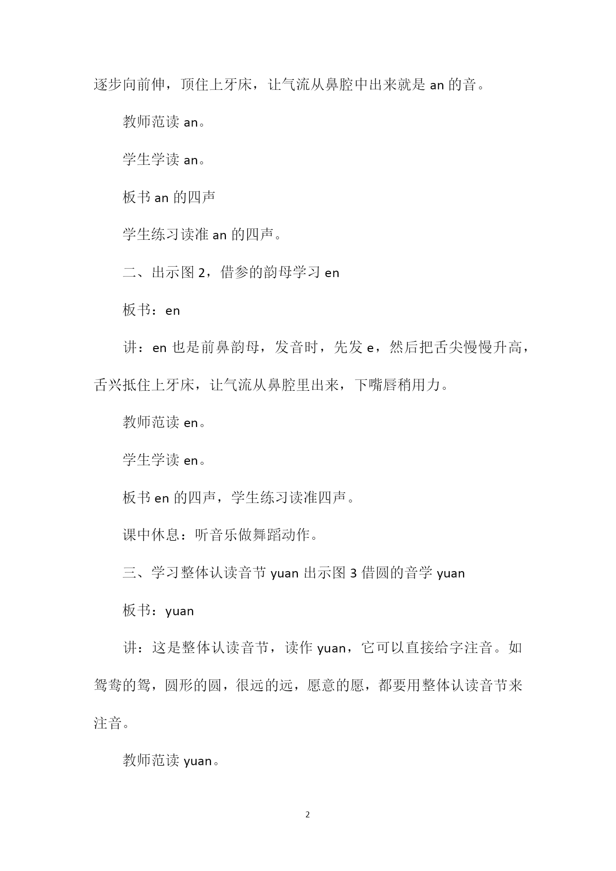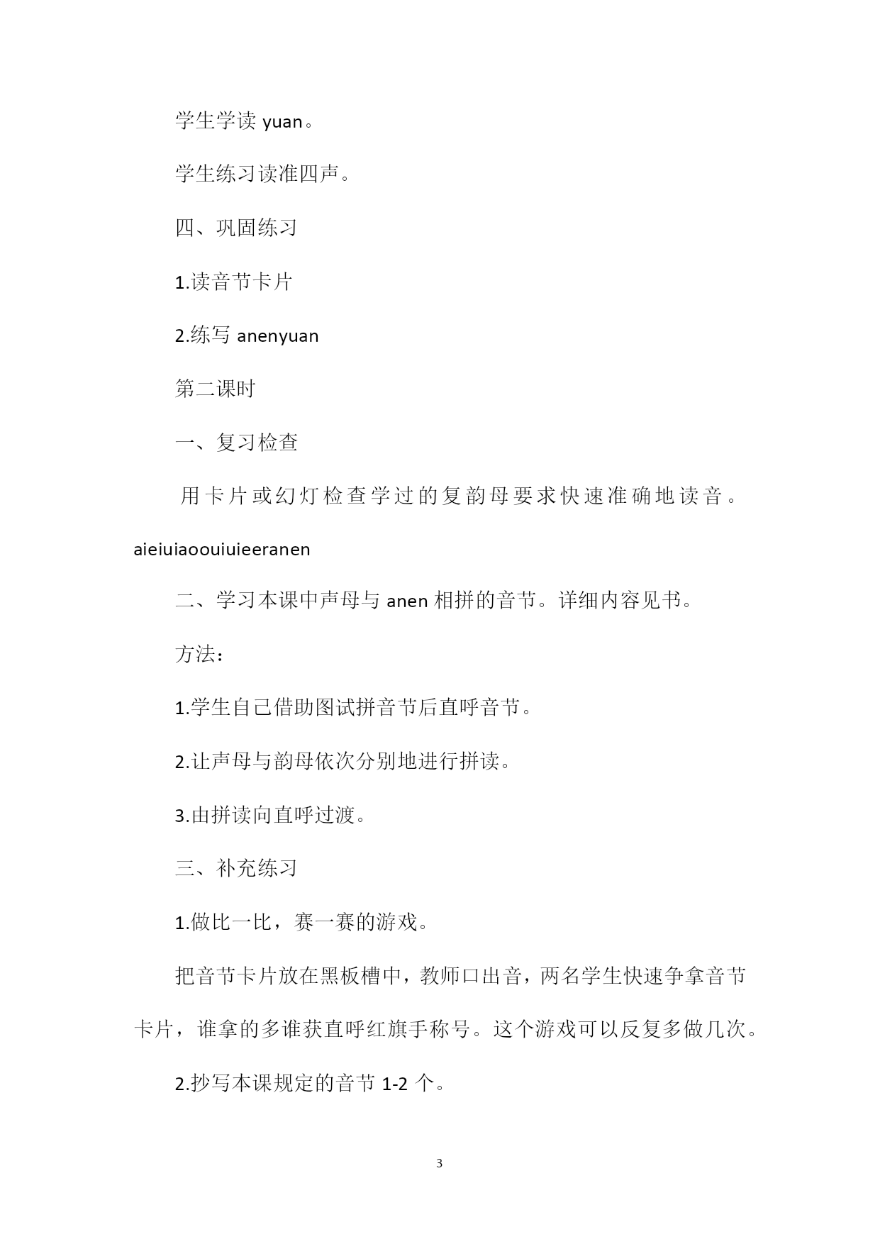 PAGEPAGE4《anenin》教学设计四教学目的1.学会前鼻韵母anen和整体认读音节yuan。掌握它们的音、形和四声。2.练习声母与anen相拼,训练直呼。3.能够正确地书写前鼻韵母anen和整体认读音节yuan。教学时间2课时教学重点掌握anen两个鼻韵母的音、形,掌握整体认读音节yuan的音形。教学难点掌握整体认读音节yuan的四声。教学准备本课用教学挂图和训练用音节卡片。教学过程第一课时一、出示挂图,借山的韵母学an板书:an讲:an是前鼻韵母,发音时把嘴张得大一些,先发a,然后舌尖逐步向前伸,顶住上牙床,让气流从鼻腔中出来就是an的音。教师范读an。学生学读an。板书an的四声学生练习读准an的四声。二、出示图2,借参的韵母学习en板书:en讲:en也是前鼻韵母,发音时,先发e,然后把舌尖慢慢升高,舌兴抵住上牙床,让气流从鼻腔里出来,下嘴唇稍用力。教师范读en。学生学读en。板书en的四声,学生练习读准四声。课中休息:听音乐做舞蹈动作。三、学习整体认读音节yuan出示图3借圆的音学yuan板书:yuan讲:这是整体认读音节,读作yuan,它可以直接给字注音。如鸳鸯的鸳,圆形的圆,很远的远,愿意的愿,都要用整体认读音节来注音。教师范读yuan。学生学读yuan。学生练习读准四声。四、巩固练习1.读音节卡片2.练写anenyuan第二课时一、复习检查用卡片或幻灯检查学过的复韵母要求快速准确地读音。aieiuiaoouiuieeranen二、学习本课中声母与anen相拼的音节。详细内容见书。方法:1.学生自己借助图试拼音节后直呼音节。2.让声母与韵母依次分别地进行拼读。3.由拼读向直呼过渡。三、补充练习1.做比一比,赛一赛的游戏。把音节卡片放在黑板槽中,教师口出音,两名学生快速争拿音节卡片,谁拿的多谁获直呼红旗手称号。这个游戏可以反复多做几次。2.抄写本课规定的音节1-2个。课后反思:我利用课件出示一幅天安门的图片,让学生说说,并告诉学生这节课要认识的第一位新朋友就是复韵母an,如何记住an的形呢我演示出两个小朋友,分别手持a和n,从不同的方向走到一起,a和n一合并,就成了an。然后,我让学生自由想像,自由发挥,说说怎样记住an的形。学生们兴趣盎然、议论纷纷。有的用小故事,如:小明和小红是好朋友,他们拿着a和n来到天安门前唱歌跳舞,歌唱北京天安门;有的用儿歌,如:小红和小明,手拿a和n,来到天安门,成了好朋友,等等。学生思维之活跃让我赞叹不已。