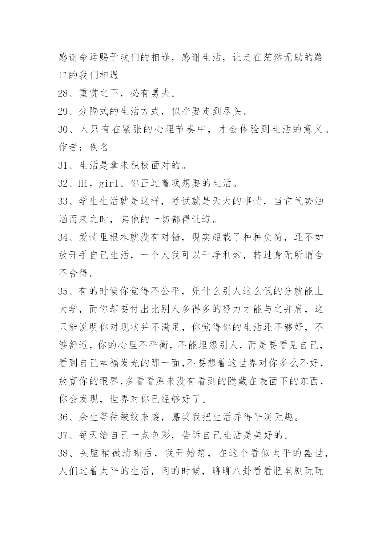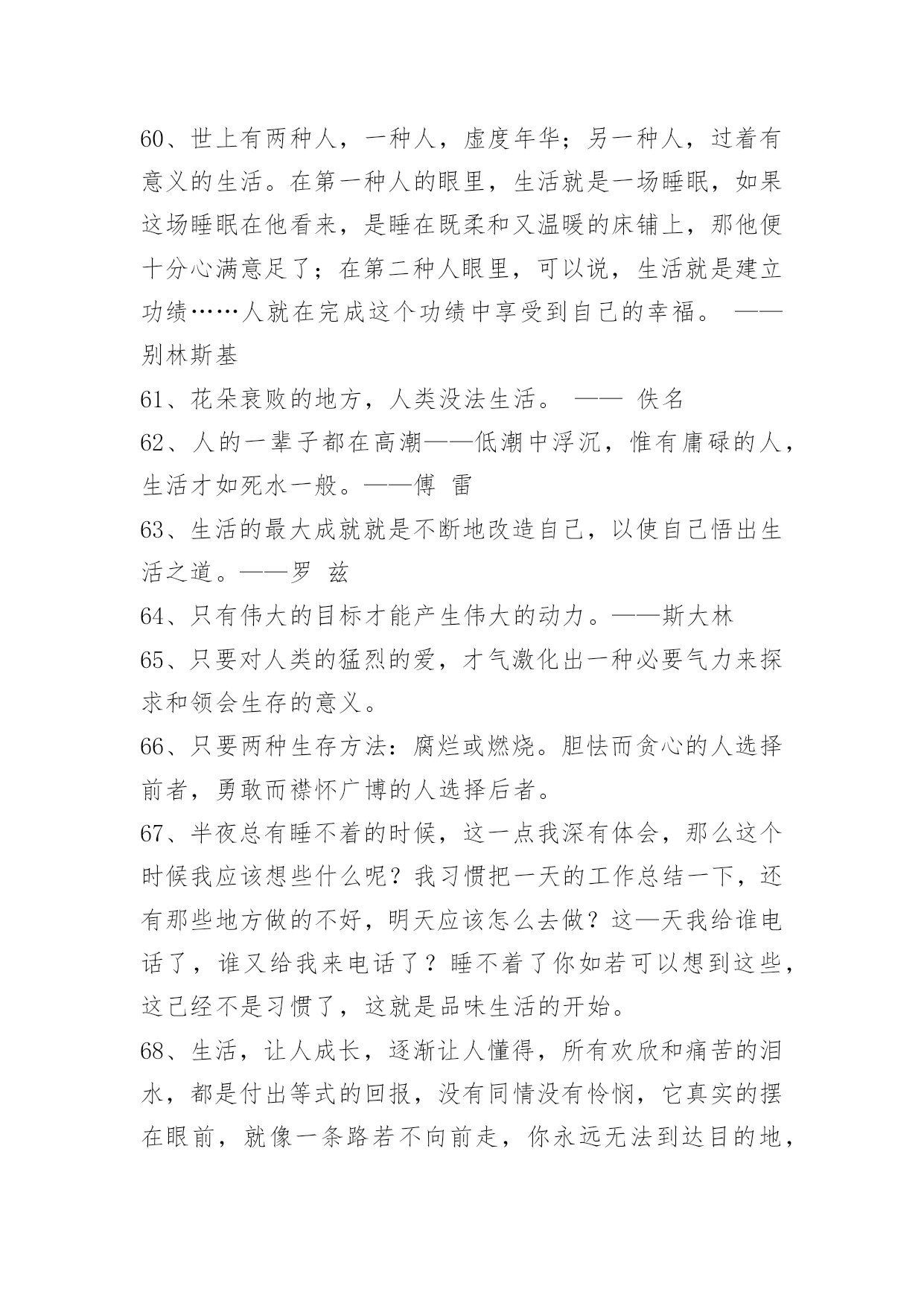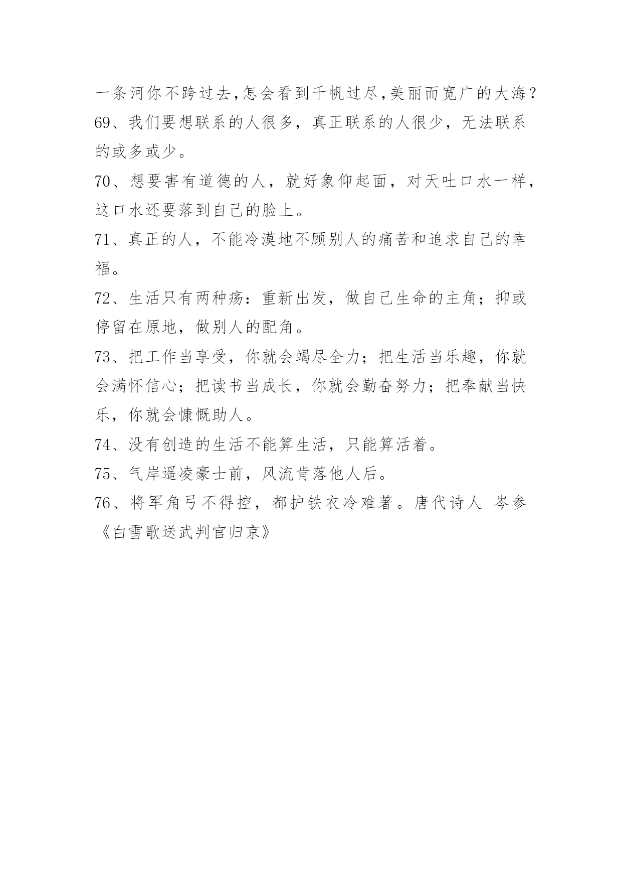 生活感悟格言生活感悟格言汇总76句节水要大器,节气要小气、节电要灵气、节能要人气。下面是小编搜索整理的生活感悟格言76句,供各位参考。1、如果你曾把失败当成清醒剂,就千万别让成功变成迷魂汤。在生活的旅途,最危险的不是悬崖峭壁,而是如花似锦的路旁风景。2、人脉宽,路子宽,事好办,必成功。3、我始终不愿抛弃我的奋斗生活,我极端重视奋斗得来的经验,尤其是战胜困难后所得到的愉快,一个人要先经过困难,然后踏进顺境,才觉得受用、舒适。4、即使是智者,也难摈弃追求功名这个弱点。——塔西佗5、无节制的生活在一瞬间往往会觉得有诗意,然而它给生命带来的却是疲萎和痛苦。生活只有赠予,才是舒心的享受,人生只有服务,才是踏实的生活。6、生活越紧张,越能显示人的生命力。——恩格斯7、大多数人的生活在幻想世界中。8、经历悲喜沧桑,看透了生死真相,仍热爱生活,用爱和温暖拥抱人生的人,值得我们尊敬。9、生活只有在平淡无味的人看来才是空虚而平淡无味的。——车尔尼雪夫斯基:《生活与美学》10、人们不能没有面包而生活;人们也不能没有祖国而生活。11、省事之本,在于节欲。——刘安12、在这个时代,要自始至终做一个善良正直的人很难,有太多的诱惑,太多似是而非的理由,让我们怀疑坚持心中的良善是否真有意义。然而不管怎样,还是要善良。至少善良使我们坚强,面对生活的挫折磨难,才不会轻易失掉内心的安宁。13、应该信赖自己的理智,从生活的合乎情理的现象出发。14、人只有按照自然所启录的经验来生活。——叔本华15、有一只兔子很懒,总是在自己的窝边吃草,最后被猎人逮住了。16、欢度生活中的每一天,让度假的心情充满你的心田,为什么不呢?朝着最美满的生活,朝着你的梦想迈进!17、生活不应该过于拘泥,过于刻板,我们的冲动在不给别人造成肯定的破坏或伤害的情况下,只要有可能就要任其自由发挥。——[英国]罗素18、生活的全部意义在于无穷地探索尚未知道的东西,在于不断地增加更多的知识。——[法国]左拉19、生活总的来说是完美的,不完美的是心态,不懂得欣赏的人,那么也就是会用挑剔去把一切变得有残缺。简单做人,率性而为,把握分寸,随遇而安,坦然接受现实;简单做事,不惹事,不生事,不怕事,不悔,不怨,不惜自己所做的事;简单生活,穷通得失自己的命运,担在人间碰到的一切。20、不要梦想生活总是那么圆圆满满,也不要梦想在生活的四季享用一切的春天,每个人的终身都必定要跋涉坎坎,品味苦涩与无法。人生最大的烦恼,不是选择,而是不知道自己想得到什么,不知道到了生命的终点,自己想有些什么人在身边。21、小时候努力的想长大,想要更多的自由;长大后拼命的拒绝长大,拒绝沉重的责任。22、似水流年,知己难得。庆幸有你的相陪,感谢你的相随,心灵的归宿里,我不会孤独。朋友,我期盼听到你的轻轻脚步声,期待与你一起感知生活,感知幸福,笑步人生。23、灰暗的天空,悲伤的情绪,哀叹的抱怨,都会在美好的回忆中烟消云散,你会在曾经的辉煌中找回自信,学会坚强,重新燃起希望之火;你将会勇敢地面对生活的跌宕起伏,重见艳阳与晴空。24、倘使生存欺骗了你,不要担心,也不要愤怒!不顺心的时候临时容忍:相信吧,欢乐的日子就会到来。——普希金《普希金抒情诗》25、当我以为自己对生活数年的地方很熟悉的时候,它却还能给我一抹惊艳。就如那条昏黄路灯下狭长的小路,幽静的蔓延着;微风习习中就自己独自一人独自行着,听着苏打绿的歌还时不时的仰望着泛着淡蓝色的天空,以及那轮皎月。瞬间就觉得一切陌生了,一切疏远了,也许这让你孤单着了,但在以后你会欣慰的享受自由!26、人有善念天必佑之,忠厚之人必多福报。27、不管发生什么,都不要放弃,坚持走下去,肯定会有意想不到的风景。在对的地方,遇到对的人,那是真正的幸福。所以,每一个风起的子,我们都会格外地充满了感恩的心,感谢命运赐予我们的相逢,感谢生活,让走在茫然无助的路口的我们相遇28、重赏之下,必有勇夫。29、分隔式的生活方式,似乎要走到尽头。30、人只有在紧张的心理节奏中,才会体验到生活的意义。作者:佚名31、生活是拿来积极面对的。32、Hi,girl。你正过着我想要的生活。33、学生生活就是这样,考试就是天大的事情,当它气势汹汹而来之时,其他的一切都得让道。34、爱情里根本就没有对错,现实超载了种种负荷,还不如放开手自己生活,一个人我可以干净利索,转过身无所谓舍不舍得。35、有的时候你觉得不公平,凭什么别人这么低的分就能上大学,而你却要付出比别人多得多的努力才能与之并肩,这只能说明你对现状并不满足,你觉得你的生活还不够好,不够舒适,你的心里不平衡,不能埋怨别人,而是要看见自己,看到自己幸福发光的那一面,不要想着这世界对你多么不好,放宽你的眼界,多看看原来没有看到的隐藏在表面下的东西,你会发现,世界对你已经够好了。36、余生等待