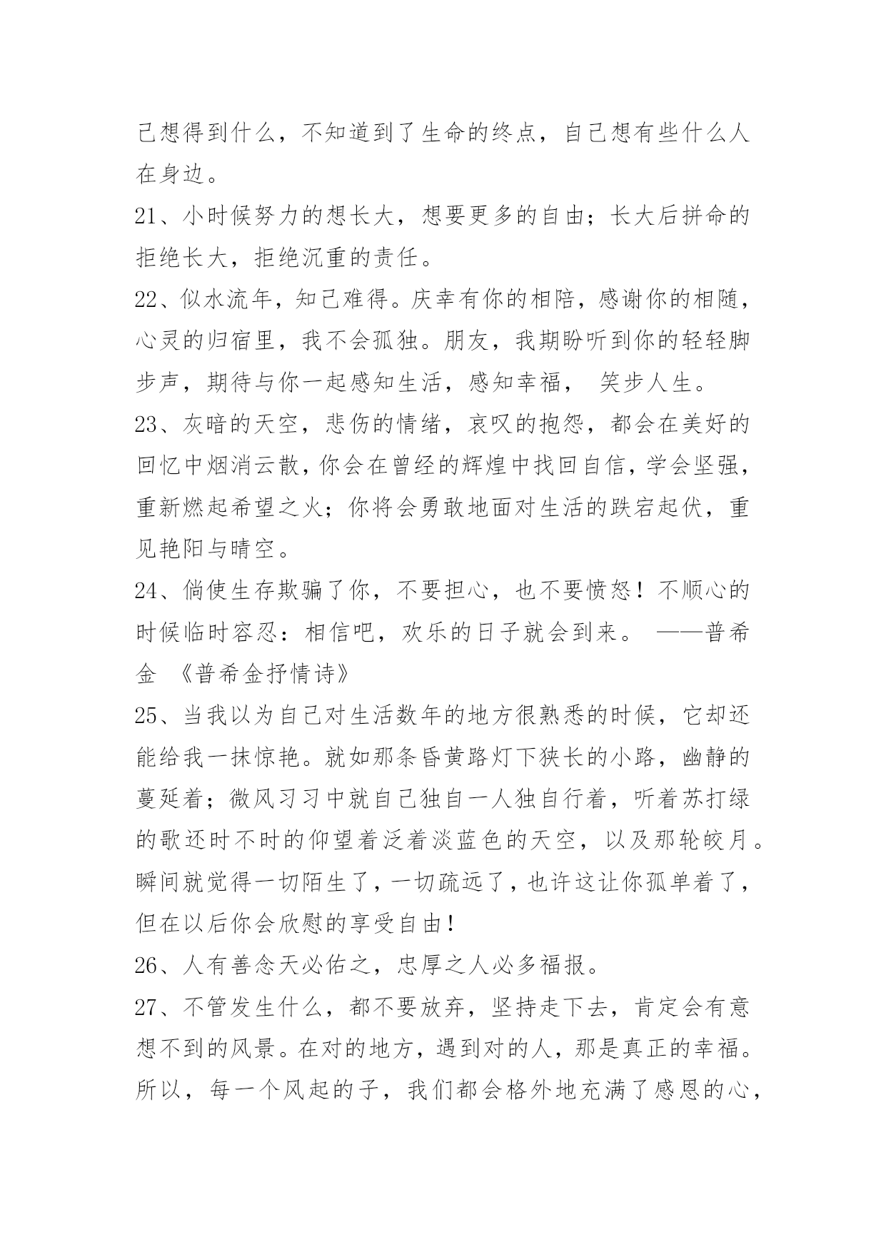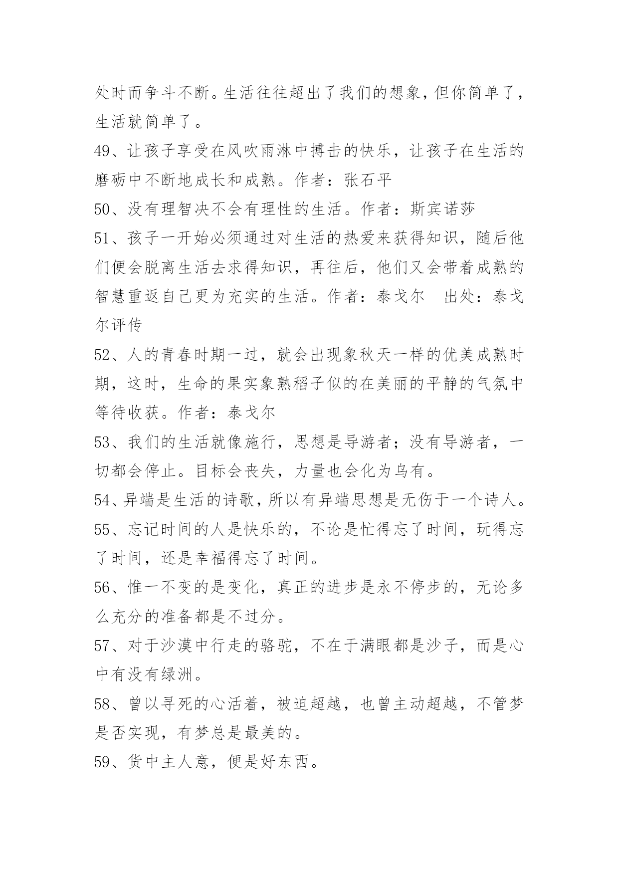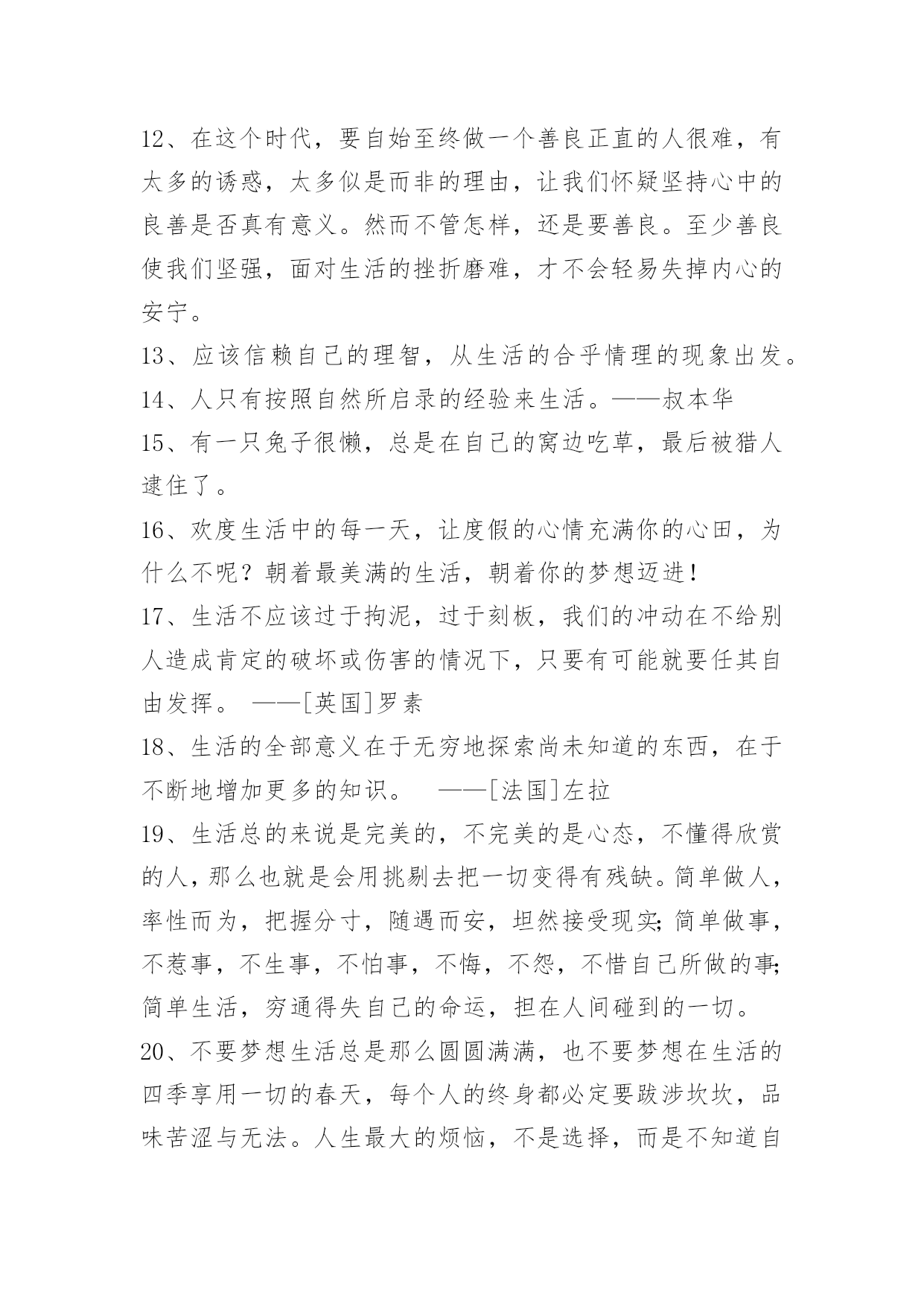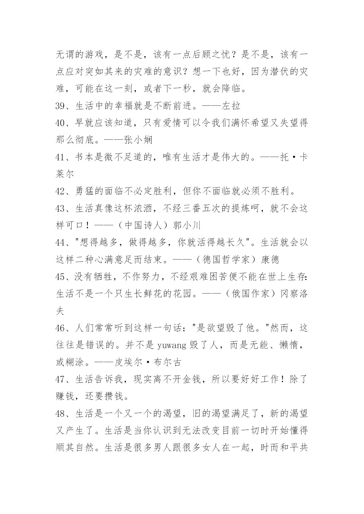 生活感悟格言生活感悟格言汇总76句节水要大器,节气要小气、节电要灵气、节能要人气。下面是小编搜索整理的生活感悟格言76句,供各位参考。1、如果你曾把失败当成清醒剂,就千万别让成功变成迷魂汤。在生活的旅途,最危险的不是悬崖峭壁,而是如花似锦的路旁风景。2、人脉宽,路子宽,事好办,必成功。3、我始终不愿抛弃我的奋斗生活,我极端重视奋斗得来的经验,尤其是战胜困难后所得到的愉快,一个人要先经过困难,然后踏进顺境,才觉得受用、舒适。4、即使是智者,也难摈弃追求功名这个弱点。——塔西佗5、无节制的生活在一瞬间往往会觉得有诗意,然而它给生命带来的却是疲萎和痛苦。生活只有赠予,才是舒心的享受,人生只有服务,才是踏实的生活。6、生活越紧张,越能显示人的生命力。——恩格斯7、大多数人的生活在幻想世界中。8、经历悲喜沧桑,看透了生死真相,仍热爱生活,用爱和温暖拥抱人生的人,值得我们尊敬。9、生活只有在平淡无味的人看来才是空虚而平淡无味的。——车尔尼雪夫斯基:《生活与美学》10、人们不能没有面包而生活;人们也不能没有祖国而生活。11、省事之本,在于节欲。——刘安12、在这个时代,要自始至终做一个善良正直的人很难,有太多的诱惑,太多似是而非的理由,让我们怀疑坚持心中的良善是否真有意义。然而不管怎样,还是要善良。至少善良使我们坚强,面对生活的挫折磨难,才不会轻易失掉内心的安宁。13、应该信赖自己的理智,从生活的合乎情理的现象出发。14、人只有按照自然所启录的经验来生活。——叔本华15、有一只兔子很懒,总是在自己的窝边吃草,最后被猎人逮住了。16、欢度生活中的每一天,让度假的心情充满你的心田,为什么不呢?朝着最美满的生活,朝着你的梦想迈进!17、生活不应该过于拘泥,过于刻板,我们的冲动在不给别人造成肯定的破坏或伤害的情况下,只要有可能就要任其自由发挥。——[英国]罗素18、生活的全部意义在于无穷地探索尚未知道的东西,在于不断地增加更多的知识。——[法国]左拉19、生活总的来说是完美的,不完美的是心态,不懂得欣赏的人,那么也就是会用挑剔去把一切变得有残缺。简单做人,率性而为,把握分寸,随遇而安,坦然接受现实;简单做事,不惹事,不生事,不怕事,不悔,不怨,不惜自己所做的事;简单生活,穷通得失自己的命运,担在人间碰到的一切。20、不要梦想生活总是那么圆圆满满,也不要梦想在生活的四季享用一切的春天,每个人的终身都必定要跋涉坎坎,品味苦涩与无法。人生最大的烦恼,不是选择,而是不知道自己想得到什么,不知道到了生命的终点,自己想有些什么人在身边。21、小时候努力的想长大,想要更多的自由;长大后拼命的拒绝长大,拒绝沉重的责任。22、似水流年,知己难得。庆幸有你的相陪,感谢你的相随,心灵的归宿里,我不会孤独。朋友,我期盼听到你的轻轻脚步声,期待与你一起感知生活,感知幸福,笑步人生。23、灰暗的天空,悲伤的情绪,哀叹的抱怨,都会在美好的回忆中烟消云散,你会在曾经的辉煌中找回自信,学会坚强,重新燃起希望之火;你将会勇敢地面对生活的跌宕起伏,重见艳阳与晴空。24、倘使生存欺骗了你,不要担心,也不要愤怒!不顺心的时候临时容忍:相信吧,欢乐的日子就会到来。——普希金《普希金抒情诗》25、当我以为自己对生活数年的地方很熟悉的时候,它却还能给我一抹惊艳。就如那条昏黄路灯下狭长的小路,幽静的蔓延着;微风习习中就自己独自一人独自行着,听着苏打绿的歌还时不时的仰望着泛着淡蓝色的天空,以及那轮皎月。瞬间就觉得一切陌生了,一切疏远了,也许这让你孤单着了,但在以后你会欣慰的享受自由!26、人有善念天必佑之,忠厚之人必多福报。27、不管发生什么,都不要放弃,坚持走下去,肯定会有意想不到的风景。在对的地方,遇到对的人,那是真正的幸福。所以,每一个风起的子,我们都会格外地充满了感恩的心,感谢命运赐予我们的相逢,感谢生活,让走在茫然无助的路口的我们相遇28、重赏之下,必有勇夫。29、分隔式的生活方式,似乎要走到尽头。30、人只有在紧张的心理节奏中,才会体验到生活的意义。作者:佚名31、生活是拿来积极面对的。32、Hi,girl。你正过着我想要的生活。33、学生生活就是这样,考试就是天大的事情,当它气势汹汹而来之时,其他的一切都得让道。34、爱情里根本就没有对错,现实超载了种种负荷,还不如放开手自己生活,一个人我可以干净利索,转过身无所谓舍不舍得。35、有的时候你觉得不公平,凭什么别人这么低的分就能上大学,而你却要付出比别人多得多的努力才能与之并肩,这只能说明你对现状并不满足,你觉得你的生活还不够好,不够舒适,你的心里不平衡,不能埋怨别人,而是要看见自己,看到自己幸福发光的那一面,不要想着这世界对你多么不好,放宽你的眼界,多看看原来没有看到的隐藏在表面下的东西,你会发现,世界对你已经够好了。36、余生等待
