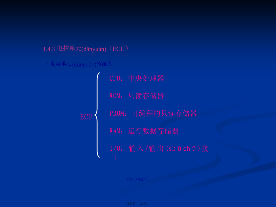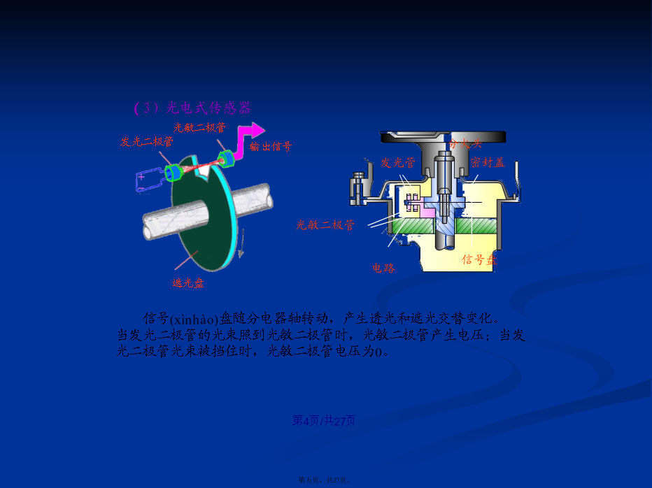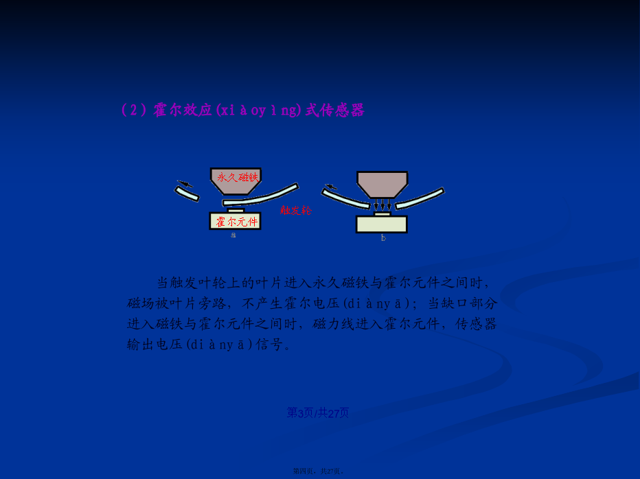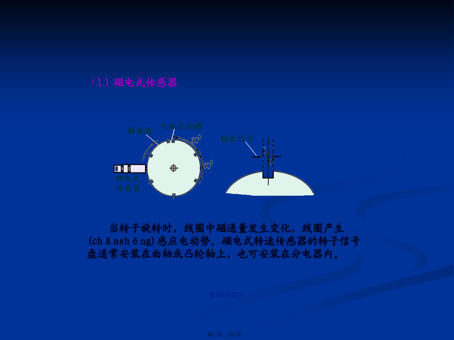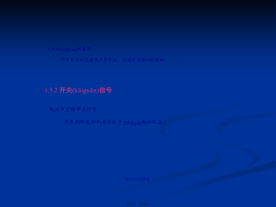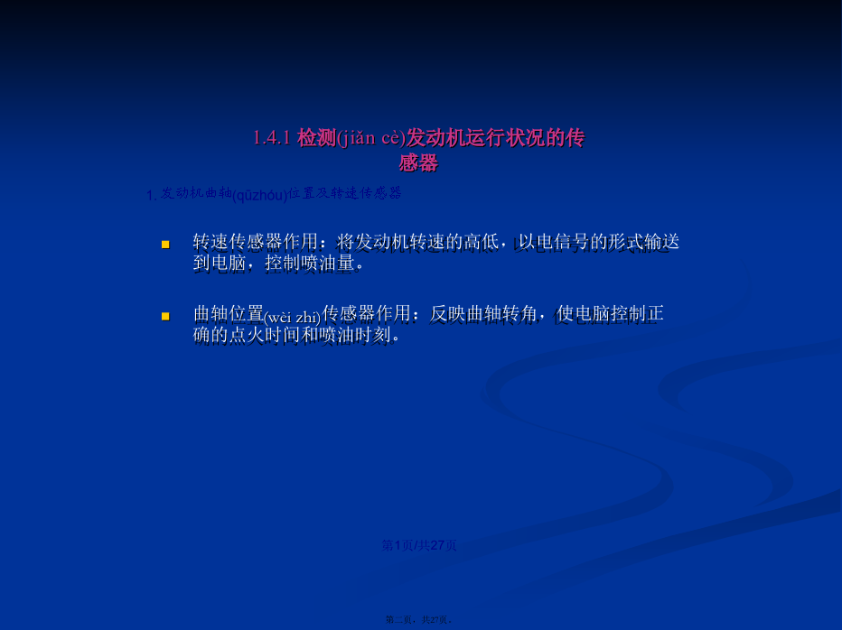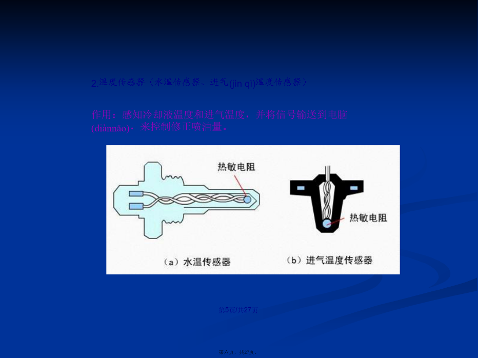 会计学1.4.1检测(jiǎncè)发动机运行状况的传感器(1)磁电式传感器(2)霍尔效应(xiàoyìng)式传感器信号(xìnhào)盘随分电器轴转动,产生透光和遮光交替变化。当发光二极管的光束照到光敏二极管时,光敏二极管产生电压;当发光二极管光束被挡住时,光敏二极管电压为0。2.温度传感器(水温传感器、进气(jìnqì)温度传感器)3.氧传感器1.车速(chēsù)传感器用于发动机怠速及汽车加速、减速时空燃比的控制。1.4.3电控单元(dānyuán)(ECU)2.汽油喷射(pēnshè)的控制电控喷射(pēnshè)工作演示喷油时刻(shíkè)的控制进气进气同时喷射喷油持续时间的控制(kòngzhì)(4)对于速度密度方式的电子控制(kòngzhì)燃油喷射系统:1.5智能电子(diànzǐ)节气门控制系统(ETCS-i)1.避免了钢丝拉索与其导管间的润滑油质一旦耗尽,会犯卡失去回位能力2.避免了发动机与车身的弹性连接一旦元件损坏,会造成相对位置发生变化,会影响加速踏板“全程控制”能力。3.采用智能电子节气门控制系统,可简化各控制系统的整体结构。4.提高了发动机的经济性(油耗降低了)和净化性(排放(páifànɡ)污染减小了)及适应性(对道路状况)1.5.2智能电子节气门系统的组成(zǔchénɡ)和工作原理线性霍尔元件(yuánjiàn)型2.电子(diànzǐ)节气门总成1.6汽油机缸内直喷系统(xìtǒng)1.6.2缸内直喷汽油机燃烧(ránshāo)模式结束(jiéshù)