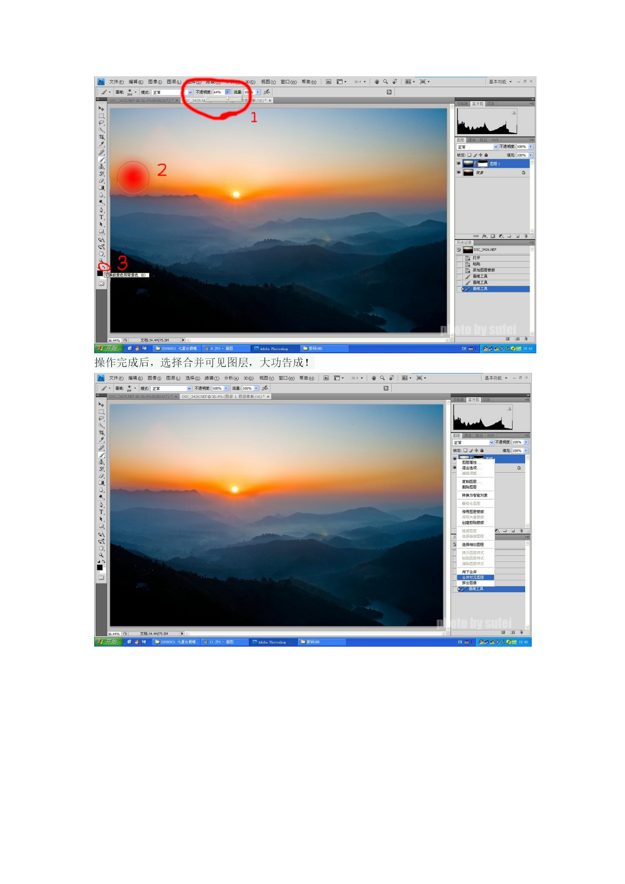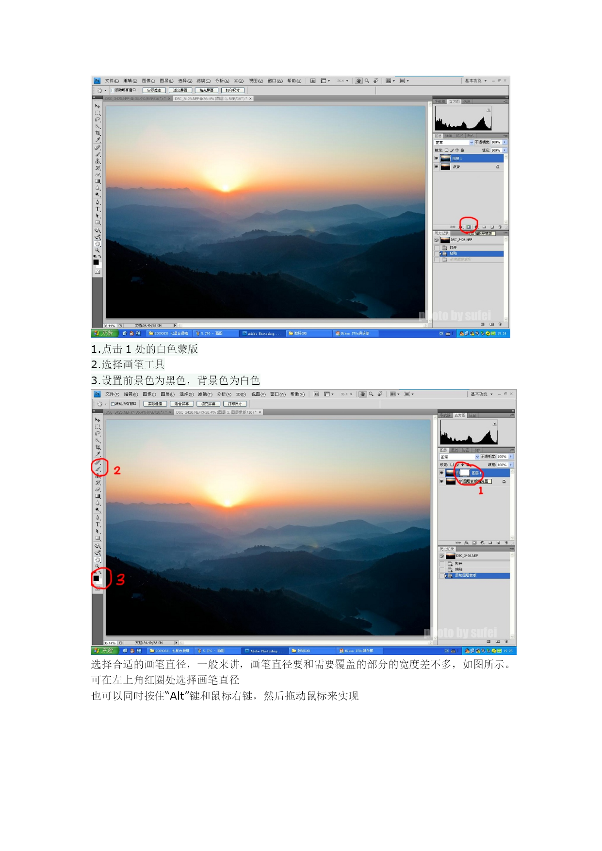 渐变镜可以用来平衡画面的光比,在风光摄影中有广泛的应用然而,好的渐变镜价格不菲,廉价的渐变镜又会对成像有不好的影响数码时代,遇到大光比情况时,我们可以采用包围曝光平拍摄,然后再后期中使用HDR或者数码GND的手法来获得合适的光比。本帖介绍数码GND的操作方法1、对前景测光,拍得p1,p1中地面景物曝光正常,天空过曝2、对天空测光,得p2,此张照片天空曝光基本正常,而地面欠曝严重。在进行数码GND合成前,可先分别对两张照片的曝光进行调整,使p1的地面部分和p2的天空部分达到预期效果,但千万不可裁剪将P1复制图层,操作如图所示在p2中进行“粘贴”操作,将p1复制到p2此时p1降p2覆盖我们要做的就是遮挡住p1的过曝天空部分,而将p2的曝光合适的天空部分露出来如图所示,点击“添加图层蒙版”图标,为p1生成一个蒙版1.点击1处的白色蒙版2.选择画笔工具3.设置前景色为黑色,背景色为白色选择合适的画笔直径,一般来讲,画笔直径要和需要覆盖的部分的宽度差不多,如图所示。可在左上角红圈处选择画笔直径也可以同时按住“Alt”键和鼠标右键,然后拖动鼠标来实现画笔划过天空部分后,p2的天空部分就露了出来注意看图层窗口处,蒙版缩略图的上半部分变黑了,对应我们的操作1-可以选择画笔不透明度,如图红圈1处,不透明度64%,也就是画笔划过的地方,露出p2的64%的浓度,而留下36%的p1的浓度。2-选择合适的画笔大小,仔细涂抹边缘交界处3-切换前景色和背景色。当画笔为白色时,效果与黑色正相反,画笔划过的地方露出p1,遮住p2.此操作可以用来修复不小心被误涂抹的地方,配合不透明度使用,仔细操作实现自然的渐变效果。操作完成后,选择合并可见图层,大功告成!