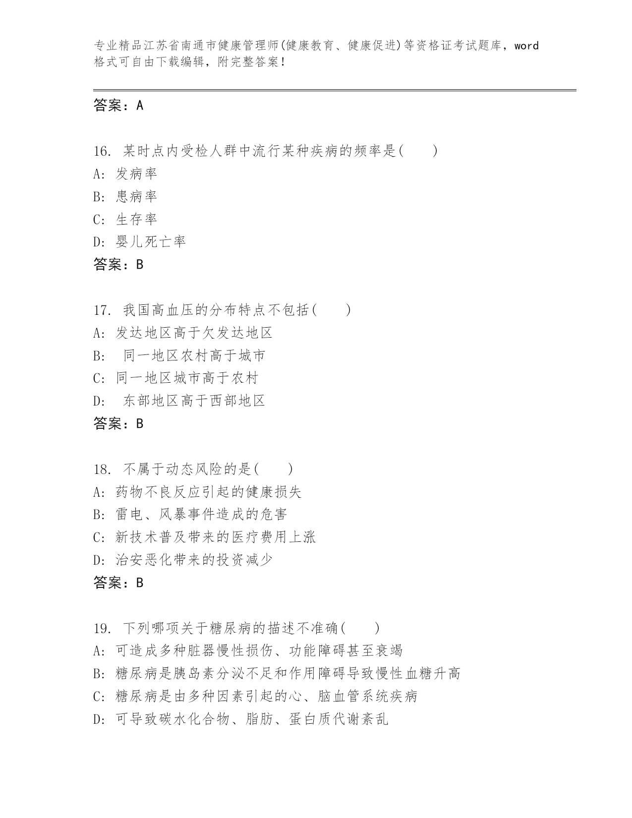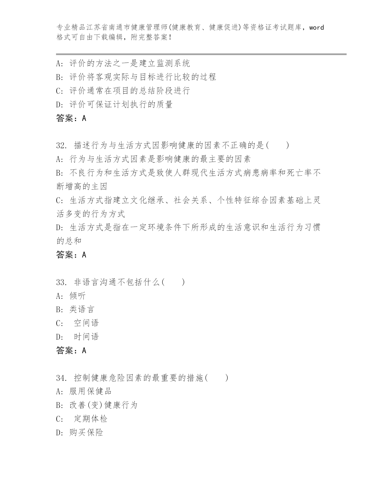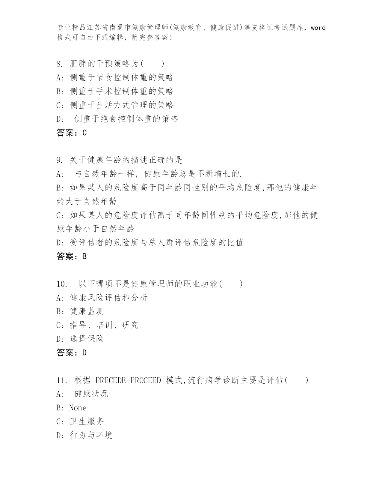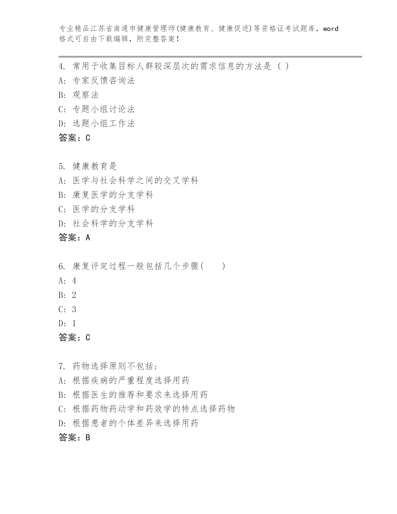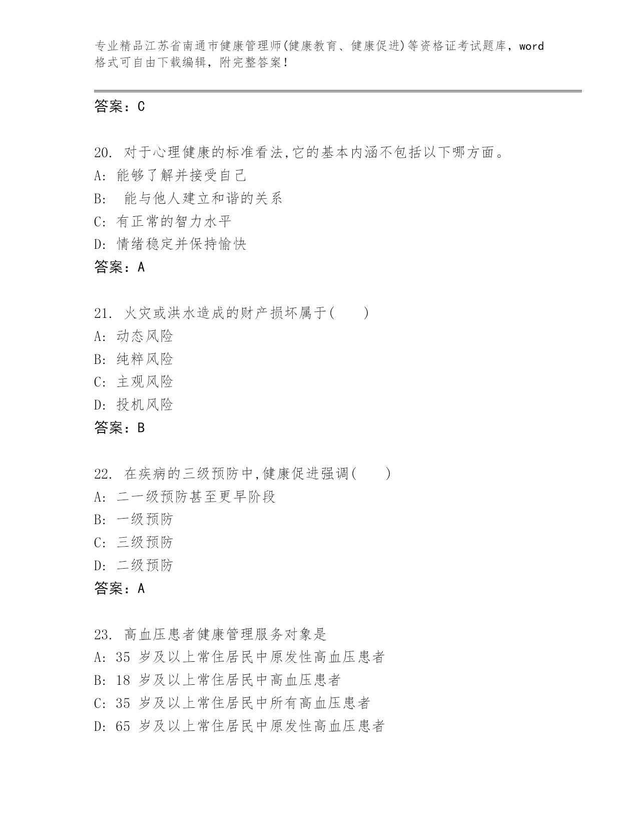 江苏省南通市健康管理师(健康教育、健康促进)等资格证考试通用题库附答案【实用】.docx
