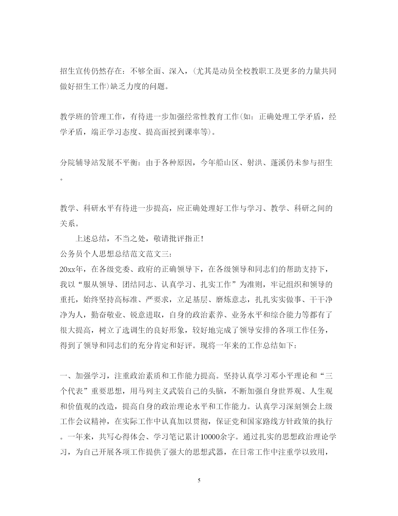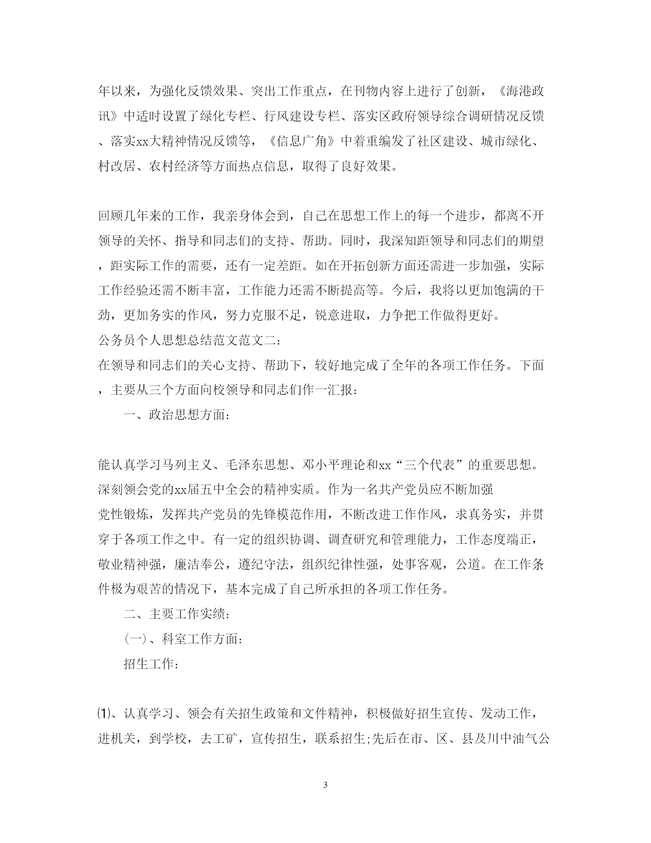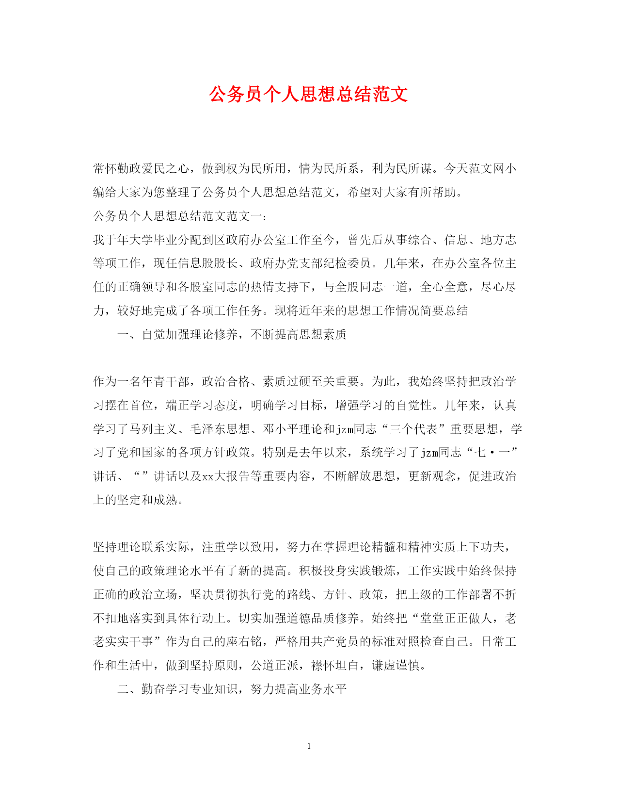 此资料由网络收集而来,如有侵权请告知上传者立即删除。资料共分享,我们负责传递知识。PAGEPAGE7公务员个人思想总结范文常怀勤政爱民之心,做到权为民所用,情为民所系,利为民所谋。今天范文网小编给大家为您整理了公务员个人思想总结范文,希望对大家有所帮助。公务员个人思想总结范文范文一:我于年大学毕业分配到区政府办公室工作至今,曾先后从事综合、信息、地方志等项工作,现任信息股股长、政府办党支部纪检委员。几年来,在办公室各位主任的正确领导和各股室同志的热情支持下,与全股同志一道,全心全意,尽心尽力,较好地完成了各项工作任务。现将近年来的思想工作情况简要总结一、自觉加强理论修养,不断提高思想素质作为一名年青干部,政治合格、素质过硬至关重要。为此,我始终坚持把政治学习摆在首位,端正学习态度,明确学习目标,增强学习的自觉性。几年来,认真学习了马列主义、毛泽东思想、邓小平理论和jzm同志“三个代表”重要思想,学习了党和国家的各项方针政策。特别是去年以来,系统学习了jzm同志“七·一”讲话、“”讲话以及xx大报告等重要内容,不断解放思想,更新观念,促进政治上的坚定和成熟。坚持理论联系实际,注重学以致用,努力在掌握理论精髓和精神实质上下功夫,使自己的政策理论水平有了新的提高。积极投身实践锻炼,工作实践中始终保持正确的政治立场,坚决贯彻执行党的路线、方针、政策,把上级的工作部署不折不扣地落实到具体行动上。切实加强道德品质修养。始终把“堂堂正正做人,老老实实干事”作为自己的座右铭,严格用共产党员的标准对照检查自己。日常工作和生活中,做到坚持原则,公道正派,襟怀坦白,谦虚谨慎。二、勤奋学习专业知识,努力提高业务水平办公室工作涉及面广,政策性强。为了更好地适应工作需要,自己始终注重加强业务学习,拓宽知识领域,优化知识结构,提高业务素质。在工作中,我积极向领导和周围同志们学习,学习做事、处事之道,取人之长,补已之短。工作之余,把学习作为自觉行动,坚持向书本上学,特别是学习了政务信息、新闻宣传、计算机基础等方面知识,努力从书中汲取营养,丰富头脑。在平时,注重向实践中学,通过多下基层,看实情,查实事,立足实际,锻炼分析问题、处理问题的能力。××年以来,我先后参加了省政府政务信息直报点培训班、全市政府系统网络知识培训班、全区中青年后备干部培训班、宣传干部培训班等培训,系统学习了相关业务知识,有效优化了自己的知识结构。此外,参加工作后,我还参加了自学考试法律本科的学习,目前顺利通过了科考试。在工作学习中,我十分注意听取领导和周围同志们的意见,对照自己,及时改进工作方法;能够分阶段对自己的工作学习进行总结自查,查缺补漏,总结经验,接受教训,提高工作水平。通过不断的学习磨练,自己在业务素质方面有了较大提高。一是增强了文字表达能力。几年来共撰写各类文稿近百篇,负责《海港政讯》、《工作简报》、《信息广角》等内部刊物的编辑工作,共出刊数近期,上报省、市信息、简报数百篇。积极拓宽工作思路,在继续做好信息上报下发的基础上,逐步把全股工作重心转移到扩大宣传面上,加大了在新闻媒体上宣传×××力度。目前已向各类报刊媒体投稿余篇,其中“秦市×××建设新型社区”在《河北经济日报》版刊发,“×××切实转变会风”被《秦皇岛日报》采用,“×××四村率先村改居”、“×××消费品总额稳步攀升”等篇被《秦皇岛晚报》采用。二是增强了组织协调能力。工作中,能够围绕办公室中心任务,协调各方面关系,保证了与省、市信息部门以及基层各信息网络单位良好的工作联系,较好地发挥了承上启下、协调内外的作用。三是增强了开拓创新能力。××年,与其他同志一道创刊了《信息广角》,把外地先进经验做法摘录刊出,为全区各级领导决策提供了参考。××年,对《海港政讯》、《工作简报》和《信息广角》进行了改版,版面设计美观大方,内容编排新颖合理,整体质量明显提高。××年以来,为强化反馈效果、突出工作重点,在刊物内容上进行了创新,《海港政讯》中适时设置了绿化专栏、行风建设专栏、落实区政府领导综合调研情况反馈、落实xx大精神情况反馈等,《信息广角》中着重编发了社区建设、城市绿化、村改居、农村经济等方面热点信息,取得了良好效果。回顾几年来的工作,我亲身体会到,自己在思想工作上的每一个进步,都离不开领导的关怀、指导和同志们的支持、帮助。同时,我深知距领导和同志们的期望,距实际工作的需要,还有一定差距。如在开拓创新方面还需进一步加强,实际工作经验还需不断丰富,工作能力还需不断提高等。今后,我将以更加饱满的干劲,更加务实的作风,努力克服不足,锐意进取,力争把工作做得更好。公务员个人思想总结范文范文二:在领导和同志们的关心支持、帮助下,较好地完成了全年的各项工作任务。下面,主要从三个方面向校领导和同志们作一汇