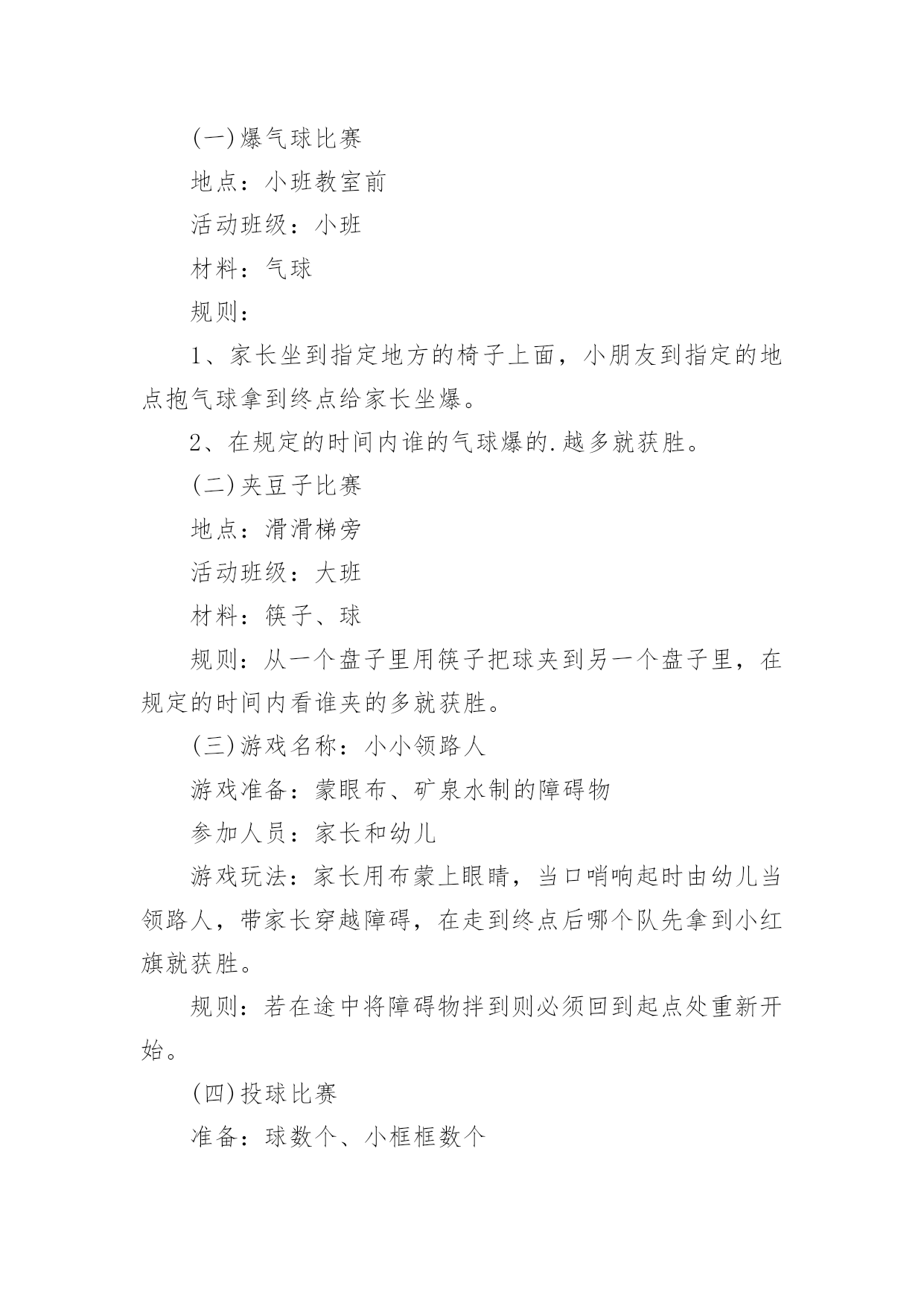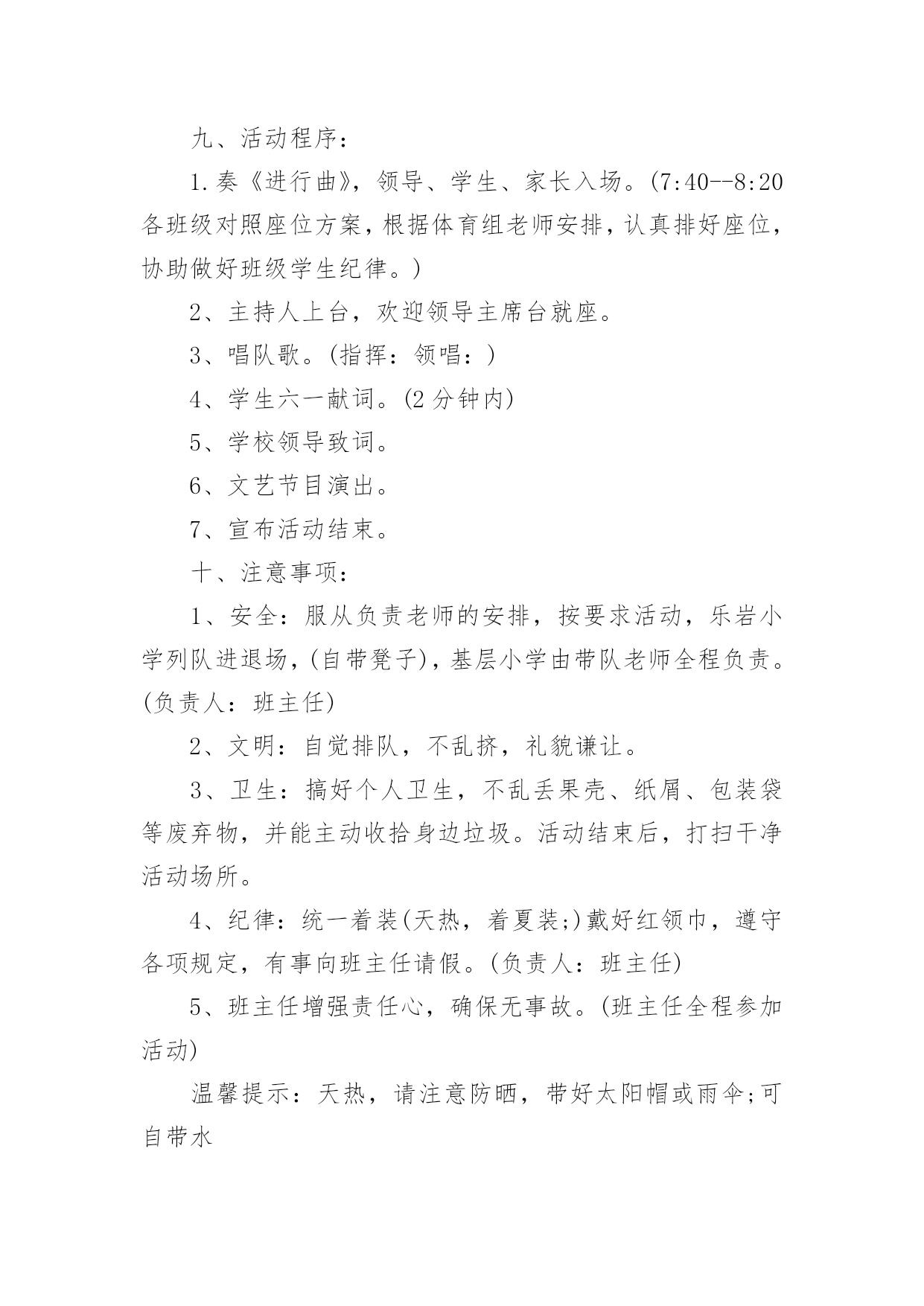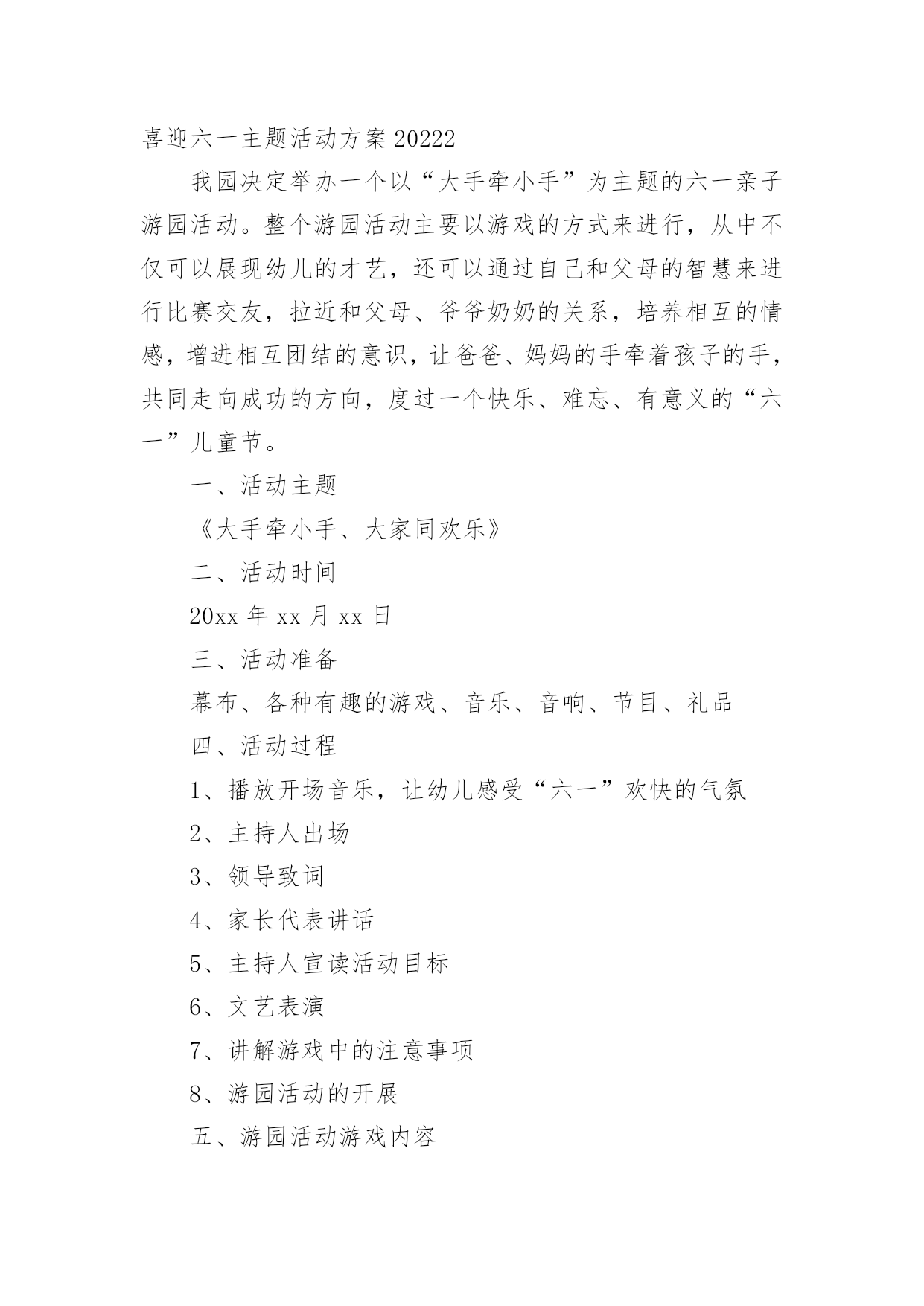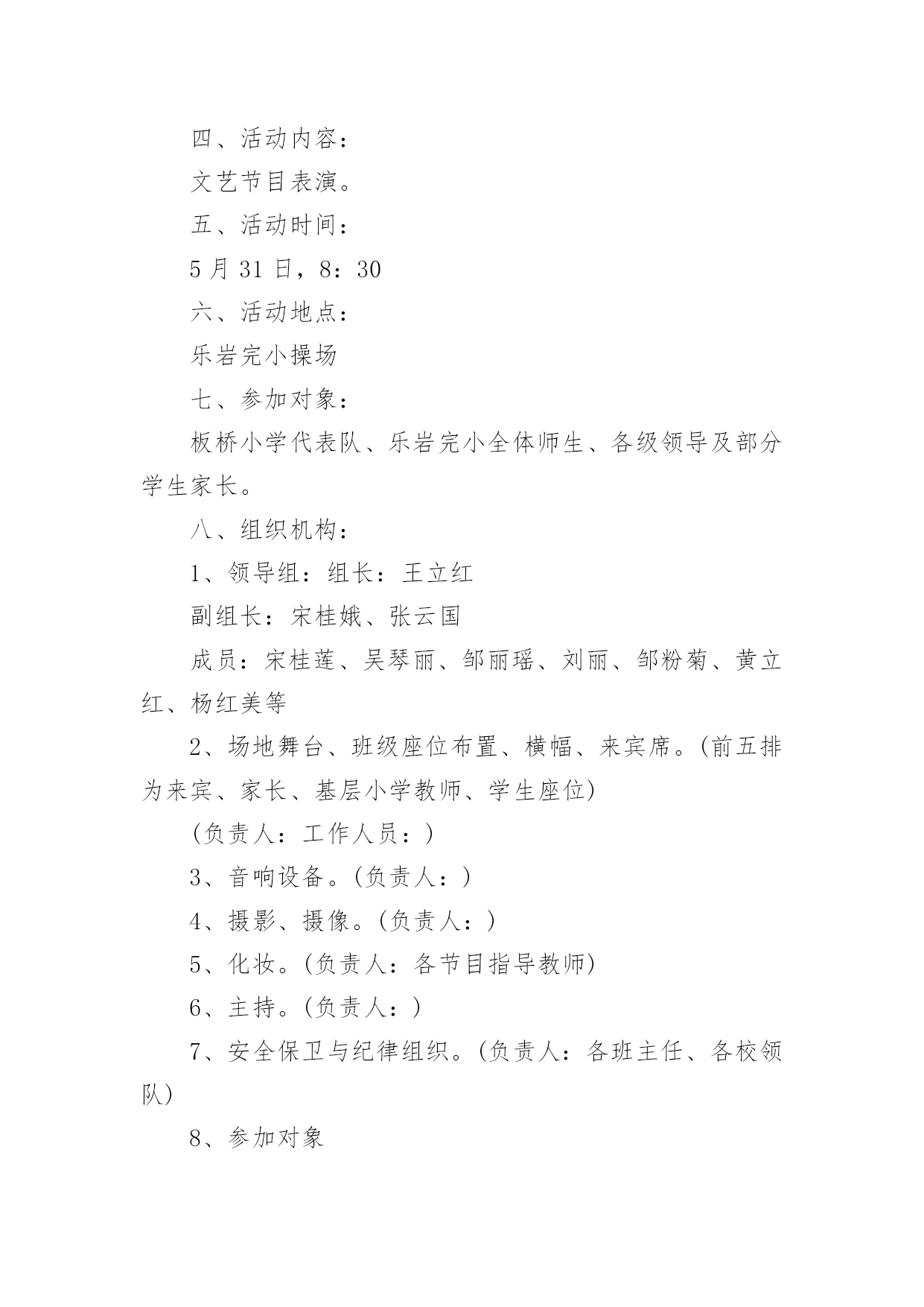 喜迎六一主题活动方案喜迎六一主题活动方案2022为确保事情或工作高质量高水平开展,常常要根据具体情况预先制定方案,方案属于计划类文书的一种。那么你有了解过方案吗?以下是小编为大家收集的喜迎六一主题活动方案2022,欢迎阅读,希望大家能够喜欢。喜迎六一主题活动方案20221一、指导思想:体现学生的主人翁精神,让全体学生参与,并且认识到自身的价值,增强集体自豪感。同时,让学生都能够感受到社会、学校的关心,使学生真切地感觉到“六一”是自己的节日,是每个少年儿童的'节日。营造一个快乐的氛围和情景,激发学生热爱生活、热爱校园、热爱祖国的情感,展示我镇少年儿童的风采,欢度一个有意义、有趣味的“六一”儿童节。二、活动主题:庆祝“六一”儿童节文艺演出暨捐助特困生活动。三、活动目的:邀请镇、镇、村委会等领导,欢迎学生家长前来观看,使学校和社会、家庭有一个相互交流的机会,充分展示我镇小学生风彩,使他们能发挥自己的特长,过一个有意义的、快乐的儿童节。四、活动内容:文艺节目表演。五、活动时间:5月31日,8:30六、活动地点:乐岩完小操场七、参加对象:板桥小学代表队、乐岩完小全体师生、各级领导及部分学生家长。八、组织机构:1、领导组:组长:王立红副组长:宋桂娥、张云国成员:宋桂莲、吴琴丽、邹丽瑶、刘丽、邹粉菊、黄立红、杨红美等2、场地舞台、班级座位布置、横幅、来宾席。(前五排为来宾、家长、基层小学教师、学生座位)(负责人:工作人员:)3、音响设备。(负责人:)4、摄影、摄像。(负责人:)5、化妆。(负责人:各节目指导教师)6、主持。(负责人:)7、安全保卫与纪律组织。(负责人:各班主任、各校领队)8、参加对象九、活动程序:1.奏《进行曲》,领导、学生、家长入场。(7:40--8:20各班级对照座位方案,根据体育组老师安排,认真排好座位,协助做好班级学生纪律。)2、主持人上台,欢迎领导主席台就座。3、唱队歌。(指挥:领唱:)4、学生六一献词。(2分钟内)5、学校领导致词。6、文艺节目演出。7、宣布活动结束。十、注意事项:1、安全:服从负责老师的安排,按要求活动,乐岩小学列队进退场,(自带凳子),基层小学由带队老师全程负责。(负责人:班主任)2、文明:自觉排队,不乱挤,礼貌谦让。3、卫生:搞好个人卫生,不乱丢果壳、纸屑、包装袋等废弃物,并能主动收拾身边垃圾。活动结束后,打扫干净活动场所。4、纪律:统一着装(天热,着夏装;)戴好红领巾,遵守各项规定,有事向班主任请假。(负责人:班主任)5、班主任增强责任心,确保无事故。(班主任全程参加活动)温馨提示:天热,请注意防晒,带好太阳帽或雨伞;可自带水喜迎六一主题活动方案20222我园决定举办一个以“大手牵小手”为主题的六一亲子游园活动。整个游园活动主要以游戏的方式来进行,从中不仅可以展现幼儿的才艺,还可以通过自己和父母的智慧来进行比赛交友,拉近和父母、爷爷奶奶的关系,培养相互的情感,增进相互团结的意识,让爸爸、妈妈的手牵着孩子的手,共同走向成功的方向,度过一个快乐、难忘、有意义的“六一”儿童节。一、活动主题《大手牵小手、大家同欢乐》二、活动时间20xx年xx月xx日三、活动准备幕布、各种有趣的游戏、音乐、音响、节目、礼品四、活动过程1、播放开场音乐,让幼儿感受“六一”欢快的气氛2、主持人出场3、领导致词4、家长代表讲话5、主持人宣读活动目标6、文艺表演7、讲解游戏中的注意事项8、游园活动的开展五、游园活动游戏内容(一)爆气球比赛地点:小班教室前活动班级:小班材料:气球规则:1、家长坐到指定地方的椅子上面,小朋友到指定的地点抱气球拿到终点给家长坐爆。2、在规定的时间内谁的气球爆的.越多就获胜。(二)夹豆子比赛地点:滑滑梯旁活动班级:大班材料:筷子、球规则:从一个盘子里用筷子把球夹到另一个盘子里,在规定的时间内看谁夹的多就获胜。(三)游戏名称:小小领路人游戏准备:蒙眼布、矿泉水制的障碍物参加人员:家长和幼儿游戏玩法:家长用布蒙上眼睛,当口哨响起时由幼儿当领路人,带家长穿越障碍,在走到终点后哪个队先拿到小红旗就获胜。规则:若在途中将障碍物拌到则必须回到起点处重新开始。(四)投球比赛准备:球数个、小框框数个参加人员:幼儿、家长(4个家庭一组)游戏玩法:幼儿站在起点处,家长站在终点处,当口哨响起时幼儿开始往家长手里的小框框投球,以进框的球数为准,限时2分钟,哪队进球最多获胜。游戏规则:比赛结果以框中的球数计算。