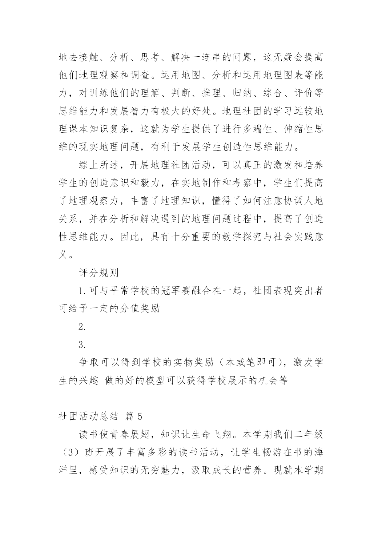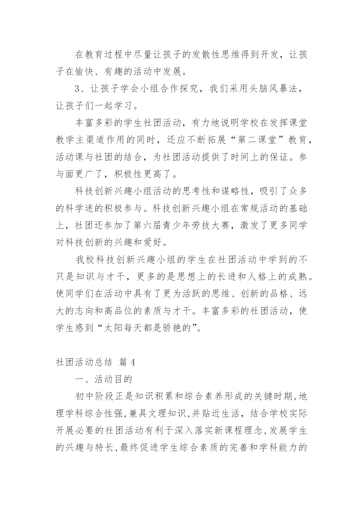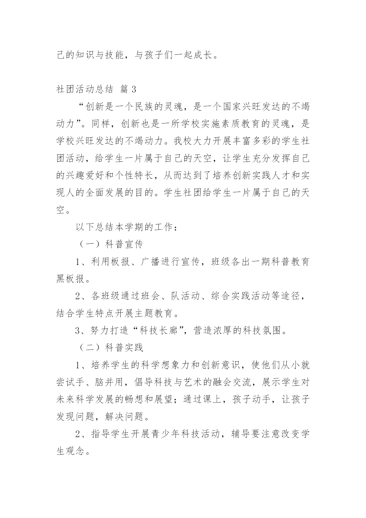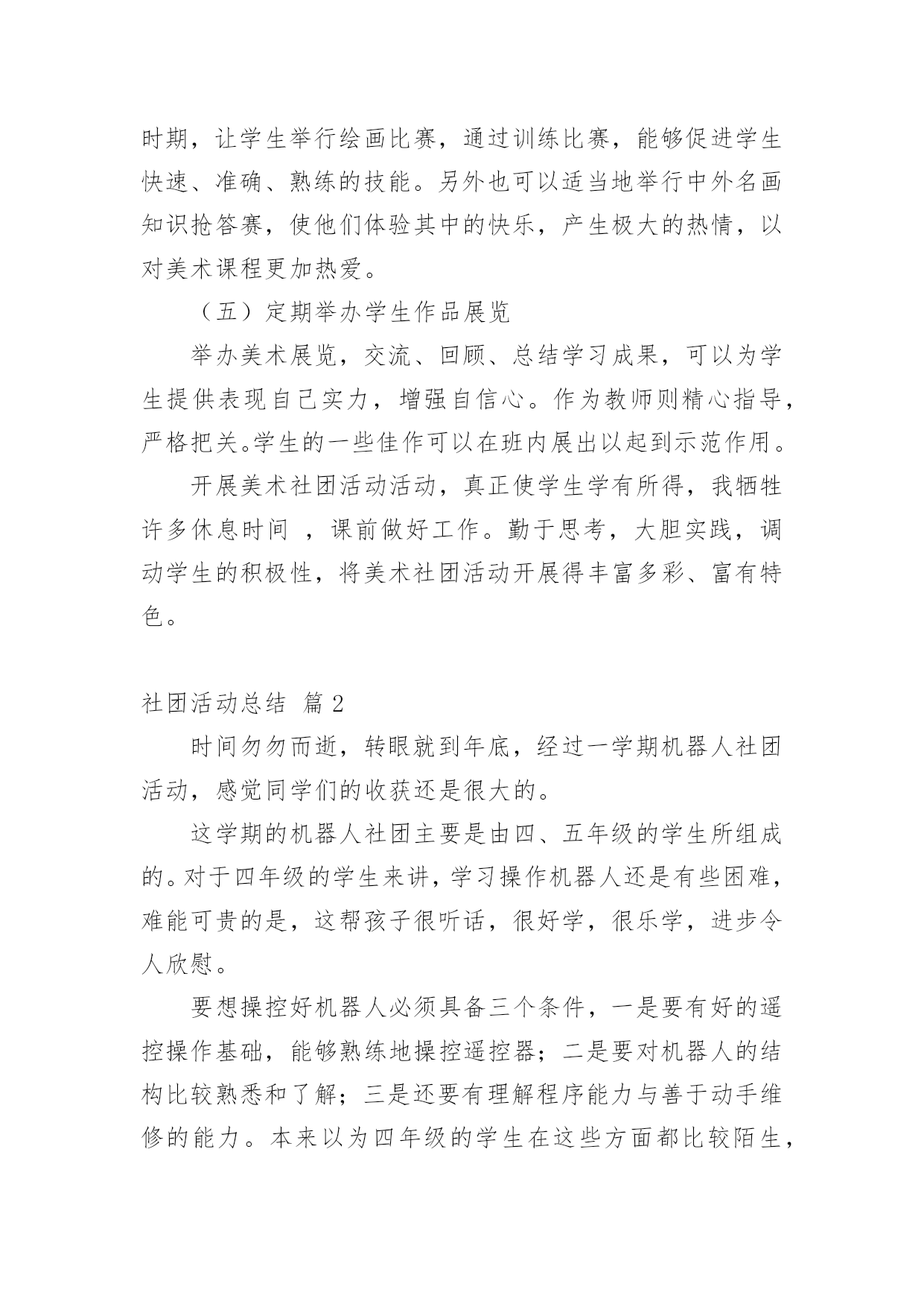 社团活动总结【精华】社团活动总结集锦9篇总结是把一定阶段内的有关情况分析研究,做出有指导性结论的书面材料,他能够提升我们的书面表达能力,让我们一起认真地写一份总结吧。那么总结应该包括什么内容呢?以下是小编帮大家整理的社团活动总结9篇,仅供参考,大家一起来看看吧。社团活动总结篇1活动目的:社团活动是对学生进行美育的重要途径,是课堂教学的补充和延伸,是义务教育艺术课程的重要组成部分,是培养学生美术特长的重要阵地。通过美术社团活动,使学生进行个性化、创造性的学习,使美术特长得到更好的发展,更多的了解美术知识,更好的培养学生的观察能力和创新思维能力,提高学生的审美观。这种活动多数孩子非常喜欢参加。活动时间:每星期二、下午5:05—5:35,学生必须准时到达美术教室。到冬季4:35—5:05。活动步骤:(一)健全美术社团美术社团活动的成员有30人,是二至五年级学生,每班有2人。参加社团活动的人员除了自愿学习以外,还有是美术方面比较有特长的学生。我的要求参与的学生必须遵守纪律,要有毅力,有决心,说真的,美术这门艺术是最最难难学习的;要学到家谈和易。我做到精心计划,精心备课,精心上课,认真教学绘画基础的实如;长方形、三角形、圆形等。(二)社团活动内容社团具体的活动内容为:美术教学;学习儿童画构图,造型、色彩运用等知识。中国画基础;素描入门教学,简笔画指导等。当学生表现技能达到一定水平时适当指导学生从事美术创作,可以以校园中的好人好事也可以以生活中丰富多彩的活动为主题,创作出内容积极向的作品。(三)开设美术知识欣赏课程随着社会的发展,客观事物的审美属性日益突出,缺乏审美能力和美术素养的现代人,将不可避免出现困惑和缺憾。优秀的美术作品对于学生在认识上、思想教育上、审美能力上都起着积极的作用。通过美术鉴赏和美术知识与技能技巧的教学,可以培养学生健康的审美观念和审美能力,陶冶情操,完善人格,把学生引向健康成长的道路。所以我在教学中选一健康而适合小学学生的美术作品欣赏。,加深学生对杰作的热爱,唤起了对美术的高涨热情,使社团活动持久地开展下去。(四)举行绘画比赛美术比赛能够有效地提高学生的素质和能力。到一定的时期,让学生举行绘画比赛,通过训练比赛,能够促进学生快速、准确、熟练的技能。另外也可以适当地举行中外名画知识抢答赛,使他们体验其中的快乐,产生极大的热情,以对美术课程更加热爱。(五)定期举办学生作品展览举办美术展览,交流、回顾、总结学习成果,可以为学生提供表现自己实力,增强自信心。作为教师则精心指导,严格把关。学生的一些佳作可以在班内展出以起到示范作用。开展美术社团活动活动,真正使学生学有所得,我牺牲许多休息时间,课前做好工作。勤于思考,大胆实践,调动学生的积极性,将美术社团活动开展得丰富多彩、富有特色。社团活动总结篇2时间勿勿而逝,转眼就到年底,经过一学期机器人社团活动,感觉同学们的收获还是很大的。这学期的机器人社团主要是由四、五年级的学生所组成的。对于四年级的学生来讲,学习操作机器人还是有些困难,难能可贵的是,这帮孩子很听话,很好学,很乐学,进步令人欣慰。要想操控好机器人必须具备三个条件,一是要有好的遥控操作基础,能够熟练地操控遥控器;二是要对机器人的结构比较熟悉和了解;三是还要有理解程序能力与善于动手维修的能力。本来以为四年级的学生在这些方面都比较陌生,可是令我意外的是,每当讲解过后,他们也能知晓一二,并且兴趣很浓厚。于是,我在接下来的培训活动中间,着意对四年级孩子们多倾斜了点,希望他们早日成长。这次与孩子们一起开展机器人兴趣活动,没有先教孩子们一个个熟悉机器人软件的使用,也没有谈太多的理论知识。因为我发现这些对于小学阶段的的孩子们都不太适合,在他们这个好奇心强、持续性短的年龄阶段,他们习惯的就是见识真实的、能看的见、摸得着的机器人,并且有机会能很快自己动手做出来,亲自操控它。根据孩子们的这种年龄和知识特点,我选择了这样的教学方法,那就是不直接讲解程序的设计与程序的意图,而是在一次次简单的机器人操作中让孩子们来感知程序的存在和重要性,并想知道程序到底是怎么样来帮助人实现自己的意图,让机器人按照自己的意图行动和完成任务的。用任务驱动式的教学方法来引导孩子们参与机器人活动,激发兴趣,保持兴趣。经过这学期的学习活动,孩子们从刚开始时自己头脑中想象的、不具体的机器人开始,到现在都已经掌握了操控机器人的方法与知识。如对机器人结构的了解,对遥控器与机器人运动方式的掌握,对竞赛规则的学习,对竞赛实战的模拟。看着孩子们一天天地成长起来,为这些聪明的孩子感到骄傲的同时,也感觉到自己肩膀上的担子的分量日益加重,在接下来的一学期里我们两位指导老师将继续努力,组织好孩子们参与和学习机器人的社团活动,同时也要积极更新自己的知识与技能,与孩子们一起成长。社团活动总结