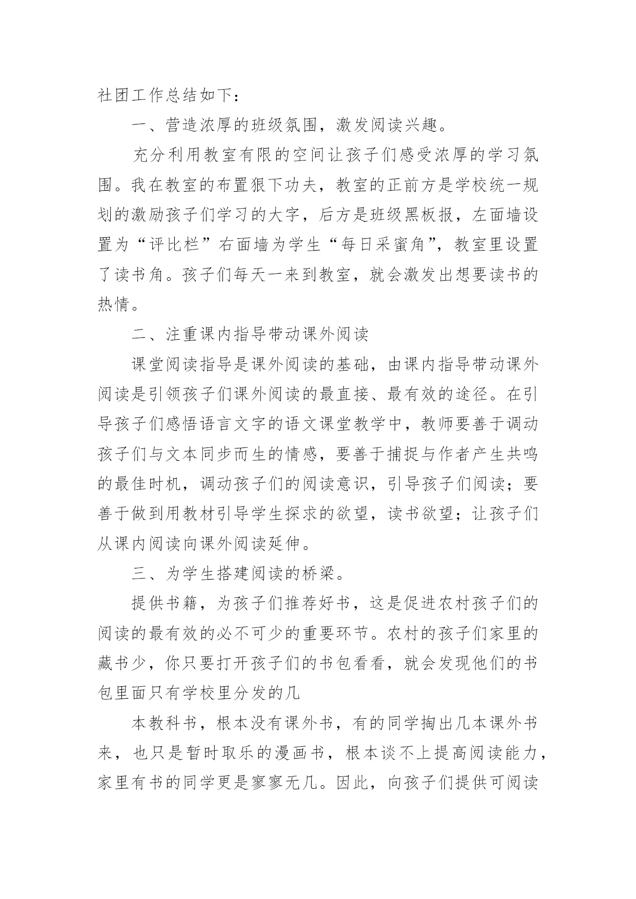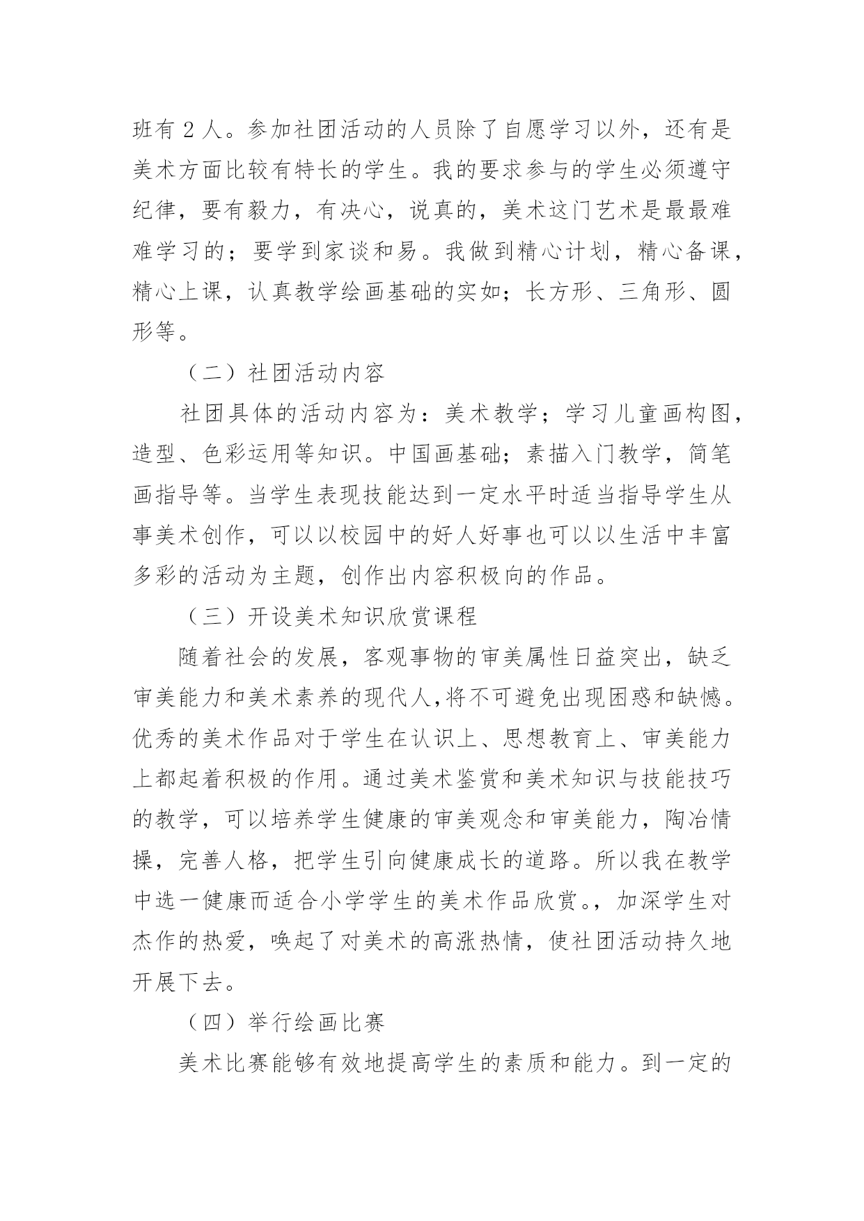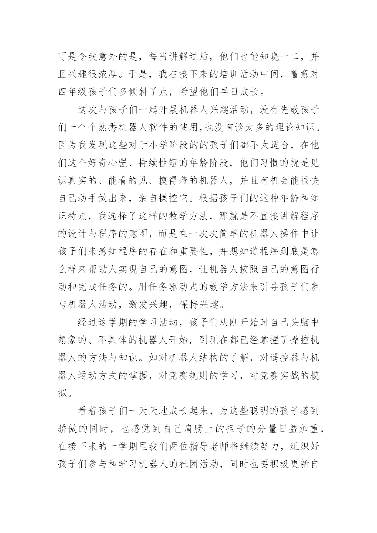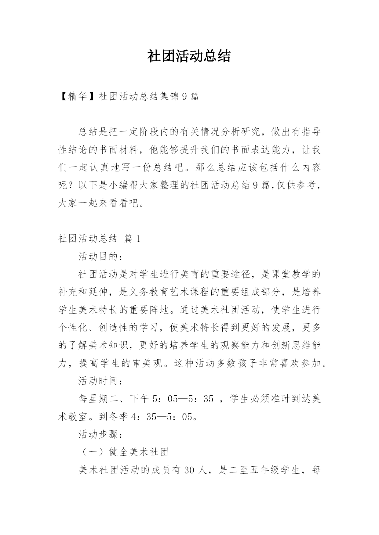 社团活动总结【精华】社团活动总结集锦9篇总结是把一定阶段内的有关情况分析研究,做出有指导性结论的书面材料,他能够提升我们的书面表达能力,让我们一起认真地写一份总结吧。那么总结应该包括什么内容呢?以下是小编帮大家整理的社团活动总结9篇,仅供参考,大家一起来看看吧。社团活动总结篇1活动目的:社团活动是对学生进行美育的重要途径,是课堂教学的补充和延伸,是义务教育艺术课程的重要组成部分,是培养学生美术特长的重要阵地。通过美术社团活动,使学生进行个性化、创造性的学习,使美术特长得到更好的发展,更多的了解美术知识,更好的培养学生的观察能力和创新思维能力,提高学生的审美观。这种活动多数孩子非常喜欢参加。活动时间:每星期二、下午5:05—5:35,学生必须准时到达美术教室。到冬季4:35—5:05。活动步骤:(一)健全美术社团美术社团活动的成员有30人,是二至五年级学生,每班有2人。参加社团活动的人员除了自愿学习以外,还有是美术方面比较有特长的学生。我的要求参与的学生必须遵守纪律,要有毅力,有决心,说真的,美术这门艺术是最最难难学习的;要学到家谈和易。我做到精心计划,精心备课,精心上课,认真教学绘画基础的实如;长方形、三角形、圆形等。(二)社团活动内容社团具体的活动内容为:美术教学;学习儿童画构图,造型、色彩运用等知识。中国画基础;素描入门教学,简笔画指导等。当学生表现技能达到一定水平时适当指导学生从事美术创作,可以以校园中的好人好事也可以以生活中丰富多彩的活动为主题,创作出内容积极向的作品。(三)开设美术知识欣赏课程随着社会的发展,客观事物的审美属性日益突出,缺乏审美能力和美术素养的现代人,将不可避免出现困惑和缺憾。优秀的美术作品对于学生在认识上、思想教育上、审美能力上都起着积极的作用。通过美术鉴赏和美术知识与技能技巧的教学,可以培养学生健康的审美观念和审美能力,陶冶情操,完善人格,把学生引向健康成长的道路。所以我在教学中选一健康而适合小学学生的美术作品欣赏。,加深学生对杰作的热爱,唤起了对美术的高涨热情,使社团活动持久地开展下去。(四)举行绘画比赛美术比赛能够有效地提高学生的素质和能力。到一定的时期,让学生举行绘画比赛,通过训练比赛,能够促进学生快速、准确、熟练的技能。另外也可以适当地举行中外名画知识抢答赛,使他们体验其中的快乐,产生极大的热情,以对美术课程更加热爱。(五)定期举办学生作品展览举办美术展览,交流、回顾、总结学习成果,可以为学生提供表现自己实力,增强自信心。作为教师则精心指导,严格把关。学生的一些佳作可以在班内展出以起到示范作用。开展美术社团活动活动,真正使学生学有所得,我牺牲许多休息时间,课前做好工作。勤于思考,大胆实践,调动学生的积极性,将美术社团活动开展得丰富多彩、富有特色。社团活动总结篇2时间勿勿而逝,转眼就到年底,经过一学期机器人社团活动,感觉同学们的收获还是很大的。这学期的机器人社团主要是由四、五年级的学生所组成的。对于四年级的学生来讲,学习操作机器人还是有些困难,难能可贵的是,这帮孩子很听话,很好学,很乐学,进步令人欣慰。要想操控好机器人必须具备三个条件,一是要有好的遥控操作基础,能够熟练地操控遥控器;二是要对机器人的结构比较熟悉和了解;三是还要有理解程序能力与善于动手维修的能力。本来以为四年级的学生在这些方面都比较陌生,可是令我意外的是,每当讲解过后,他们也能知晓一二,并且兴趣很浓厚。于是,我在接下来的培训活动中间,着意对四年级孩子们多倾斜了点,希望他们早日成长。这次与孩子们一起开展机器人兴趣活动,没有先教孩子们一个个熟悉机器人软件的使用,也没有谈太多的理论知识。因为我发现这些对于小学阶段的的孩子们都不太适合,在他们这个好奇心强、持续性短的年龄阶段,他们习惯的就是见识真实的、能看的见、摸得着的机器人,并且有机会能很快自己动手做出来,亲自操控它。根据孩子们的这种年龄和知识特点,我选择了这样的教学方法,那就是不直接讲解程序的设计与程序的意图,而是在一次次简单的机器人操作中让孩子们来感知程序的存在和重要性,并想知道程序到底是怎么样来帮助人实现自己的意图,让机器人按照自己的意图行动和完成任务的。用任务驱动式的教学方法来引导孩子们参与机器人活动,激发兴趣,保持兴趣。经过这学期的学习活动,孩子们从刚开始时自己头脑中想象的、不具体的机器人开始,到现在都已经掌握了操控机器人的方法与知识。如对机器人结构的了解,对遥控器与机器人运动方式的掌握,对竞赛规则的学习,对竞赛实战的模拟。看着孩子们一天天地成长起来,为这些聪明的孩子感到骄傲的同时,也感觉到自己肩膀上的担子的分量日益加重,在接下来的一学期里我们两位指导老师将继续努力,组织好孩子们参与和学习机器人的社团活动,同时也要积极更新自己的知识与技能,与孩子们一起成长。社团活动总结