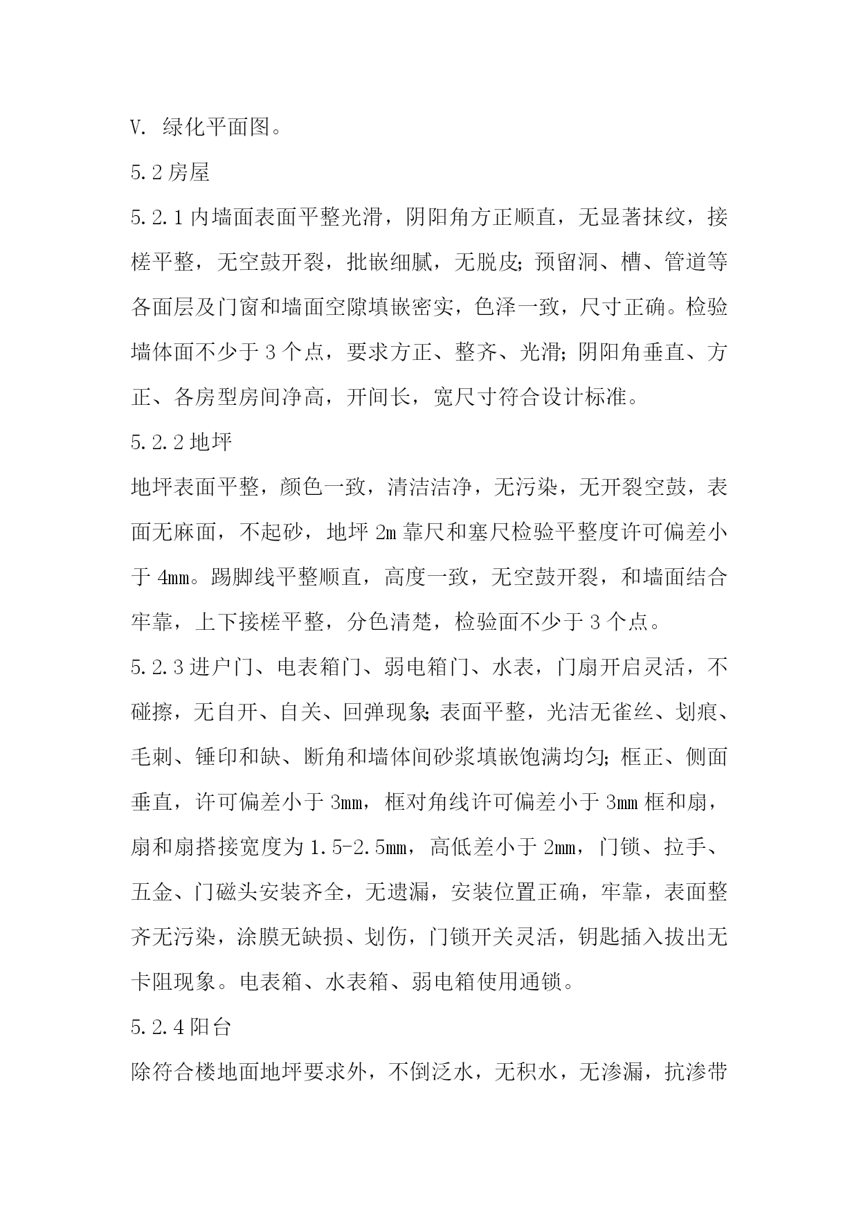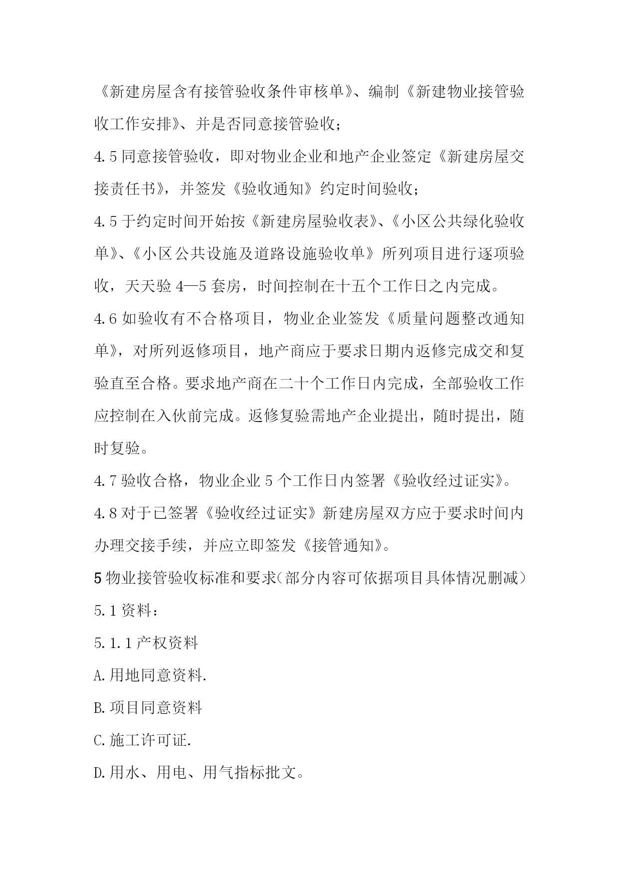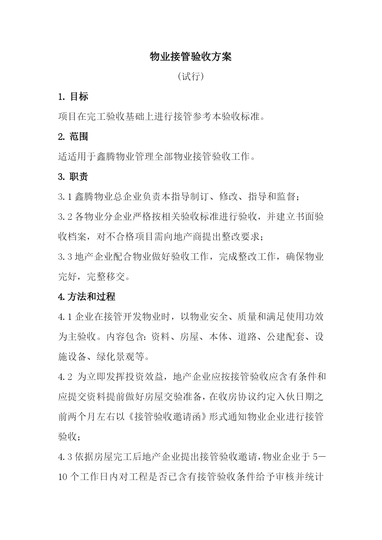 鑫腾物业文件编号AY-WI-001内部文件物业接管验收方案版本A/0生效日期.05-08物业接管验收方案岳阳市鑫腾物业物业接管验收方案(试行)目标项目在完工验收基础上进行接管参考本验收标准。范围适适用于鑫腾物业管理全部物业接管验收工作。职责3.1鑫腾物业总企业负责本指导制订、修改、指导和监督;3.2各物业分企业严格按相关验收标准进行验收,并建立书面验收档案,对不合格项目需向地产商提出整改要求;3.3地产企业配合物业做好验收工作,完成整改工作,确保物业完好,完整移交。4.方法和过程4.1企业在接管开发物业时,以物业安全、质量和满足使用功效为主验收。内容包含:资料、房屋、本体、道路、公建配套、设施设备、绿化景观等。4.2为立即发挥投资效益,地产企业应按接管验收应含有条件和应提交资料提前做好房屋交验准备,在收房协议约定入伙日期之前两个月左右以《接管验收邀请函》形式通知物业企业进行接管验收;4.3依据房屋完工后地产企业提出接管验收邀请,物业企业于5―10个工作日内对工程是否已含有接管验收条件给予审核并统计《新建房屋含有接管验收条件审核单》、编制《新建物业接管验收工作安排》、并是否同意接管验收;4.5同意接管验收,即对物业企业和地产企业签定《新建房屋交接责任书》,并签发《验收通知》约定时间验收;4.5于约定时间开始按《新建房屋验收表》、《小区公共绿化验收单》、《小区公共设施及道路设施验收单》所列项目进行逐项验收,天天验4—5套房,时间控制在十五个工作日之内完成。4.6如验收有不合格项目,物业企业签发《质量问题整改通知单》,对所列返修项目,地产商应于要求日期内返修完成交和复验直至合格。要求地产商在二十个工作日内完成,全部验收工作应控制在入伙前完成。返修复验需地产企业提出,随时提出,随时复验。4.7验收合格,物业企业5个工作日内签署《验收经过证实》。4.8对于已签署《验收经过证实》新建房屋双方应于要求时间内办理交接手续,并应立即签发《接管通知》。5物业接管验收标准和要求(部分内容可依据项目具体情况删减)5.1资料:5.1.1产权资料A.用地同意资料.B.项目同意资料C.施工许可证.D.用水、用电、用气指标批文。5.1.2技术资料A.住宅区计划图,小区完工总平面图。B.全部单体建筑、结构、设备安装完工图。C.单位工程完工验收证实书。D.地图勘探汇报,沉降观察统计。E.地下管网完工图。F.全部设备订货协议、产品合格证、随即资料(使用说明检验汇报),随即专业工具清单。G.电缆铺设统计。H.线路及电力电缆试验统计。I.发电机、电动机检验试运转统计。J电气设备试验调整统计。K.电气设备绝缘检验。L.电气设备送电验收统计。M.防雷接地电阻检测统计。N.防雷引下线焊接统计。O.排水.排污管及化粪池图表。P.通风机风量测量调整统计。R.环境保护达标验收许可证。S.消防验收许可证。T.房屋测绘验收资料。U.房屋验收统计。V.绿化平面图。5.2房屋5.2.1内墙面表面平整光滑,阴阳角方正顺直,无显著抹纹,接槎平整,无空鼓开裂,批嵌细腻,无脱皮;预留洞、槽、管道等各面层及门窗和墙面空隙填嵌密实,色泽一致,尺寸正确。检验墙体面不少于3个点,要求方正、整齐、光滑;阴阳角垂直、方正、各房型房间净高,开间长,宽尺寸符合设计标准。5.2.2地坪地坪表面平整,颜色一致,清洁洁净,无污染,无开裂空鼓,表面无麻面,不起砂,地坪2m靠尺和塞尺检验平整度许可偏差小于4mm。踢脚线平整顺直,高度一致,无空鼓开裂,和墙面结合牢靠,上下接槎平整,分色清楚,检验面不少于3个点。5.2.3进户门、电表箱门、弱电箱门、水表,门扇开启灵活,不碰擦,无自开、自关、回弹现象;表面平整,光洁无雀丝、划痕、毛刺、锤印和缺、断角和墙体间砂浆填嵌饱满均匀;框正、侧面垂直,许可偏差小于3mm,框对角线许可偏差小于3mm框和扇,扇和扇搭接宽度为1.5-2.5mm,高低差小于2mm,门锁、拉手、五金、门磁头安装齐全,无遗漏,安装位置正确,牢靠,表面整齐无污染,涂膜无缺损、划伤,门锁开关灵活,钥匙插入拔出无卡阻现象。电表箱、水表箱、弱电箱使用通锁。5.2.4阳台除符合楼地面地坪要求外,不倒泛水,无积水,无渗漏,抗渗带高度一致,出墙厚度均匀,无空鼓裂开;阳台栏杆无表面显著凹坑和损伤,划痕不超出0.5mm,栏杆整齐一致,位置正确;阳台挂落线宽度一致,出底板高度一致;阳台立管清洁无污染。5.2.5卫生间、厨房间墙面批嵌粗细一致,平整清洁,纹路上下顺直,无裂缝,不起壳,地坪平整。卫生间地面48小时盛水试验,以水覆盖满地面为准,达成不渗不漏。各出水管道灌水通水试验,每根管道试验2