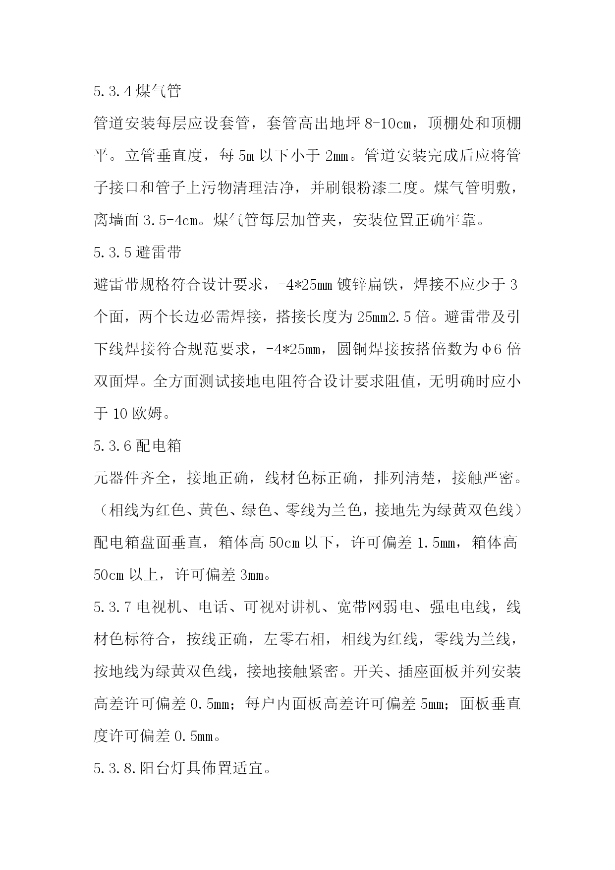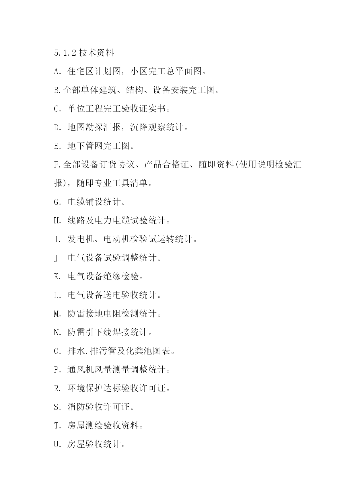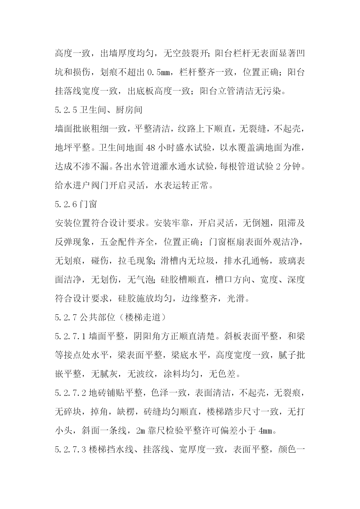 鑫腾物业文件编号AY-WI-001内部文件物业接管验收方案版本A/0生效日期.05-08物业接管验收方案岳阳市鑫腾物业物业接管验收方案(试行)目标项目在完工验收基础上进行接管参考本验收标准。范围适适用于鑫腾物业管理全部物业接管验收工作。职责3.1鑫腾物业总企业负责本指导制订、修改、指导和监督;3.2各物业分企业严格按相关验收标准进行验收,并建立书面验收档案,对不合格项目需向地产商提出整改要求;3.3地产企业配合物业做好验收工作,完成整改工作,确保物业完好,完整移交。4.方法和过程4.1企业在接管开发物业时,以物业安全、质量和满足使用功效为主验收。内容包含:资料、房屋、本体、道路、公建配套、设施设备、绿化景观等。4.2为立即发挥投资效益,地产企业应按接管验收应含有条件和应提交资料提前做好房屋交验准备,在收房协议约定入伙日期之前两个月左右以《接管验收邀请函》形式通知物业企业进行接管验收;4.3依据房屋完工后地产企业提出接管验收邀请,物业企业于5―10个工作日内对工程是否已含有接管验收条件给予审核并统计《新建房屋含有接管验收条件审核单》、编制《新建物业接管验收工作安排》、并是否同意接管验收;4.5同意接管验收,即对物业企业和地产企业签定《新建房屋交接责任书》,并签发《验收通知》约定时间验收;4.5于约定时间开始按《新建房屋验收表》、《小区公共绿化验收单》、《小区公共设施及道路设施验收单》所列项目进行逐项验收,天天验4—5套房,时间控制在十五个工作日之内完成。4.6如验收有不合格项目,物业企业签发《质量问题整改通知单》,对所列返修项目,地产商应于要求日期内返修完成交和复验直至合格。要求地产商在二十个工作日内完成,全部验收工作应控制在入伙前完成。返修复验需地产企业提出,随时提出,随时复验。4.7验收合格,物业企业5个工作日内签署《验收经过证实》。4.8对于已签署《验收经过证实》新建房屋双方应于要求时间内办理交接手续,并应立即签发《接管通知》。5物业接管验收标准和要求(部分内容可依据项目具体情况删减)5.1资料:5.1.1产权资料A.用地同意资料.B.项目同意资料C.施工许可证.D.用水、用电、用气指标批文。5.1.2技术资料A.住宅区计划图,小区完工总平面图。B.全部单体建筑、结构、设备安装完工图。C.单位工程完工验收证实书。D.地图勘探汇报,沉降观察统计。E.地下管网完工图。F.全部设备订货协议、产品合格证、随即资料(使用说明检验汇报),随即专业工具清单。G.电缆铺设统计。H.线路及电力电缆试验统计。I.发电机、电动机检验试运转统计。J电气设备试验调整统计。K.电气设备绝缘检验。L.电气设备送电验收统计。M.防雷接地电阻检测统计。N.防雷引下线焊接统计。O.排水.排污管及化粪池图表。P.通风机风量测量调整统计。R.环境保护达标验收许可证。S.消防验收许可证。T.房屋测绘验收资料。U.房屋验收统计。V.绿化平面图。5.2房屋5.2.1内墙面表面平整光滑,阴阳角方正顺直,无显著抹纹,接槎平整,无空鼓开裂,批嵌细腻,无脱皮;预留洞、槽、管道等各面层及门窗和墙面空隙填嵌密实,色泽一致,尺寸正确。检验墙体面不少于3个点,要求方正、整齐、光滑;阴阳角垂直、方正、各房型房间净高,开间长,宽尺寸符合设计标准。5.2.2地坪地坪表面平整,颜色一致,清洁洁净,无污染,无开裂空鼓,表面无麻面,不起砂,地坪2m靠尺和塞尺检验平整度许可偏差小于4mm。踢脚线平整顺直,高度一致,无空鼓开裂,和墙面结合牢靠,上下接槎平整,分色清楚,检验面不少于3个点。5.2.3进户门、电表箱门、弱电箱门、水表,门扇开启灵活,不碰擦,无自开、自关、回弹现象;表面平整,光洁无雀丝、划痕、毛刺、锤印和缺、断角和墙体间砂浆填嵌饱满均匀;框正、侧面垂直,许可偏差小于3mm,框对角线许可偏差小于3mm框和扇,扇和扇搭接宽度为1.5-2.5mm,高低差小于2mm,门锁、拉手、五金、门磁头安装齐全,无遗漏,安装位置正确,牢靠,表面整齐无污染,涂膜无缺损、划伤,门锁开关灵活,钥匙插入拔出无卡阻现象。电表箱、水表箱、弱电箱使用通锁。5.2.4阳台除符合楼地面地坪要求外,不倒泛水,无积水,无渗漏,抗渗带高度一致,出墙厚度均匀,无空鼓裂开;阳台栏杆无表面显著凹坑和损伤,划痕不超出0.5mm,栏杆整齐一致,位置正确;阳台挂落线宽度一致,出底板高度一致;阳台立管清洁无污染。5.2.5卫生间、厨房间墙面批嵌粗细一致,平整清洁,纹路上下顺直,无裂缝,不起壳,地坪平整。卫生间地面48小时盛水试验,以水覆盖满地面为准,达成不渗不漏。各出水管道灌水通水试验,每根管道试验2
