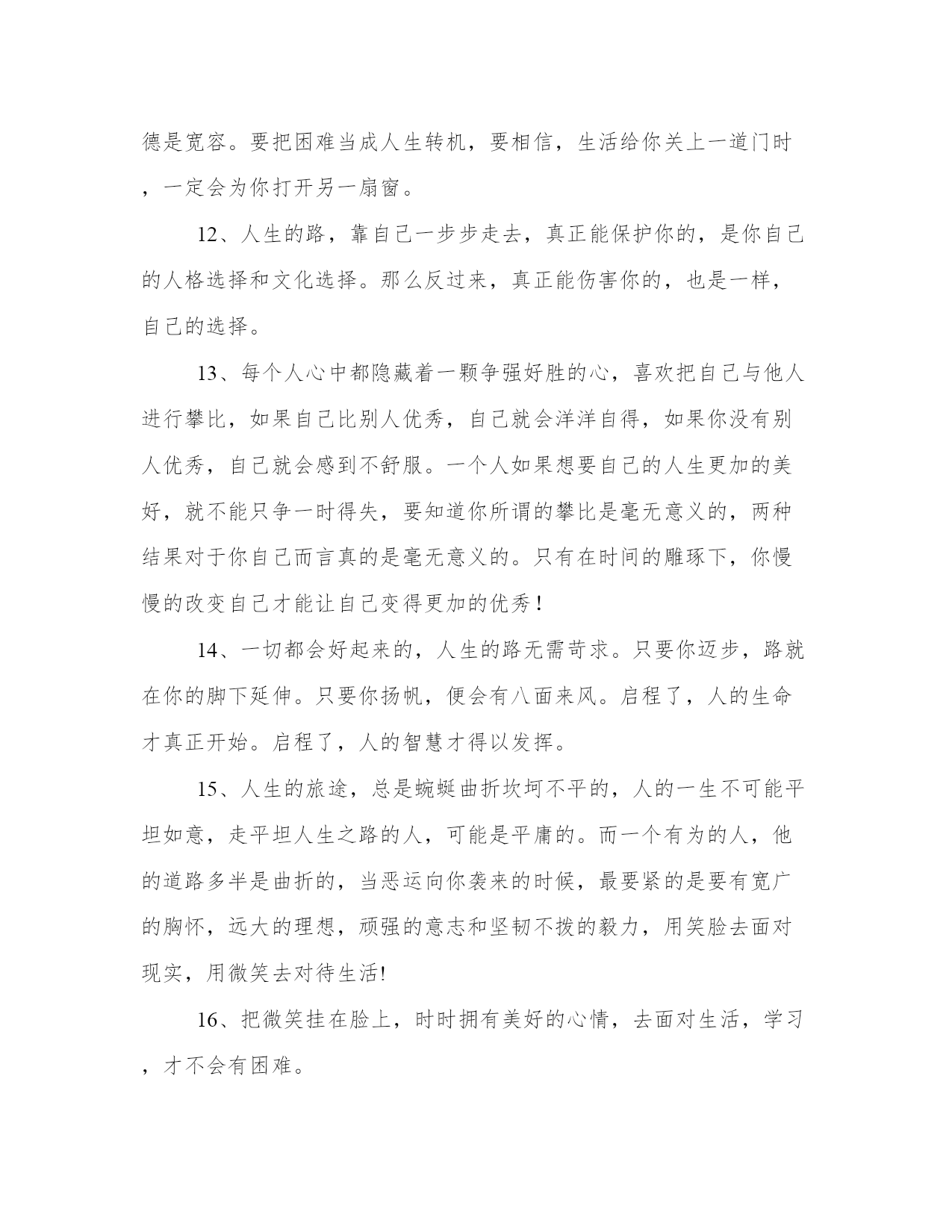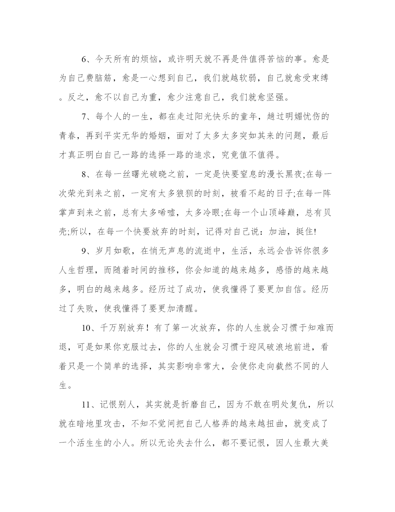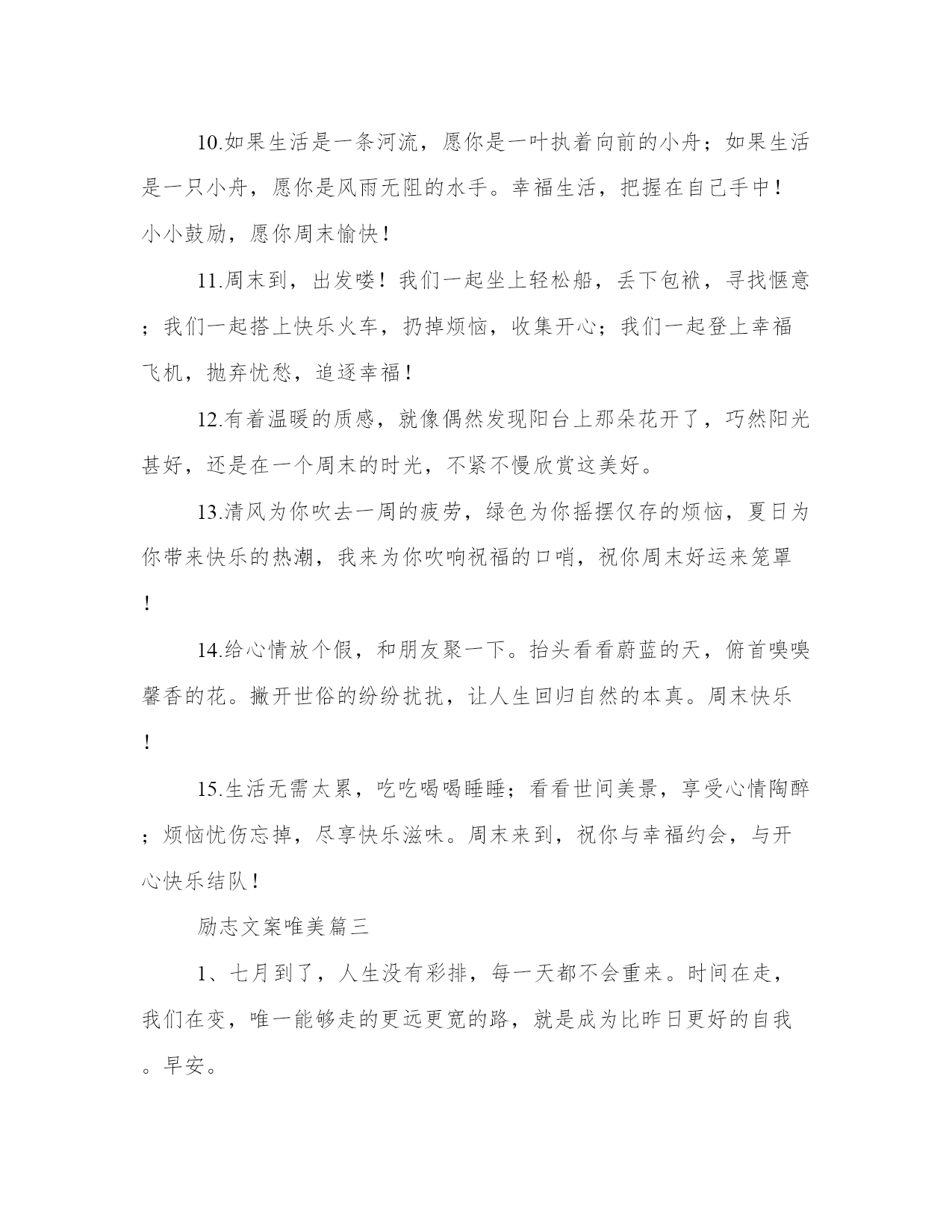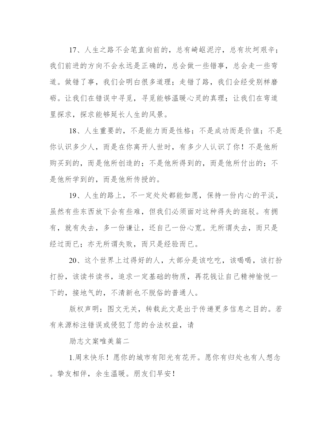 最新励志文案唯美(模板15篇)"总结是对我们经历的一段时期进行梳理和总结的过程,能够帮助我们更好地认识自己。"在写总结之前,要对所总结的内容有一个清晰的认识,确定总结的重点和要点。以下是一些总结的范文,供大家参考和学习。励志文案唯美篇一1、不求锁定结局,只求曾经努力;不求事事顺意,只求心情美丽;不求左右别人,只求善待自己;不求马到成功,只求坚定不移。2、时光从来不等人,只有人去等时光,不要相信该是自己终该是自己的,不去争取不去把握的话,永远都不会有机会。3、在彻底没有指望的时候,在永远没有结果的时候,一定要懂得放弃。如果它流动,就让它悄悄溜走;如果它汹涌,就让它静静干涸;如果它生长,就让它慢慢凋零。4、路,就在那儿。或许是迈上一步。两步。三步。就是可以到达。第一步认识,第二部理解,第三部体会,我们在路上。那一闪一闪的星星仿佛在拍摄我们的路途,那是在记录美好的点点滴滴。5、人最大的对手,往往不是别人,而是自己的懒惰。别指望撞大运,运气不可能永远在你身上,任何时候都要靠本事吃饭。你必须拼尽全力,才有资格说自己的运气不好。6、今天所有的烦恼,或许明天就不再是件值得苦恼的事。愈是为自己费脑筋,愈是一心想到自己,我们就越软弱,自己就愈受束缚。反之,愈不以自己为重,愈少注意自己,我们就愈坚强。7、每个人的一生,都在走过阳光快乐的童年,趟过明媚忧伤的青春,再到平实无华的婚姻,面对了太多太多突如其来的问题,最后才真正明白自己一路的选择一路的追求,究竟值不值得。8、在每一丝曙光破晓之前,一定是快要窒息的漫长黑夜;在每一次荣光到来之前,一定有太多狼狈的时刻,被看不起的日子;在每一阵掌声到来之前,总有太多唏嘘,太多冷眼;在每一个山顶峰巅,总有贝壳;所以,在每一个快要放弃的时刻,记得对自己说:加油,挺住!9、岁月如歌,在悄无声息的流逝中,生活,永远会告诉你很多人生哲理,而随着时间的推移,你会知道的越来越多,感悟的越来越多,明白的越来越多。经历过了成功,使我懂得了要更加自信。经历过了失败,使我懂得了要更加清醒。10、千万别放弃!有了第一次放弃,你的人生就会习惯于知难而退,可是如果你克服过去,你的人生就会习惯于迎风破浪地前进,看着只是一个简单的选择,其实影响非常大,会使你走向截然不同的人生。11、记恨别人,其实就是折磨自己,因为不敢在明处复仇,所以就在暗地里攻击,不知不觉间把自己人格弄的越来越扭曲,就变成了一个活生生的小人。所以无论失去什么,都不要记恨,因人生最大美德是宽容。要把困难当成人生转机,要相信,生活给你关上一道门时,一定会为你打开另一扇窗。12、人生的路,靠自己一步步走去,真正能保护你的,是你自己的人格选择和文化选择。那么反过来,真正能伤害你的,也是一样,自己的选择。13、每个人心中都隐藏着一颗争强好胜的心,喜欢把自己与他人进行攀比,如果自己比别人优秀,自己就会洋洋自得,如果你没有别人优秀,自己就会感到不舒服。一个人如果想要自己的人生更加的美好,就不能只争一时得失,要知道你所谓的攀比是毫无意义的,两种结果对于你自己而言真的是毫无意义的。只有在时间的雕琢下,你慢慢的改变自己才能让自己变得更加的优秀!14、一切都会好起来的,人生的路无需苛求。只要你迈步,路就在你的脚下延伸。只要你扬帆,便会有八面来风。启程了,人的生命才真正开始。启程了,人的智慧才得以发挥。15、人生的旅途,总是蜿蜒曲折坎坷不平的,人的一生不可能平坦如意,走平坦人生之路的人,可能是平庸的。而一个有为的人,他的道路多半是曲折的,当恶运向你袭来的时候,最要紧的是要有宽广的胸怀,远大的理想,顽强的意志和坚韧不拨的毅力,用笑脸去面对现实,用微笑去对待生活!16、把微笑挂在脸上,时时拥有美好的心情,去面对生活,学习,才不会有困难。17、人生之路不会笔直向前的,总有崎岖泥泞,总有坎坷艰辛;我们前进的方向不会永远是正确的,总会做一些错事,总会走一些弯道。做错了事,我们会明白很多道理;走错了路,我们会经受别样磨砺。让我们在错误中寻觅,寻觅能够温暖心灵的真理;让我们在弯道里探求,探求能够延长人生的风景。18、人生重要的,不是能力而是性格;不是成功而是价值;不是你认识多少人,而是在你离开人世时,有多少人认识了你!不是他所购买到的,而是他所创造的;不是他所得到的,而是他所付出的;不是他所学到的,而是他所传授的。19、人生的路上,不一定处处都能如愿,保持一份内心的平淡,虽然有些东西放下会有些难,但我们必须面对这种得失的斑驳。有拥有,就有失去,多一份谦让,还自己一份心宽。无所谓失去,而只是经过而已;亦无所谓失败,而只是经验而已。20、这个世界上过得好的人,大部分是该吃吃,该喝喝,该打扮打扮,该读书读书,追求一定基础的物质,再花钱让自己精神愉悦一下的,接地气的,不清