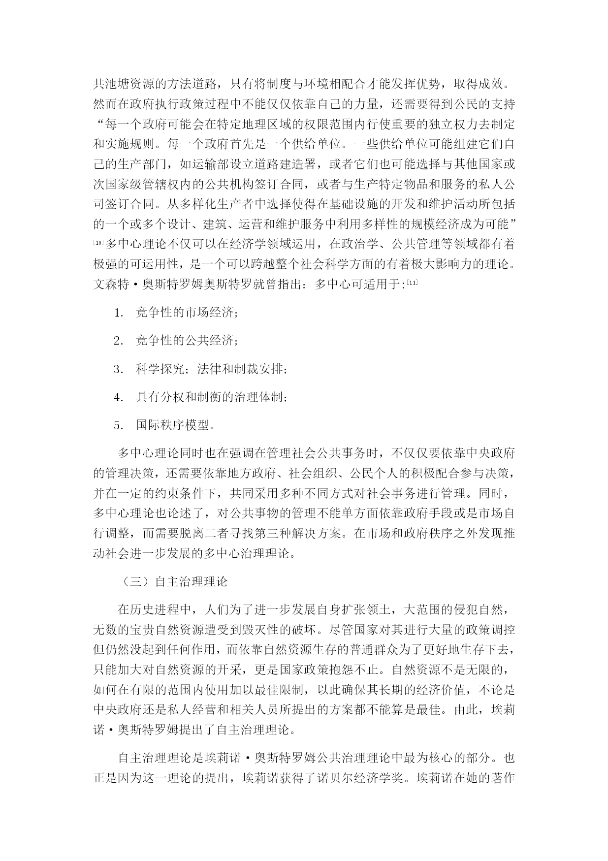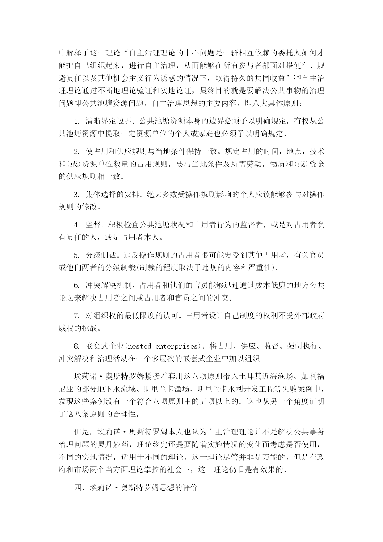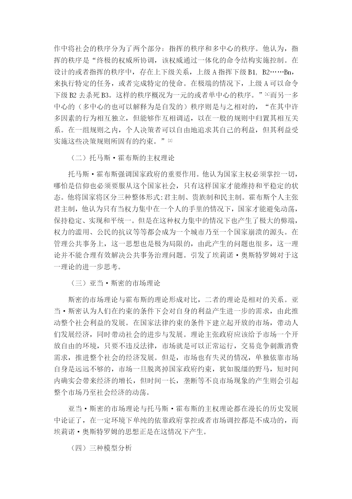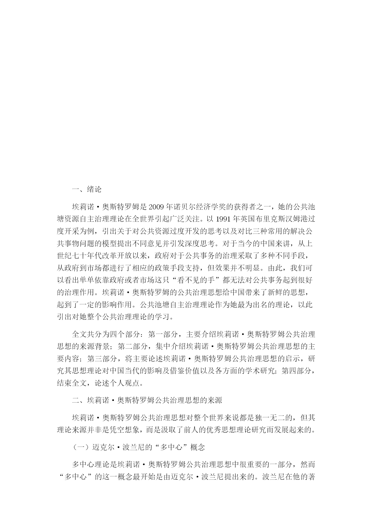 浅析埃莉诺·奥斯特罗姆的公共治理思想摘要:埃莉诺·奥斯特罗姆凭借她自己的公共治理思想中的自主治理理论于2009年获得诺贝尔经济学奖,这是历史上第一位女性荣获这一奖项。传统的关于公共事务治理在理论和实践上都存在明显的困境。从霍布斯的主权思想,到斯密的市场理论,都是仅从其中一方面对公共事务进行治理,但历史上不断发生的悲剧向我们证明,这都是不够的。埃莉诺·奥斯特罗姆从中展开研究提出她公共治理理论中的最重要的自主治理理论,运用实地调查的方法验证悲剧是可以避免的,从中找到脱离政府和市场的“第三只手”从而为实现公共事务良治有着极大意义。为世界各国公共事务的治理提供了新的理论支持。关键词:公共治理;公共事务;自主治理绪论埃莉诺·奥斯特罗姆是2009年诺贝尔经济学奖的获得者之一,她的公共池塘资源自主治理理论在全世界引起广泛关注。以1991年英国布里克斯汉姆港过度开采为例,引出关于对公共资源过度开发的思考以及对比三种常用的解决公共事物问题的模型提出不同意见并引发深度思考。对于当今的中国来讲,从上世纪七十年代改革开放以来,政府对于公共事务的治理采取了多种不同手段,从政府到市场都进行了相应的政策手段支持,但效果并不明显。由此,我们可以看出单单依靠政府或者市场这只“看不见的手”都无法对公共事务起到很好的治理作用。埃莉诺·奥斯特罗姆的公共治理思想给中国带来了新鲜的思想,起到了一定的影响作用。公共池塘自主治理理论作为她最为出名的理论,以此引出对她整个公共治理理论的学习。全文共分为四个部分:第一部分,主要介绍埃莉诺·奥斯特罗姆公共治理思想的来源背景;第二部分,集中介绍埃莉诺·奥斯特罗姆公共治理思想的主要内容;第三部分,将主要论述埃莉诺·奥斯特罗姆公共治理思想的启示,研究其思想理论对中国当代的影响及借鉴价值以及各方面的学术研究;第四部分,结束全文,论述个人观点。埃莉诺·奥斯特罗姆公共治理思想的来源埃莉诺·奥斯特罗姆公共治理思想对整个世界来说都是独一无二的,但其理论来源并非是凭空想象,而是汲取了前人的优秀思想理论研究而发展起来的。(一)迈克尔·波兰尼的“多中心”概念多中心理论是埃莉诺·奥斯特罗姆公共治理思想中很重要的一部分,然而“多中心”的这一概念最开始是由迈克尔·波兰尼提出来的。波兰尼在他的著作中将社会的秩序分为了两个部分:指挥的秩序和多中心的秩序。他认为,指挥的秩序是“终极的权威所协调,该权威通过一体化的命令结构实施控制。在设计的或者指挥的秩序中,存在上下级关系,上级A指挥下级B1,B2……Bn,来执行特定的任务,或者完成特定的使命。在极端的情况下,上级A可以命令下级B2去杀死B3。这样的秩序概况为一元的或者单中心的秩序。”[[][美]迈克尔·麦金尼斯.多中心体制与地方公共经济[M].毛寿龙译.上海:三联书店,2000.]而另一多中心的(多中心的也可以解释为是自发的)秩序则是与之相对的,“在其中许多因素的行为相互独立,但能够作互相调适,以在一般的规则中归置其相互关系。在一组规则之内,个人决策者可以自由地追求其自己的利益,但其利益受实施这些决策规则所固有的约束。”[[][美]迈克尔·麦金尼斯.多中心体制与地方公共经济[M].毛寿龙译.上海:三联书店,2000.](二)托马斯·霍布斯的主权理论托马斯·霍布斯强调国家政府的重要作用。他认为国家主权必须掌控一切,哪怕是信仰也必须要服从这个国家社会,只有这样国家才能维持和平稳定的状态。他将国家将区分三种整体形式:君主制、贵族制和民主制。霍布斯个人主张君主制,他认为只有当权力集中在一个人的手里的情况下,国家才能避免动荡,保持稳定、实现和平统一。但是在这种权力集中的情况下也产生了极大的弊端,权力的滥用、公民的抗议等等都会成为一个城市乃至一个国家崩溃的源头。在管理公共事务上,这一思想也是极为局限的,由此产生的问题也很多,这一理论并不能合理有效解决公共事务治理问题。引发了埃莉诺·奥斯特罗姆对于这一理论的进一步思考。(三)亚当·斯密的市场理论斯密的市场理论与霍布斯的理论形成对比,二者的理论是相对的关系。亚当·斯密认为人们在约束的条件下会对自身的利益产生进一步的需求,由此推动整个社会利益的发展。在国家法律约束的条件下建立起开放的市场,带动人们发展经济,同时带动社会的进步与发展。理论主张政府应该给予市场一个开放自由的环境,只要不违反法律,市场就是可以正常运行,交易竞争刺激消费需求,推进整个社会的经济发展。但是,市场也有失灵的情况,单独依靠市场自身是远远不够的,市场一旦脱离掉国家政府约束,犹如脱缰的野马,短时间内确实会带来经济的增长,但时间一长,垄断等不良市场现象的产生则会引起整个市场乃至社会经济的动荡。亚当·斯密的市场理论与托马斯·霍布斯的主权理论都在