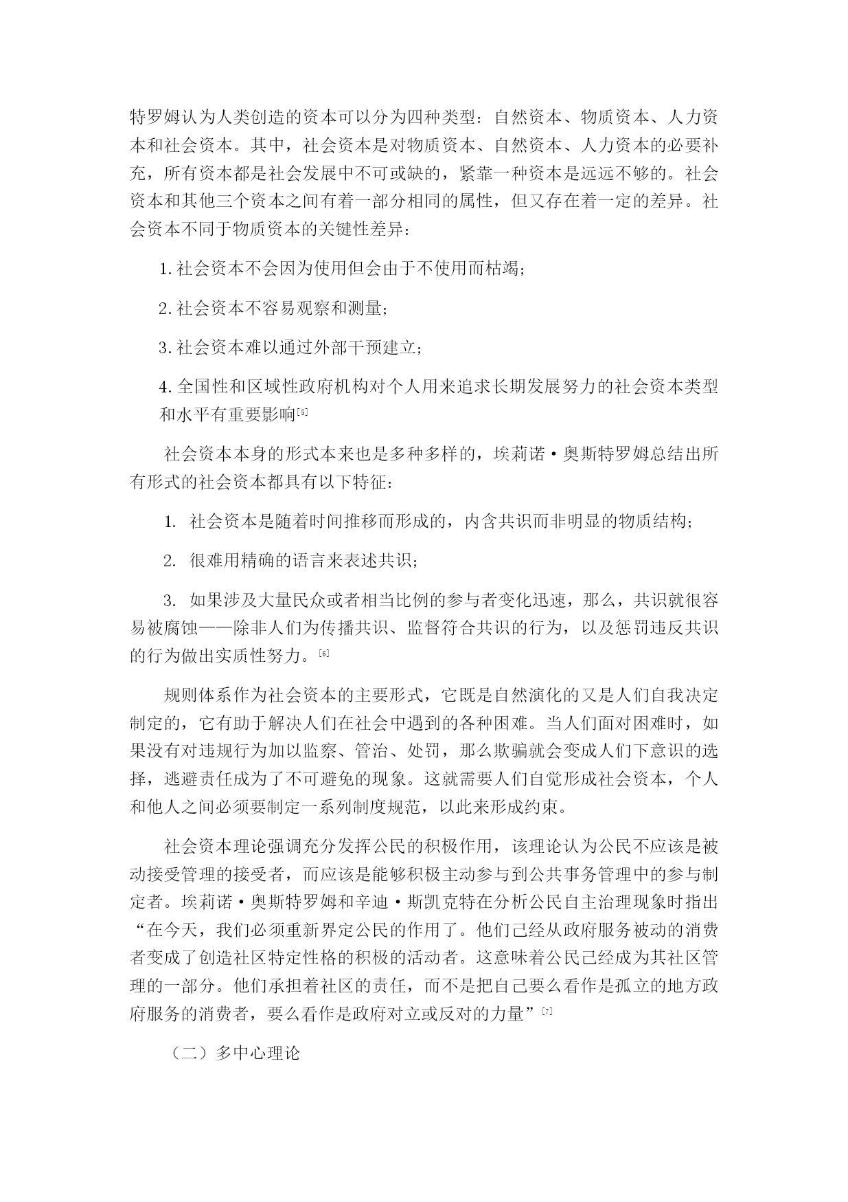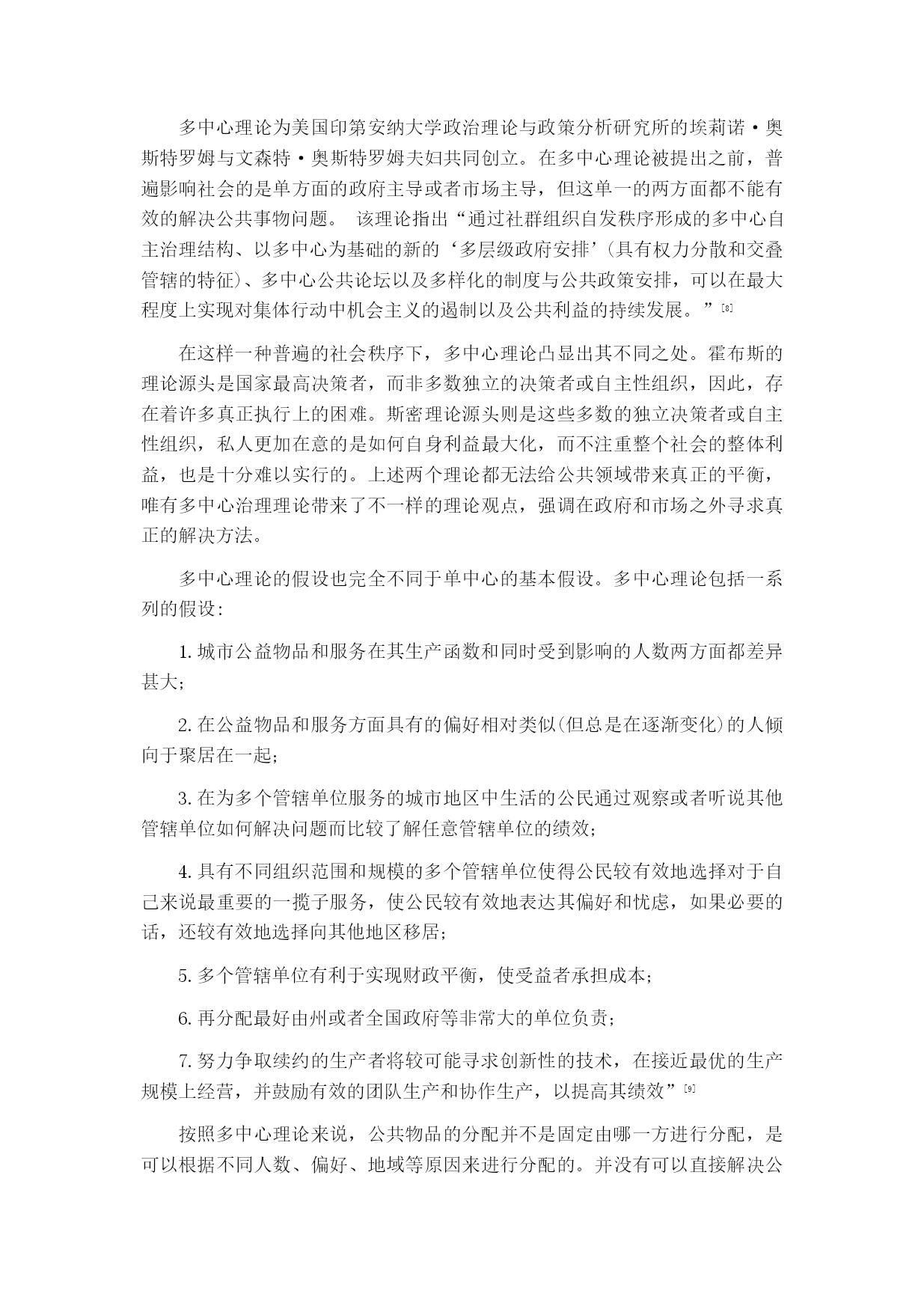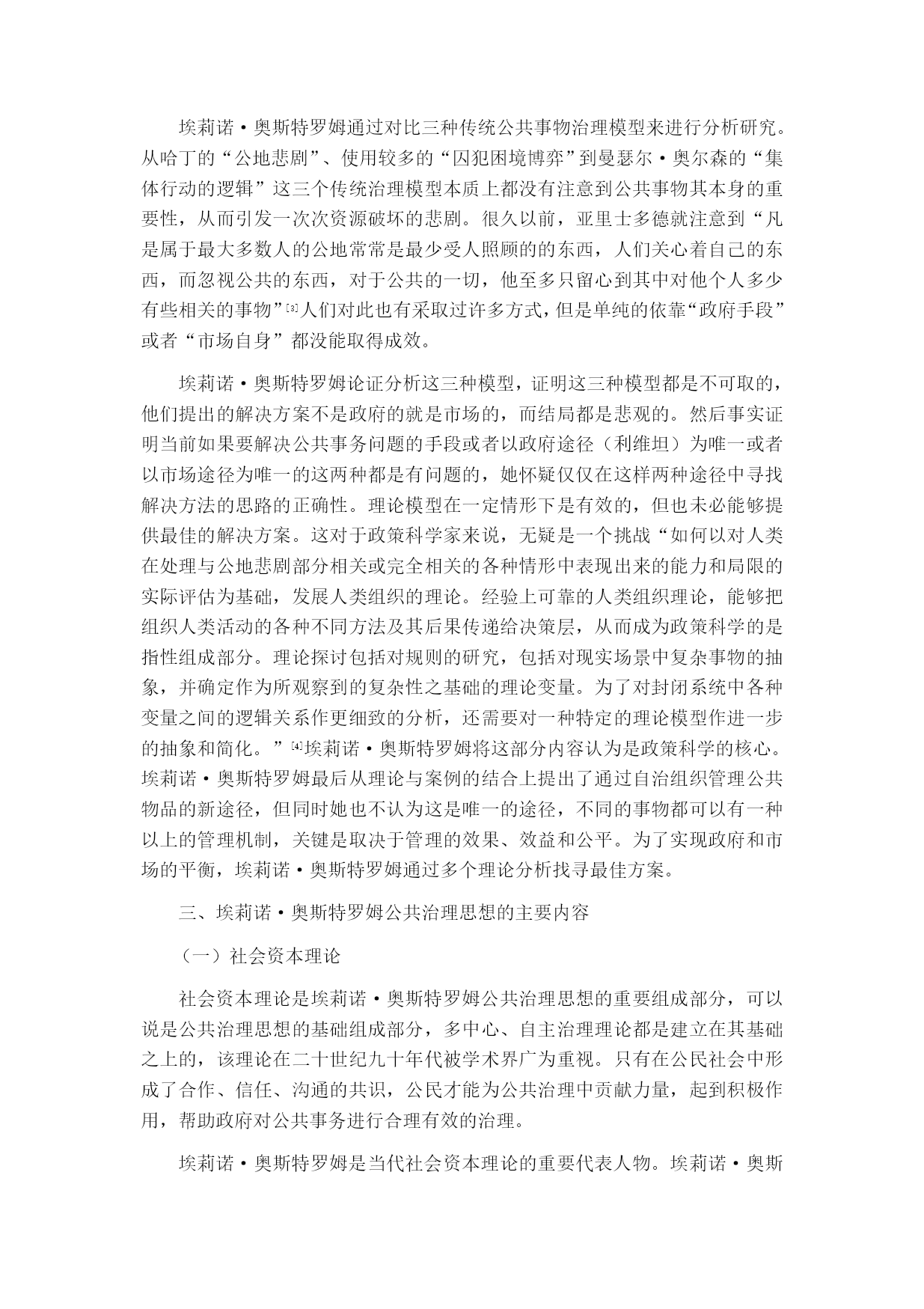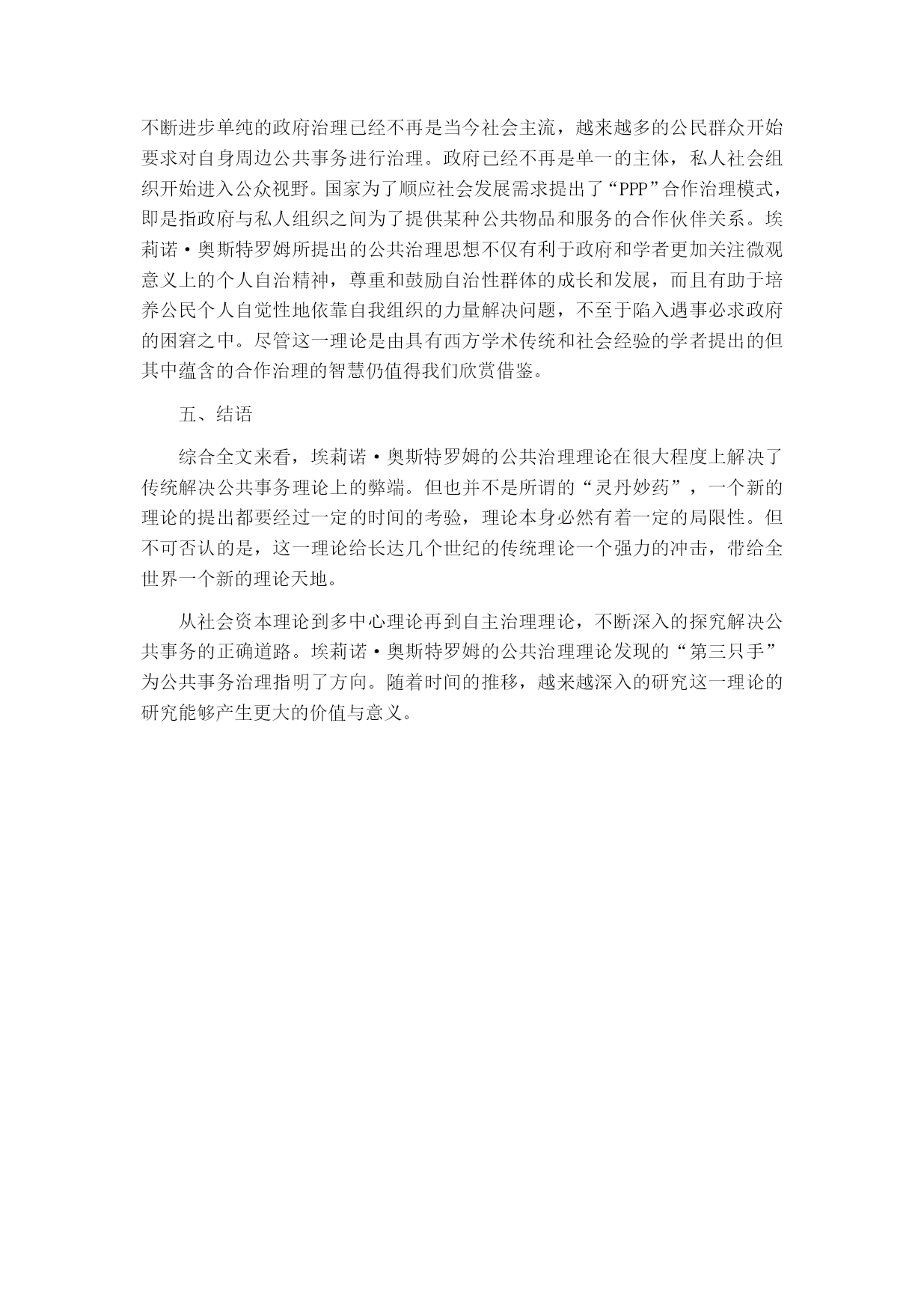 浅析埃莉诺·奥斯特罗姆的公共治理思想摘要:埃莉诺·奥斯特罗姆凭借她自己的公共治理思想中的自主治理理论于2009年获得诺贝尔经济学奖,这是历史上第一位女性荣获这一奖项。传统的关于公共事务治理在理论和实践上都存在明显的困境。从霍布斯的主权思想,到斯密的市场理论,都是仅从其中一方面对公共事务进行治理,但历史上不断发生的悲剧向我们证明,这都是不够的。埃莉诺·奥斯特罗姆从中展开研究提出她公共治理理论中的最重要的自主治理理论,运用实地调查的方法验证悲剧是可以避免的,从中找到脱离政府和市场的“第三只手”从而为实现公共事务良治有着极大意义。为世界各国公共事务的治理提供了新的理论支持。关键词:公共治理;公共事务;自主治理绪论埃莉诺·奥斯特罗姆是2009年诺贝尔经济学奖的获得者之一,她的公共池塘资源自主治理理论在全世界引起广泛关注。以1991年英国布里克斯汉姆港过度开采为例,引出关于对公共资源过度开发的思考以及对比三种常用的解决公共事物问题的模型提出不同意见并引发深度思考。对于当今的中国来讲,从上世纪七十年代改革开放以来,政府对于公共事务的治理采取了多种不同手段,从政府到市场都进行了相应的政策手段支持,但效果并不明显。由此,我们可以看出单单依靠政府或者市场这只“看不见的手”都无法对公共事务起到很好的治理作用。埃莉诺·奥斯特罗姆的公共治理思想给中国带来了新鲜的思想,起到了一定的影响作用。公共池塘自主治理理论作为她最为出名的理论,以此引出对她整个公共治理理论的学习。全文共分为四个部分:第一部分,主要介绍埃莉诺·奥斯特罗姆公共治理思想的来源背景;第二部分,集中介绍埃莉诺·奥斯特罗姆公共治理思想的主要内容;第三部分,将主要论述埃莉诺·奥斯特罗姆公共治理思想的启示,研究其思想理论对中国当代的影响及借鉴价值以及各方面的学术研究;第四部分,结束全文,论述个人观点。埃莉诺·奥斯特罗姆公共治理思想的来源埃莉诺·奥斯特罗姆公共治理思想对整个世界来说都是独一无二的,但其理论来源并非是凭空想象,而是汲取了前人的优秀思想理论研究而发展起来的。(一)迈克尔·波兰尼的“多中心”概念多中心理论是埃莉诺·奥斯特罗姆公共治理思想中很重要的一部分,然而“多中心”的这一概念最开始是由迈克尔·波兰尼提出来的。波兰尼在他的著作中将社会的秩序分为了两个部分:指挥的秩序和多中心的秩序。他认为,指挥的秩序是“终极的权威所协调,该权威通过一体化的命令结构实施控制。在设计的或者指挥的秩序中,存在上下级关系,上级A指挥下级B1,B2……Bn,来执行特定的任务,或者完成特定的使命。在极端的情况下,上级A可以命令下级B2去杀死B3。这样的秩序概况为一元的或者单中心的秩序。”[[][美]迈克尔·麦金尼斯.多中心体制与地方公共经济[M].毛寿龙译.上海:三联书店,2000.]而另一多中心的(多中心的也可以解释为是自发的)秩序则是与之相对的,“在其中许多因素的行为相互独立,但能够作互相调适,以在一般的规则中归置其相互关系。在一组规则之内,个人决策者可以自由地追求其自己的利益,但其利益受实施这些决策规则所固有的约束。”[[][美]迈克尔·麦金尼斯.多中心体制与地方公共经济[M].毛寿龙译.上海:三联书店,2000.](二)托马斯·霍布斯的主权理论托马斯·霍布斯强调国家政府的重要作用。他认为国家主权必须掌控一切,哪怕是信仰也必须要服从这个国家社会,只有这样国家才能维持和平稳定的状态。他将国家将区分三种整体形式:君主制、贵族制和民主制。霍布斯个人主张君主制,他认为只有当权力集中在一个人的手里的情况下,国家才能避免动荡,保持稳定、实现和平统一。但是在这种权力集中的情况下也产生了极大的弊端,权力的滥用、公民的抗议等等都会成为一个城市乃至一个国家崩溃的源头。在管理公共事务上,这一思想也是极为局限的,由此产生的问题也很多,这一理论并不能合理有效解决公共事务治理问题。引发了埃莉诺·奥斯特罗姆对于这一理论的进一步思考。(三)亚当·斯密的市场理论斯密的市场理论与霍布斯的理论形成对比,二者的理论是相对的关系。亚当·斯密认为人们在约束的条件下会对自身的利益产生进一步的需求,由此推动整个社会利益的发展。在国家法律约束的条件下建立起开放的市场,带动人们发展经济,同时带动社会的进步与发展。理论主张政府应该给予市场一个开放自由的环境,只要不违反法律,市场就是可以正常运行,交易竞争刺激消费需求,推进整个社会的经济发展。但是,市场也有失灵的情况,单独依靠市场自身是远远不够的,市场一旦脱离掉国家政府约束,犹如脱缰的野马,短时间内确实会带来经济的增长,但时间一长,垄断等不良市场现象的产生则会引起整个市场乃至社会经济的动荡。亚当·斯密的市场理论与托马斯·霍布斯的主权理论都在
