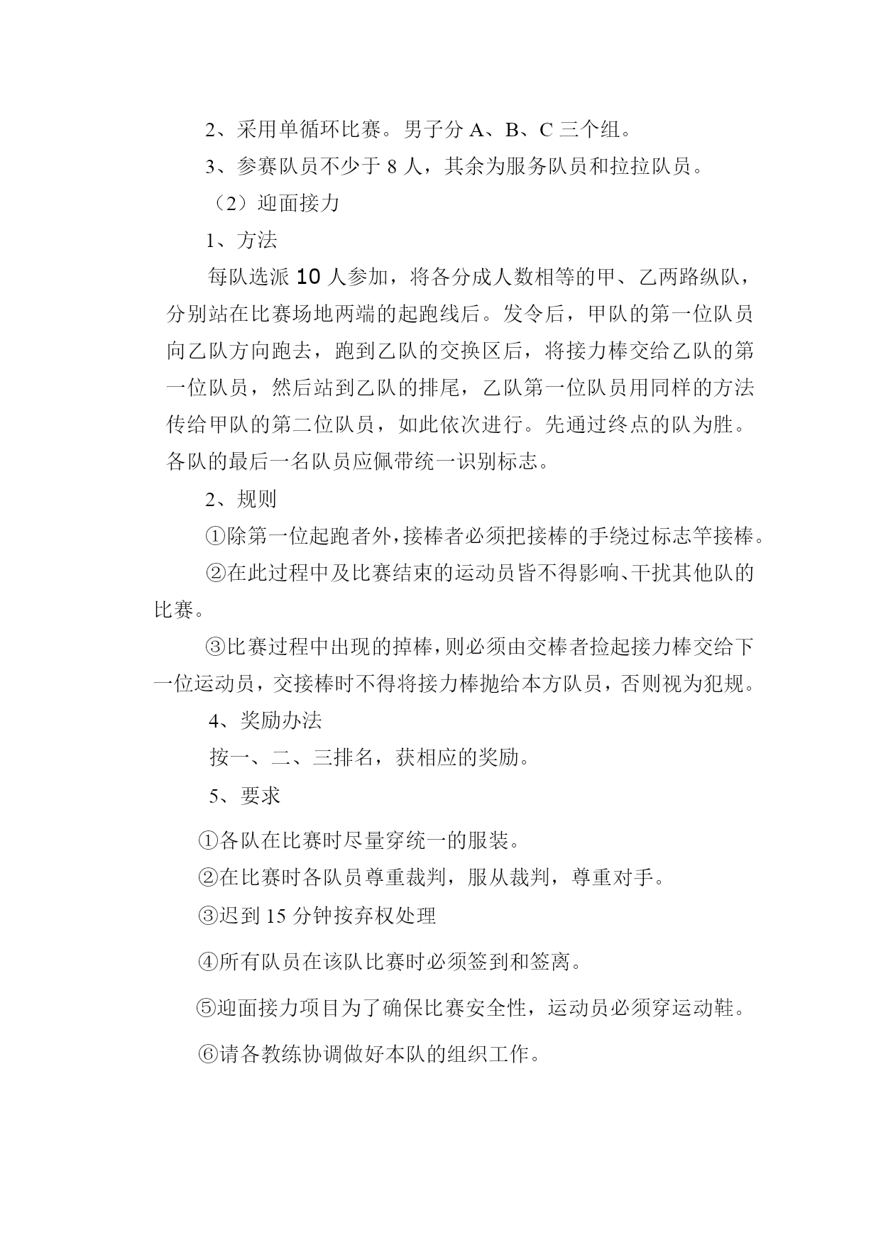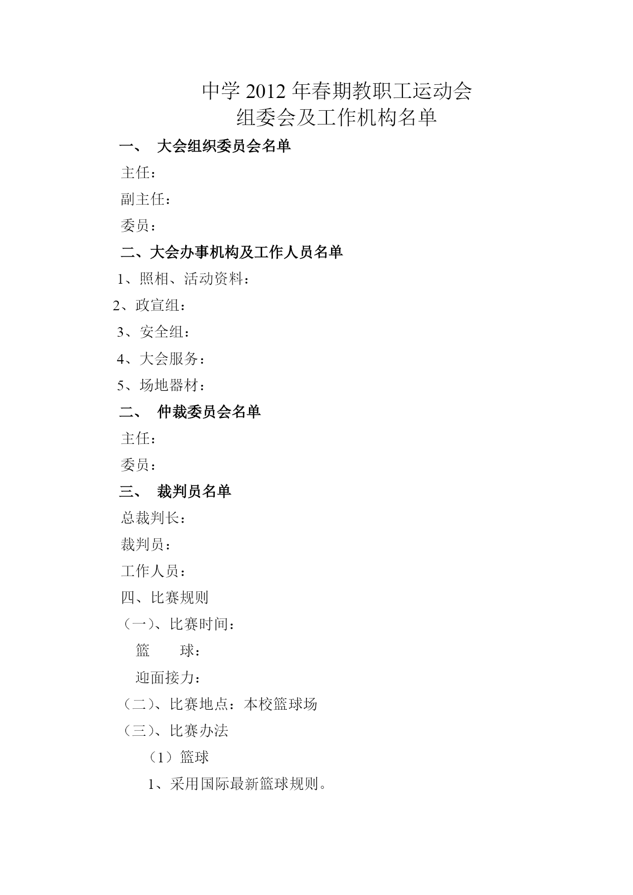 中学2012年春期教职工运动会秩序册主办单位:协办单位:承办单位:竞赛时间:中学2012年春期教职工运动会组委会及工作机构名单大会组织委员会名单主任:副主任:委员:二、大会办事机构及工作人员名单1、照相、活动资料:2、政宣组:3、安全组:4、大会服务:5、场地器材:仲裁委员会名单主任:委员:裁判员名单总裁判长:裁判员:工作人员:四、比赛规则(一)、比赛时间:篮球:迎面接力:(二)、比赛地点:本校篮球场(三)、比赛办法(1)篮球1、采用国际最新篮球规则。2、采用单循环比赛。男子分A、B、C三个组。3、参赛队员不少于8人,其余为服务队员和拉拉队员。(2)迎面接力1、方法每队选派10人参加,将各分成人数相等的甲、乙两路纵队,分别站在比赛场地两端的起跑线后。发令后,甲队的第一位队员向乙队方向跑去,跑到乙队的交换区后,将接力棒交给乙队的第一位队员,然后站到乙队的排尾,乙队第一位队员用同样的方法传给甲队的第二位队员,如此依次进行。先通过终点的队为胜。各队的最后一名队员应佩带统一识别标志。2、规则①除第一位起跑者外,接棒者必须把接棒的手绕过标志竿接棒。②在此过程中及比赛结束的运动员皆不得影响、干扰其他队的比赛。③比赛过程中出现的掉棒,则必须由交棒者捡起接力棒交给下一位运动员,交接棒时不得将接力棒抛给本方队员,否则视为犯规。4、奖励办法按一、二、三排名,获相应的奖励。5、要求①各队在比赛时尽量穿统一的服装。②在比赛时各队员尊重裁判,服从裁判,尊重对手。③迟到15分钟按弃权处理④所有队员在该队比赛时必须签到和签离。⑤迎面接力项目为了确保比赛安全性,运动员必须穿运动鞋。⑥请各教练协调做好本队的组织工作。