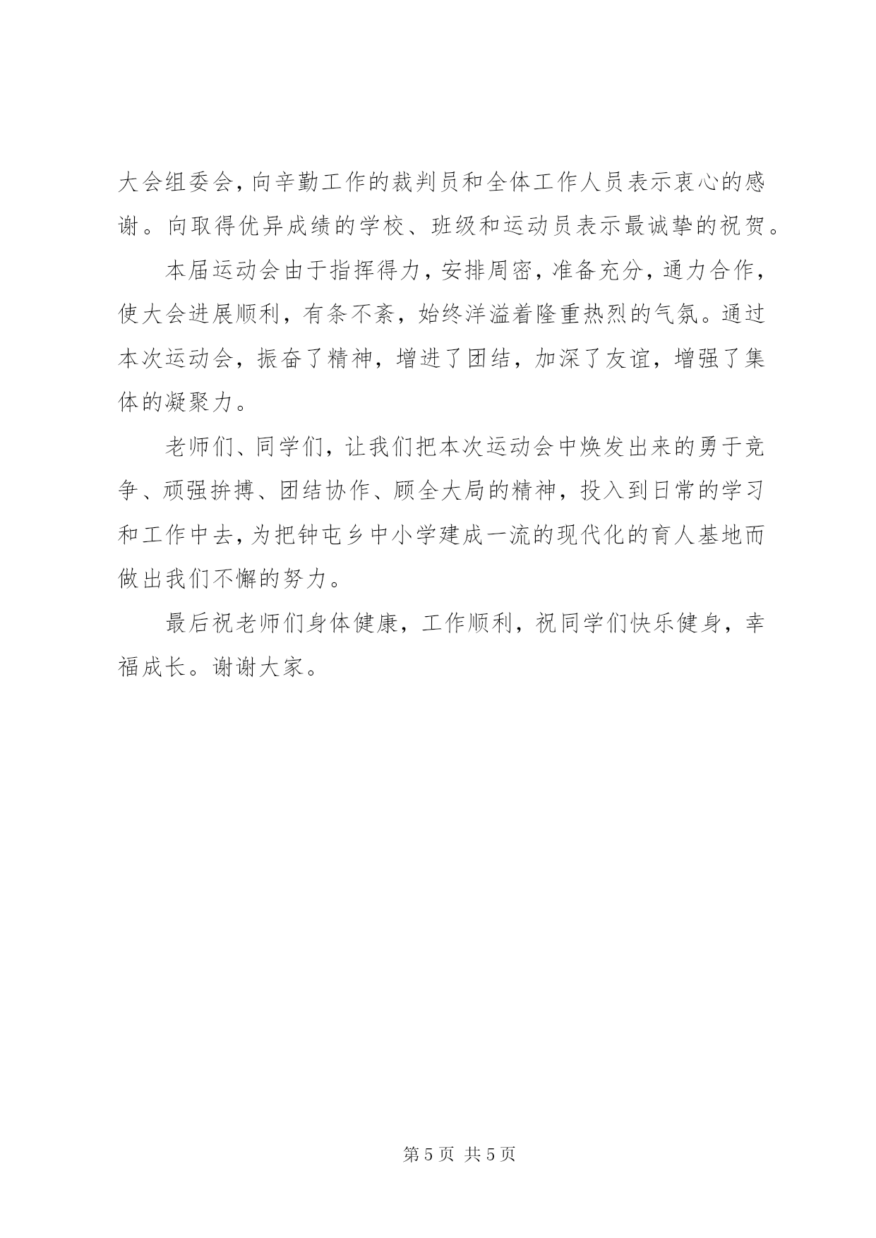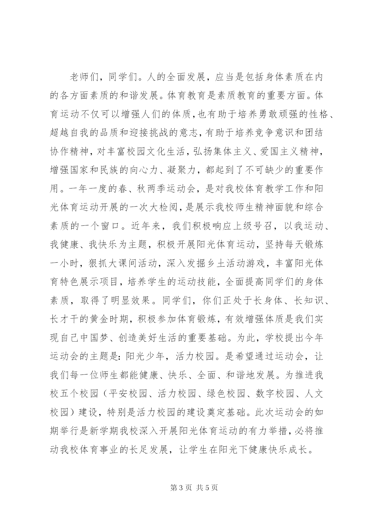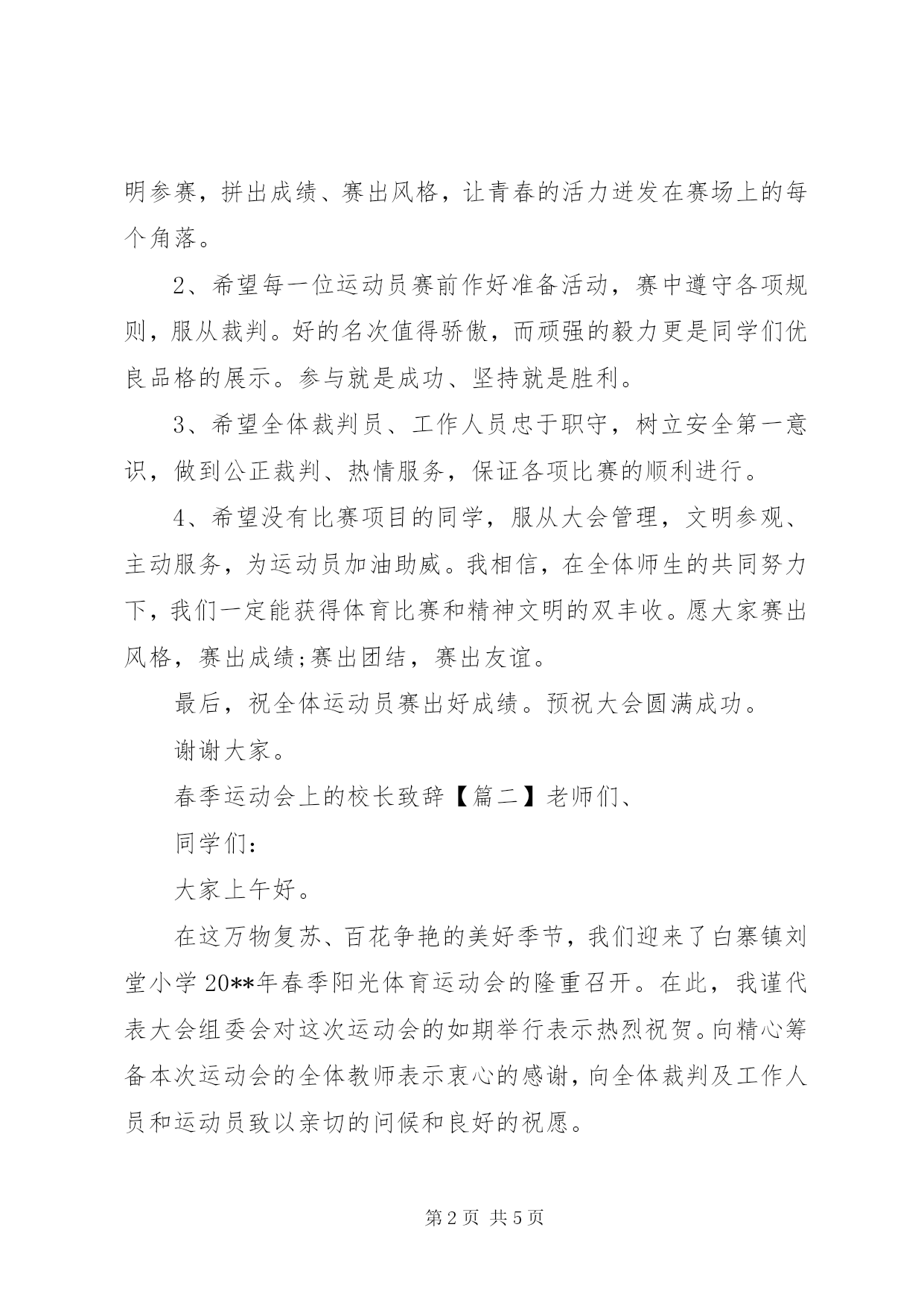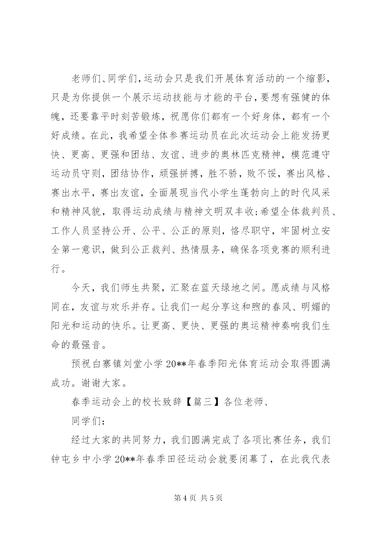 第PAGE\*Arabic\*MERGEFORMAT5页共NUMPAGES\*MERGEFORMAT5页春季运动会上的校长致辞春季运动会上的校长致辞【篇一】尊敬的老师、同学们:大家好。在这万物复苏的美好季节,我们又迎来了times;times;times;times;第二十六届春季运动会的隆重召开。在此,我谨代表学校向精心筹备本次体育盛会的全体教师表示衷心的感谢,向全体运动员致以亲切的问候和良好的祝愿。同学们,老师们。人的全面发展,应当是包括身体素质在内的各方面素质的和谐发展。体育教育是素质教育的重要方面。体育运动不仅可以增强人们的体质,也有助于培养勇敢顽强的性格、超越自我的品质和迎接挑战的意志,有助于培养竞争意识和团结协作精神,对丰富文化生活,弘扬集体主义、爱国主义精神,增强国家和民族的向心力、凝聚力,都起到了不可缺少的重要作用。为此,学校提出今年运动会的主题是:阳光体育,健康快乐。是希望通过运动会,让我们每一位师生都能健康、快乐、全面、和谐地发展。一年一度的春季运动会是对同学们心理素质、身体素质、体育运动水平的一次验收,也是对全体师生组织纪律性和精神风貌的大检阅。我们深知运动场上的每一份成绩,都凝聚着全体师生的辛勤汗水和无私奉献。为了使这次运动会达到预期的目的,我对全体与会人员提出以下要求:1、希望每一位运动员精神饱满、斗志昂扬,安全参赛、文明参赛,拼出成绩、赛出风格,让青春的活力迸发在赛场上的每个角落。2、希望每一位运动员赛前作好准备活动,赛中遵守各项规则,服从裁判。好的名次值得骄傲,而顽强的毅力更是同学们优良品格的展示。参与就是成功、坚持就是胜利。3、希望全体裁判员、工作人员忠于职守,树立安全第一意识,做到公正裁判、热情服务,保证各项比赛的顺利进行。4、希望没有比赛项目的同学,服从大会管理,文明参观、主动服务,为运动员加油助威。我相信,在全体师生的共同努力下,我们一定能获得体育比赛和精神文明的双丰收。愿大家赛出风格,赛出成绩;赛出团结,赛出友谊。最后,祝全体运动员赛出好成绩。预祝大会圆满成功。谢谢大家。春季运动会上的校长致辞【篇二】老师们、同学们:大家上午好。在这万物复苏、百花争艳的美好季节,我们迎来了白寨镇刘堂小学20**年春季阳光体育运动会的隆重召开。在此,我谨代表大会组委会对这次运动会的如期举行表示热烈祝贺。向精心筹备本次运动会的全体教师表示衷心的感谢,向全体裁判及工作人员和运动员致以亲切的问候和良好的祝愿。老师们,同学们。人的全面发展,应当是包括身体素质在内的各方面素质的和谐发展。体育教育是素质教育的重要方面。体育运动不仅可以增强人们的体质,也有助于培养勇敢顽强的性格、超越自我的品质和迎接挑战的意志,有助于培养竞争意识和团结协作精神,对丰富校园文化生活,弘扬集体主义、爱国主义精神,增强国家和民族的向心力、凝聚力,都起到了不可缺少的重要作用。一年一度的春、秋两季运动会,是对我校体育教学工作和阳光体育运动开展的一次大检阅,是展示我校师生精神面貌和综合素质的一个窗口。近年来,我们积极响应上级号召,以我运动、我健康、我快乐为主题,积极开展阳光体育运动,坚持每天锻炼一小时,狠抓大课间活动,深入发掘乡土活动游戏,丰富阳光体育特色展示项目,培养学生的运动技能,全面提高同学们的身体素质,取得了明显效果。同学们,你们正处于长身体、长知识、长才干的黄金时期,积极参加体育锻炼,有效增强体质是我们实现自己中国梦、创造美好生活的重要基础。为此,学校提出今年运动会的主题是:阳光少年,活力校园。是希望通过运动会,让我们每一位师生都能健康、快乐、全面、和谐地发展。为推进我校五个校园(平安校园、活力校园、绿色校园、数字校园、人文校园)建设,特别是活力校园的建设奠定基础。此次运动会的如期举行是新学期我校深入开展阳光体育运动的有力举措,必将推动我校体育事业的长足发展,让学生在阳光下健康快乐成长。老师们、同学们,运动会只是我们开展体育活动的一个缩影,只是为你提供一个展示运动技能与才能的平台,要想有强健的体魄,还要靠平时刻苦锻炼,祝愿你们都有一个好身体,都有一个好成绩。在此,我希望全体参赛运动员在此次运动会上能发扬更快、更高、更强和团结、友谊、进步的奥林匹克精神,模范遵守运动员守则,团结协作,顽强拼搏,胜不骄,败不馁,赛出风格、赛出水平,赛出友谊,全面展现当代小学生蓬勃向上的时代风采和精神风貌,取得运动成绩与精神文明双丰收;希望全体裁判员、工作人员坚持公开、公平、公正的原则,恪尽职守,牢固树立安全第一意识,做到公正裁判、热情服务,确保各项竞赛的顺利进行。今天,我们师生共聚,汇聚在蓝天绿地之间。愿成绩与风格同在,友谊与欢乐并存。让我们一起分享这和煦的春风、明媚的阳光和运动的快乐。让更高、更快、更强的奥运精神奏响我们生命的最强音。