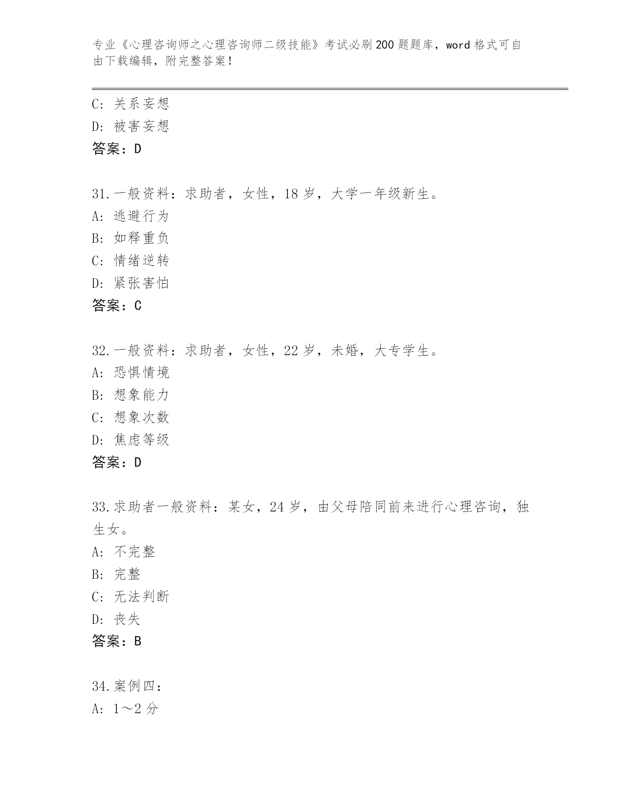 贵州省黎平县《心理咨询师之心理咨询师二级技能》考试必刷200题王牌题库【名师系列】