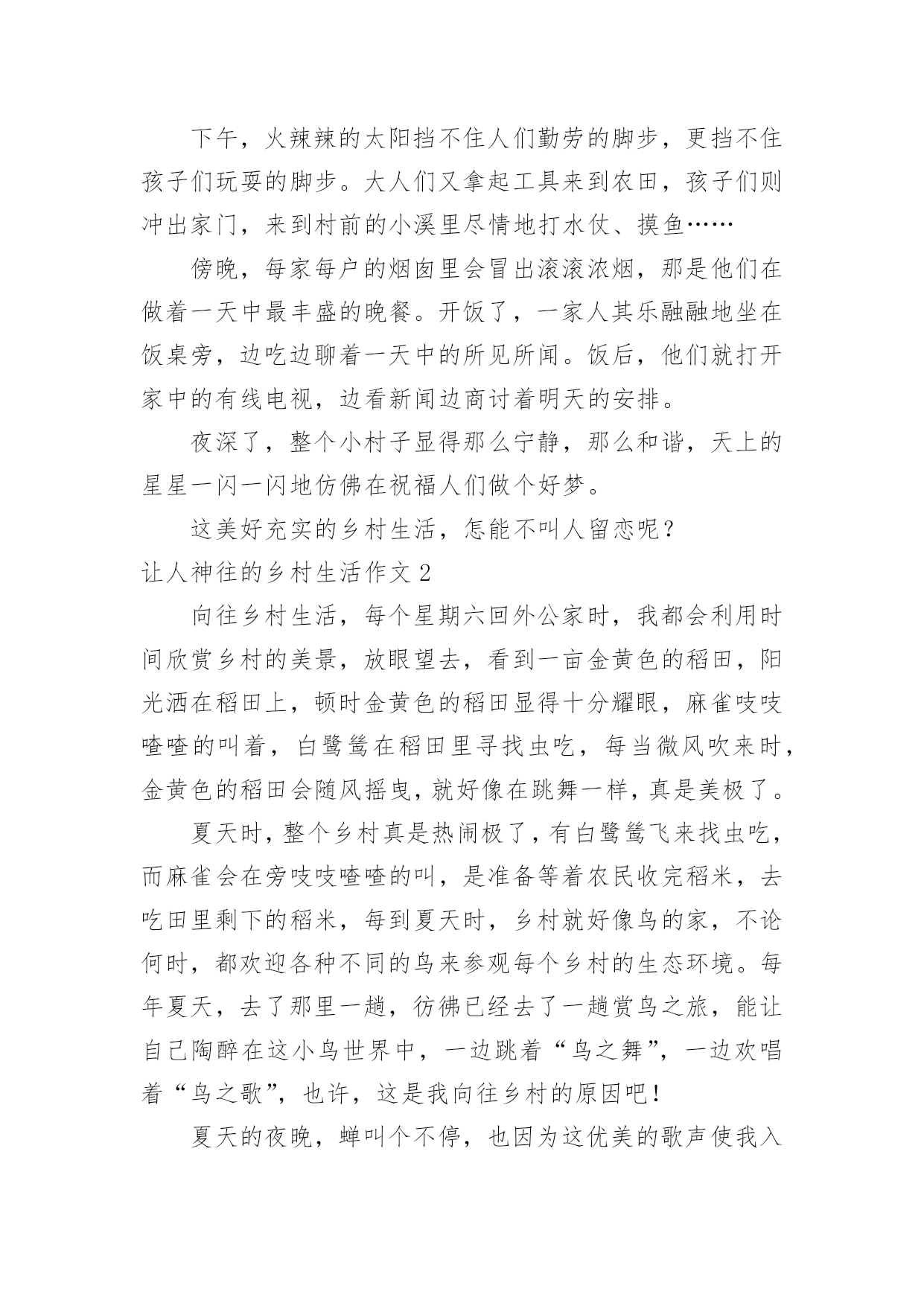 让人神往的乡村生活作文让人神往的乡村生活作文在日常的学习、工作、生活中,大家或多或少都会接触过作文吧,作文是一种言语活动,具有高度的综合性和创造性。相信许多人会觉得作文很难写吧,下面是小编整理的让人神往的乡村生活作文,欢迎阅读与收藏。让人神往的乡村生活作文1从小生活在这不大不小的县城里,整天看到的是人来人往、车水马龙的热闹景象,从未真正地体验过乡村生活。去年暑假,我到奶奶家住了几天,让我真正地体验了朴实无华的乡村风情。早晨四五点钟,太阳公公还没露出笑脸,勤劳的公鸡就早早地把劳累了一天的人们从美梦中叫醒,就连看家的小狗也不甘示弱地“汪汪”叫着。整个小村子被一层蒙蒙的薄雾笼罩着,一缕缕炊烟从烟囱里袅袅升起,那景色真是美呀!吃完早饭,男人们就扛着种田的`工具去田野里忙碌,除草、施肥、浇水……留在家里的妇女,有的在家喂牲畜,有的在家里打扫卫生,有的则在村子中央的石磨那里碾米,……上了年纪的爷爷奶奶就在树荫下、墙角边,或抽着烟下着棋,或聊着天做着针线活,不时还会传来一阵阵爽朗的笑声。孩子们三五成群地树下翻跟头、摔跤……玩累了,就围在树下讲着各自的趣事。下午,火辣辣的太阳挡不住人们勤劳的脚步,更挡不住孩子们玩耍的脚步。大人们又拿起工具来到农田,孩子们则冲出家门,来到村前的小溪里尽情地打水仗、摸鱼……傍晚,每家每户的烟囱里会冒出滚滚浓烟,那是他们在做着一天中最丰盛的晚餐。开饭了,一家人其乐融融地坐在饭桌旁,边吃边聊着一天中的所见所闻。饭后,他们就打开家中的有线电视,边看新闻边商讨着明天的安排。夜深了,整个小村子显得那么宁静,那么和谐,天上的星星一闪一闪地仿佛在祝福人们做个好梦。这美好充实的乡村生活,怎能不叫人留恋呢?让人神往的乡村生活作文2向往乡村生活,每个星期六回外公家时,我都会利用时间欣赏乡村的美景,放眼望去,看到一亩金黄色的稻田,阳光洒在稻田上,顿时金黄色的稻田显得十分耀眼,麻雀吱吱喳喳的叫着,白鹭鸶在稻田里寻找虫吃,每当微风吹来时,金黄色的稻田会随风摇曳,就好像在跳舞一样,真是美极了。夏天时,整个乡村真是热闹极了,有白鹭鸶飞来找虫吃,而麻雀会在旁吱吱喳喳的叫,是准备等着农民收完稻米,去吃田里剩下的稻米,每到夏天时,乡村就好像鸟的家,不论何时,都欢迎各种不同的鸟来参观每个乡村的生态环境。每年夏天,去了那里一趟,彷彿已经去了一趟赏鸟之旅,能让自己陶醉在这小鸟世界中,一边跳着“鸟之舞”,一边欢唱着“鸟之歌”,也许,这是我向往乡村的原因吧!夏天的夜晚,蝉叫个不停,也因为这优美的歌声使我入睡,优美的旋律回荡在我耳边,蝉就像是歌手周杰伦一样。在寂静的`森林中,听到蝉鸣声,相当舒服,但自然界中还有一个唱的悦耳动听的——青蛙,蝉和青蛙是朋友,它们一上场就“hold”住全场,就像艺人阿翔、浩子一样呢!蝉和青蛙在夏天是好伙伴。傍晚就此画下完美的句点,这就是我所向往的乡村,非常的宁静,处处都充满着万物,空气非常新鲜,非常的悠闲,我爱乡村!