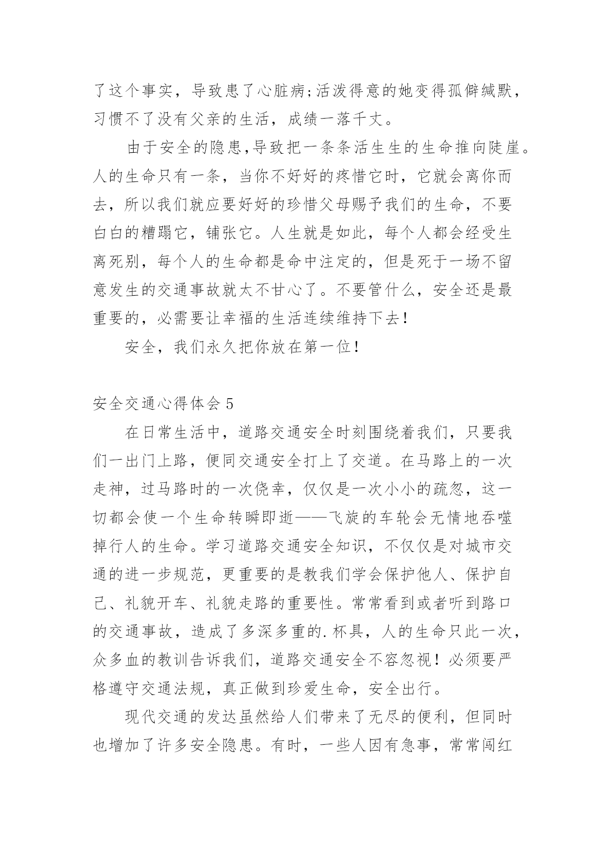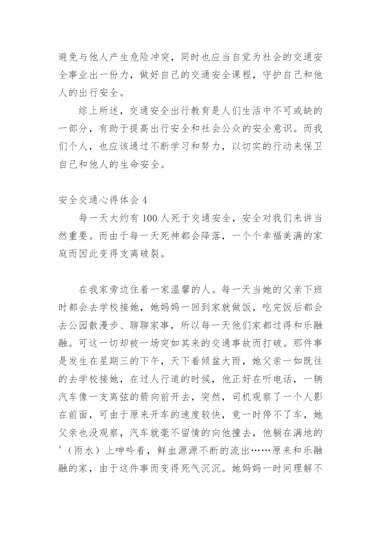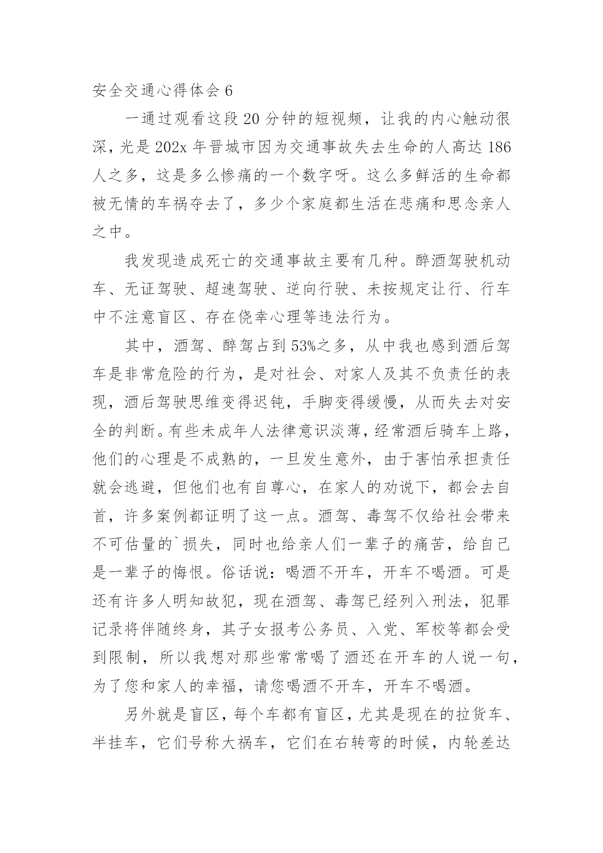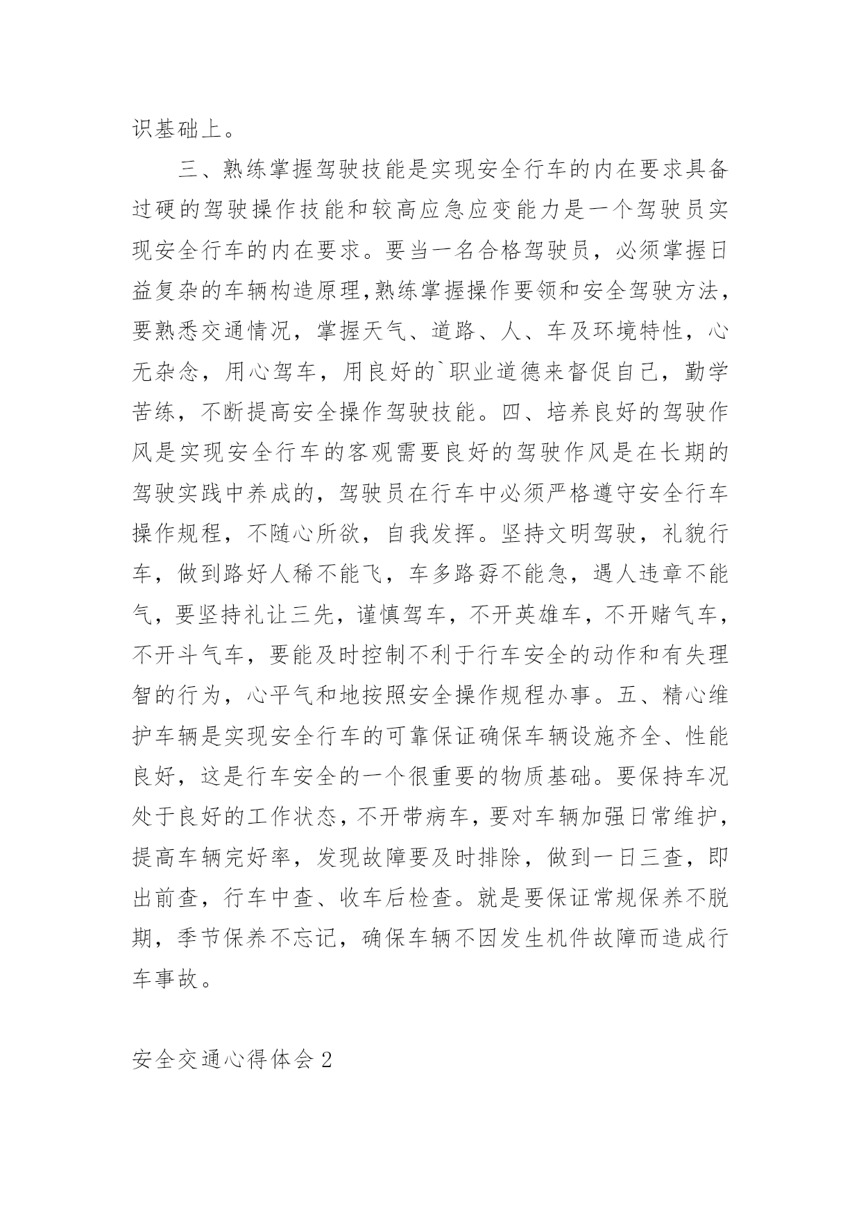 安全交通心得体会当我们经过反思,对生活有了新的看法时,可以通过写心得体会的方式将其记录下来,这样能够给人努力向前的动力。那么写心得体会要注意的内容有什么呢?以下是小编整理的安全交通心得体会,欢迎阅读与收藏。安全交通心得体会1通过几天的培训学习,使我受益匪浅,针对学习内容,进行以下总结:一、牢固树立责任意识是实现安全行车的必备前提一个没有责任意识的人,干任何事情都会出现这样和那样的问题,甚至会酿成惨祸,对于汽车驾驶员来说责任意识尤为重要。驾驶员任何一个失职行为都有可能造成人身和财物的损失。因而驾驶员必须树立高度的社会责任心,时刻把安全放在心上。牢固树立“安全第一”的思想,随时保持冷静清醒的头脑,处处防止意外情况的发生。时刻以惨痛的交通事故为反面教材,提醒自己,树立强烈的责任意识,我们就能杜绝和减少交通事故的发生。二、时时刻刻遵章守法是实现安全行车的重要基础每一位驾驶员要认真学习交通法规和安全制度,熟记和掌握其内容,在行车中要认真了解道路交通法规的基本原则,熟悉交通管理的具体条款和各项措施,自觉杜绝违章行为的发生,把自觉遵守交通法规和安全制度建立在高度自觉的道德意识基础上。三、熟练掌握驾驶技能是实现安全行车的内在要求具备过硬的驾驶操作技能和较高应急应变能力是一个驾驶员实现安全行车的内在要求。要当一名合格驾驶员,必须掌握日益复杂的车辆构造原理,熟练掌握操作要领和安全驾驶方法,要熟悉交通情况,掌握天气、道路、人、车及环境特性,心无杂念,用心驾车,用良好的`职业道德来督促自己,勤学苦练,不断提高安全操作驾驶技能。四、培养良好的驾驶作风是实现安全行车的客观需要良好的驾驶作风是在长期的驾驶实践中养成的,驾驶员在行车中必须严格遵守安全行车操作规程,不随心所欲,自我发挥。坚持文明驾驶,礼貌行车,做到路好人稀不能飞,车多路孬不能急,遇人违章不能气,要坚持礼让三先,谨慎驾车,不开英雄车,不开赌气车,不开斗气车,要能及时控制不利于行车安全的动作和有失理智的行为,心平气和地按照安全操作规程办事。五、精心维护车辆是实现安全行车的可靠保证确保车辆设施齐全、性能良好,这是行车安全的一个很重要的物质基础。要保持车况处于良好的工作状态,不开带病车,要对车辆加强日常维护,提高车辆完好率,发现故障要及时排除,做到一日三查,即出前查,行车中查、收车后检查。就是要保证常规保养不脱期,季节保养不忘记,确保车辆不因发生机件故障而造成行车事故。安全交通心得体会2随着经济的日益发展,马路上车辆川流不息的景象随处可见。然而由于有些人交通安全意识的淡薄,在车水马龙的马路上演了一幕幕不可挽回的悲剧。当你看到一个个鲜活的生命消失于车轮之下,当你发现一阵阵欢声笑语湮没在尖锐的'汽笛声中,当你面对那些触目惊心的场景时,能不感到痛心疾首吗?我通过晋城交警公众号,学习了交通安全第一课空中课堂。本节课由郭老师来为我们讲课。老师首先问了我们一个问题,你知道20xx年因交通事故死亡的人有多少吗?随后便为我们揭晓了答案,186人,或许我们会觉得这个数字离我们很远,但你想想,如果是你的家人朋友呢?接下来郭老师为我们介绍了一些交通注意事项,如:1。人们都知道不能酒驾开车,可有些人偏偏明知故犯,因此发生了很多事故。2。未考取驾驶证不能驾车上路。3。未满12周岁不能驾驶自行车上路,未满18周岁不能驾驶摩托车上路。4。而骑车戴头盔也是很重要的。如下面这个案例:事发当时,男子驾驶一辆黄色电动车从某路某村行驶出来,在行驶到红绿灯路口时,因路方向是绿灯,车流密集,先是停了一下。这时,一辆二轮摩托车也行驶过来停在了路口。几秒种后,待某路方向没车后,男子驾驶电动车和一辆摩托车一前一后,一边聊天一边不顾前方还是红灯硬是闯了过去。结果,在行驶到某路东侧车道时被直行的白色小客车撞倒在地。而戴头盔的就比较幸运了电动车驾驶人某男子不但人和车都被撞飞出去十几米远,电动车也被撞得支离破碎。但是,我们也看到,当时那个戴着一个橘红色的头盔,就是这个头盔救了那个男子一命。让我们把“交通安全”这四个字在心里永远扎下根,让全世界人民都自觉遵守交通规则,让交通事故永远在我们生活中消失,让我们的明天充满鲜花,充满阳光。那么,交通安全便是你的朋友,它将永远保护着你,带给你幸福。让我们争做文明守法的好少年吧!安全交通心得体会3交通安全是社会稳定和人民幸福的重要组成部分。而出行教育作为交通安全的重要一环,旨在提高社会公众交通安全意识,切实减少交通事故发生,保障人民出行安全。在参加交通安全出行教育活动的过程中,我深感这种教育对于个人的生活和安全至关重要,也领悟到了一些心得体会。第一段,出行安全教育的重要性人生而平等,每个人都拥有自由出行的权利。然而,不规范的出行行为、低劣的行车技巧以及鲁莽驾驶等行为,往往会给人身体、财产或生命造成不可磨灭的伤害。国家对