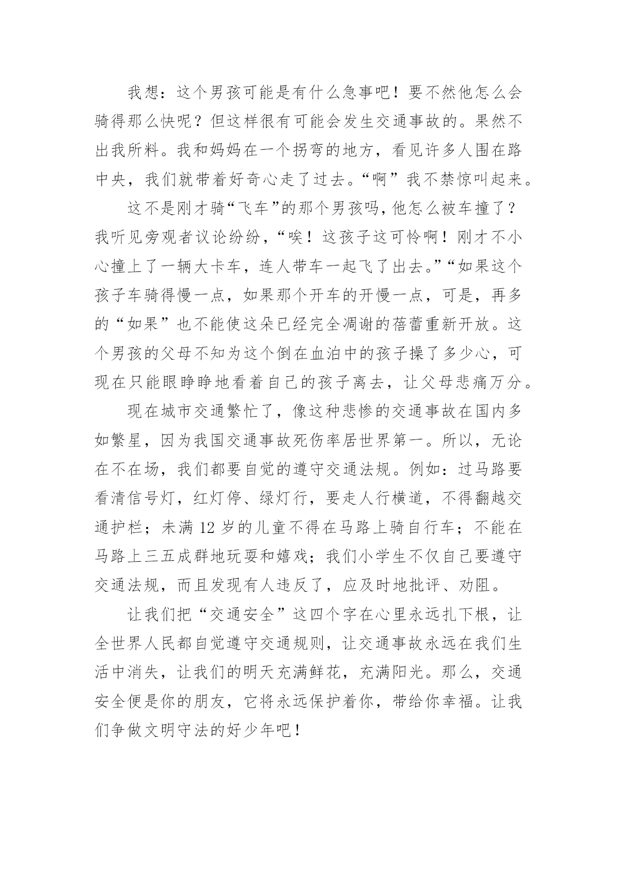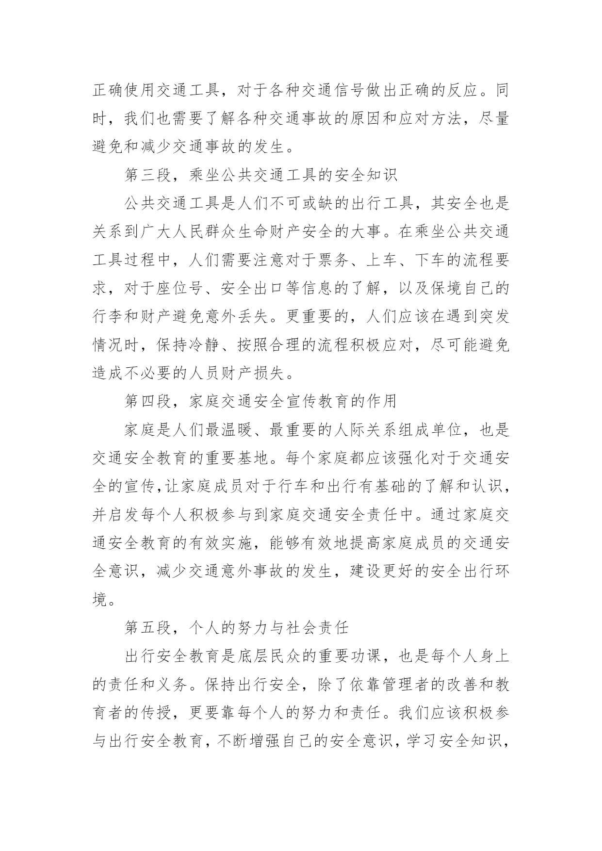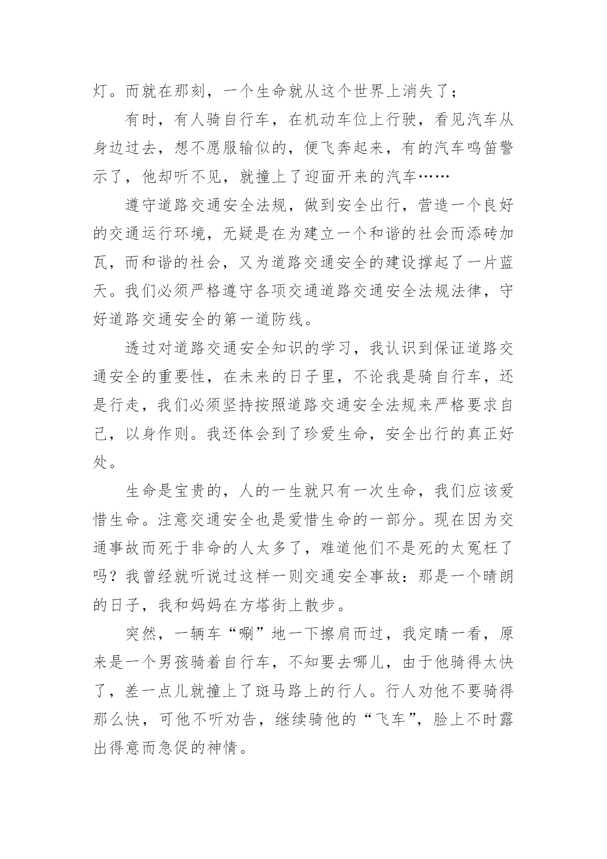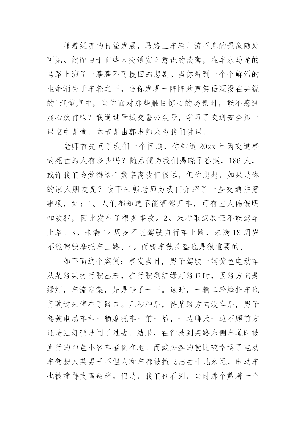 安全交通心得体会当我们经过反思,对生活有了新的看法时,可以通过写心得体会的方式将其记录下来,这样能够给人努力向前的动力。那么写心得体会要注意的内容有什么呢?以下是小编整理的安全交通心得体会,欢迎阅读与收藏。安全交通心得体会1通过几天的培训学习,使我受益匪浅,针对学习内容,进行以下总结:一、牢固树立责任意识是实现安全行车的必备前提一个没有责任意识的人,干任何事情都会出现这样和那样的问题,甚至会酿成惨祸,对于汽车驾驶员来说责任意识尤为重要。驾驶员任何一个失职行为都有可能造成人身和财物的损失。因而驾驶员必须树立高度的社会责任心,时刻把安全放在心上。牢固树立“安全第一”的思想,随时保持冷静清醒的头脑,处处防止意外情况的发生。时刻以惨痛的交通事故为反面教材,提醒自己,树立强烈的责任意识,我们就能杜绝和减少交通事故的发生。二、时时刻刻遵章守法是实现安全行车的重要基础每一位驾驶员要认真学习交通法规和安全制度,熟记和掌握其内容,在行车中要认真了解道路交通法规的基本原则,熟悉交通管理的具体条款和各项措施,自觉杜绝违章行为的发生,把自觉遵守交通法规和安全制度建立在高度自觉的道德意识基础上。三、熟练掌握驾驶技能是实现安全行车的内在要求具备过硬的驾驶操作技能和较高应急应变能力是一个驾驶员实现安全行车的内在要求。要当一名合格驾驶员,必须掌握日益复杂的车辆构造原理,熟练掌握操作要领和安全驾驶方法,要熟悉交通情况,掌握天气、道路、人、车及环境特性,心无杂念,用心驾车,用良好的`职业道德来督促自己,勤学苦练,不断提高安全操作驾驶技能。四、培养良好的驾驶作风是实现安全行车的客观需要良好的驾驶作风是在长期的驾驶实践中养成的,驾驶员在行车中必须严格遵守安全行车操作规程,不随心所欲,自我发挥。坚持文明驾驶,礼貌行车,做到路好人稀不能飞,车多路孬不能急,遇人违章不能气,要坚持礼让三先,谨慎驾车,不开英雄车,不开赌气车,不开斗气车,要能及时控制不利于行车安全的动作和有失理智的行为,心平气和地按照安全操作规程办事。五、精心维护车辆是实现安全行车的可靠保证确保车辆设施齐全、性能良好,这是行车安全的一个很重要的物质基础。要保持车况处于良好的工作状态,不开带病车,要对车辆加强日常维护,提高车辆完好率,发现故障要及时排除,做到一日三查,即出前查,行车中查、收车后检查。就是要保证常规保养不脱期,季节保养不忘记,确保车辆不因发生机件故障而造成行车事故。安全交通心得体会2随着经济的日益发展,马路上车辆川流不息的景象随处可见。然而由于有些人交通安全意识的淡薄,在车水马龙的马路上演了一幕幕不可挽回的悲剧。当你看到一个个鲜活的生命消失于车轮之下,当你发现一阵阵欢声笑语湮没在尖锐的'汽笛声中,当你面对那些触目惊心的场景时,能不感到痛心疾首吗?我通过晋城交警公众号,学习了交通安全第一课空中课堂。本节课由郭老师来为我们讲课。老师首先问了我们一个问题,你知道20xx年因交通事故死亡的人有多少吗?随后便为我们揭晓了答案,186人,或许我们会觉得这个数字离我们很远,但你想想,如果是你的家人朋友呢?接下来郭老师为我们介绍了一些交通注意事项,如:1。人们都知道不能酒驾开车,可有些人偏偏明知故犯,因此发生了很多事故。2。未考取驾驶证不能驾车上路。3。未满12周岁不能驾驶自行车上路,未满18周岁不能驾驶摩托车上路。4。而骑车戴头盔也是很重要的。如下面这个案例:事发当时,男子驾驶一辆黄色电动车从某路某村行驶出来,在行驶到红绿灯路口时,因路方向是绿灯,车流密集,先是停了一下。这时,一辆二轮摩托车也行驶过来停在了路口。几秒种后,待某路方向没车后,男子驾驶电动车和一辆摩托车一前一后,一边聊天一边不顾前方还是红灯硬是闯了过去。结果,在行驶到某路东侧车道时被直行的白色小客车撞倒在地。而戴头盔的就比较幸运了电动车驾驶人某男子不但人和车都被撞飞出去十几米远,电动车也被撞得支离破碎。但是,我们也看到,当时那个戴着一个橘红色的头盔,就是这个头盔救了那个男子一命。让我们把“交通安全”这四个字在心里永远扎下根,让全世界人民都自觉遵守交通规则,让交通事故永远在我们生活中消失,让我们的明天充满鲜花,充满阳光。那么,交通安全便是你的朋友,它将永远保护着你,带给你幸福。让我们争做文明守法的好少年吧!安全交通心得体会3交通安全是社会稳定和人民幸福的重要组成部分。而出行教育作为交通安全的重要一环,旨在提高社会公众交通安全意识,切实减少交通事故发生,保障人民出行安全。在参加交通安全出行教育活动的过程中,我深感这种教育对于个人的生活和安全至关重要,也领悟到了一些心得体会。第一段,出行安全教育的重要性人生而平等,每个人都拥有自由出行的权利。然而,不规范的出行行为、低劣的行车技巧以及鲁莽驾驶等行为,往往会给人身体、财产或生命造成不可磨灭的伤害。国家对