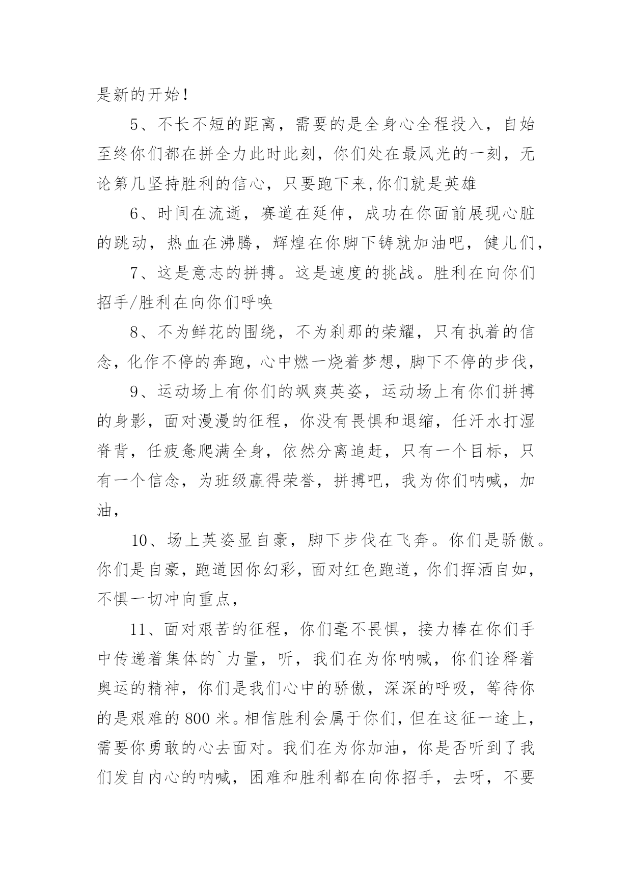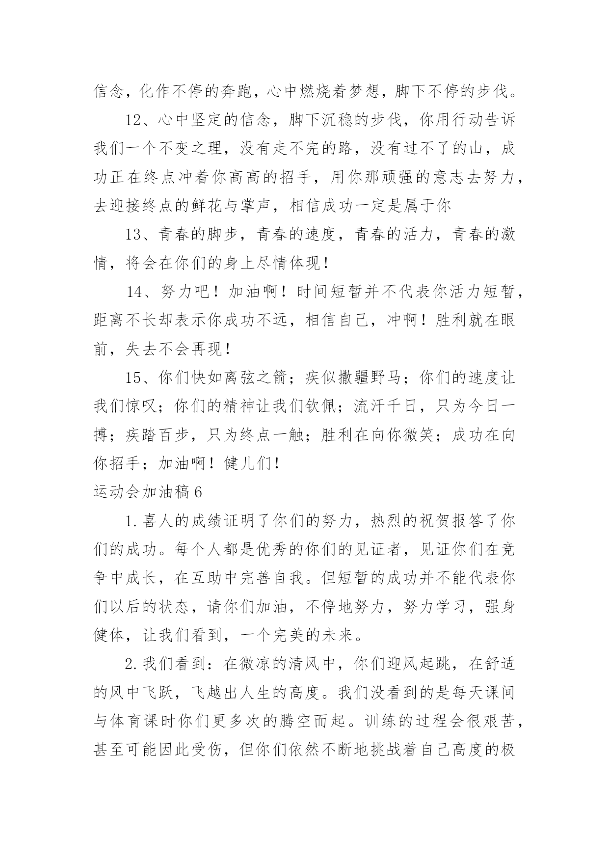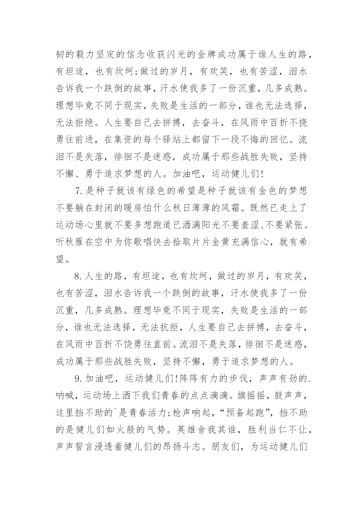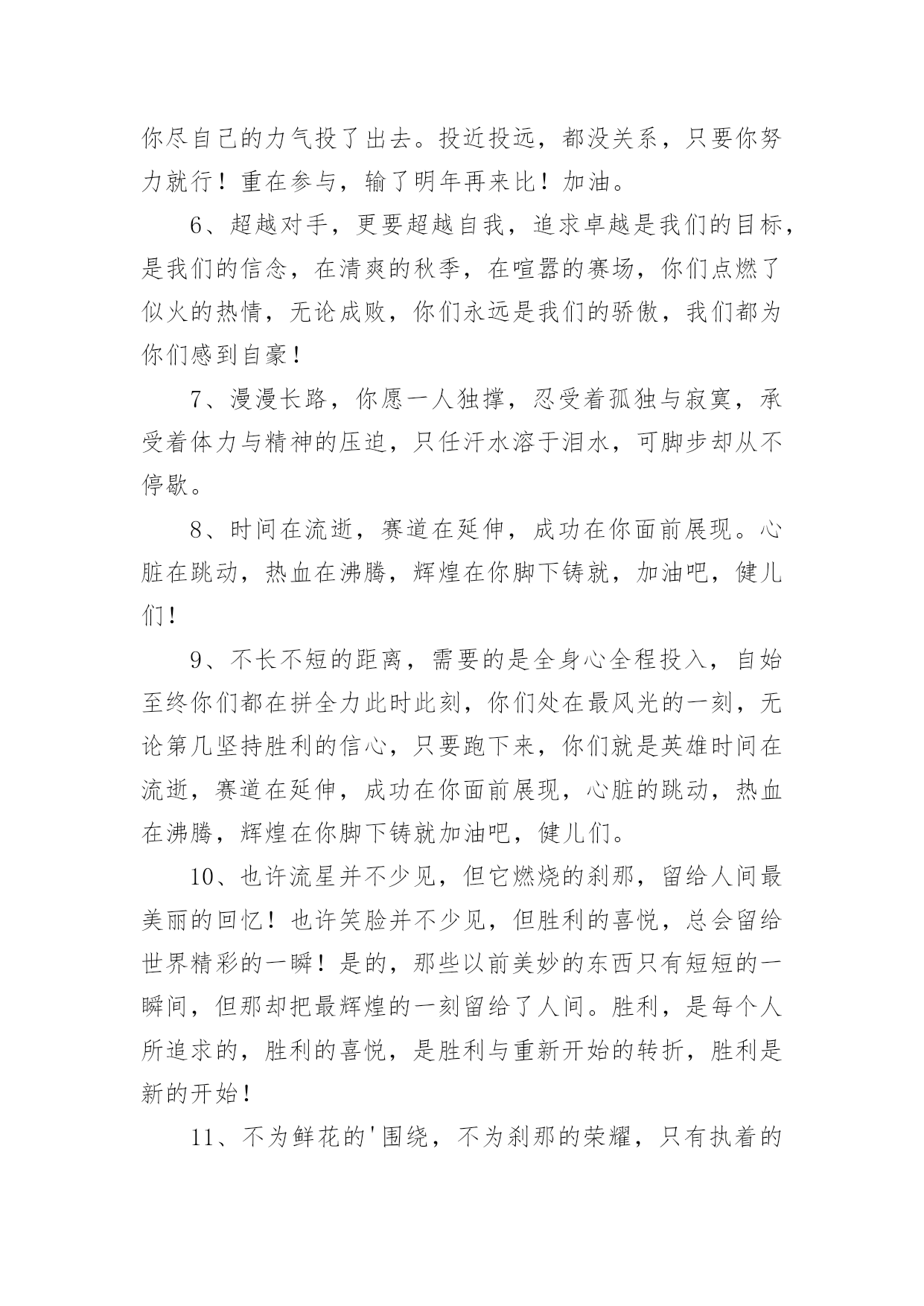 运动会加油稿运动会加油稿随着社会一步步向前发展,我们可以使用加油稿的机会越来越多,加油稿是用于给别人加油鼓气,提升别人气势的文稿。那么加油稿一般是怎么写的呢?以下是小编帮大家整理的运动会加油稿,希望能够帮助到大家。运动会加油稿11、看,终点就在眼前,听,同学为你呼喊。鼓起勇气奋力向前,用你的荣誉带给我们希望。2、看!那一面面迎风飘舞的彩旗,是一朵朵盛开的鲜花;听!那一阵阵惊天动地的欢呼,是回响在耳边胜利的风声。运动场上的你们,是胜利的标志,运动场上的你们,是青春的赞叹。去吧!去迎接那伟大的挑战,去吧!去做一名追风的少年。3、人生的路,有坦途,也有坎坷;做过的岁月,有欢笑,也有苦涩,泪水告诉我一个跌倒的故事,汗水使我多了一份沉重,几多成熟。4、也许流星并不少见,但它燃一烧的刹那,留给人间最美丽的回忆!也许笑脸并不少见,但胜利的喜悦,总会留给世界精彩的一瞬!是的,那些曾经美妙的东西只有短短的一瞬间,但那却把最辉煌的一刻留给了人间。胜利,是每个人所追求的,胜利的喜悦,是胜利与重新开始的转折,胜利是新的开始!5、不长不短的距离,需要的是全身心全程投入,自始至终你们都在拼全力此时此刻,你们处在最风光的一刻,无论第几坚持胜利的信心,只要跑下来,你们就是英雄6、时间在流逝,赛道在延伸,成功在你面前展现心脏的跳动,热血在沸腾,辉煌在你脚下铸就加油吧,健儿们,7、这是意志的拼搏。这是速度的挑战。胜利在向你们招手/胜利在向你们呼唤8、不为鲜花的围绕,不为刹那的荣耀,只有执着的信念,化作不停的奔跑,心中燃一烧着梦想,脚下不停的步伐,9、运动场上有你们的飒爽英姿,运动场上有你们拼搏的身影,面对漫漫的征程,你没有畏惧和退缩,任汗水打湿脊背,任疲惫爬满全身,依然分离追赶,只有一个目标,只有一个信念,为班级赢得荣誉,拼搏吧,我为你们呐喊,加油,10、场上英姿显自豪,脚下步伐在飞奔。你们是骄傲。你们是自豪,跑道因你幻彩,面对红色跑道,你们挥洒自如,不惧一切冲向重点,11、面对艰苦的征程,你们毫不畏惧,接力棒在你们手中传递着集体的`力量,听,我们在为你呐喊,你们诠释着奥运的精神,你们是我们心中的骄傲,深深的呼吸,等待你的是艰难的800米。相信胜利会属于你们,但在这征一途上,需要你勇敢的心去面对。我们在为你加油,你是否听到了我们发自内心的呐喊,困难和胜利都在向你招手,去呀,不要犹豫,快去击败困难,快去夺取胜利,相信你会送给我们一个汗水浸一湿的微笑12、你用行动述说着过城的重要,没有无尽的终点,没有无法攀登的险峰,希望载着终点在向你微笑,拼搏吧!经历是一种精彩,迸发你全部的能量,成功是你汗水的写照。运动会加油稿21.我们为你呐喊,力量给你信心给你,因为我们知道那一步步的前进十分勇敢。我们为你呐喊,虽然显得火热,但却希望你能加油。2.也许流星并不少见,但它燃烧的刹那,留给人间最美丽的回忆!也许笑脸并不少见,但胜利的喜悦,总会留给世界精彩的一瞬!是的,那些曾经美妙的东西只有短短的一瞬间,但那却把最辉煌的一刻留给人间。胜利,是每个人所追求的',胜利的喜悦,是胜利与重新开始的转折,胜利是新的开始!3.也许你心里忐忑不安,我们的心里早已热血沸腾。昔日,长长的跑道上,留下你深深的足迹。抹不去你渗出的汗水,拉不动你沉重的双脚。你为班级,不在乎自己疲惫,不在乎泪水和汗水,因为你心里有一种坚定的信念。为班级,我能行。4.面对的依然是蓝色的天空,依然是金色的阳光,依然是绿色的草地,依然是红色的跑道,依然是你,勇敢的你,坚强的你。不同的是,天空更加蔚蓝,阳光更加灿烂,草地更如翡翠一般,跑道更加的鲜艳,而你,定会更加的自信,你的成绩,必然更加辉煌。5.时间在流逝,赛道在延伸,成功在你面前展现心脏的跳动,热血在沸腾,辉煌在你脚下铸就,加油吧,健儿们!运动会加油稿3偌大的竞技场期待着你矫健的身影,飒飒的秋风为你送来爽朗的气息,朋友,在你踏上跑道的那一刻,告诉自己——将信心进行到底。看台上你一双双期待的.目光替你吧奋斗的锣鼓敲响。耳边此起彼伏的呐喊声将为你增添无穷的力量。朋友,在你挑战自我,挑战极限的时候,告诉自己——将信心进行到底。无论成功与否,请微笑着跑完全程,只要年轻的心还在蓬勃的跳动,就要大声告诉自己——将信心进行到底。在阳光的照耀下,跳高的比赛场地格外辉煌,运动健儿们,用那矫键的身躯,冲刺着一个又一个的高度。没有尝试,怎会知道自己是否为强者,超越自己,也许会创造一番新天地!运动健儿们加油吧,去创造一份份奇奇迹,去创造一份份惊喜!运动会加油稿41.在枪声响起的一刹那你如箭在弦飞刺而出,在跑道的尽头你奋力的一掷中你让铅球落在最远点是你们——让我们知道了什么是拼搏,什么是激情,什么是荣耀。加油吧,让所有的人目击你们胜出的那刹那瞬间,让所有的人为你们而骄傲!2.天空中有道彩虹,它在雨后的