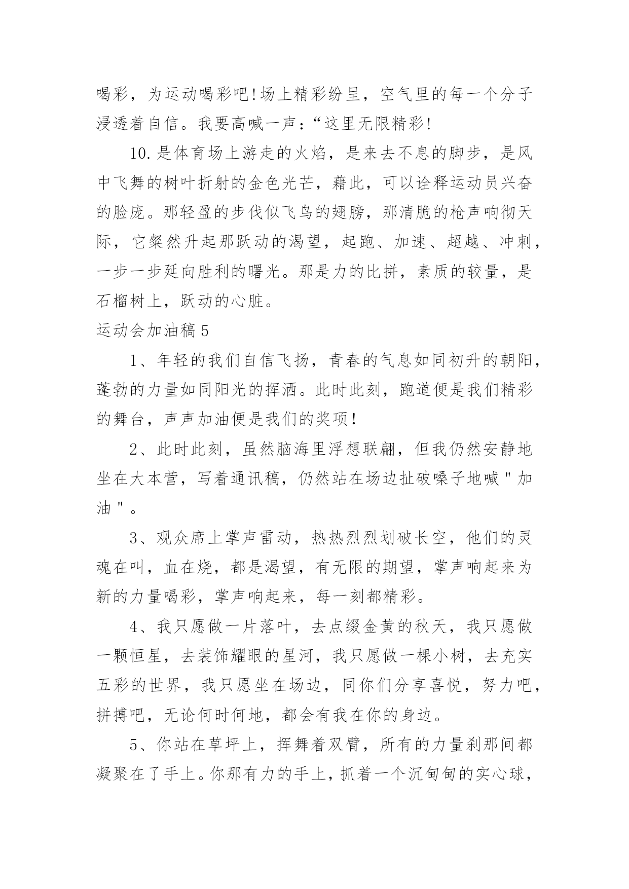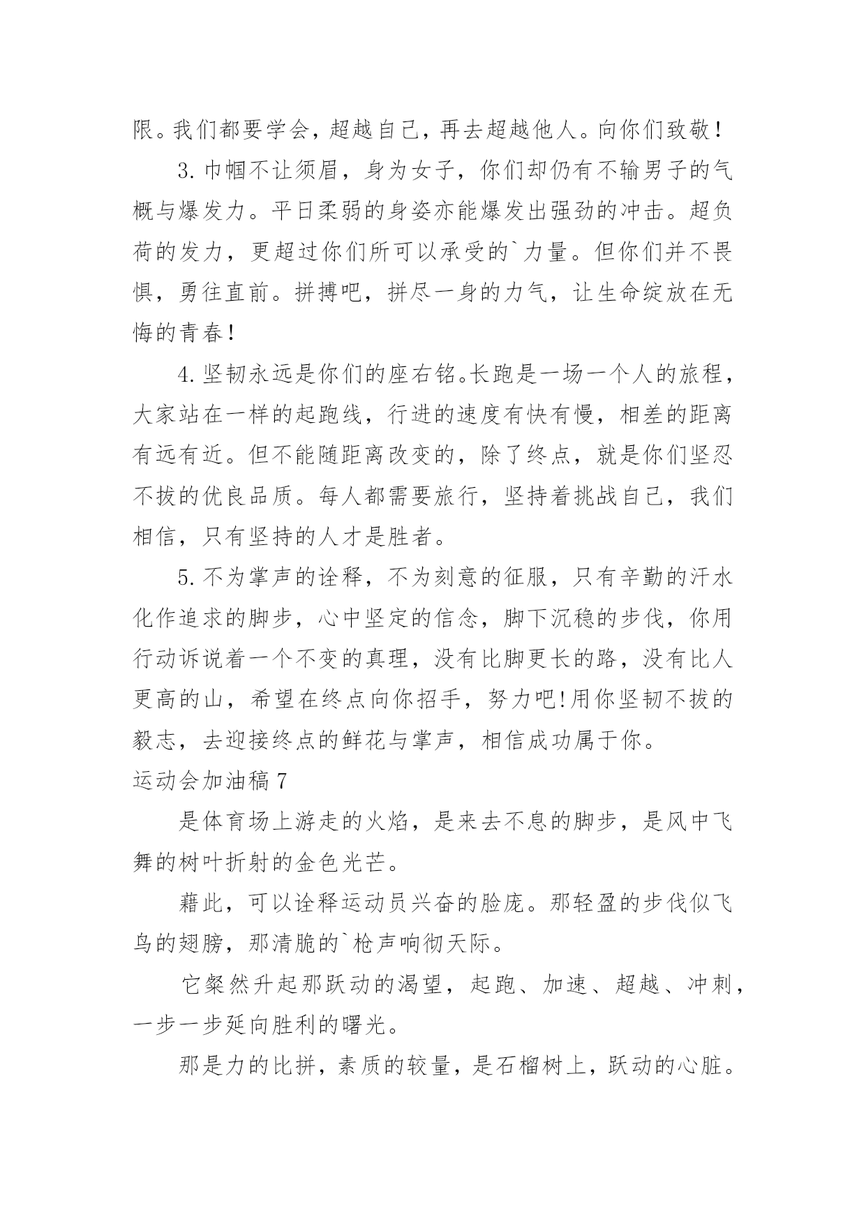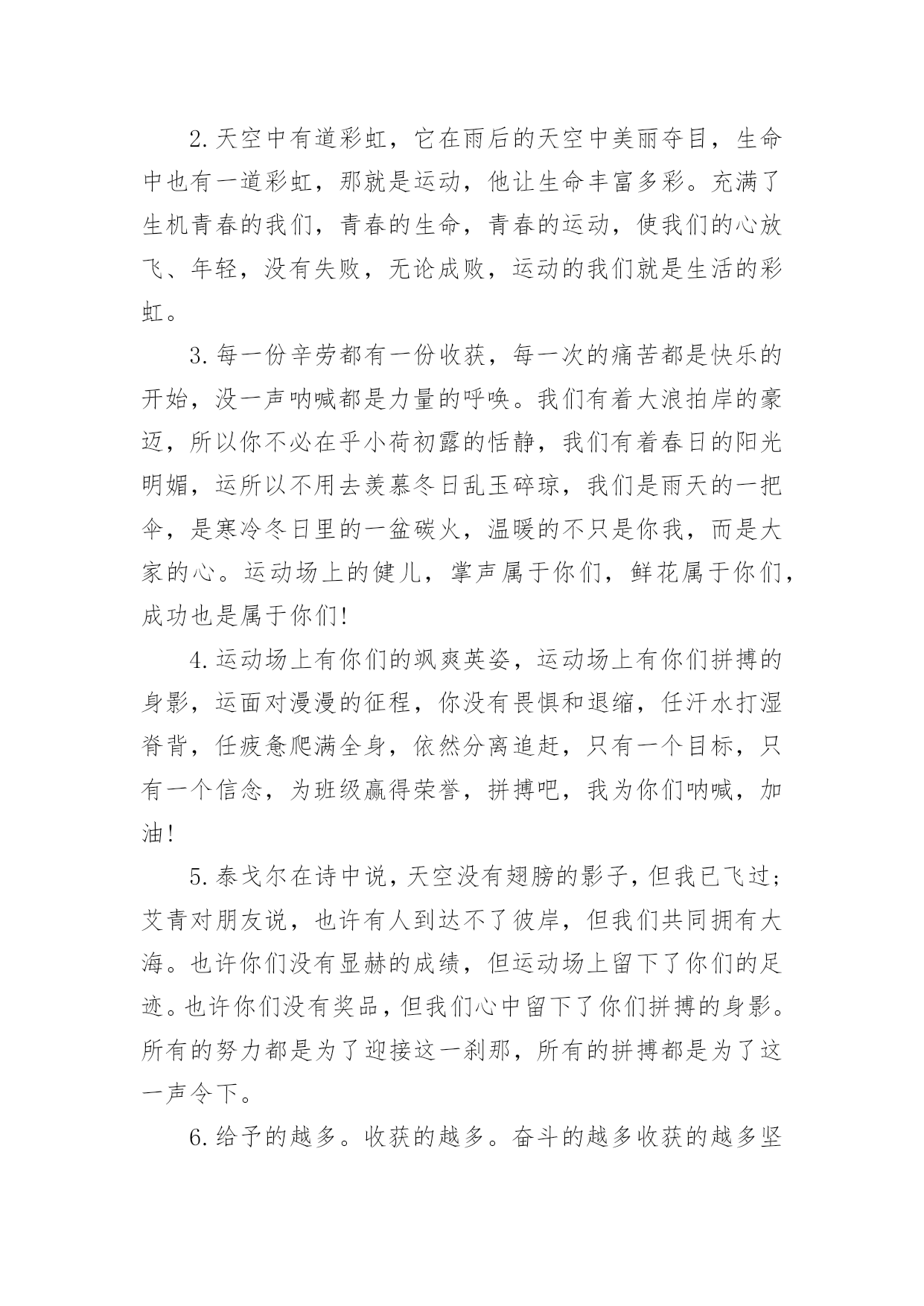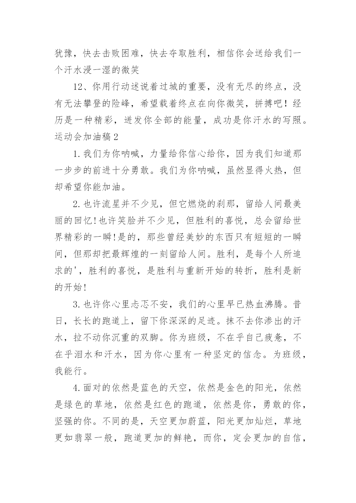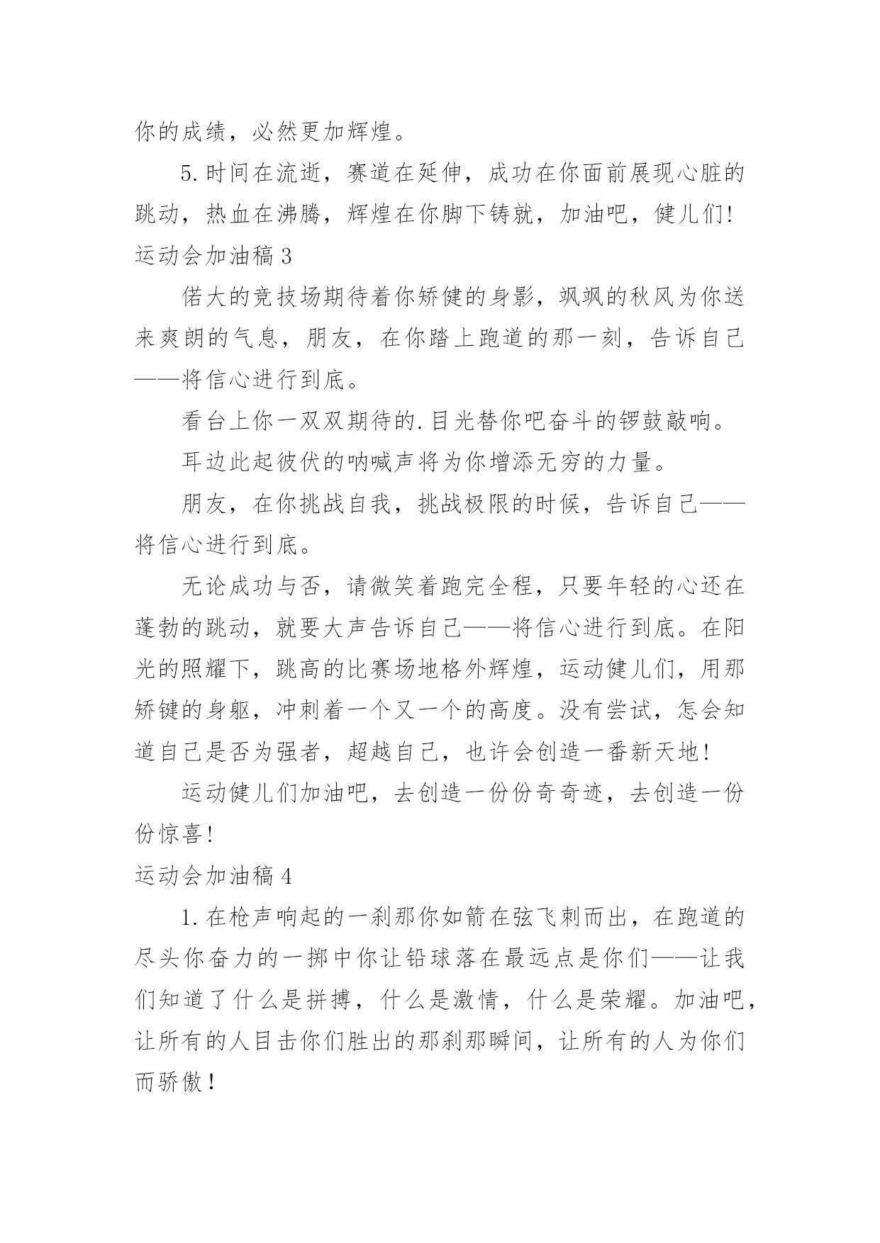运动会加油稿运动会加油稿随着社会一步步向前发展,我们可以使用加油稿的机会越来越多,加油稿是用于给别人加油鼓气,提升别人气势的文稿。那么加油稿一般是怎么写的呢?以下是小编帮大家整理的运动会加油稿,希望能够帮助到大家。运动会加油稿11、看,终点就在眼前,听,同学为你呼喊。鼓起勇气奋力向前,用你的荣誉带给我们希望。2、看!那一面面迎风飘舞的彩旗,是一朵朵盛开的鲜花;听!那一阵阵惊天动地的欢呼,是回响在耳边胜利的风声。运动场上的你们,是胜利的标志,运动场上的你们,是青春的赞叹。去吧!去迎接那伟大的挑战,去吧!去做一名追风的少年。3、人生的路,有坦途,也有坎坷;做过的岁月,有欢笑,也有苦涩,泪水告诉我一个跌倒的故事,汗水使我多了一份沉重,几多成熟。4、也许流星并不少见,但它燃一烧的刹那,留给人间最美丽的回忆!也许笑脸并不少见,但胜利的喜悦,总会留给世界精彩的一瞬!是的,那些曾经美妙的东西只有短短的一瞬间,但那却把最辉煌的一刻留给了人间。胜利,是每个人所追求的,胜利的喜悦,是胜利与重新开始的转折,胜利是新的开始!5、不长不短的距离,需要的是全身心全程投入,自始至终你们都在拼全力此时此刻,你们处在最风光的一刻,无论第几坚持胜利的信心,只要跑下来,你们就是英雄6、时间在流逝,赛道在延伸,成功在你面前展现心脏的跳动,热血在沸腾,辉煌在你脚下铸就加油吧,健儿们,7、这是意志的拼搏。这是速度的挑战。胜利在向你们招手/胜利在向你们呼唤8、不为鲜花的围绕,不为刹那的荣耀,只有执着的信念,化作不停的奔跑,心中燃一烧着梦想,脚下不停的步伐,9、运动场上有你们的飒爽英姿,运动场上有你们拼搏的身影,面对漫漫的征程,你没有畏惧和退缩,任汗水打湿脊背,任疲惫爬满全身,依然分离追赶,只有一个目标,只有一个信念,为班级赢得荣誉,拼搏吧,我为你们呐喊,加油,10、场上英姿显自豪,脚下步伐在飞奔。你们是骄傲。你们是自豪,跑道因你幻彩,面对红色跑道,你们挥洒自如,不惧一切冲向重点,11、面对艰苦的征程,你们毫不畏惧,接力棒在你们手中传递着集体的`力量,听,我们在为你呐喊,你们诠释着奥运的精神,你们是我们心中的骄傲,深深的呼吸,等待你的是艰难的800米。相信胜利会属于你们,但在这征一途上,需要你勇敢的心去面对。我们在为你加油,你是否听到了我们发自内心的呐喊,困难和胜利都在向你招手,去呀,不要犹豫,快去击败困难,快去夺取胜利,相信你会送给我们一个汗水浸一湿的微笑12、你用行动述说着过城的重要,没有无尽的终点,没有无法攀登的险峰,希望载着终点在向你微笑,拼搏吧!经历是一种精彩,迸发你全部的能量,成功是你汗水的写照。运动会加油稿21.我们为你呐喊,力量给你信心给你,因为我们知道那一步步的前进十分勇敢。我们为你呐喊,虽然显得火热,但却希望你能加油。2.也许流星并不少见,但它燃烧的刹那,留给人间最美丽的回忆!也许笑脸并不少见,但胜利的喜悦,总会留给世界精彩的一瞬!是的,那些曾经美妙的东西只有短短的一瞬间,但那却把最辉煌的一刻留给人间。胜利,是每个人所追求的',胜利的喜悦,是胜利与重新开始的转折,胜利是新的开始!3.也许你心里忐忑不安,我们的心里早已热血沸腾。昔日,长长的跑道上,留下你深深的足迹。抹不去你渗出的汗水,拉不动你沉重的双脚。你为班级,不在乎自己疲惫,不在乎泪水和汗水,因为你心里有一种坚定的信念。为班级,我能行。4.面对的依然是蓝色的天空,依然是金色的阳光,依然是绿色的草地,依然是红色的跑道,依然是你,勇敢的你,坚强的你。不同的是,天空更加蔚蓝,阳光更加灿烂,草地更如翡翠一般,跑道更加的鲜艳,而你,定会更加的自信,你的成绩,必然更加辉煌。5.时间在流逝,赛道在延伸,成功在你面前展现心脏的跳动,热血在沸腾,辉煌在你脚下铸就,加油吧,健儿们!运动会加油稿3偌大的竞技场期待着你矫健的身影,飒飒的秋风为你送来爽朗的气息,朋友,在你踏上跑道的那一刻,告诉自己——将信心进行到底。看台上你一双双期待的.目光替你吧奋斗的锣鼓敲响。耳边此起彼伏的呐喊声将为你增添无穷的力量。朋友,在你挑战自我,挑战极限的时候,告诉自己——将信心进行到底。无论成功与否,请微笑着跑完全程,只要年轻的心还在蓬勃的跳动,就要大声告诉自己——将信心进行到底。在阳光的照耀下,跳高的比赛场地格外辉煌,运动健儿们,用那矫键的身躯,冲刺着一个又一个的高度。没有尝试,怎会知道自己是否为强者,超越自己,也许会创造一番新天地!运动健儿们加油吧,去创造一份份奇奇迹,去创造一份份惊喜!运动会加油稿41.在枪声响起的一刹那你如箭在弦飞刺而出,在跑道的尽头你奋力的一掷中你让铅球落在最远点是你们——让我们知道了什么是拼搏,什么是激情,什么是荣耀。加油吧,让所有的人目击你们胜出的那刹那瞬间,让所有的人为你们而骄傲!2.天空中有道彩虹,它在雨后的